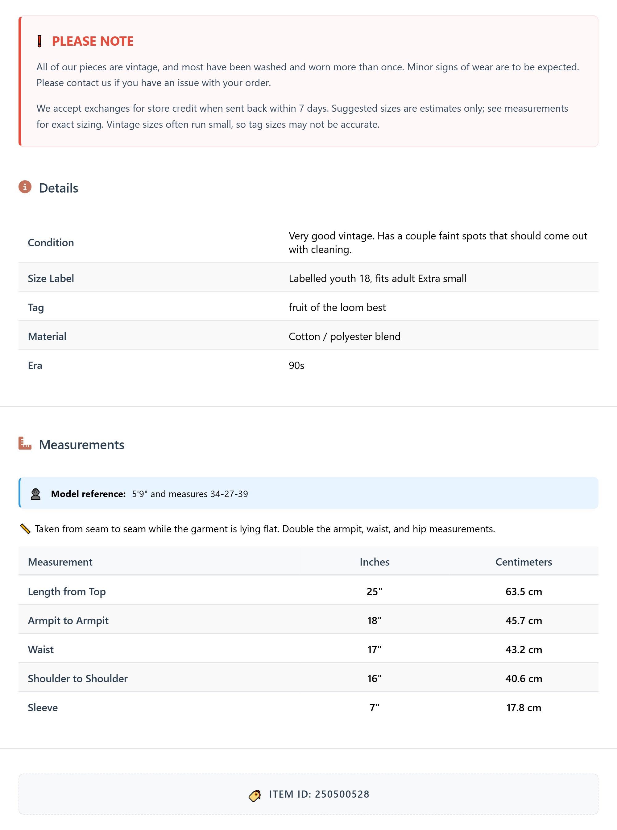 All of our pieces are vintage, and most have been washed and worn more than once. Minor signs of wear are to be expected. Please contact us if you have an issue with your order. We accept exchanges for store credit when sent back within 7 days.