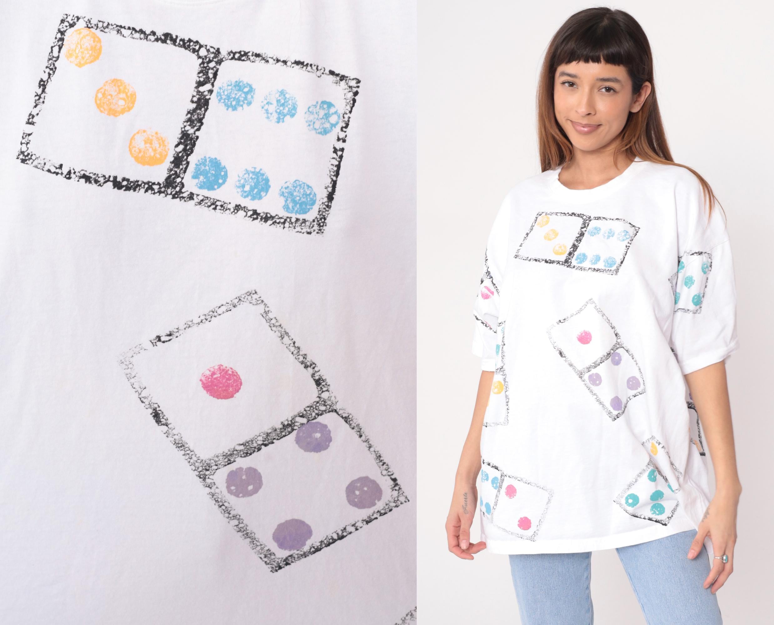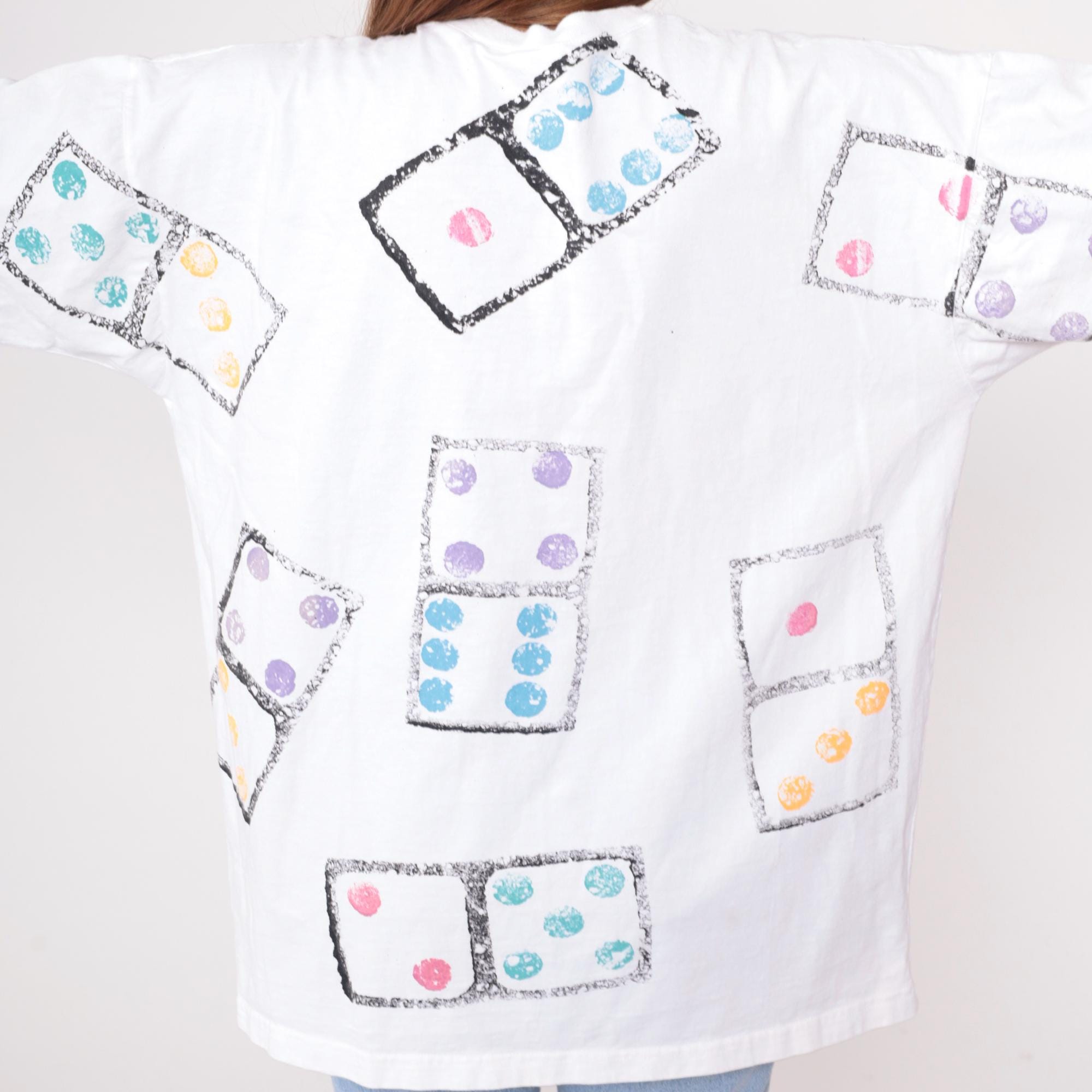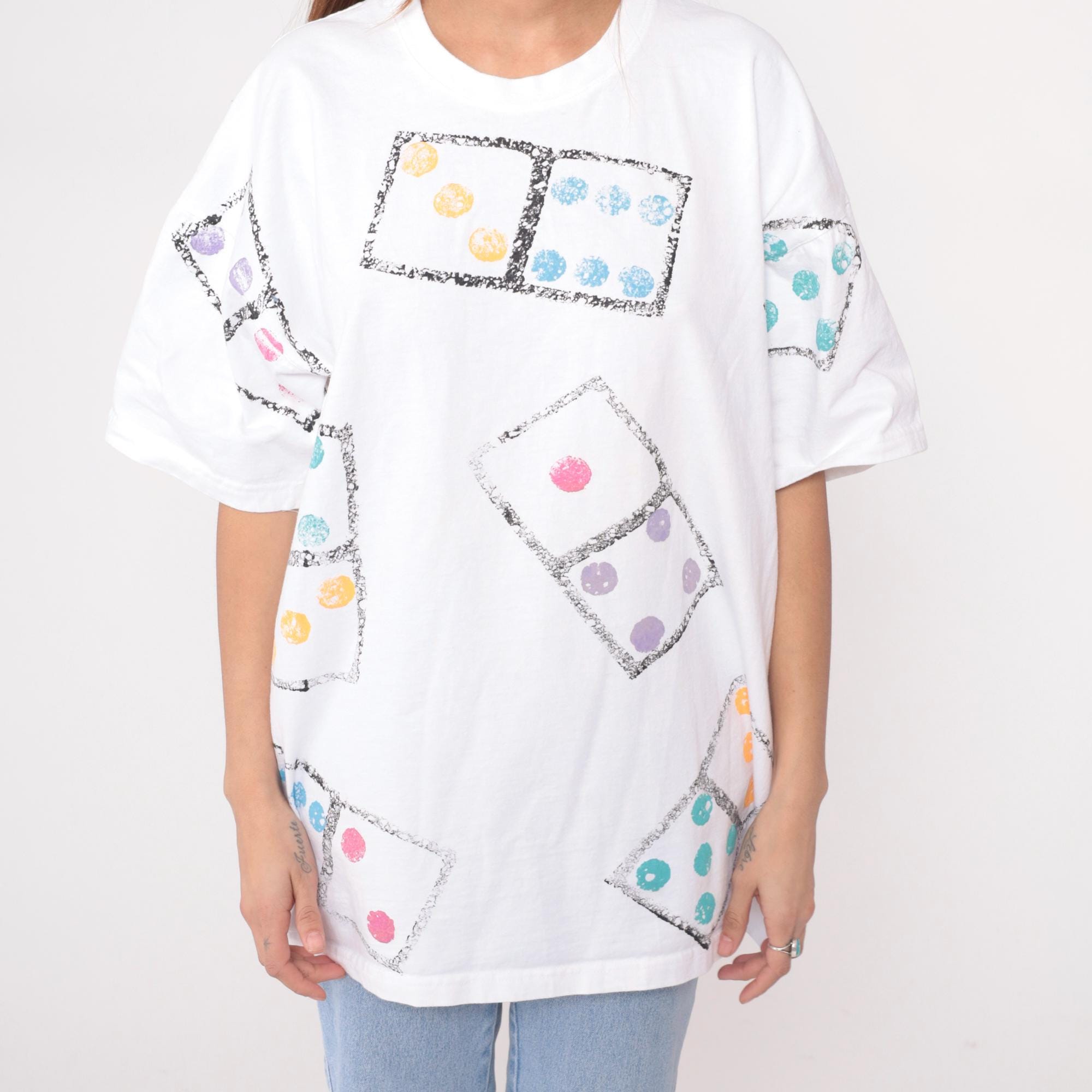 90s white t-shirt from cotton and co with all-over dice print graphic. Each die appears in a black-bordered square with dots in orange, blue, pink, purple, and turquoise. Short sleeves feature matching dice print.