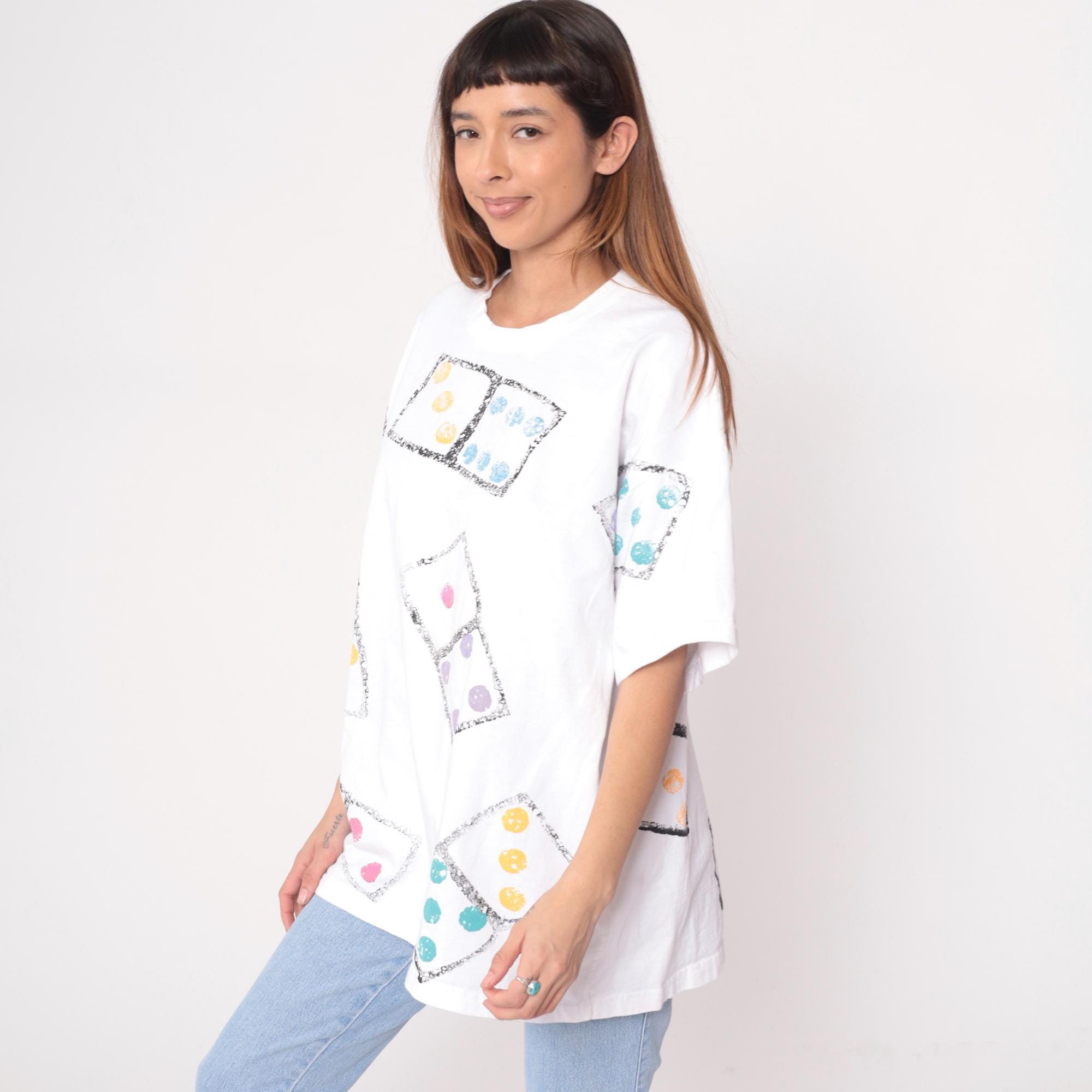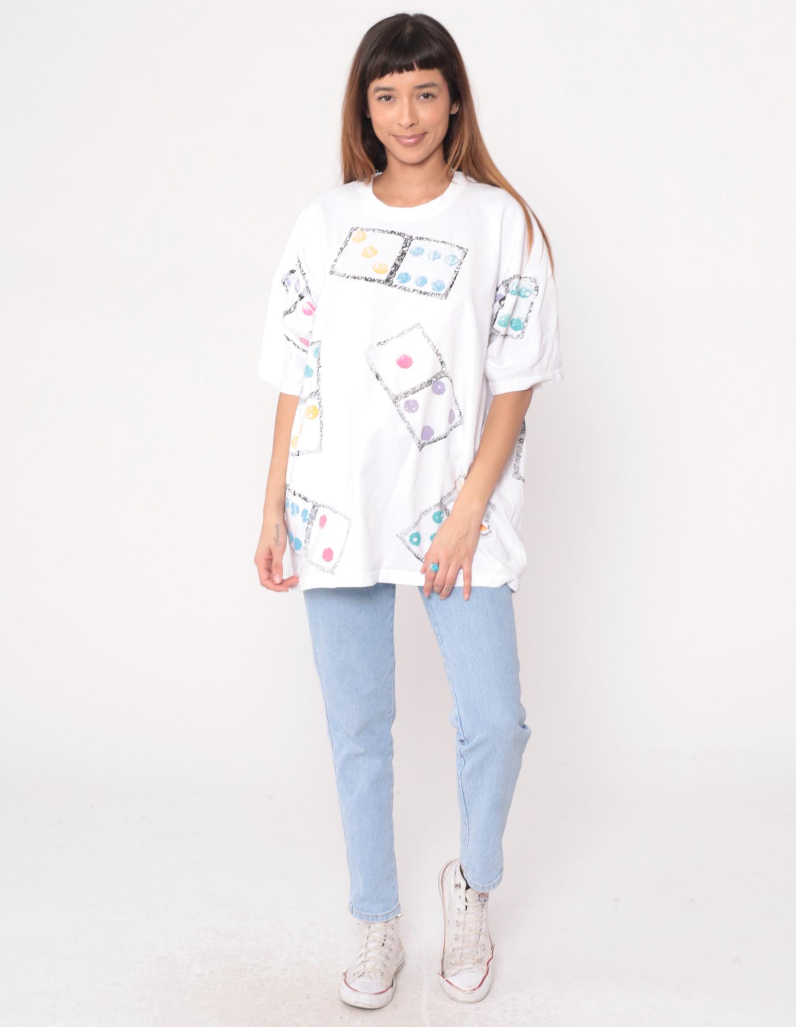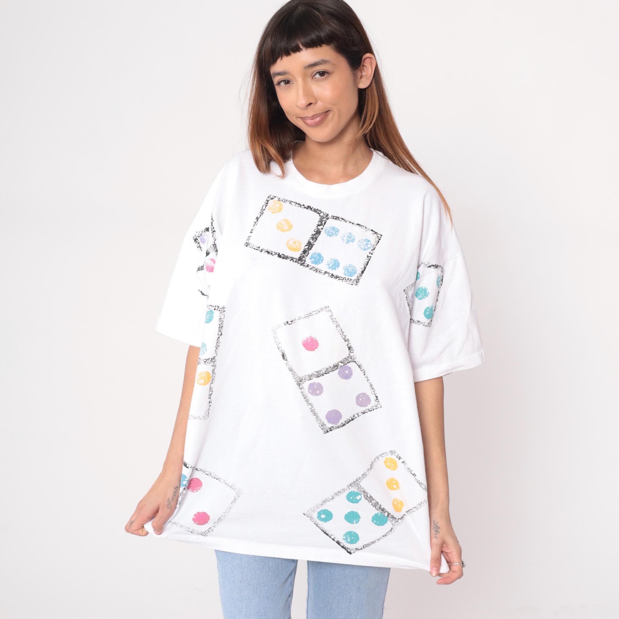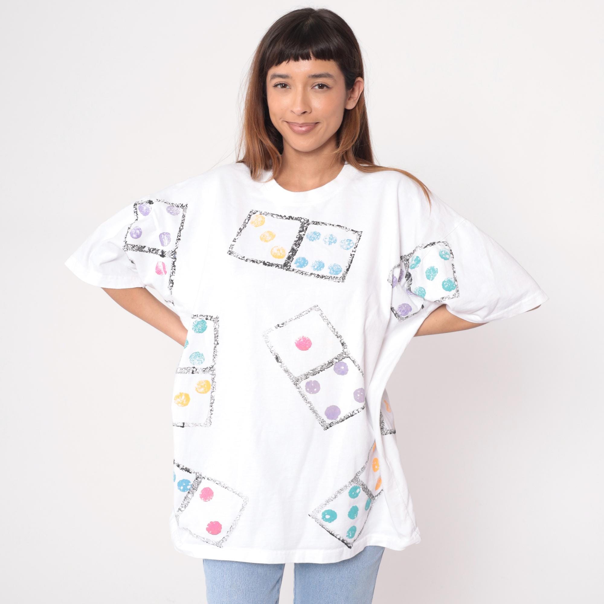 90s white t-shirt from cotton and co with all-over dice print graphic. Each die appears in a black-bordered square with dots in orange, blue, pink, purple, and turquoise. Short sleeves feature matching dice print.