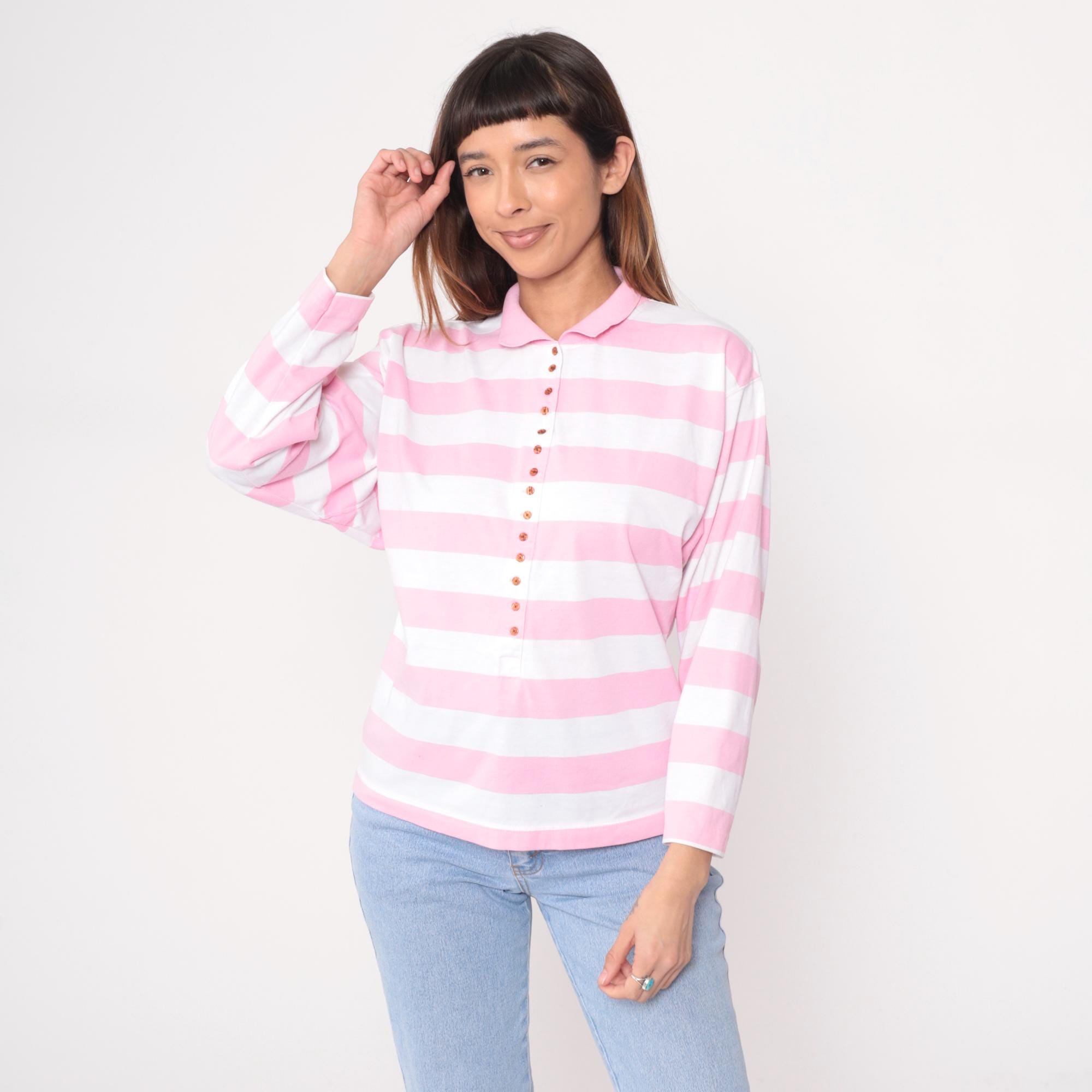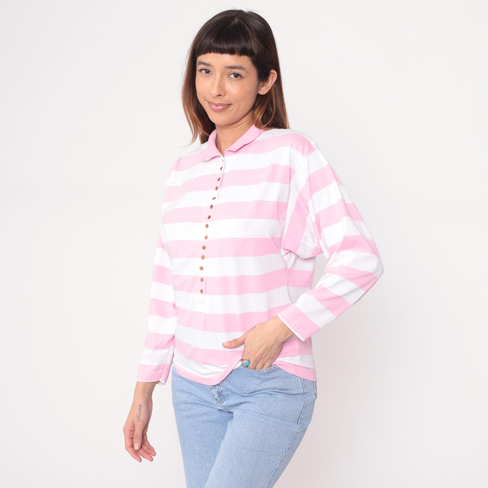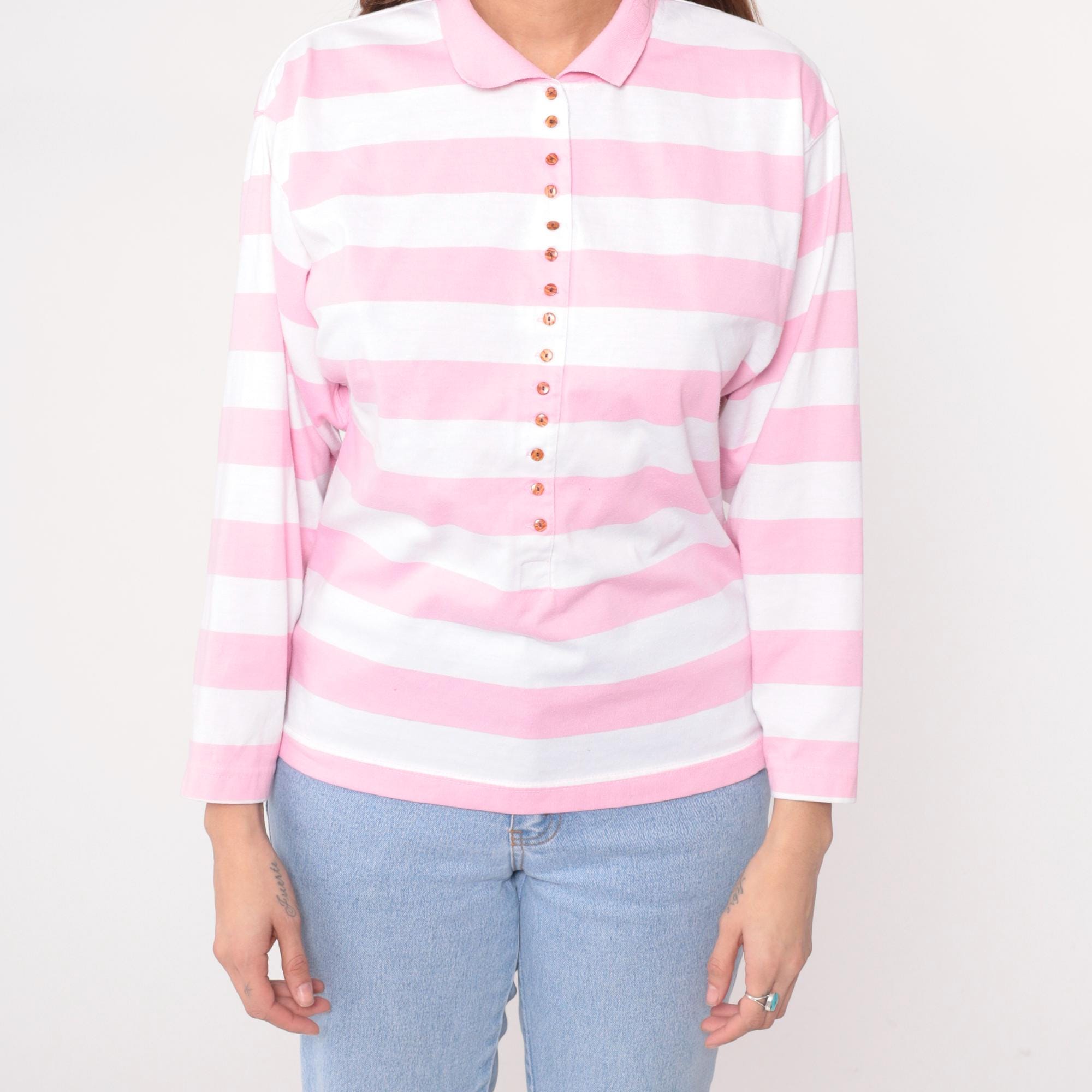80s pink and white horizontal striped polo shirt from American Weekend with collared neckline and button front placket with copper tone buttons. Long sleeves with ribbed cuffs and ribbed collar.