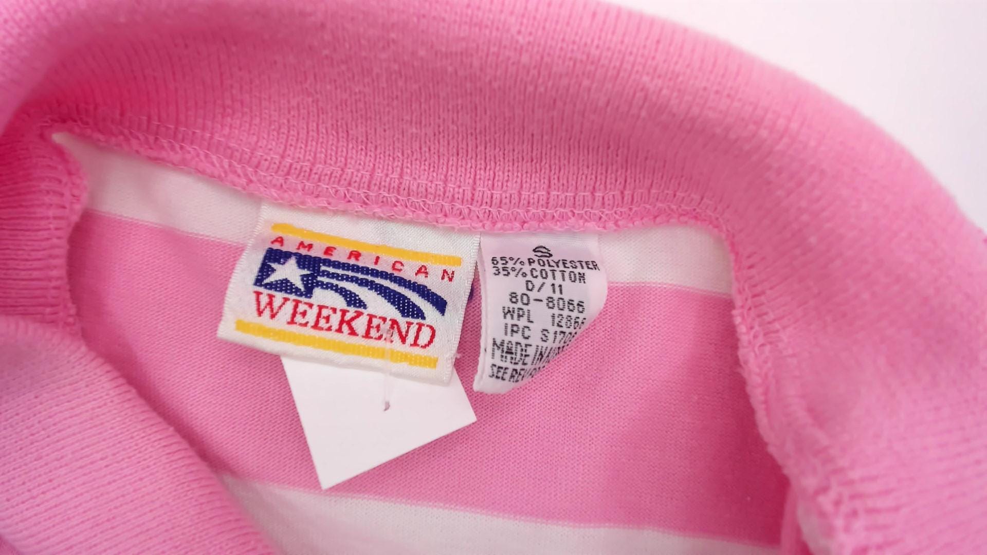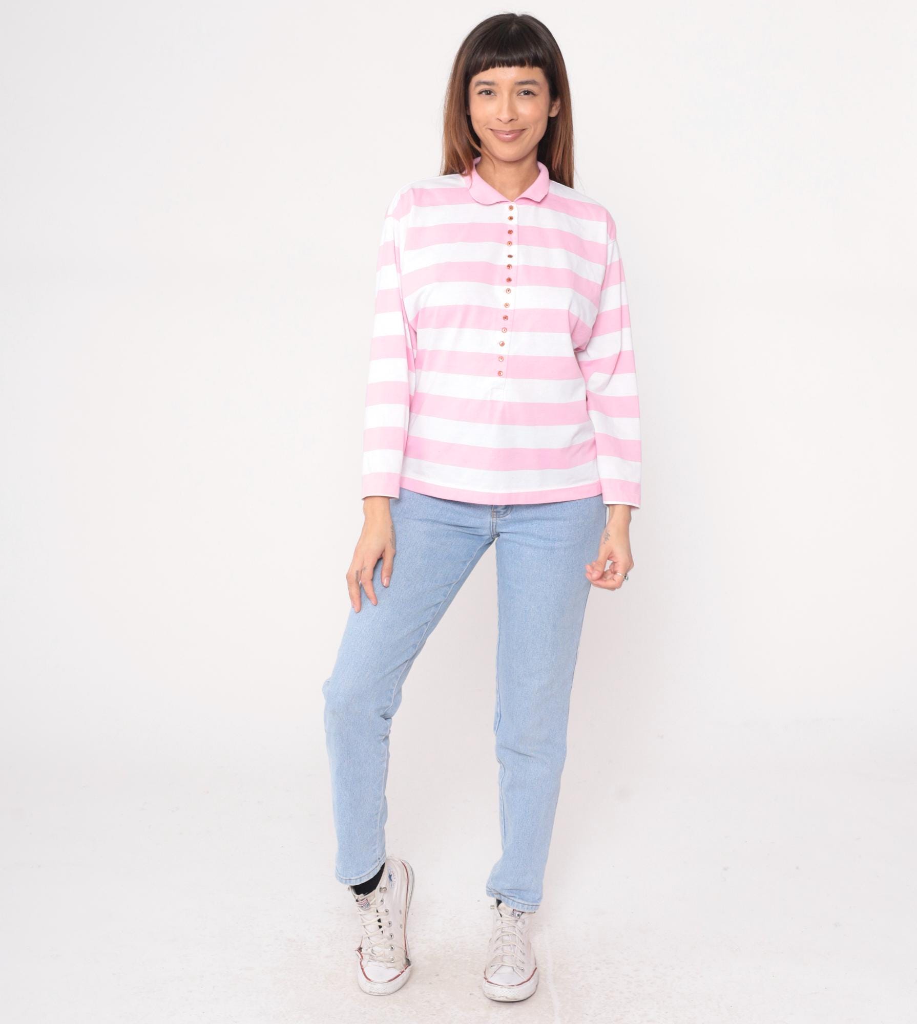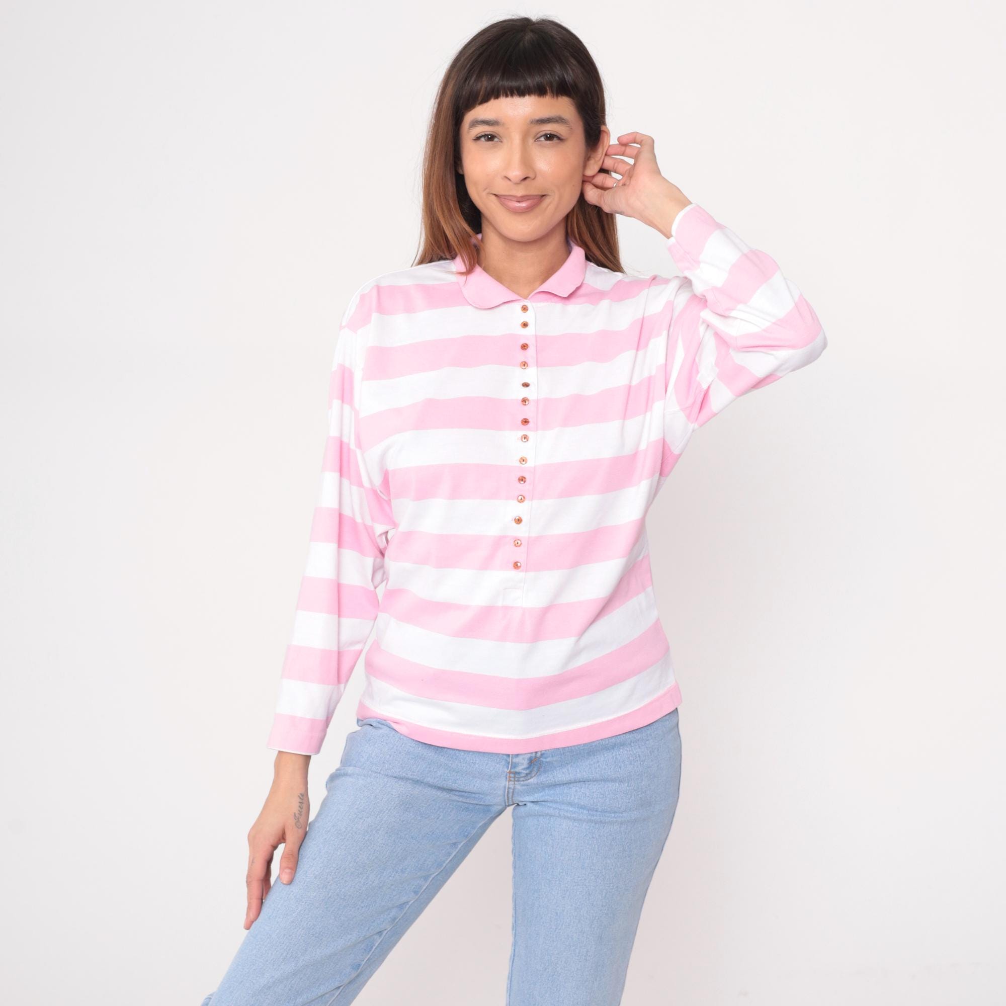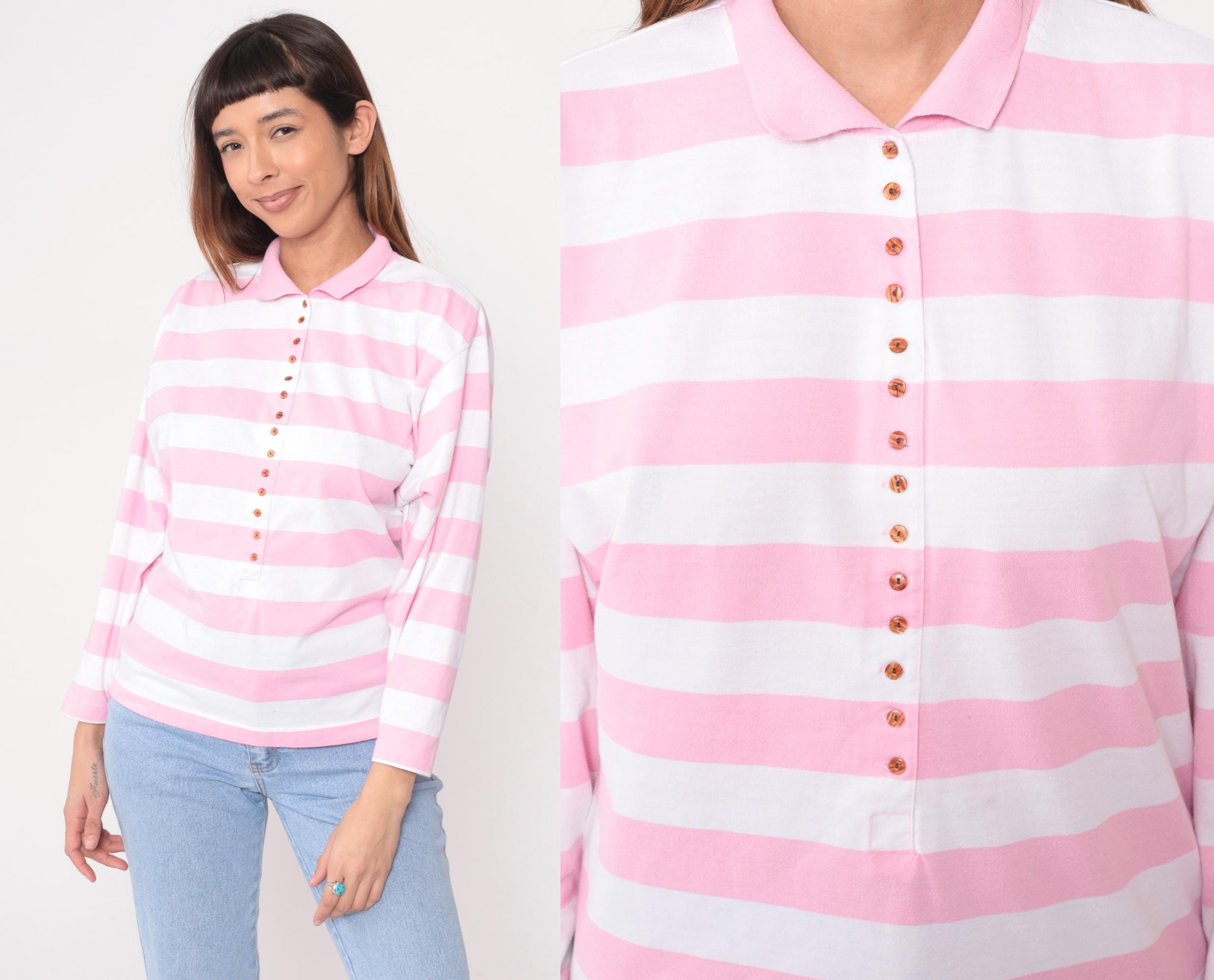 80s pink and white horizontal striped polo shirt from American Weekend with collared neckline and button front placket with copper tone buttons. Long sleeves with ribbed cuffs and ribbed collar.