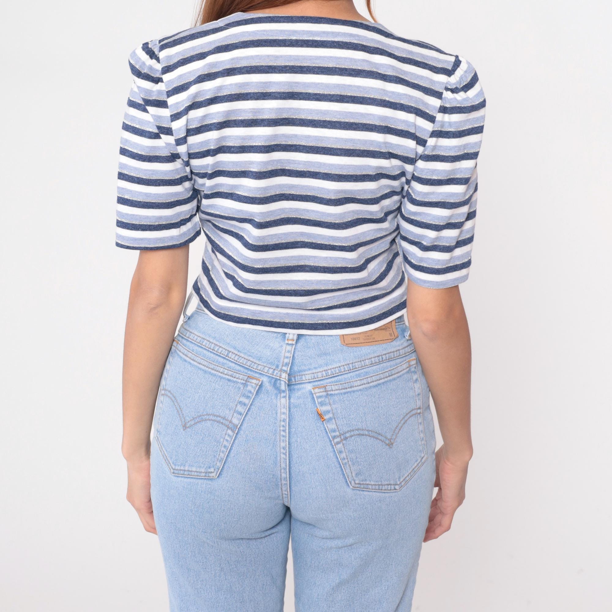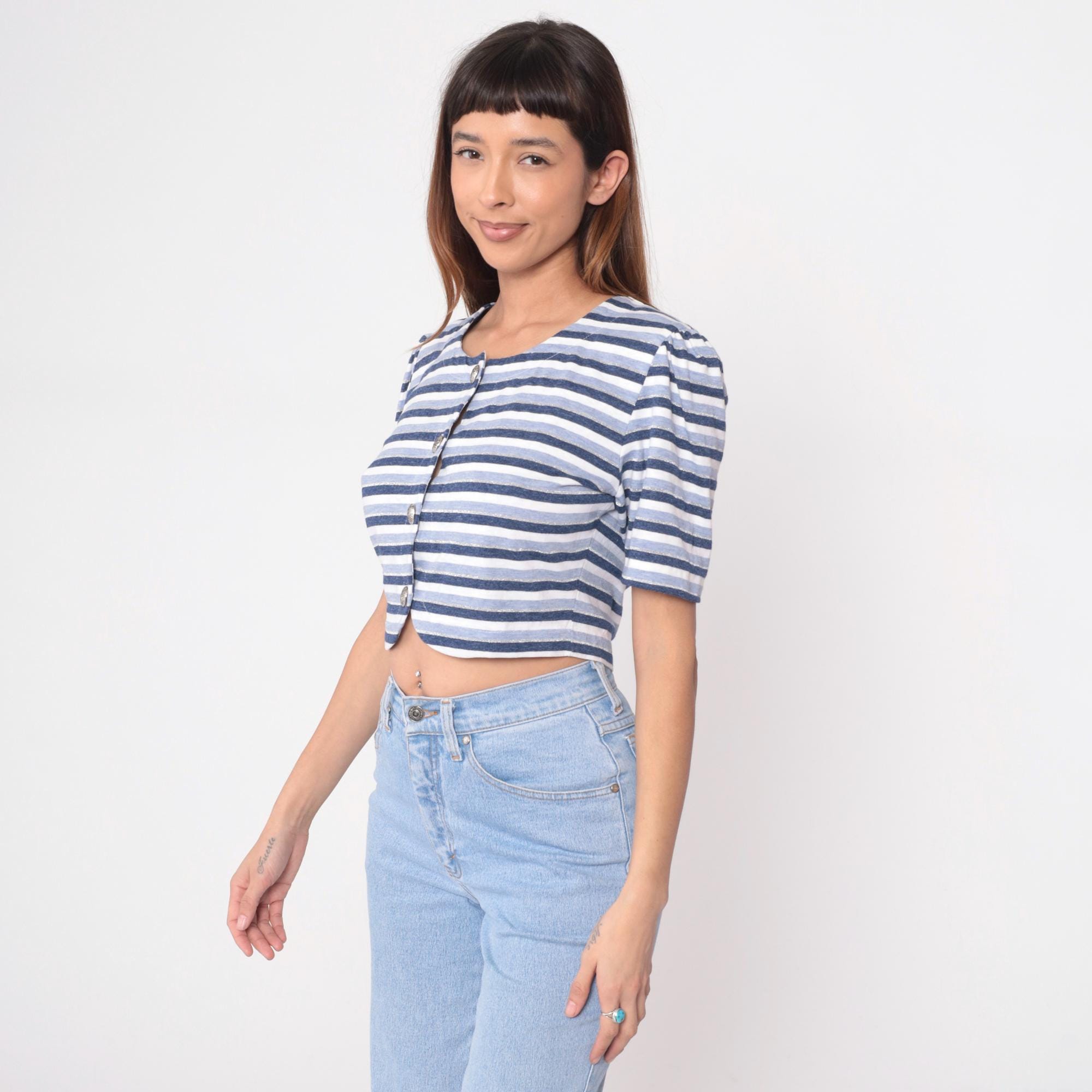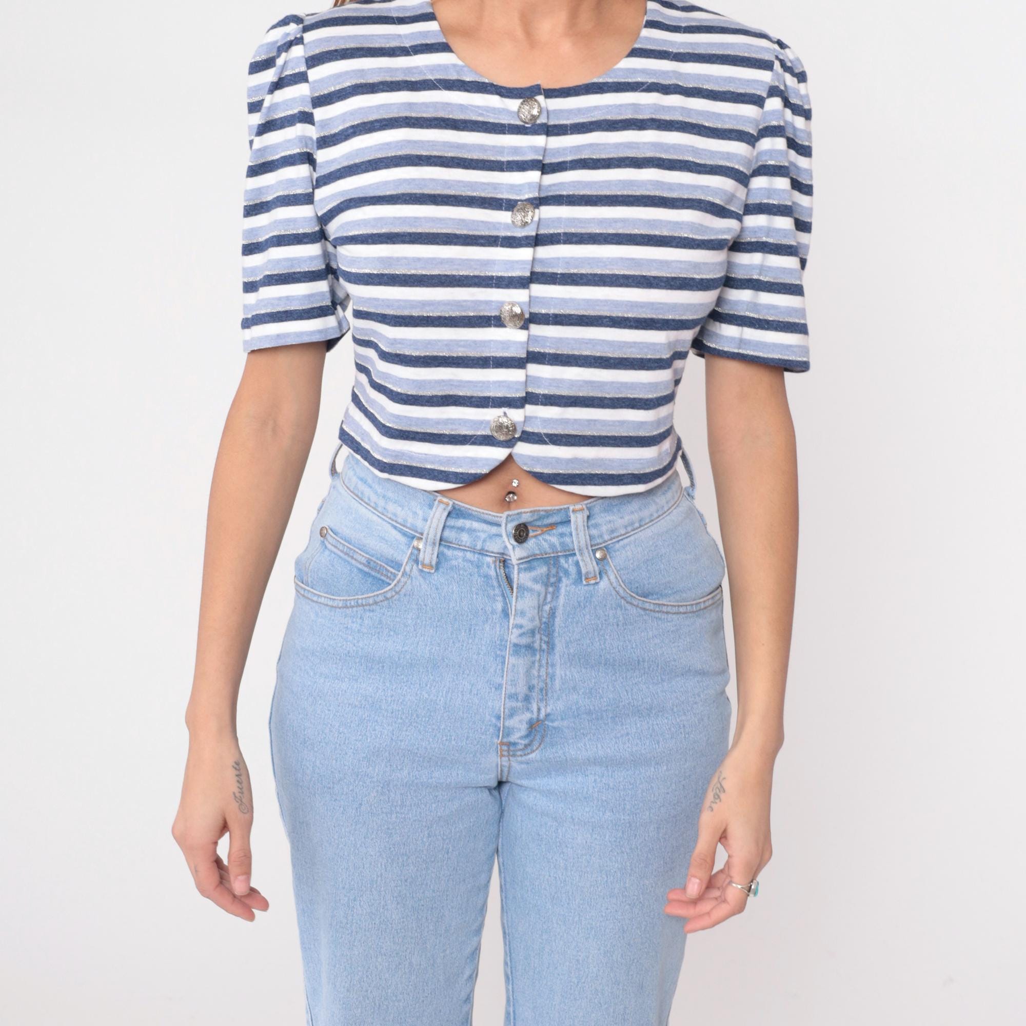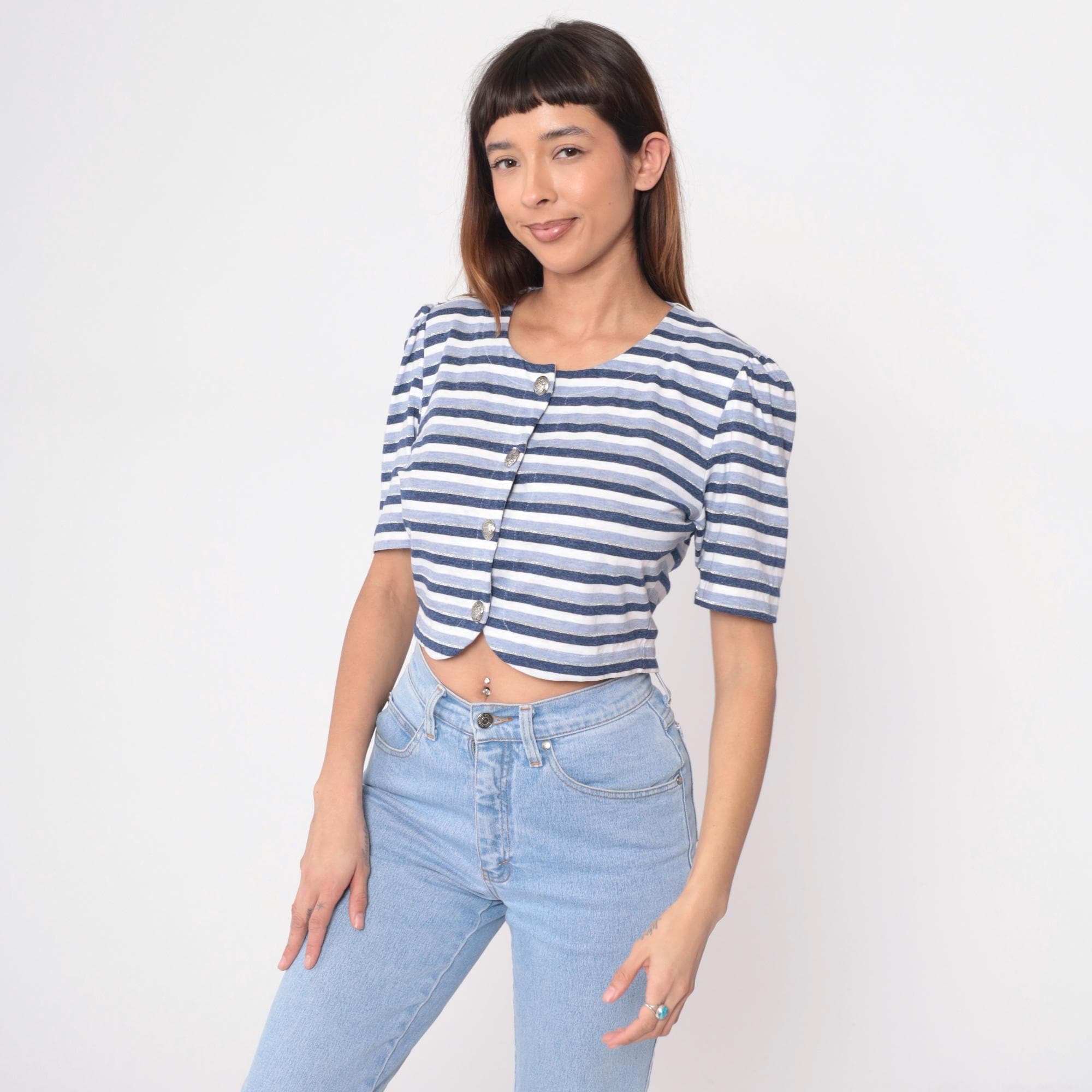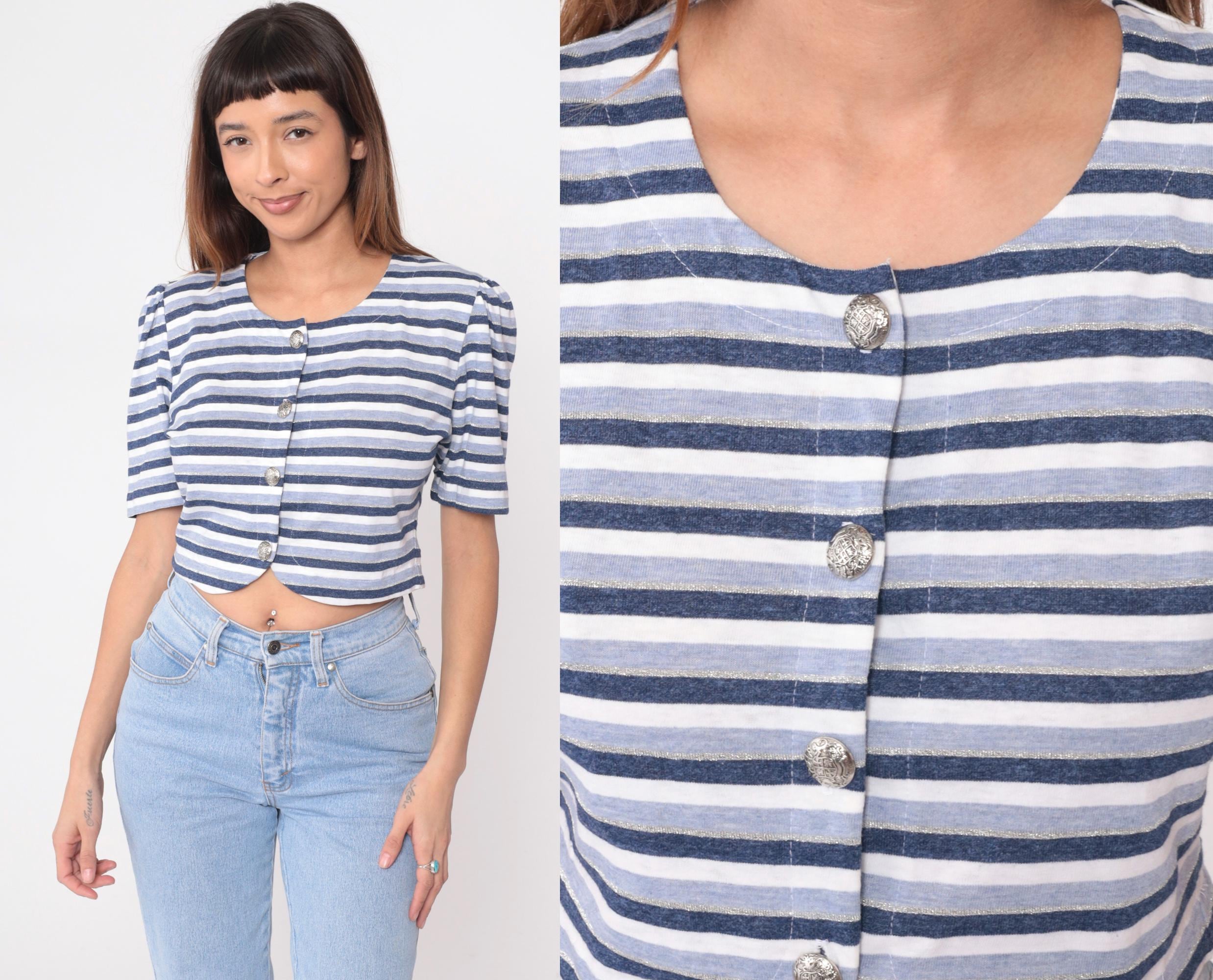 80s striped crop top with short puff sleeves and round neckline. Navy blue, light blue, and white horizontal stripes throughout. Button front closure with silver-tone decorative buttons.