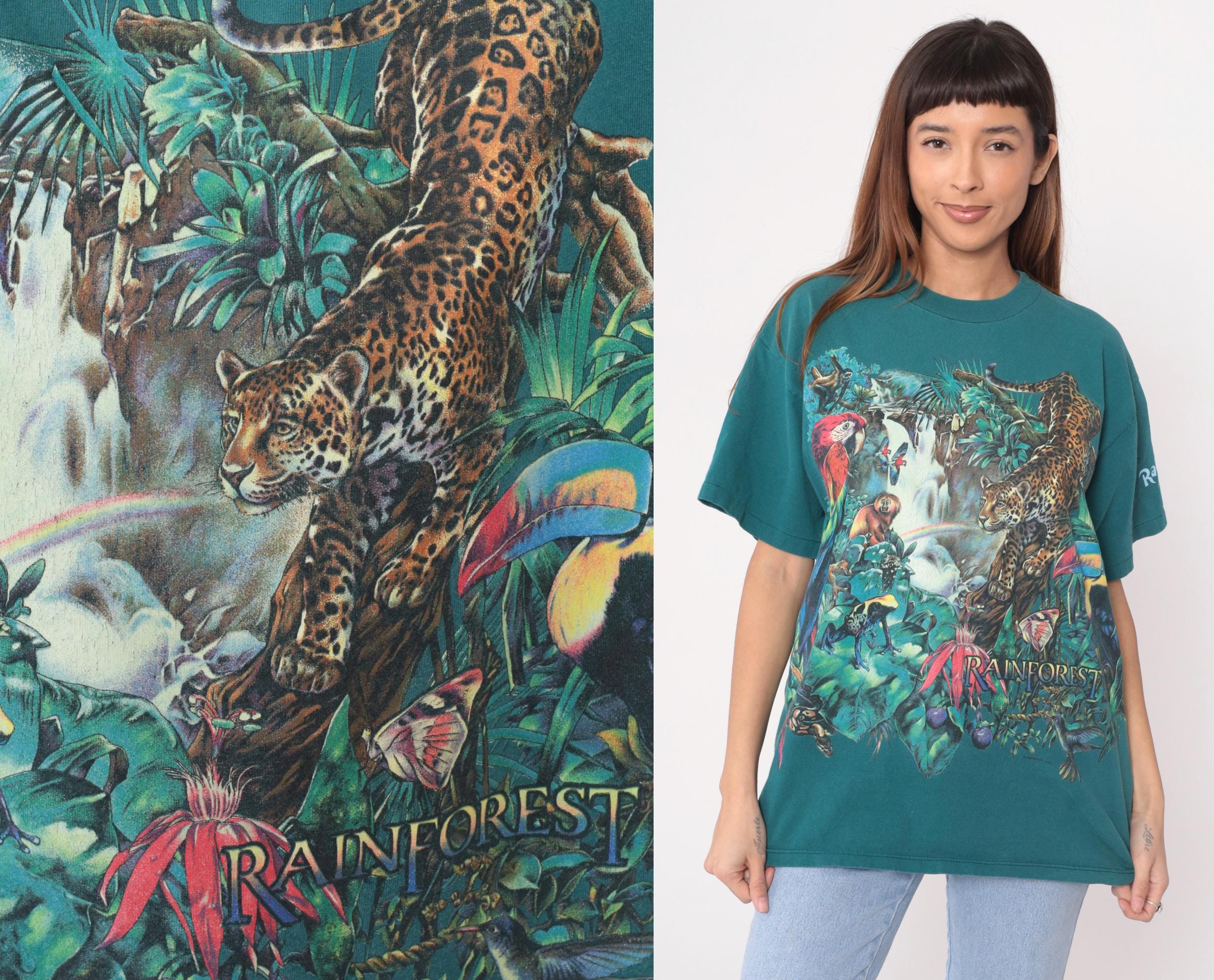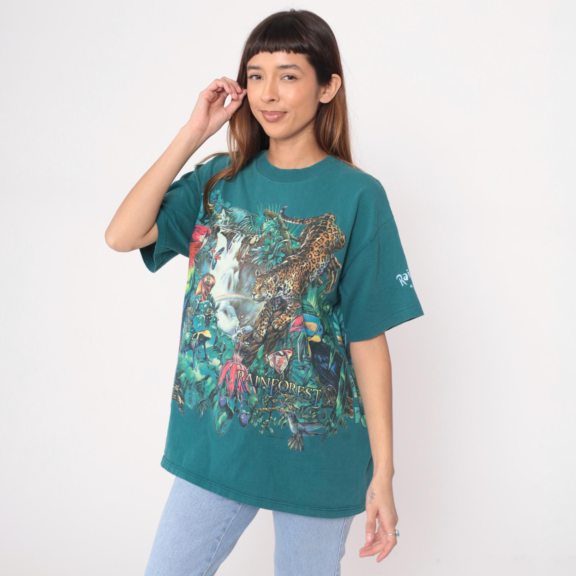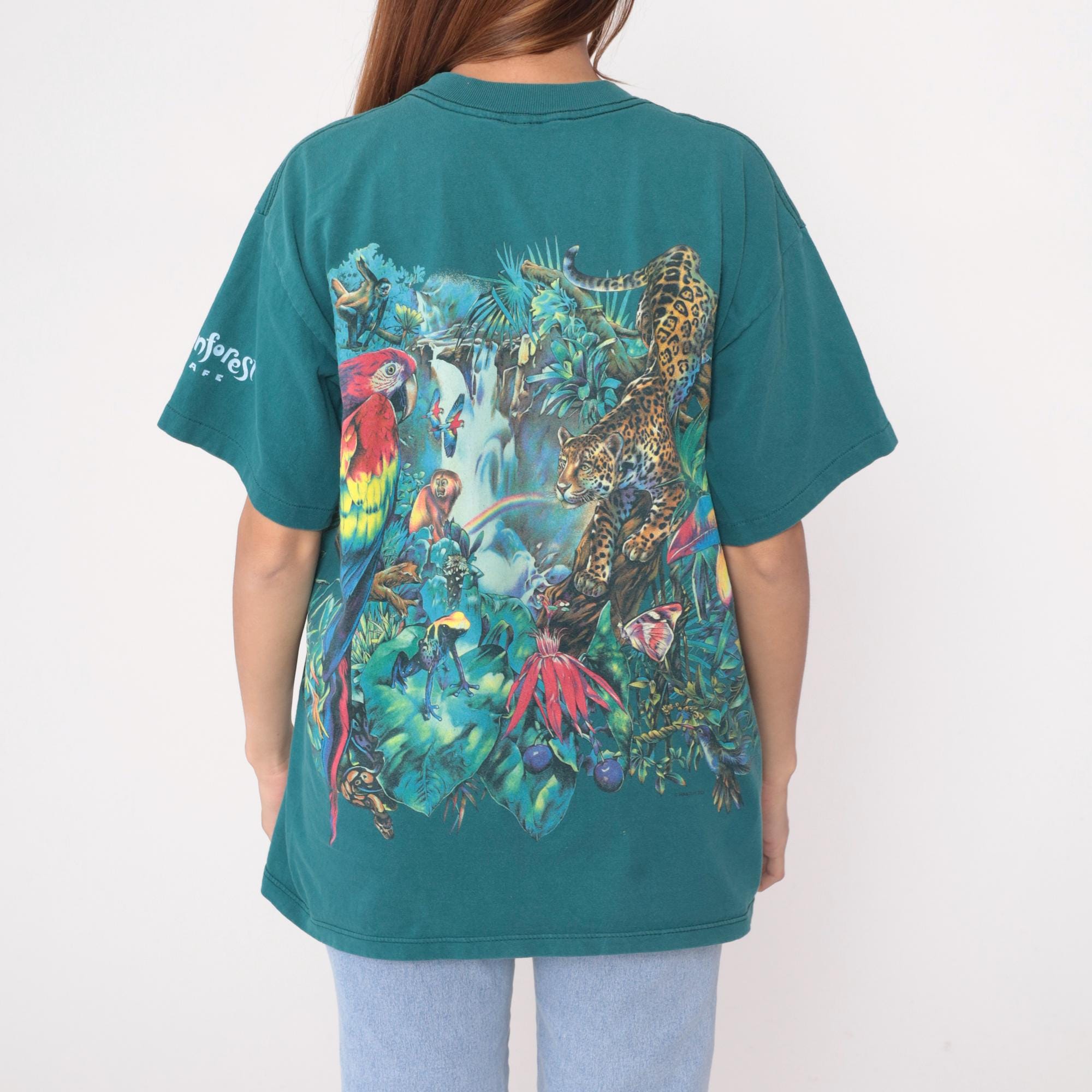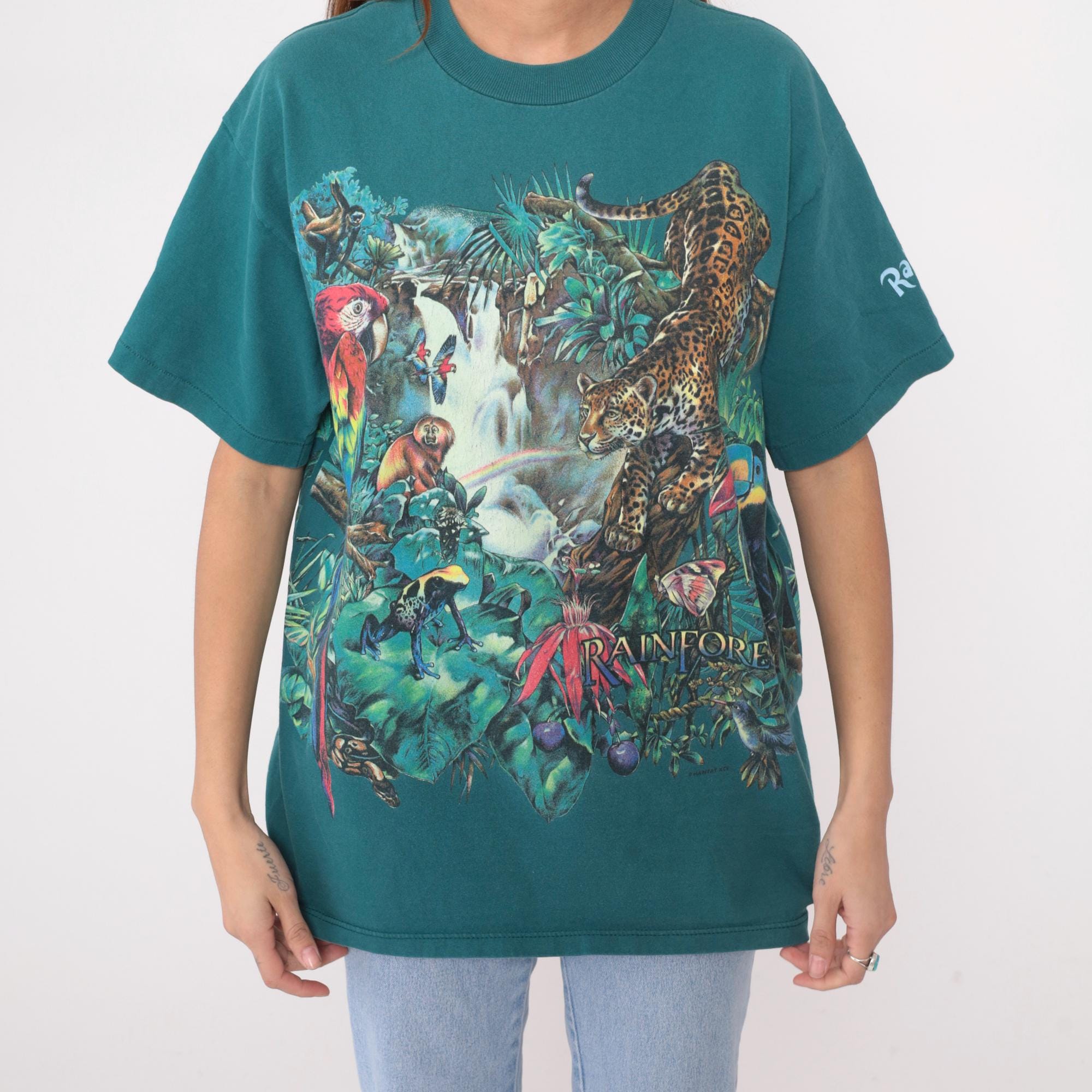 90s teal rainforest t-shirt from habitat with all-over jungle scene print featuring leopard, red macaw parrot, monkey, waterfall, tropical flowers and foliage. Gold "RAINFOREST" text on front lower right, white "Rainforest" text on left sleeve. Oversized fit with crew neck and short sleeves.