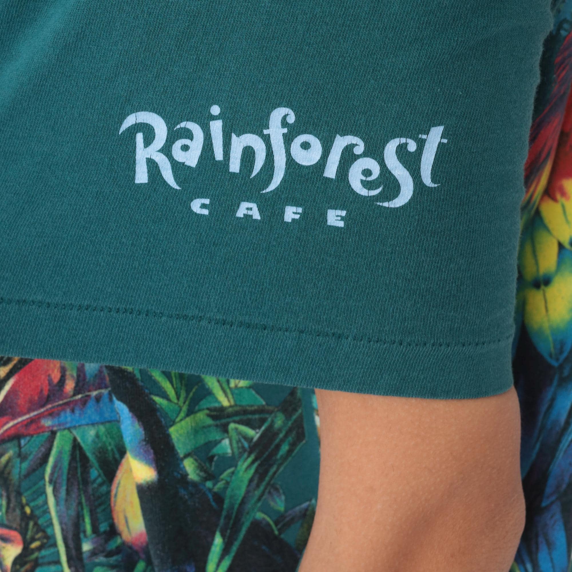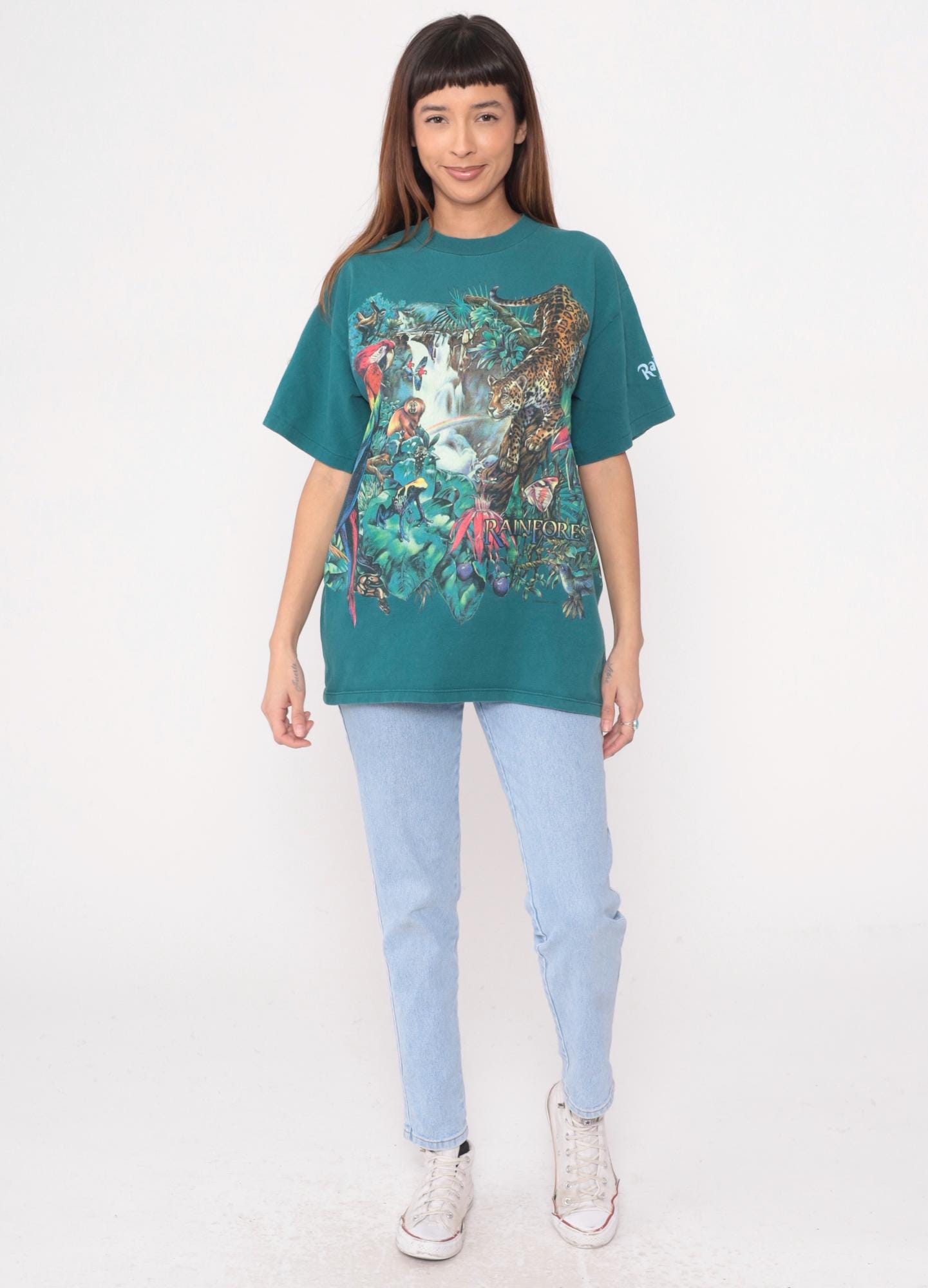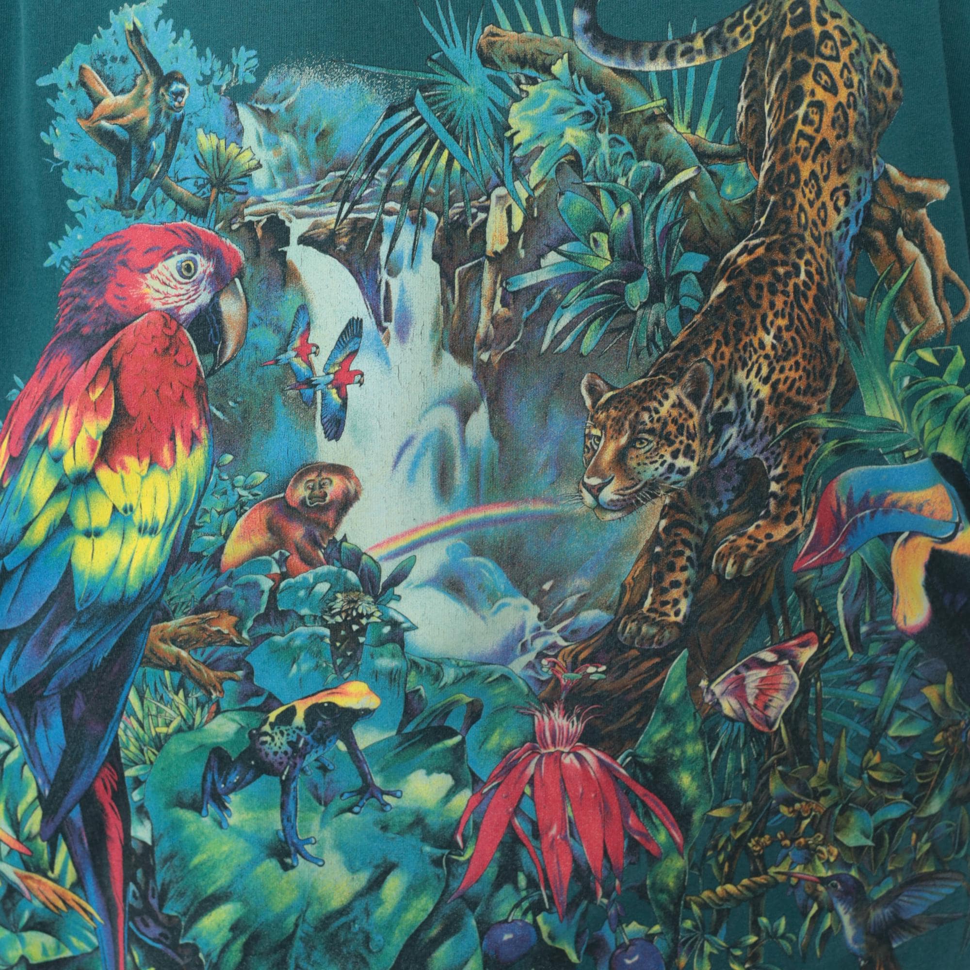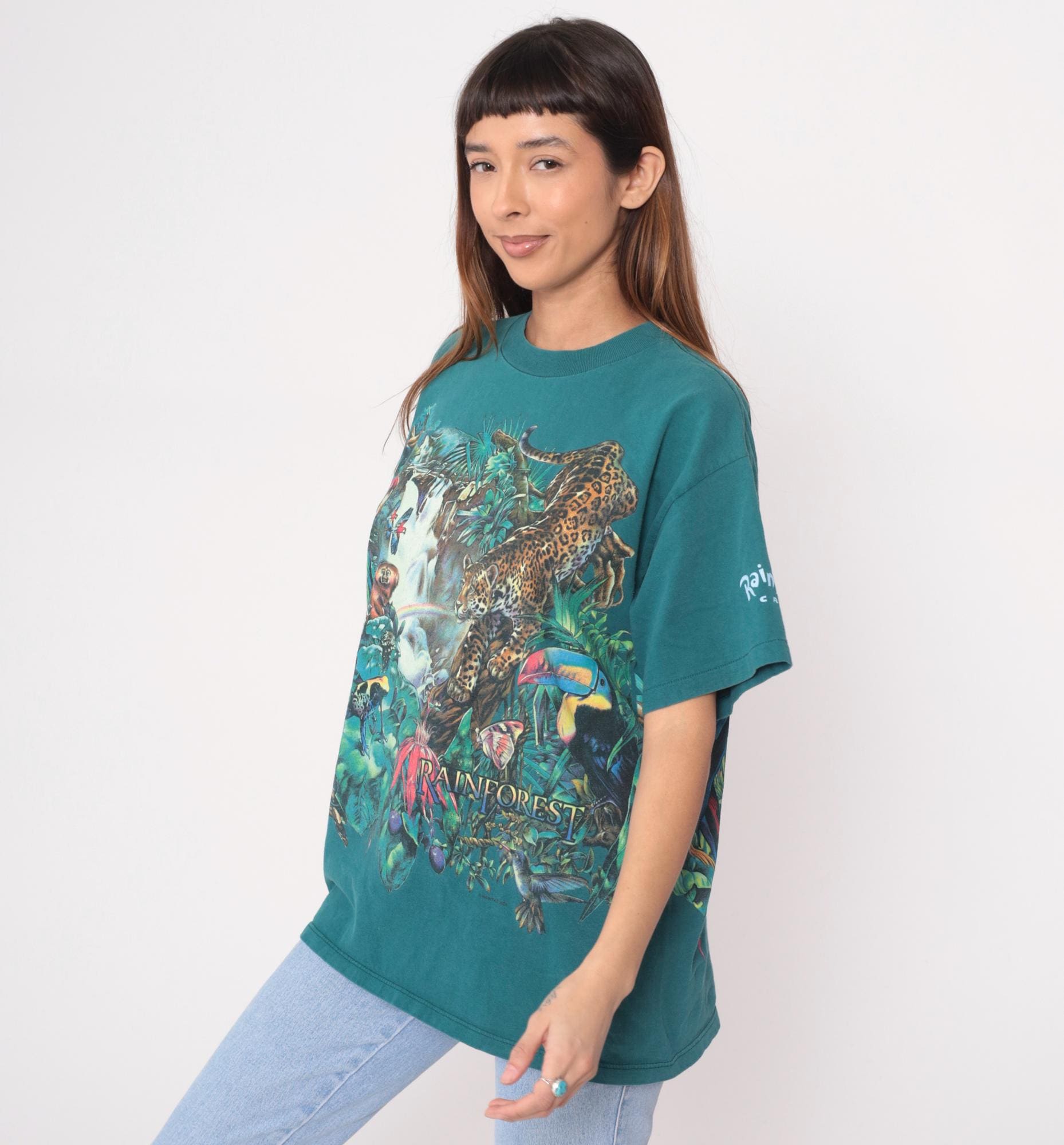 90s teal rainforest t-shirt from habitat with all-over jungle scene print featuring leopard, red macaw parrot, monkey, waterfall, tropical flowers and foliage. Gold "RAINFOREST" text on front lower right, white "Rainforest" text on left sleeve. Oversized fit with crew neck and short sleeves.