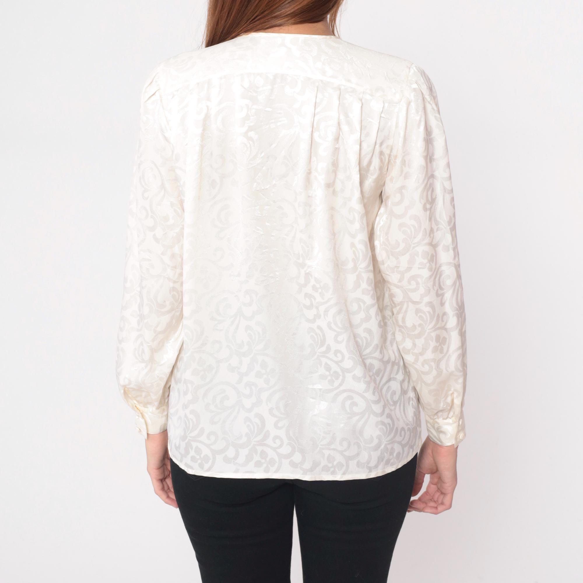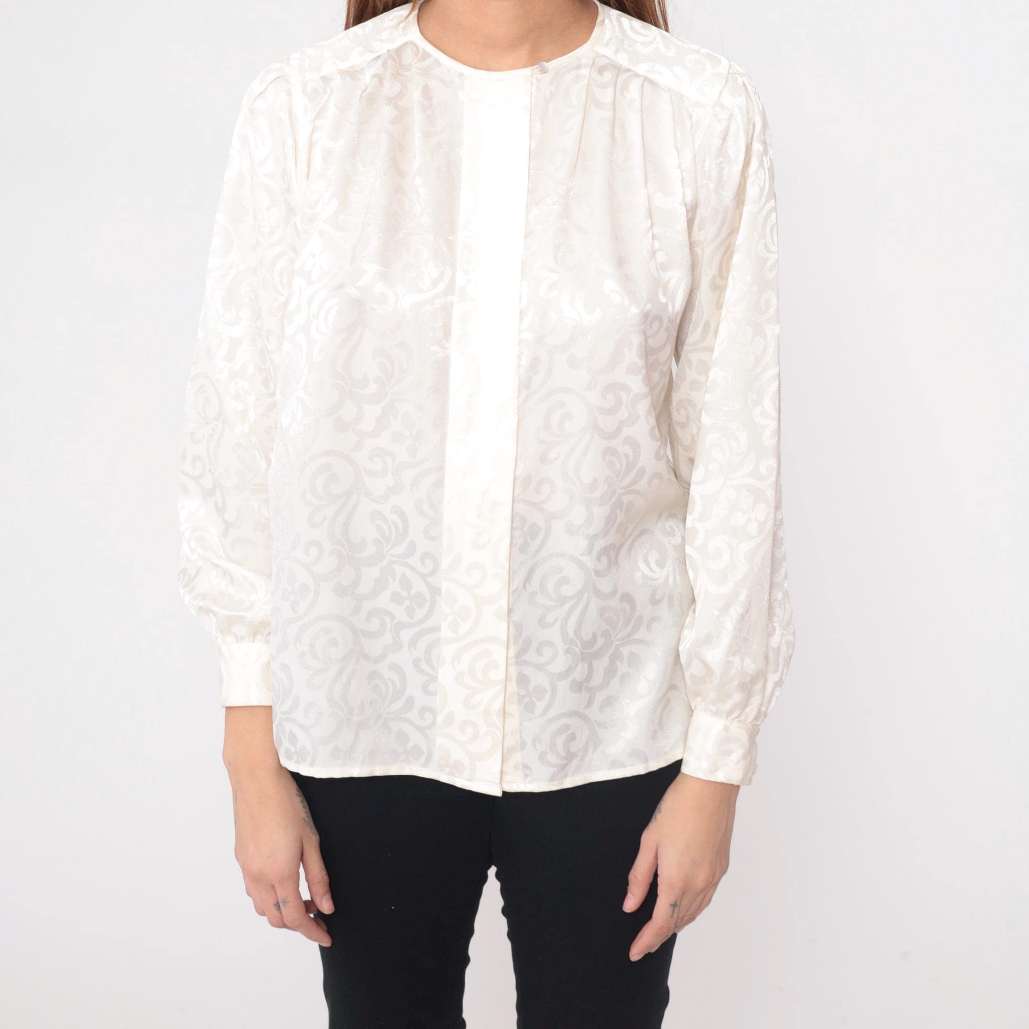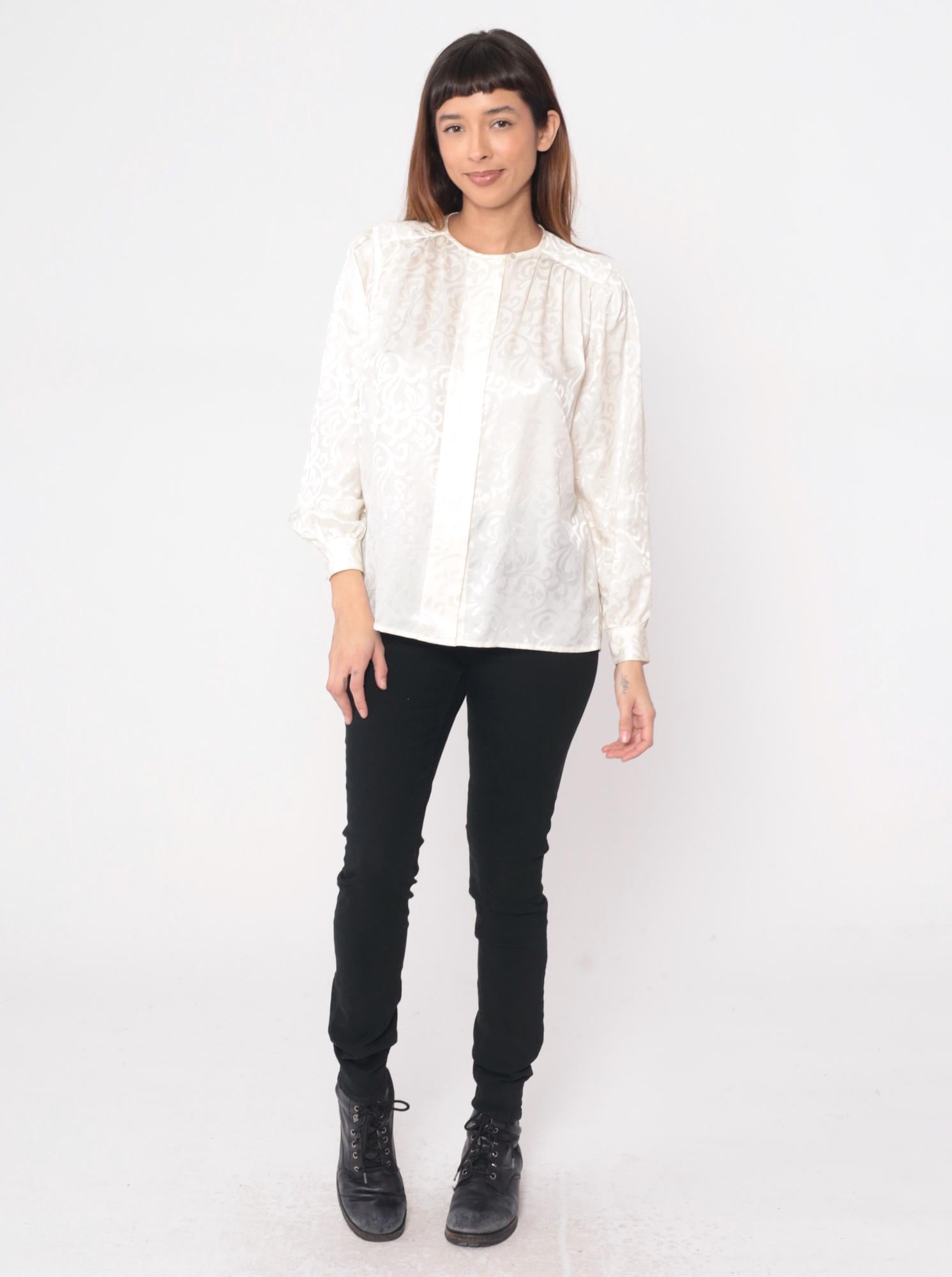 80s cream blouse from claude bennet with subtle damask jacquard pattern throughout the fabric. Round neckline with concealed button front placket, gathered shoulders, and long sleeves with button cuffs.