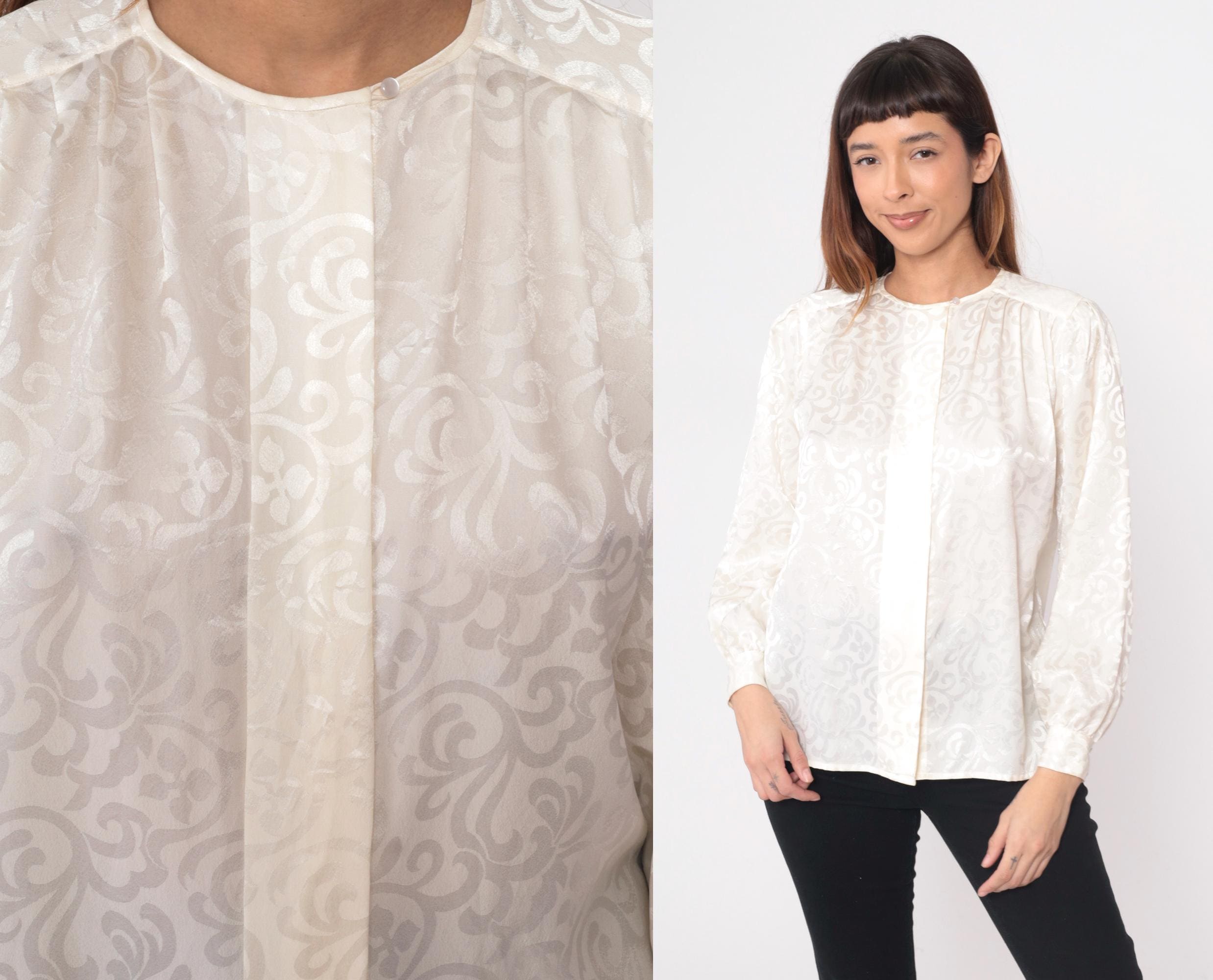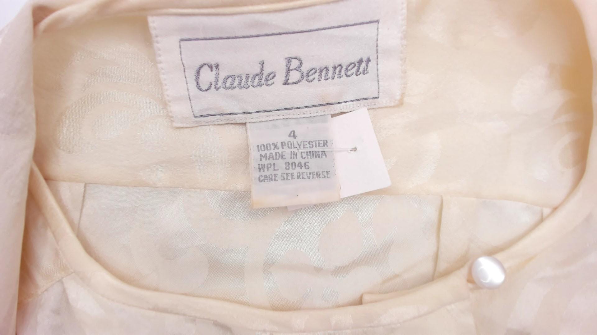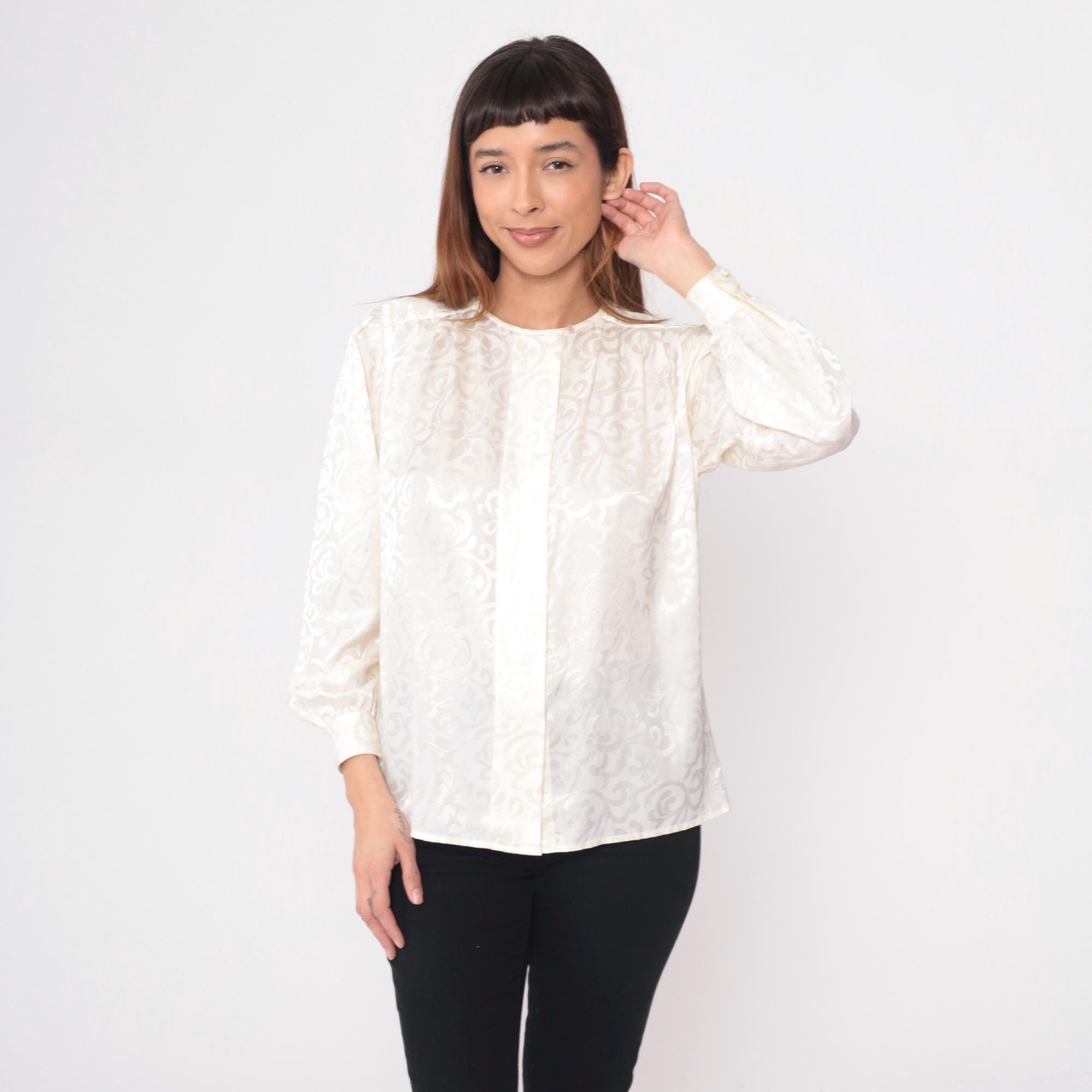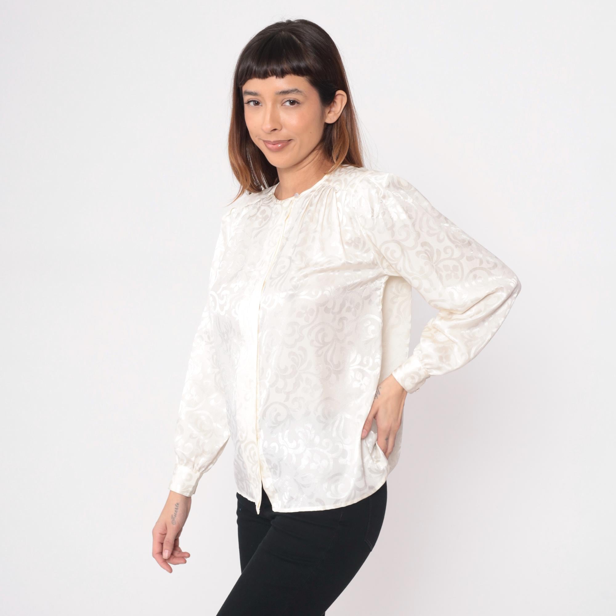 80s cream blouse from claude bennet with subtle damask jacquard pattern throughout the fabric. Round neckline with concealed button front placket, gathered shoulders, and long sleeves with button cuffs.