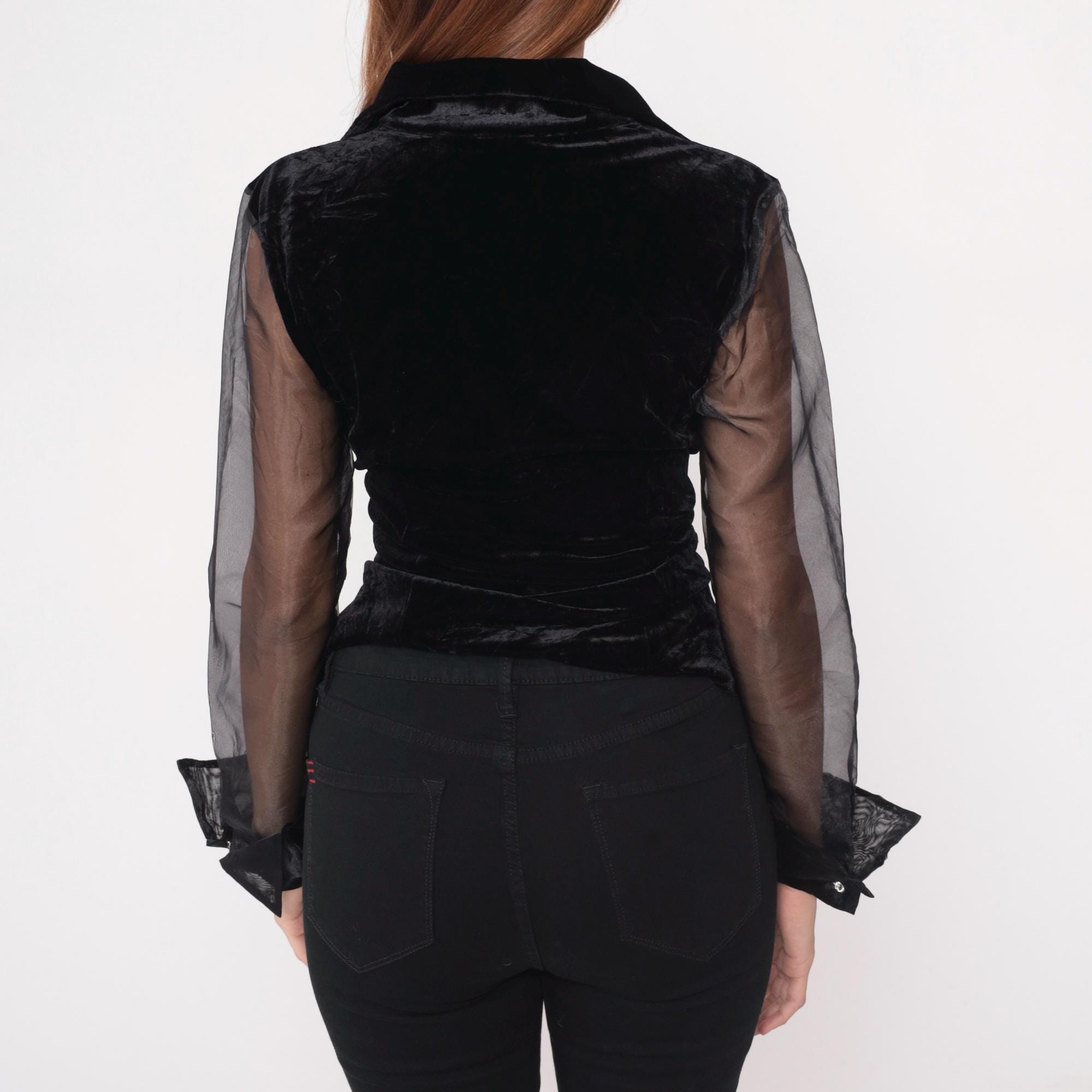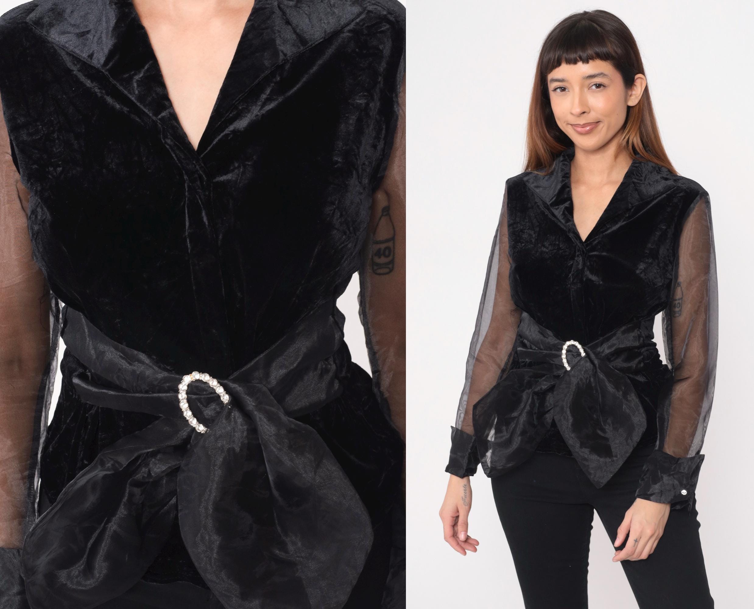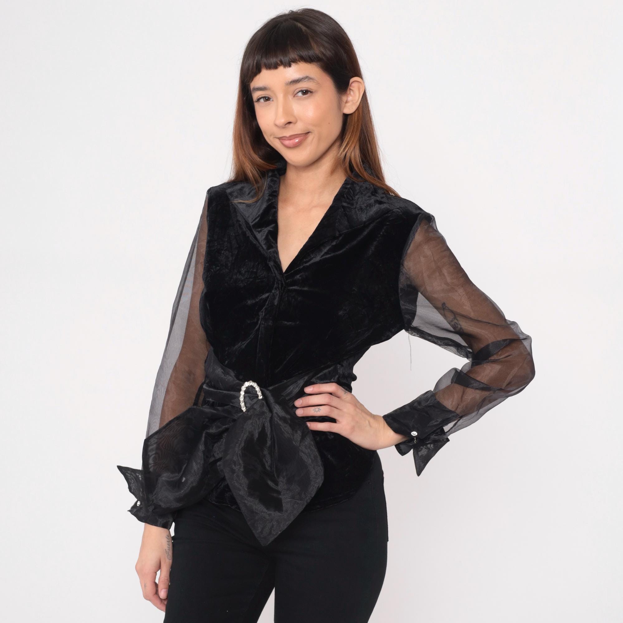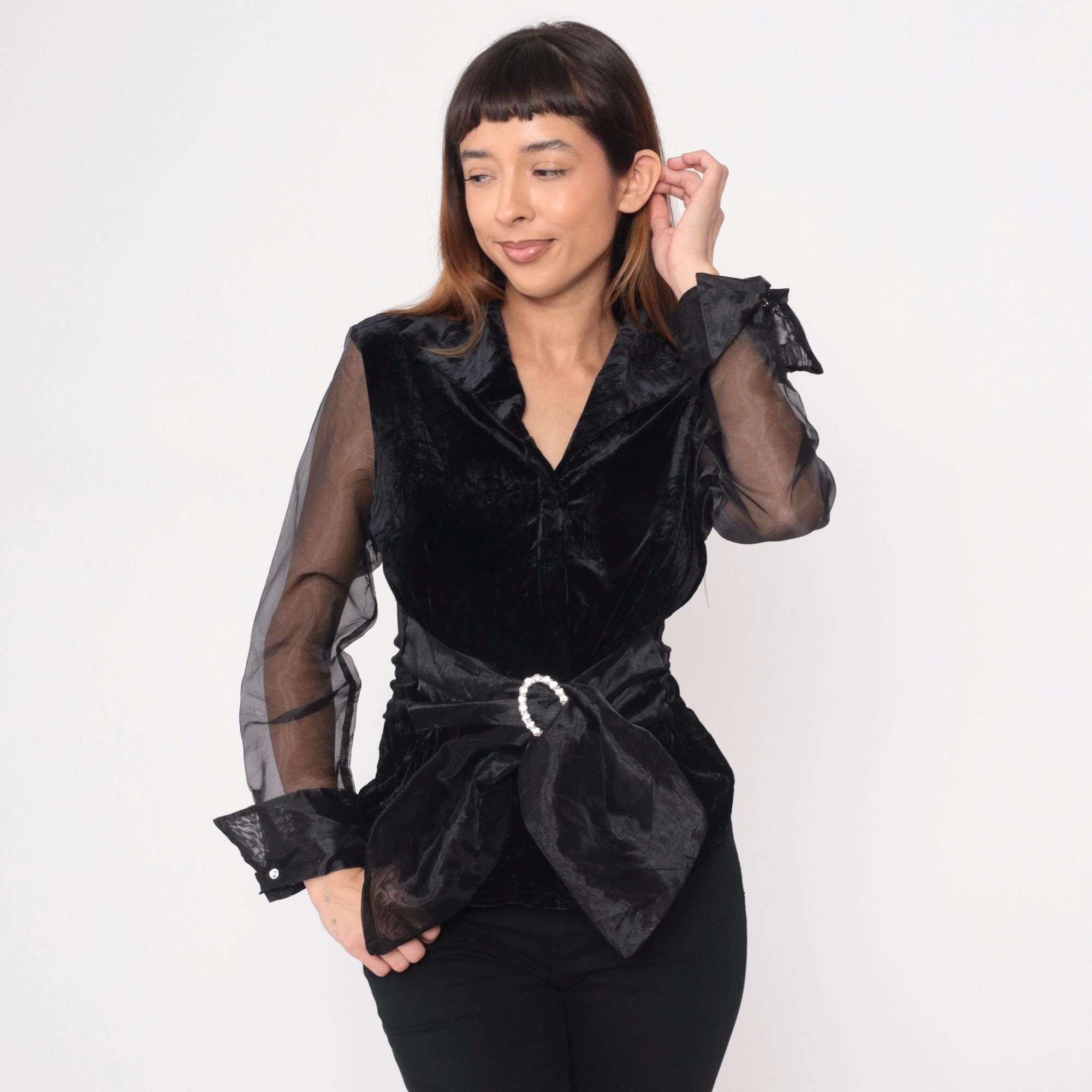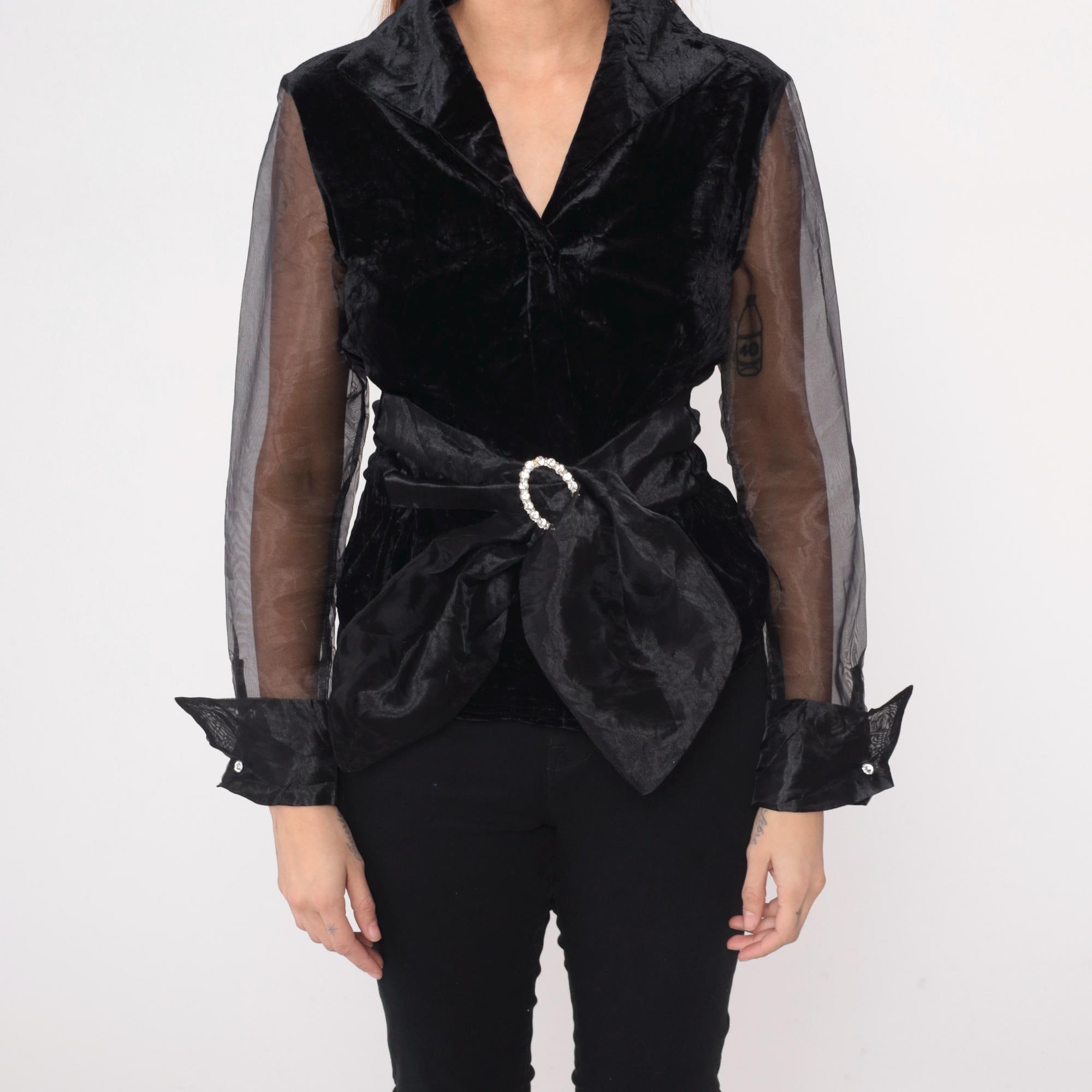 90s black crushed velvet blouse with sheer organza sleeves and notched collar. Wrap-style tie waist with rhinestone buckle detail, decorative floral appliqué cuffs with pearl and rhinestone centers.