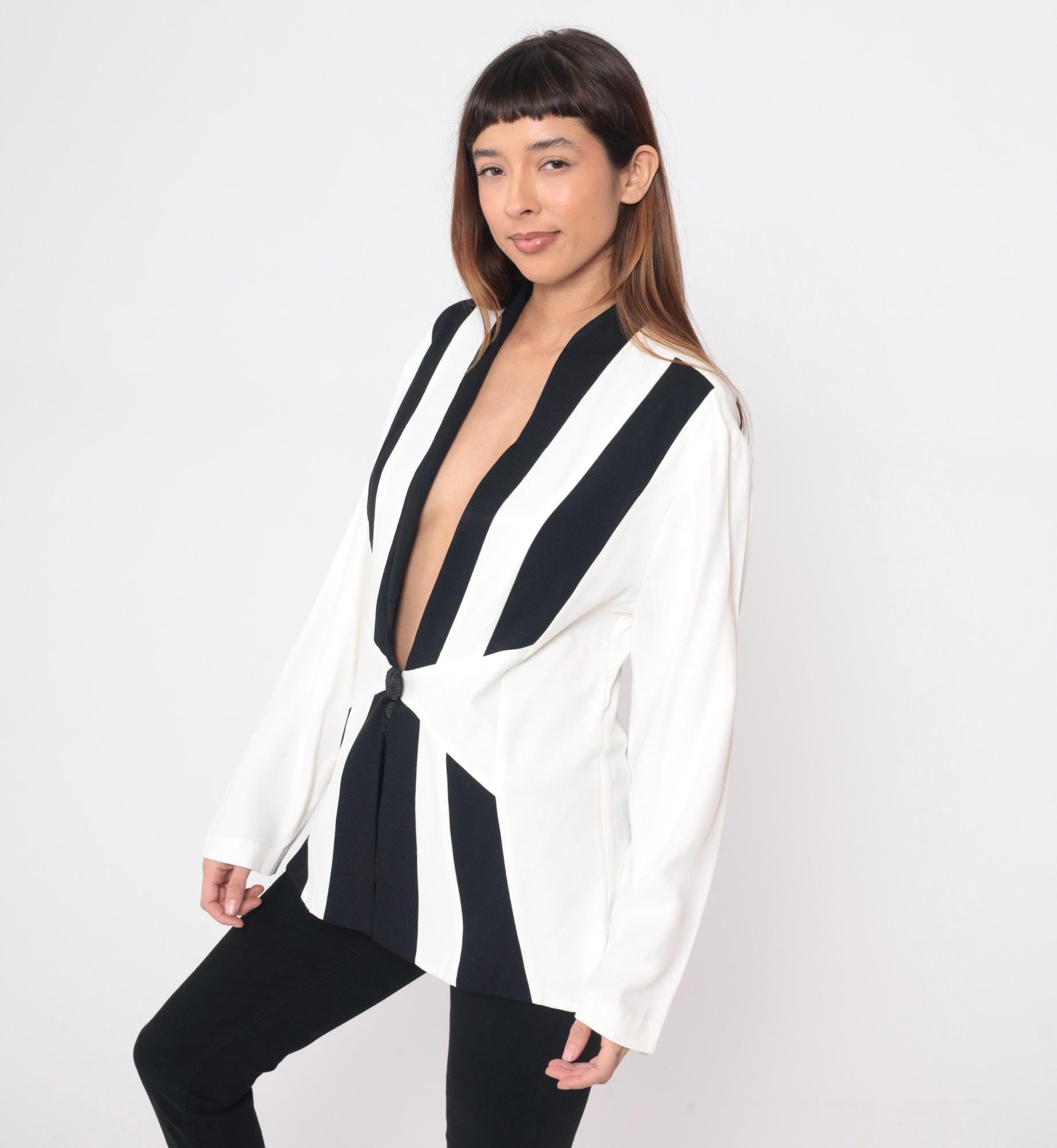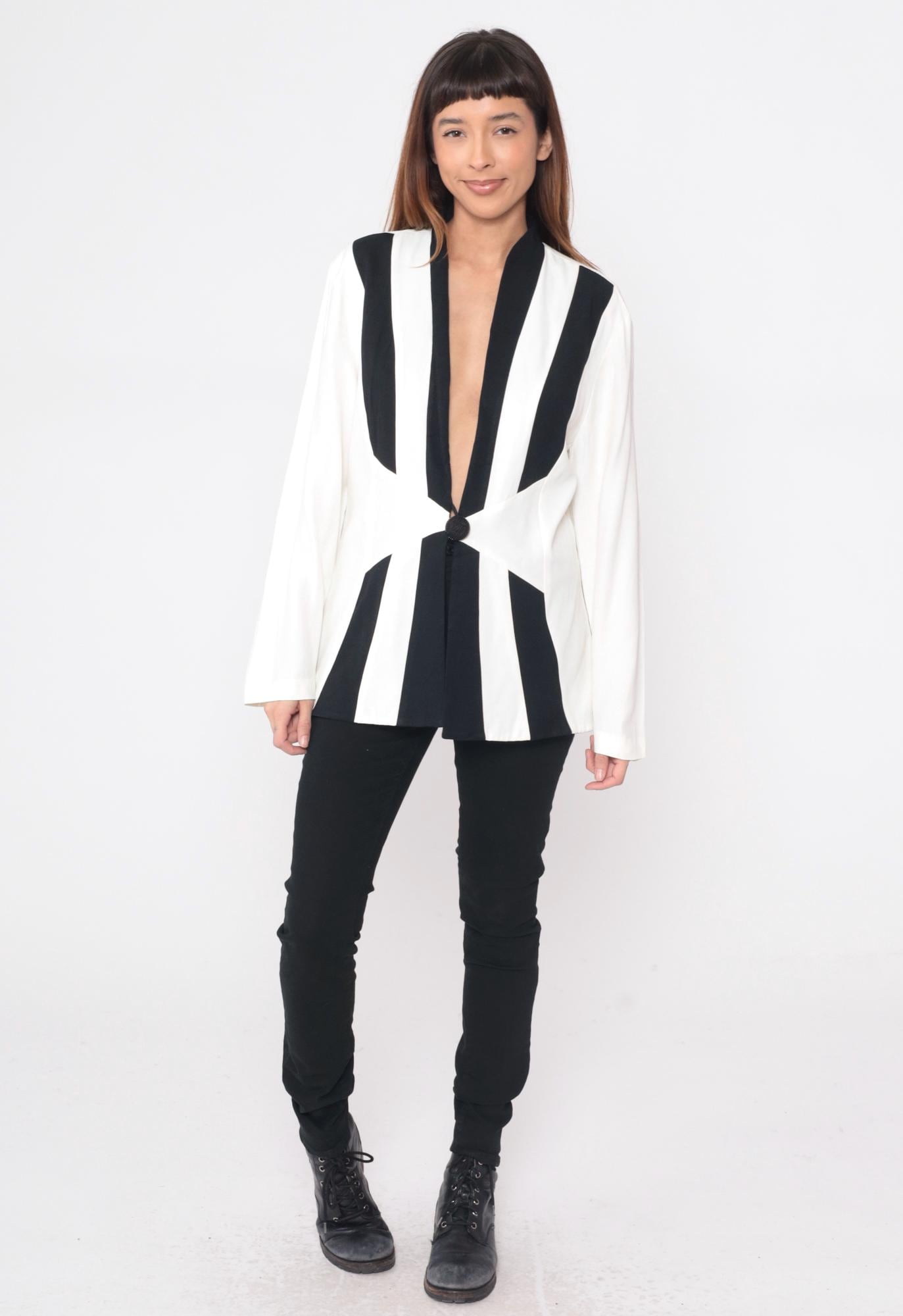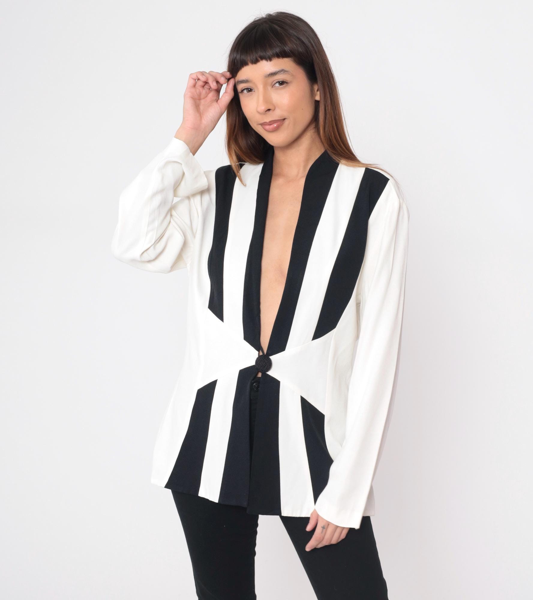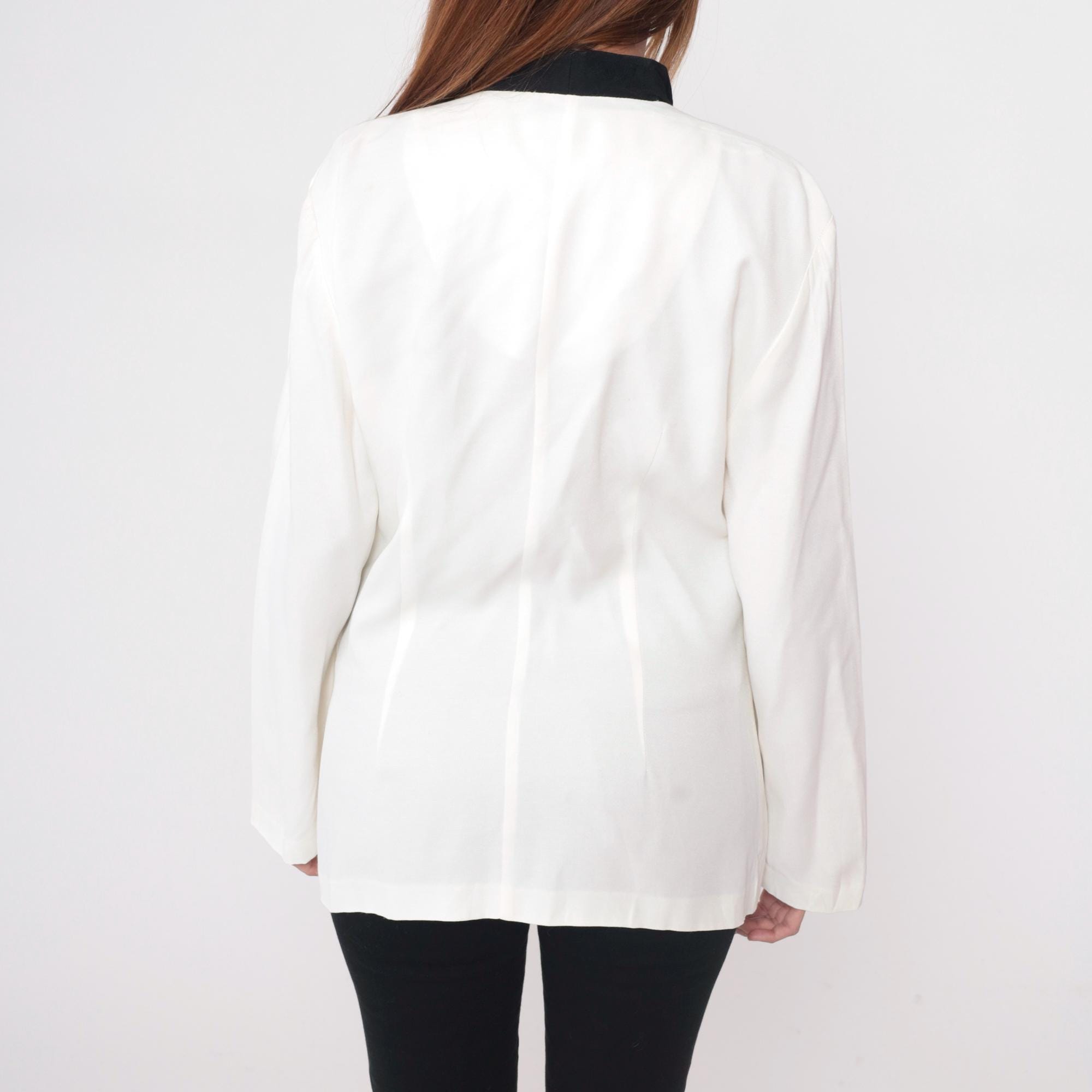 90s white blazer from dj summers with black contrast collar and lapels creating geometric color blocking throughout. Deep V-neckline with decorative black beaded knot closure at front, black contrast panels at sides. Long sleeves with black collar extending down the back.