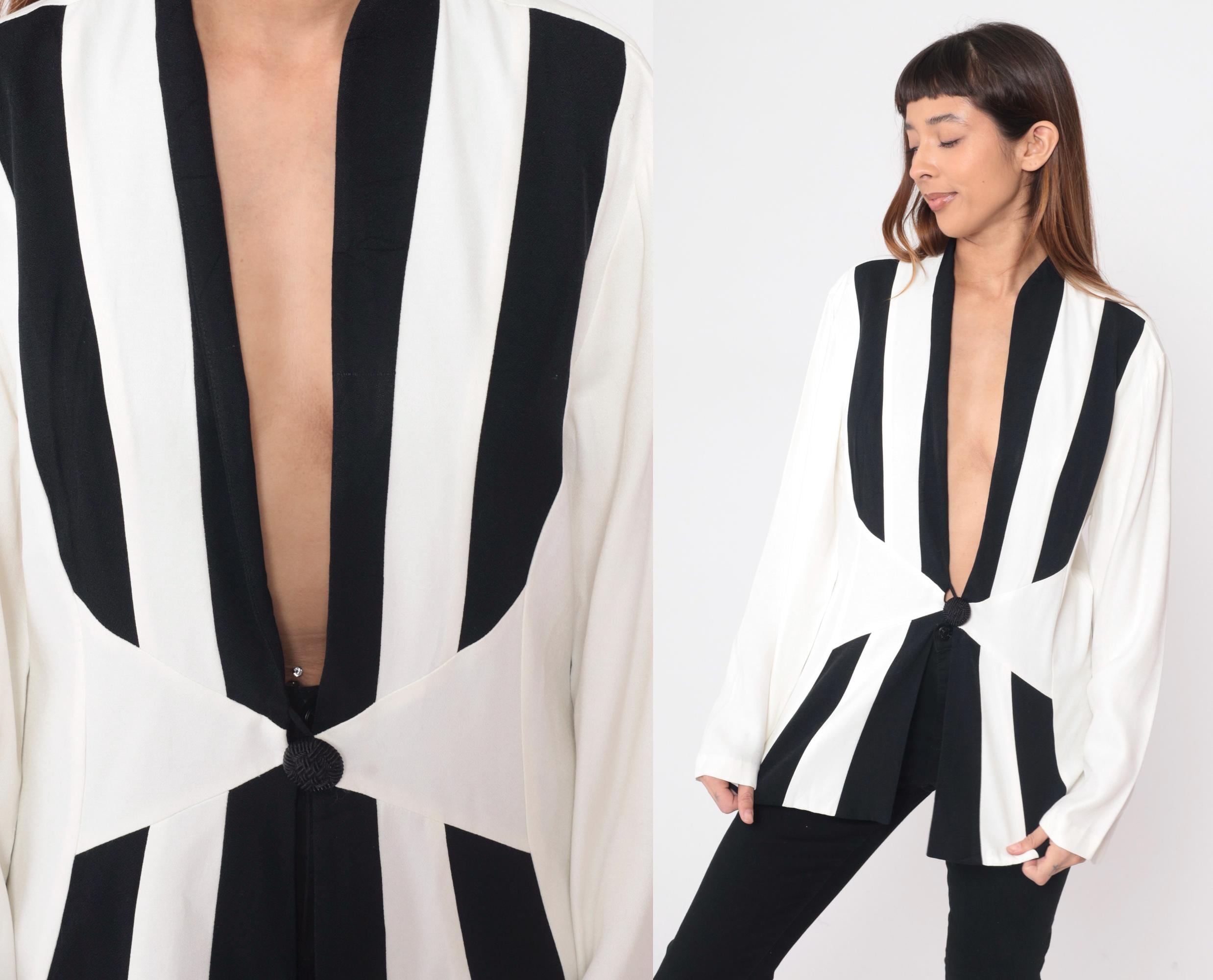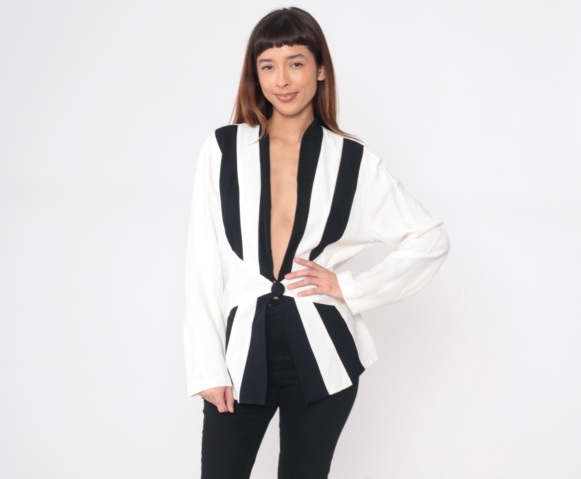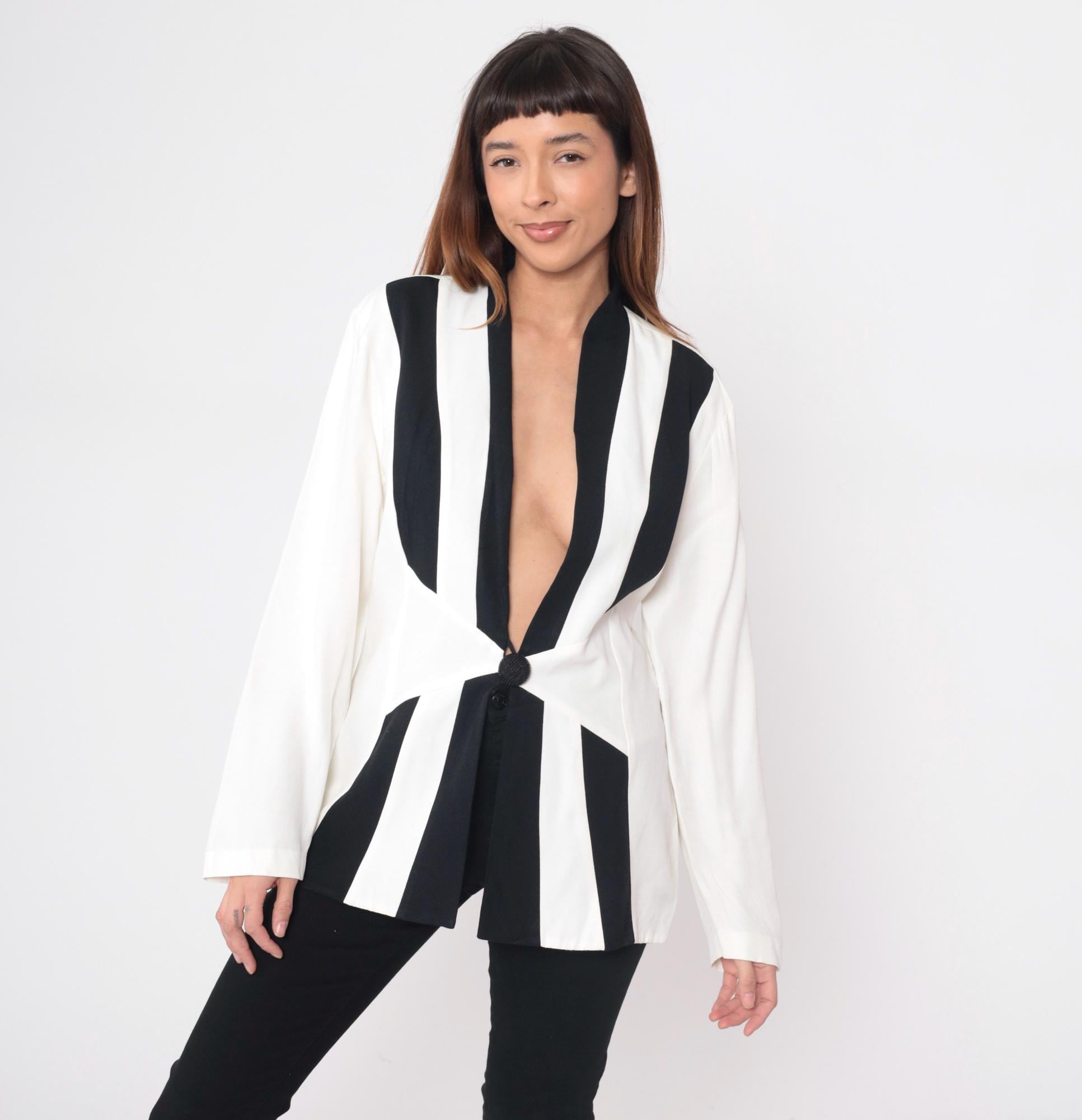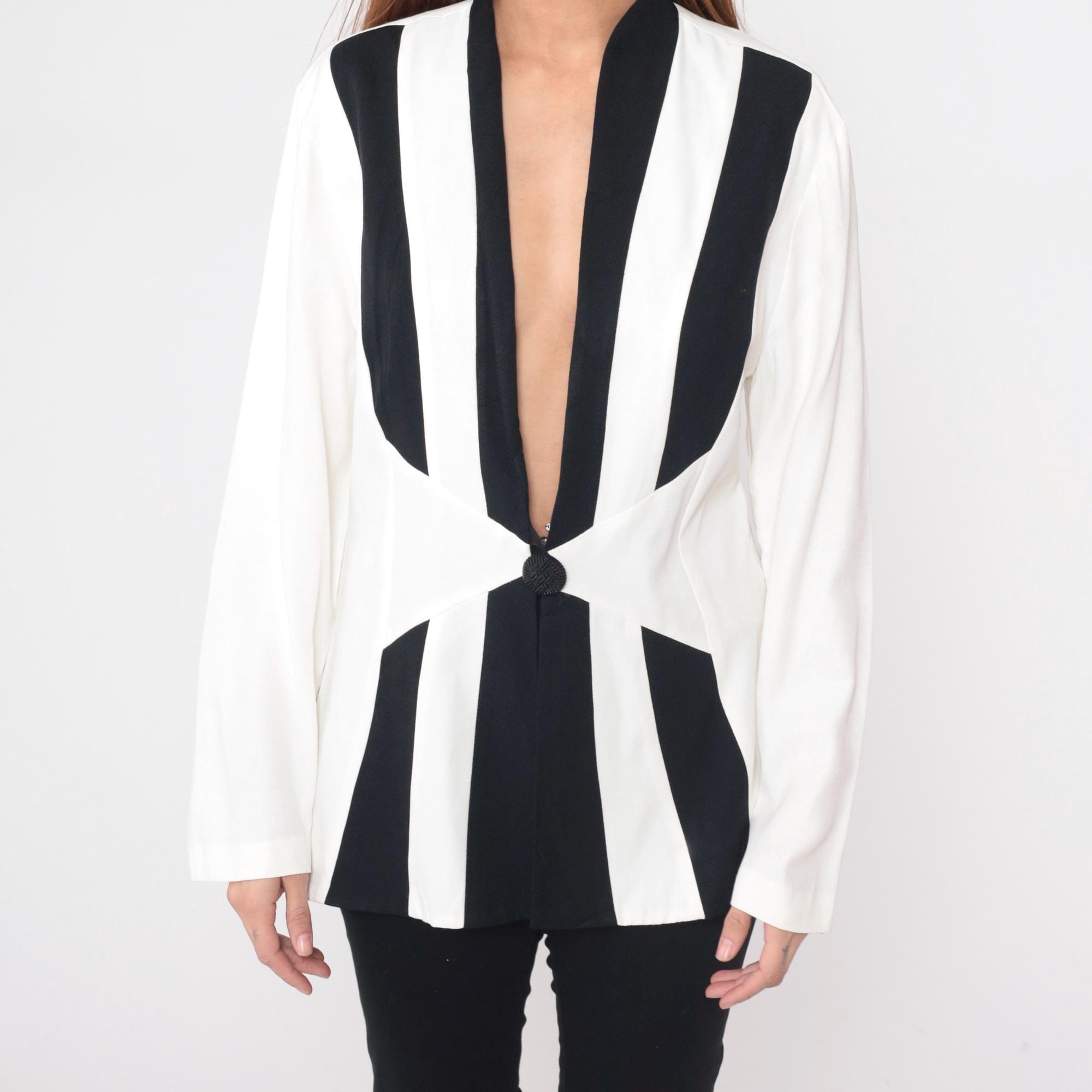 90s white blazer from dj summers with black contrast collar and lapels creating geometric color blocking throughout. Deep V-neckline with decorative black beaded knot closure at front, black contrast panels at sides. Long sleeves with black collar extending down the back.
