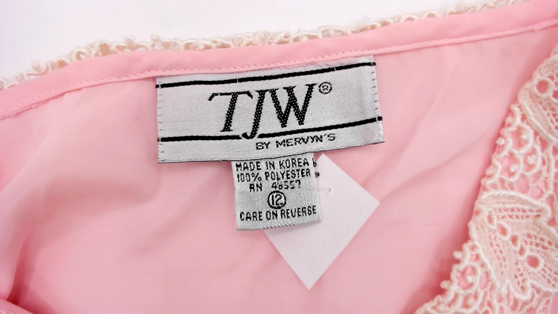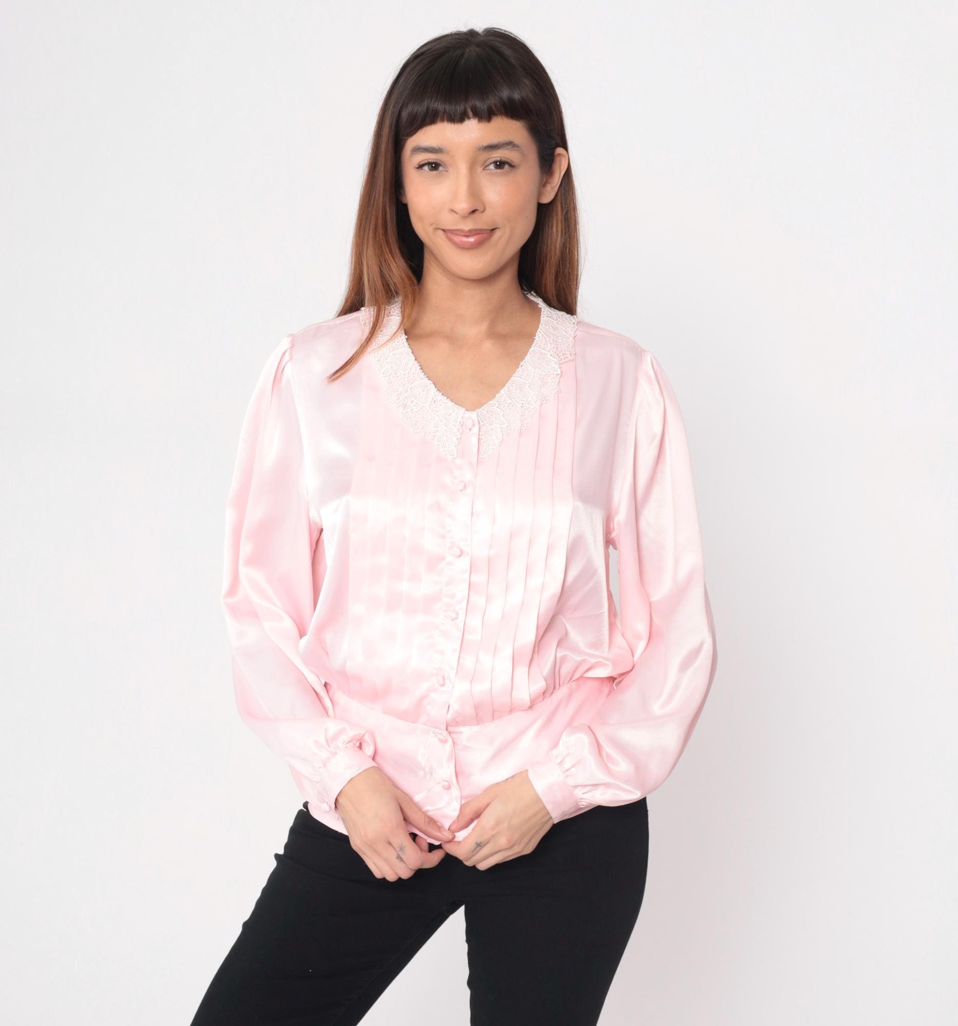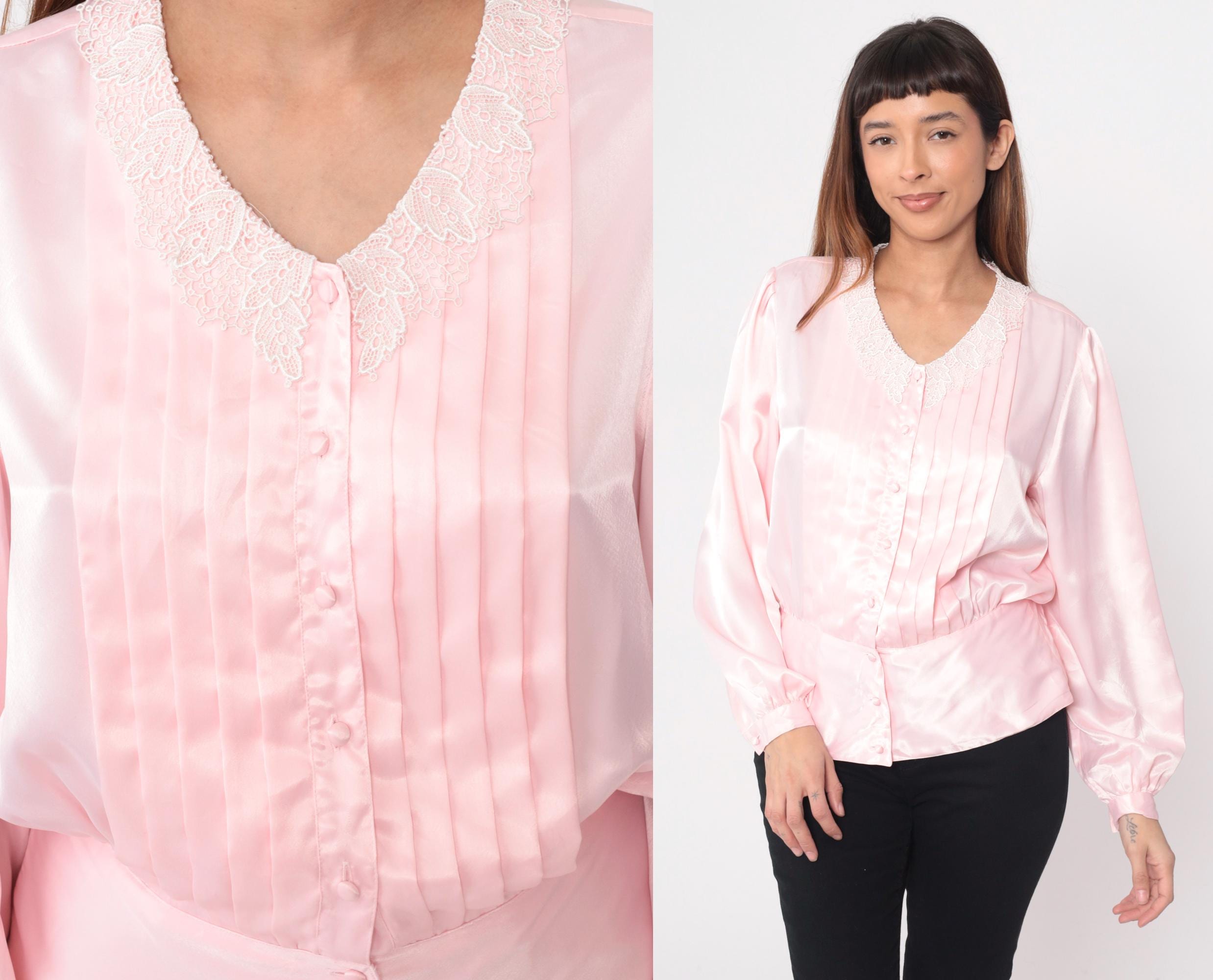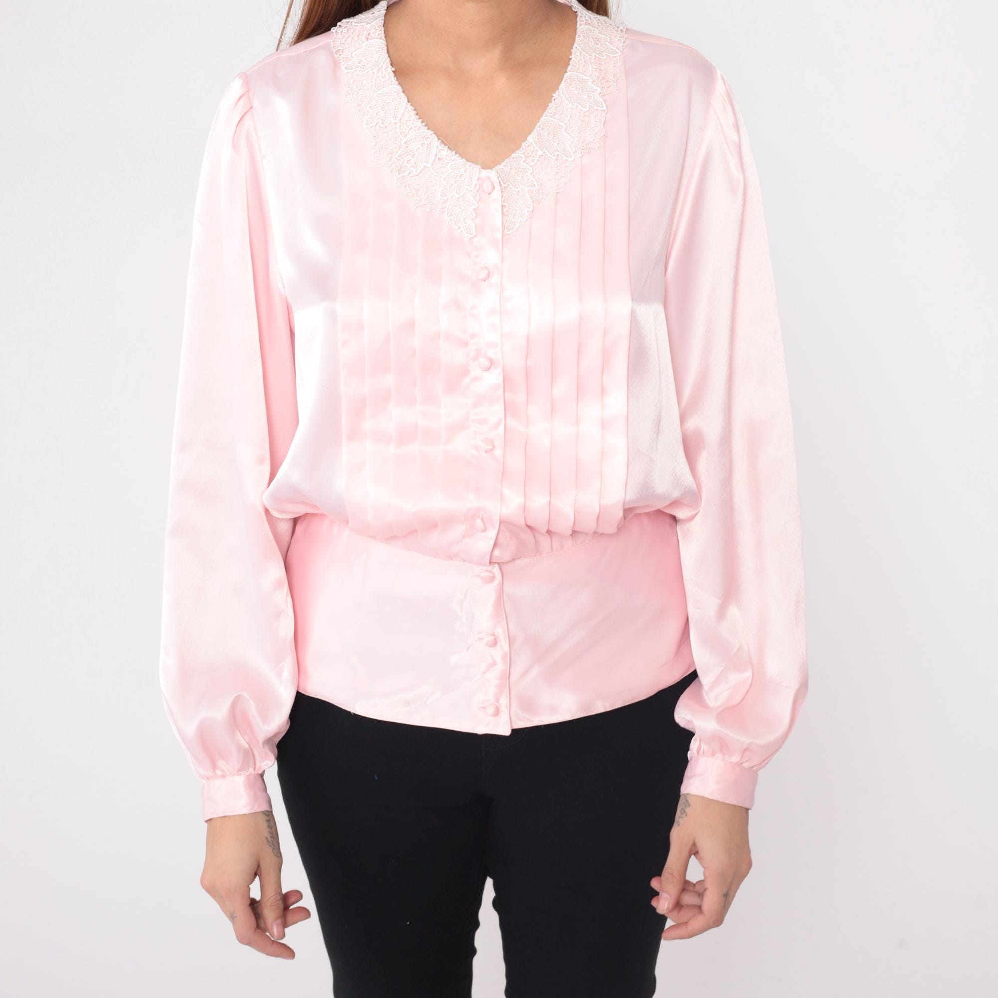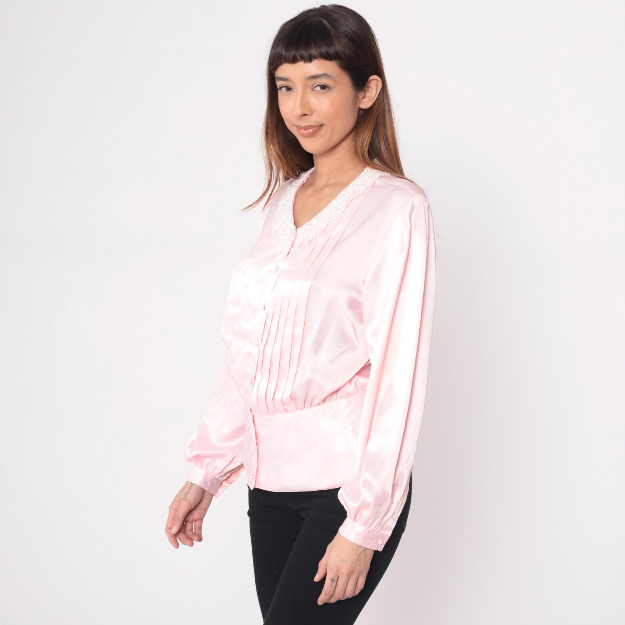 80s pale pink blouse from tjw with white lace collar and back yoke detail. Button front closure with pintuck pleating down center front, long sleeves with elastic gathered cuffs. V-neckline with scalloped lace trim.