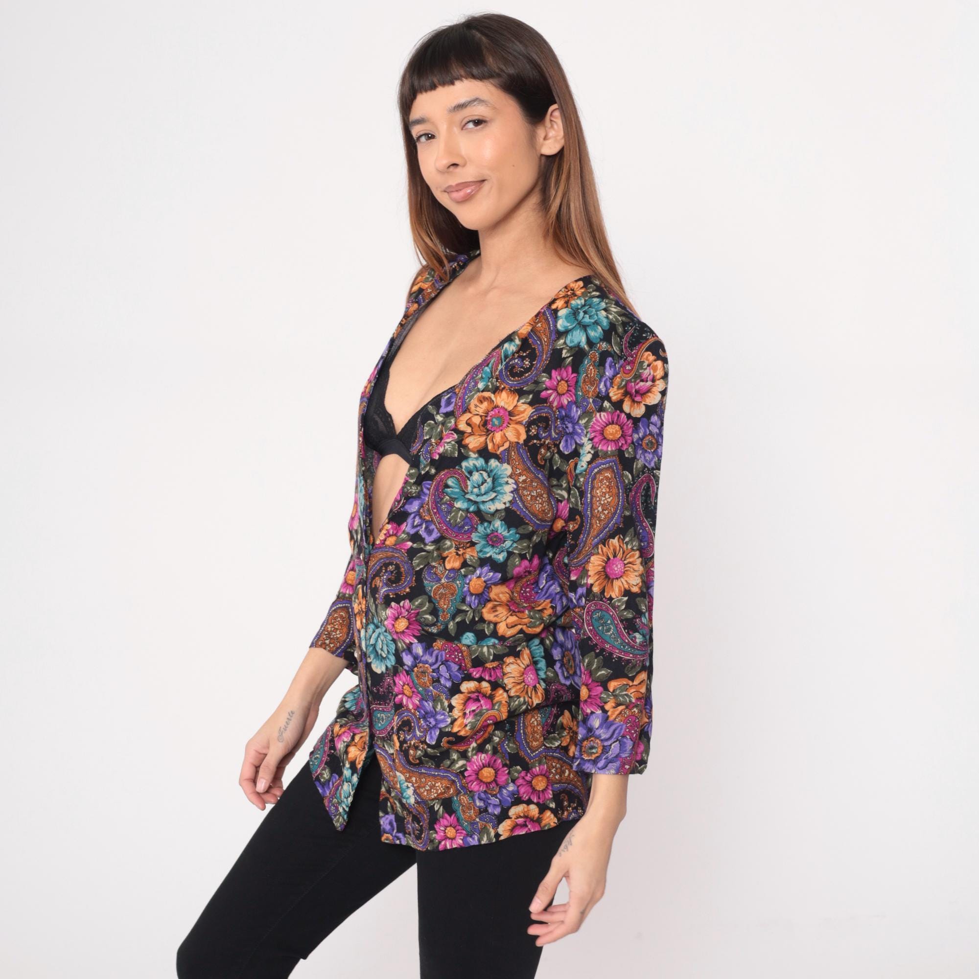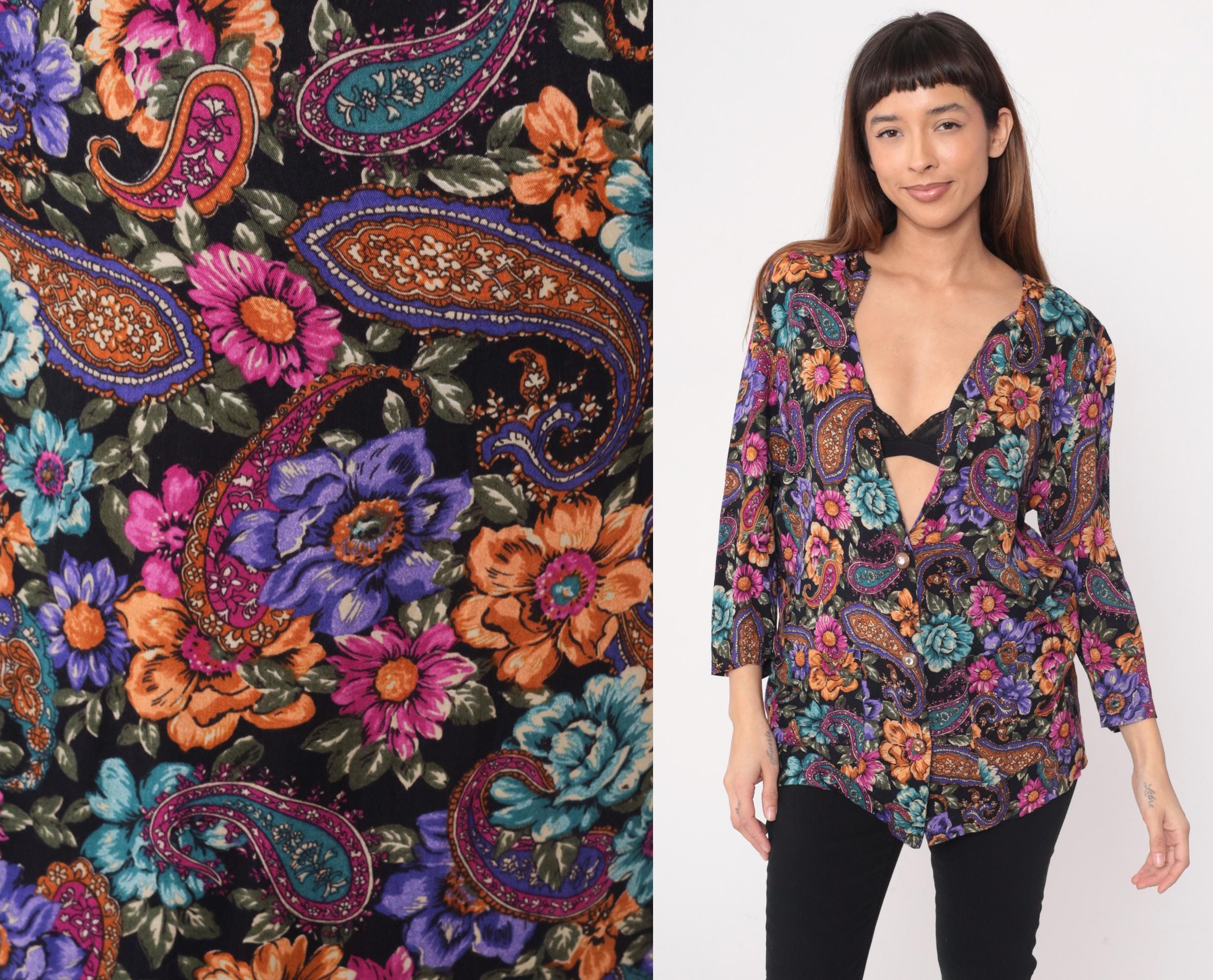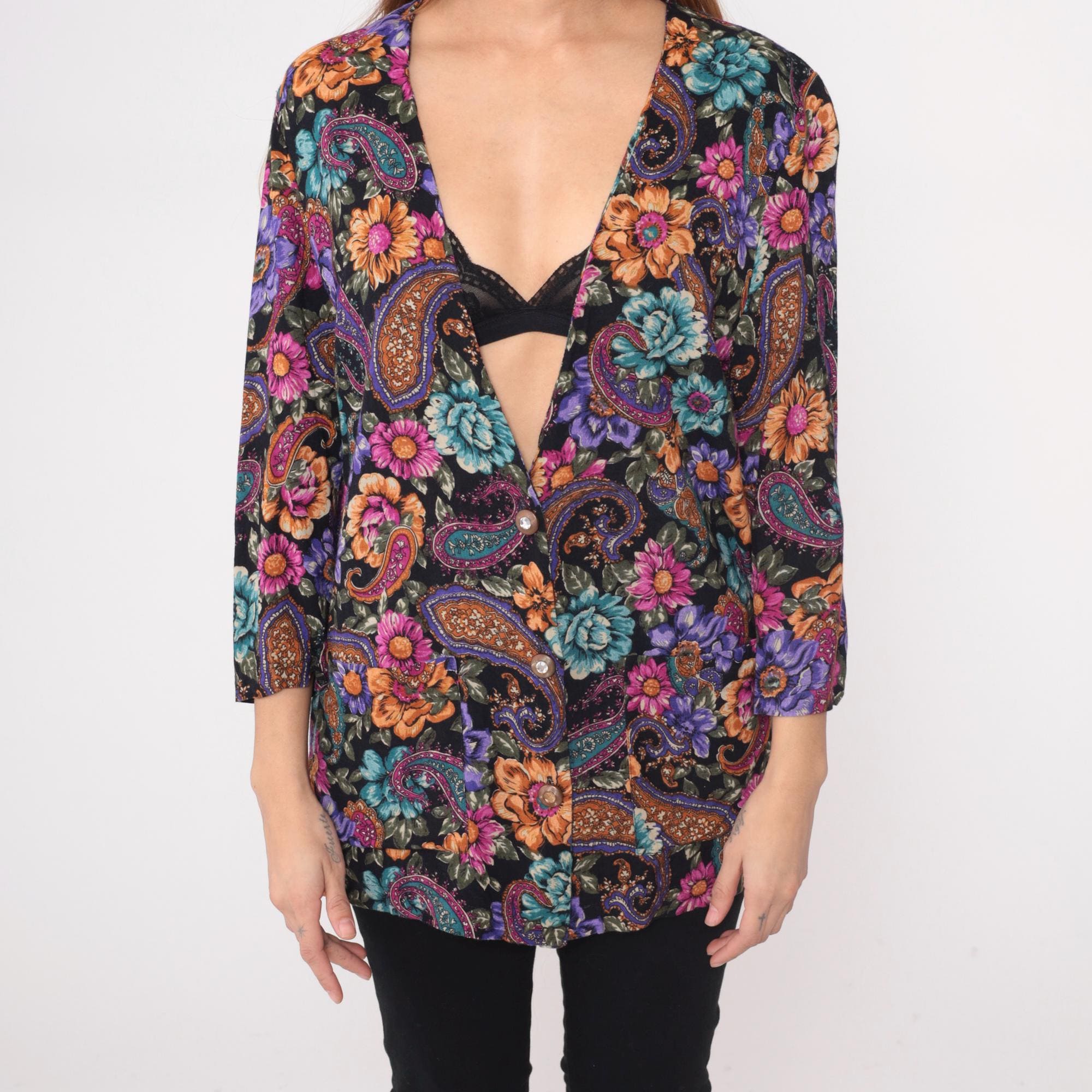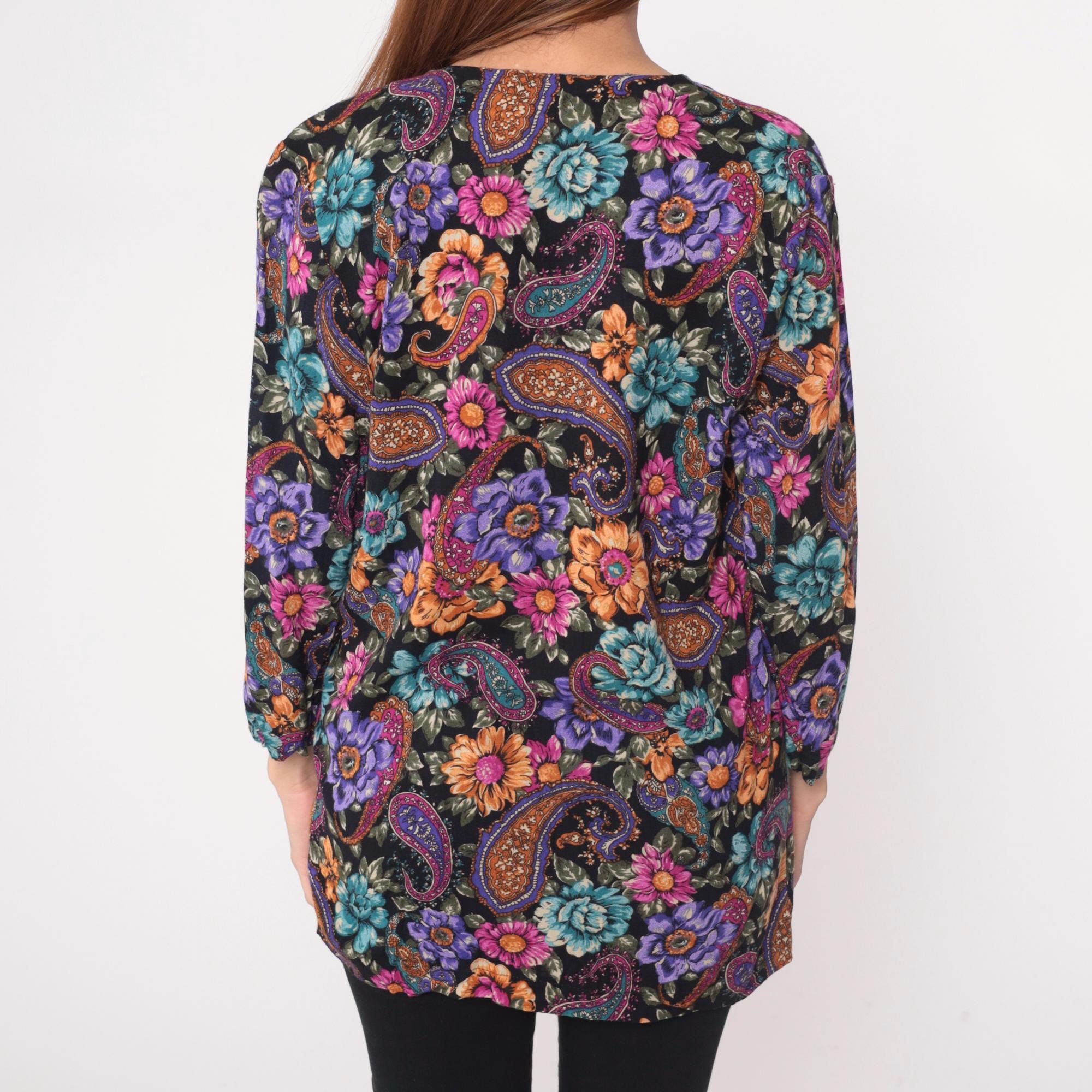 90s black floral and paisley tunic from rampage with oversized silhouette and deep V-neckline. Purple, pink, orange, and teal flowers mixed with paisley motifs across the fabric. Three-quarter length sleeves and hip-length cut.