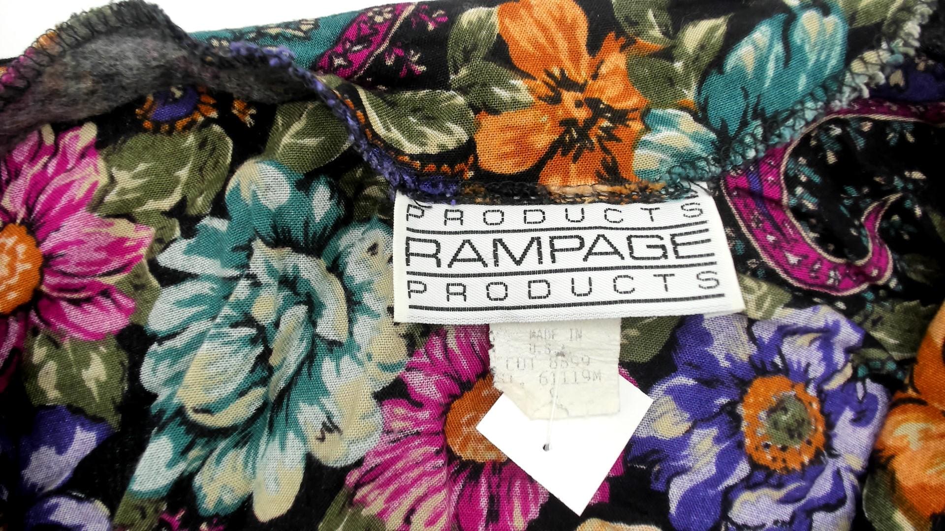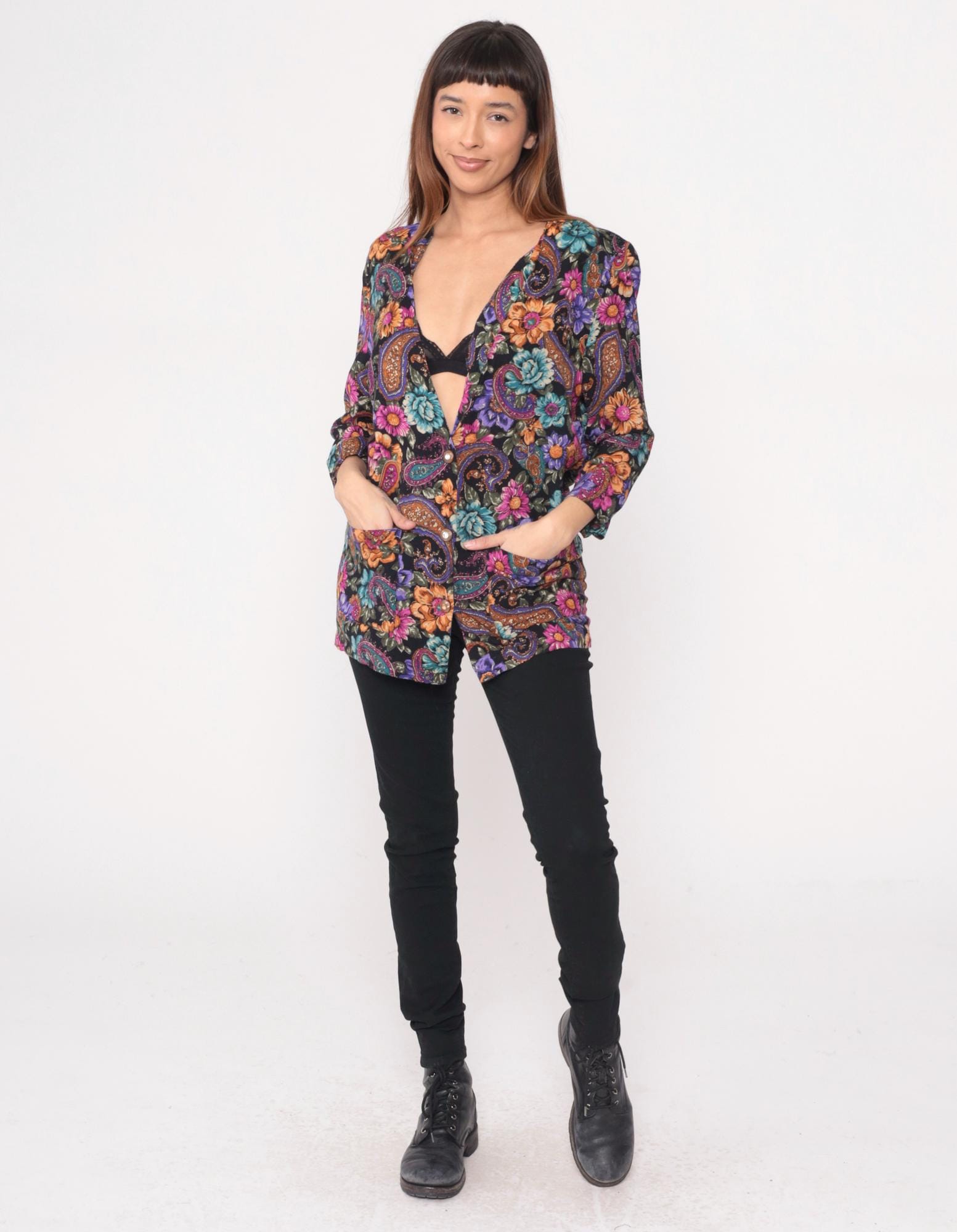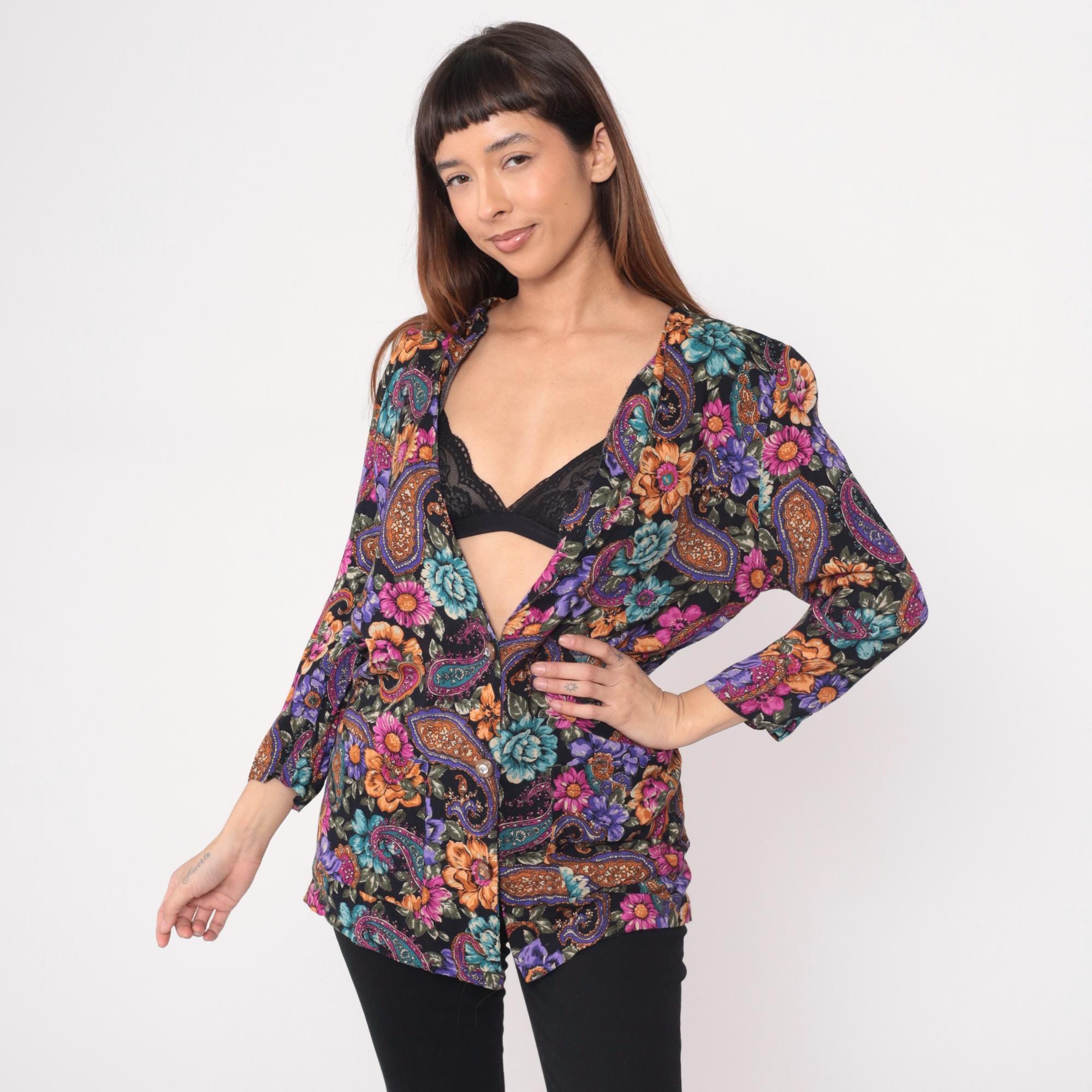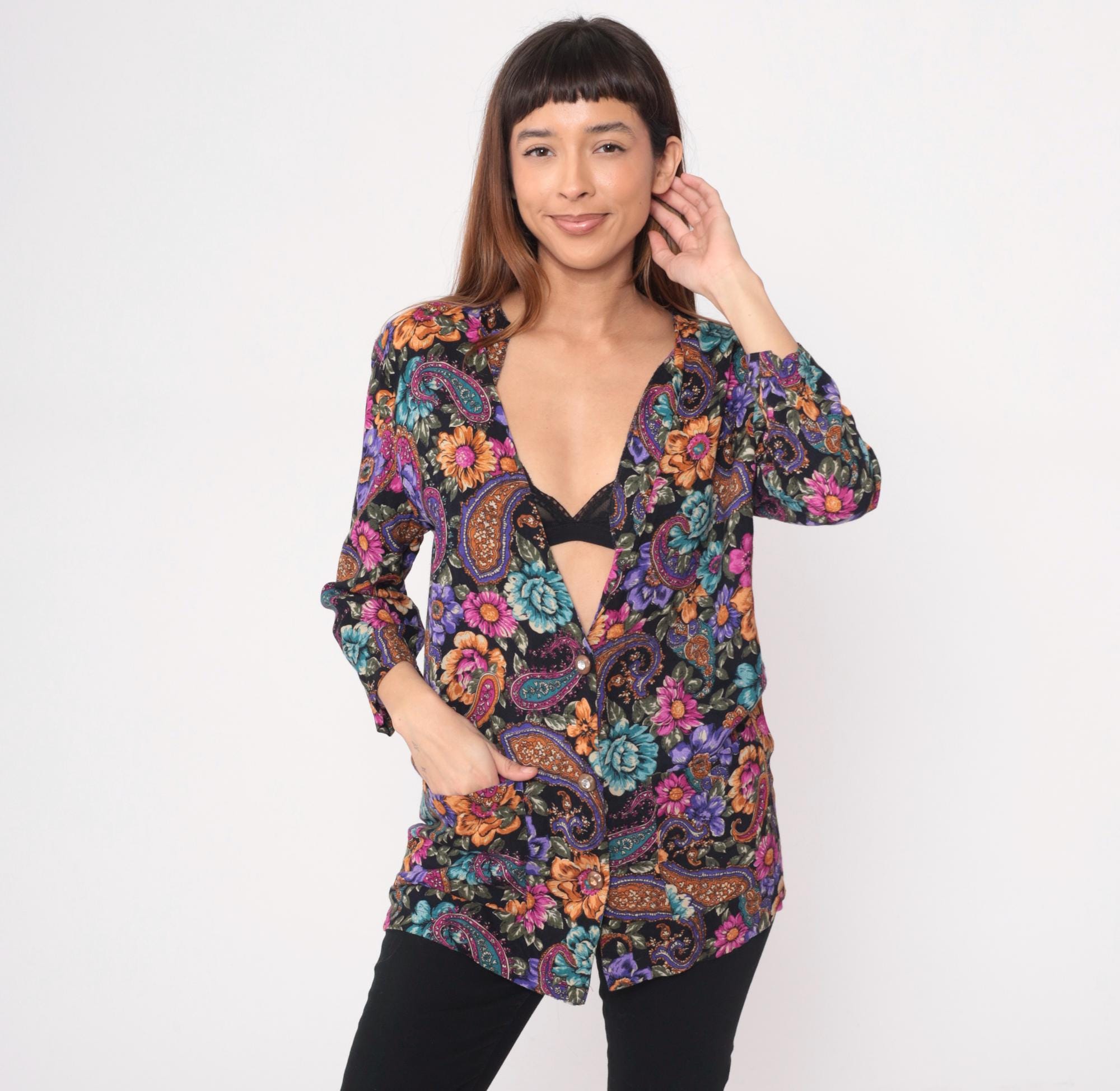 90s black floral and paisley tunic from rampage with oversized silhouette and deep V-neckline. Purple, pink, orange, and teal flowers mixed with paisley motifs across the fabric. Three-quarter length sleeves and hip-length cut.