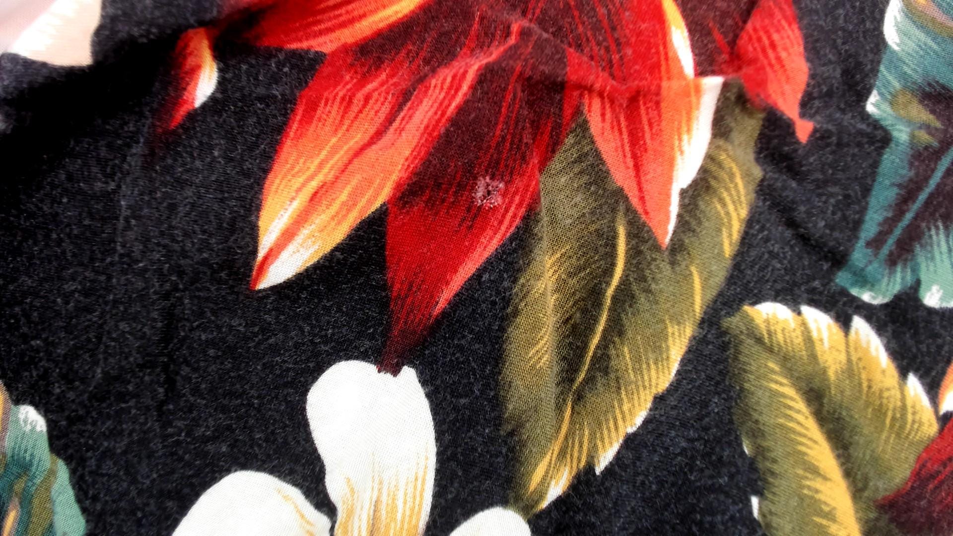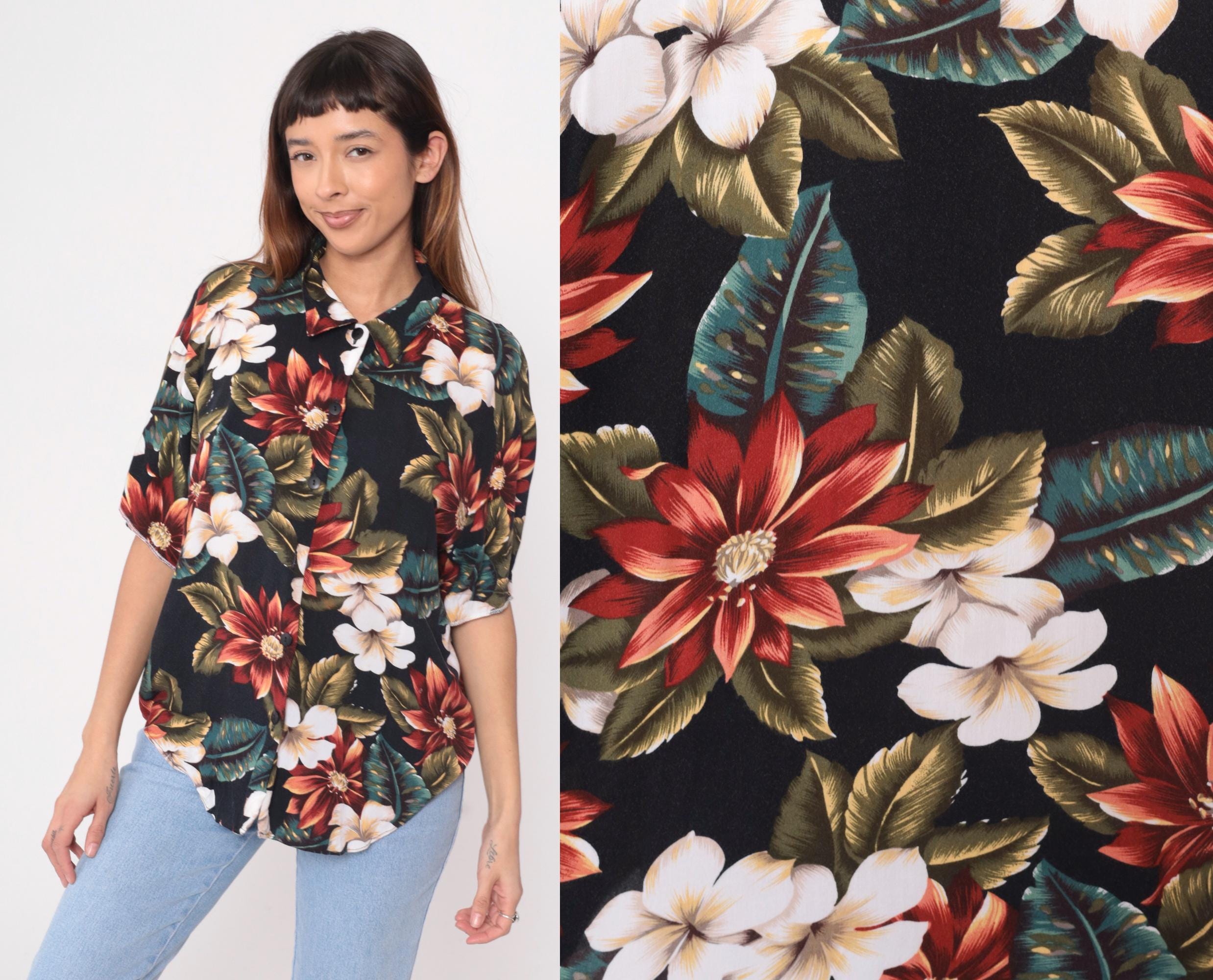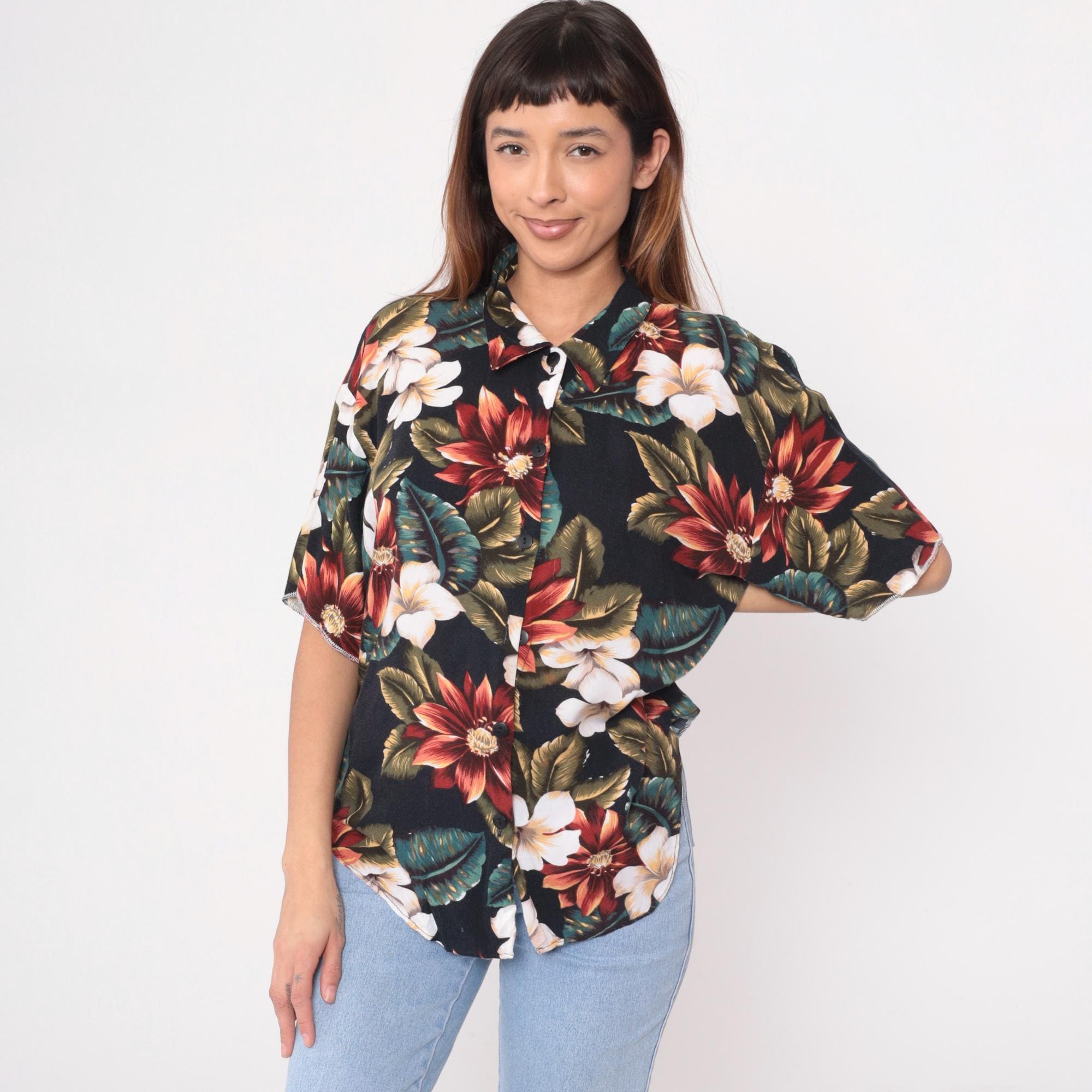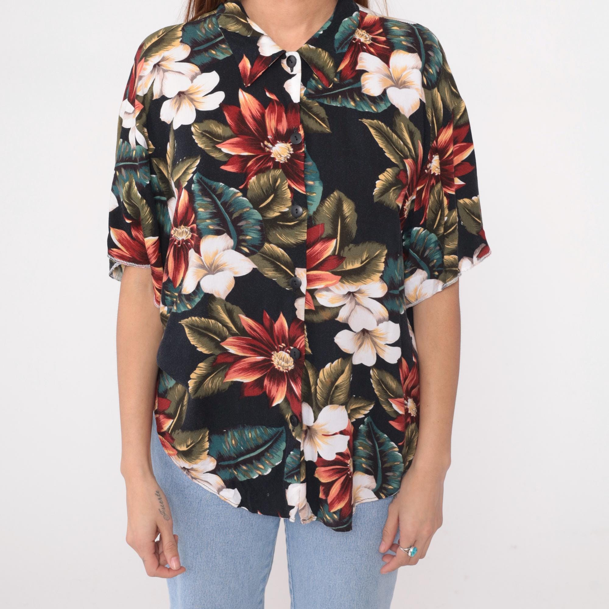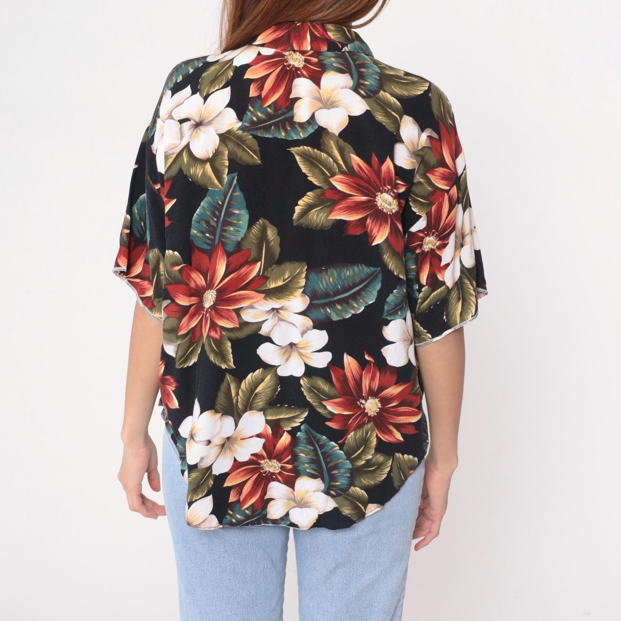 90s black shirt with tropical floral print featuring white plumeria flowers, red poinsettia-style blooms, and green and teal palm leaves across the fabric. Pointed collar, button front closure with black buttons, short sleeves with unfinished hems.