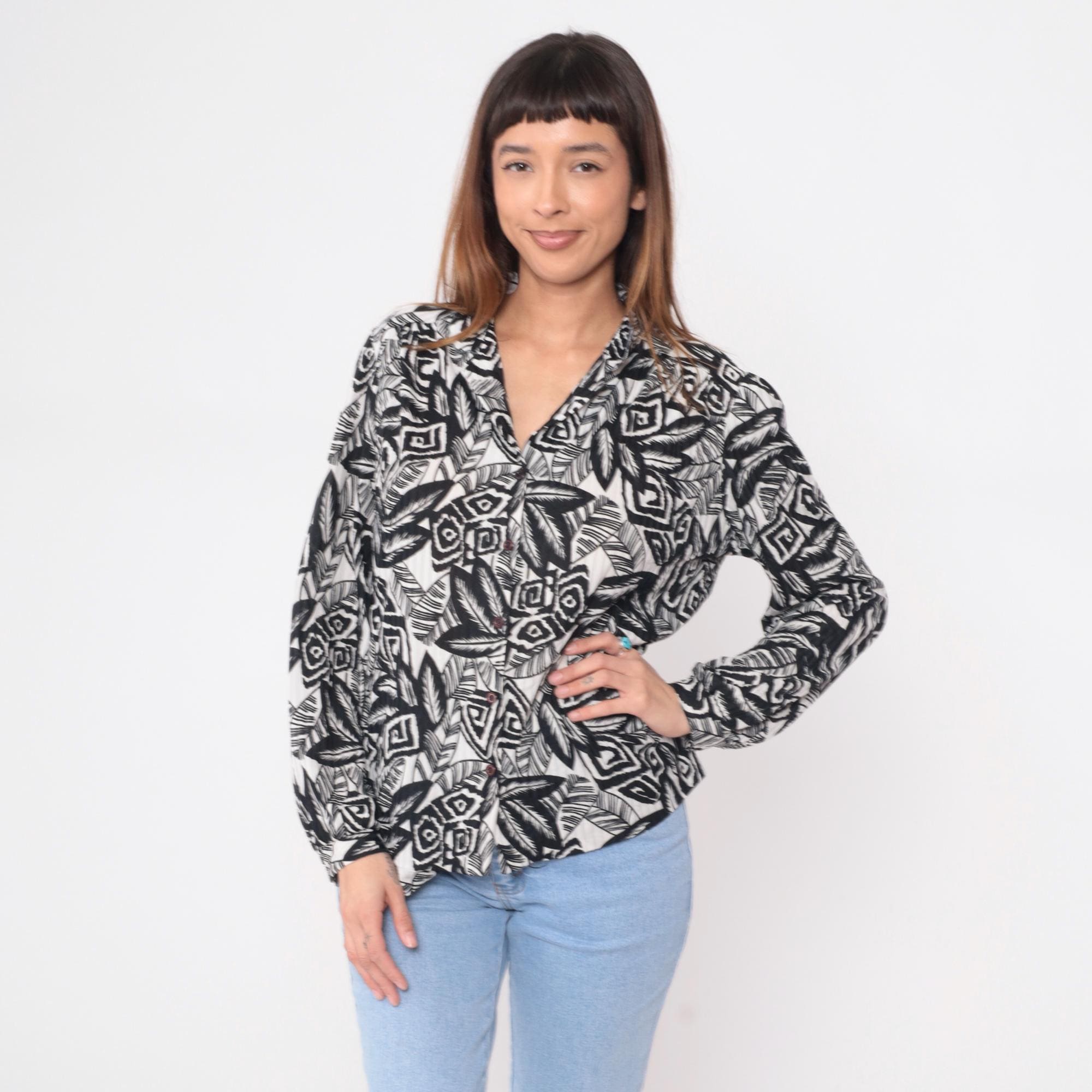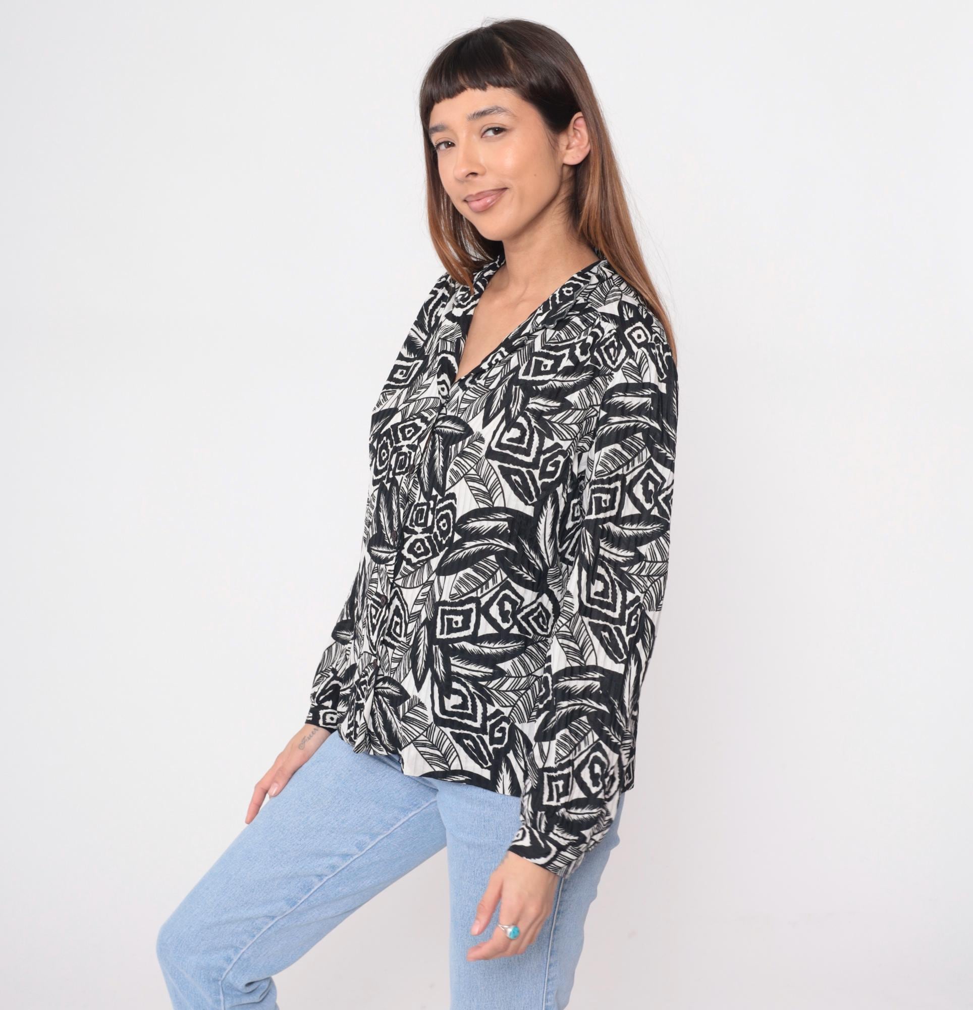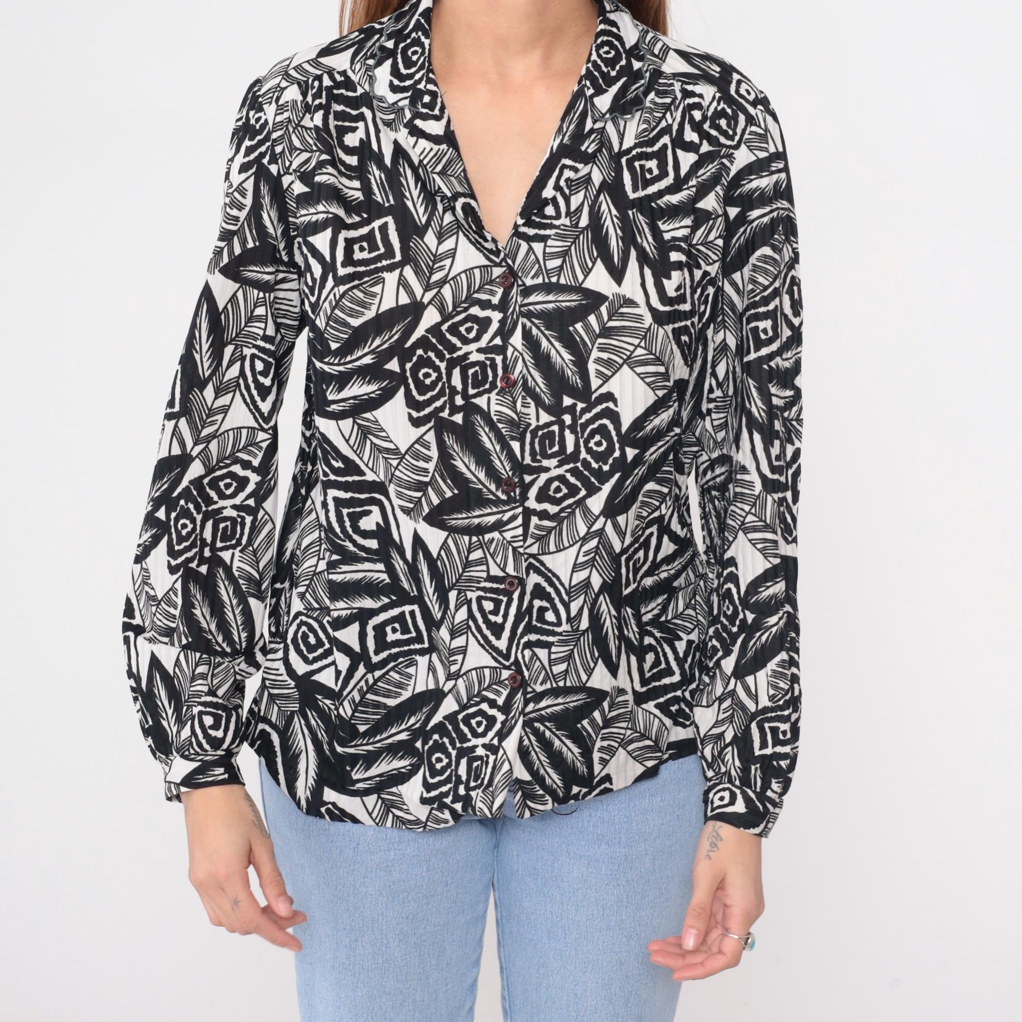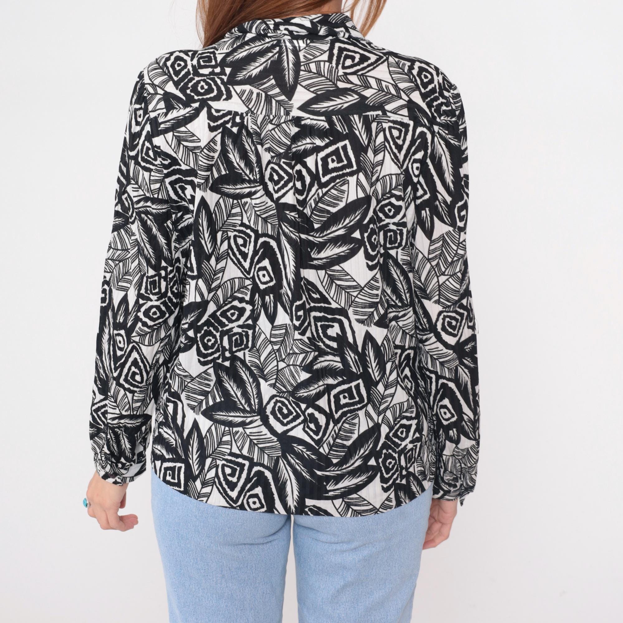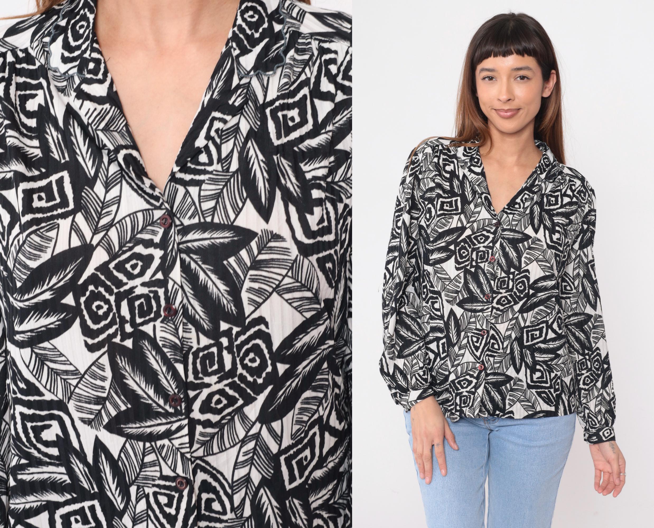 90s black and white abstract print blouse with notched collar and long sleeves. Wrap-style bodice with gathered detail at the front, elastic cuffs, and all-over pattern of leaves, geometric shapes, and tribal-inspired motifs.