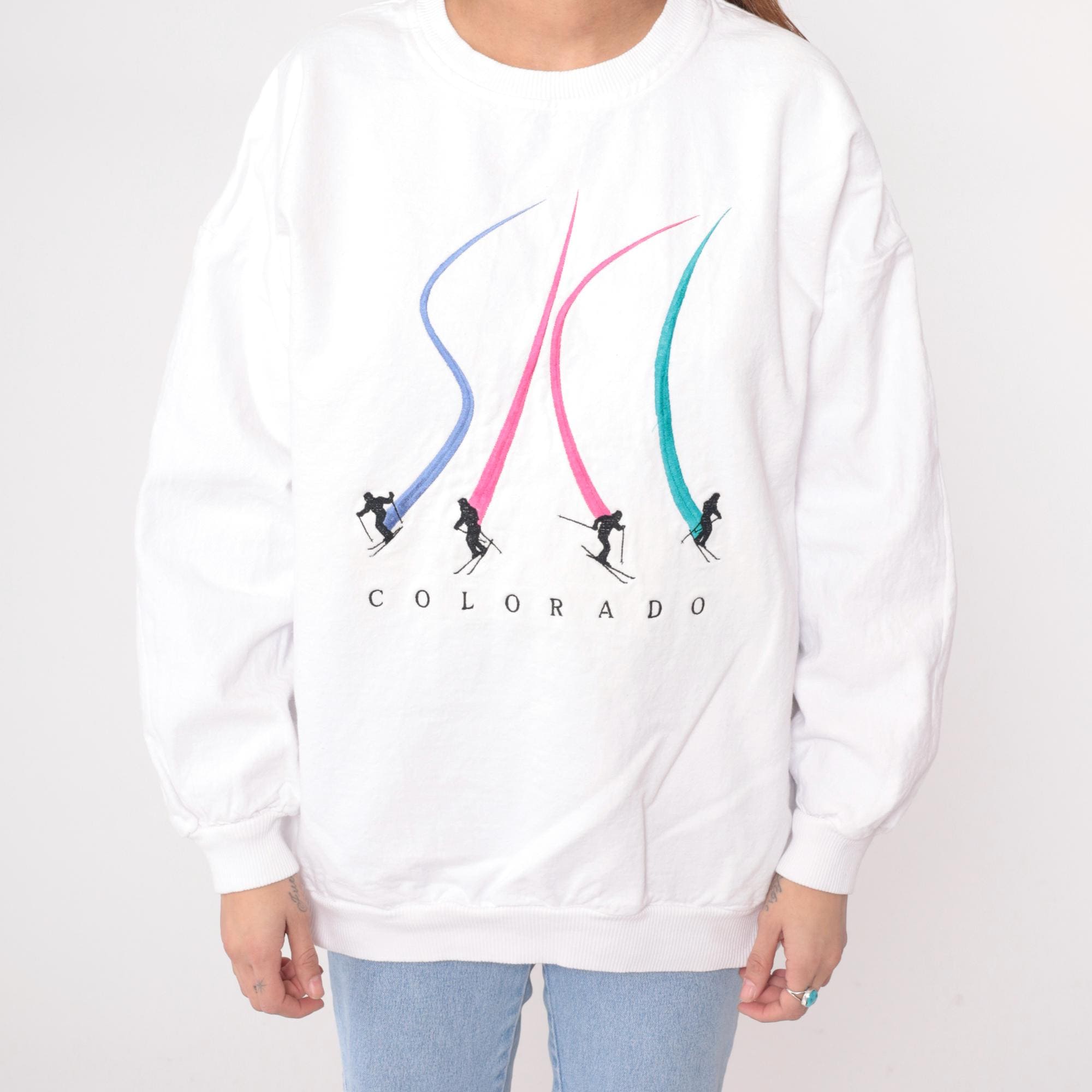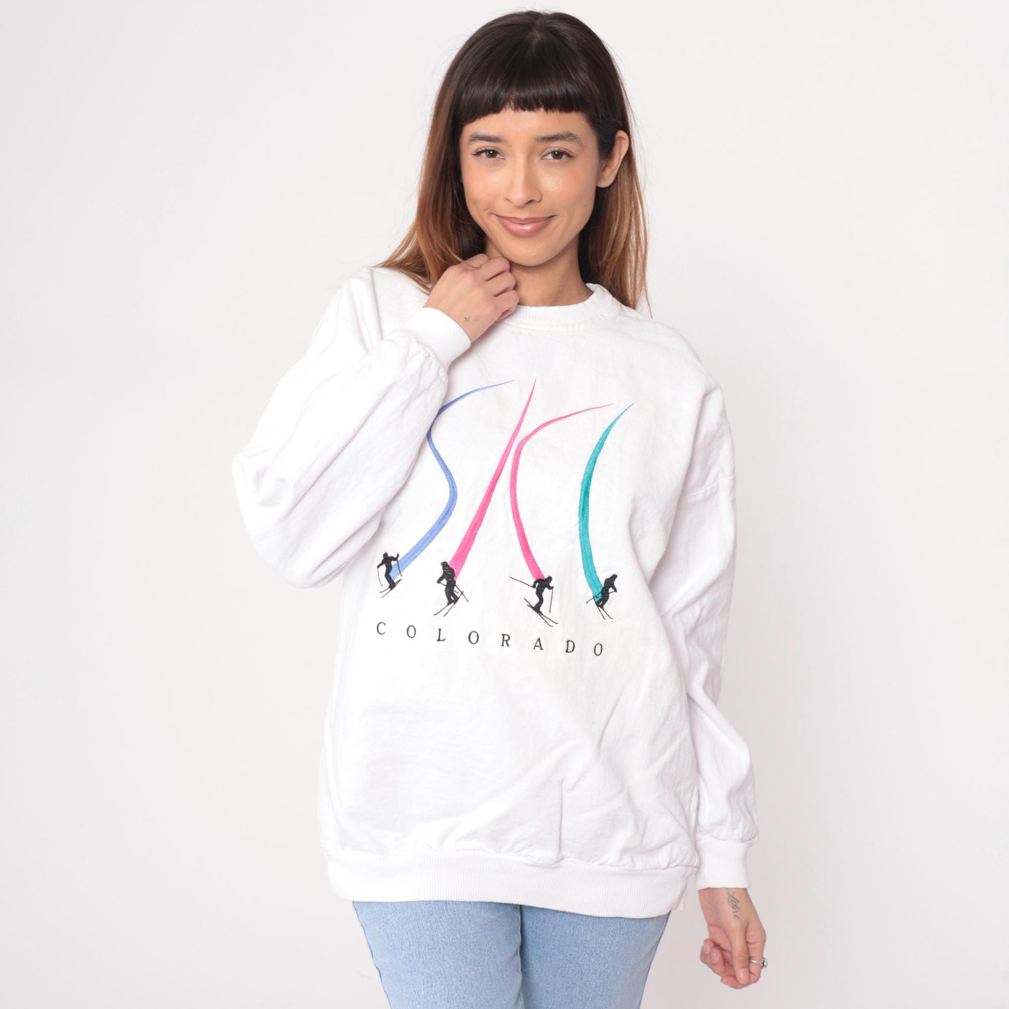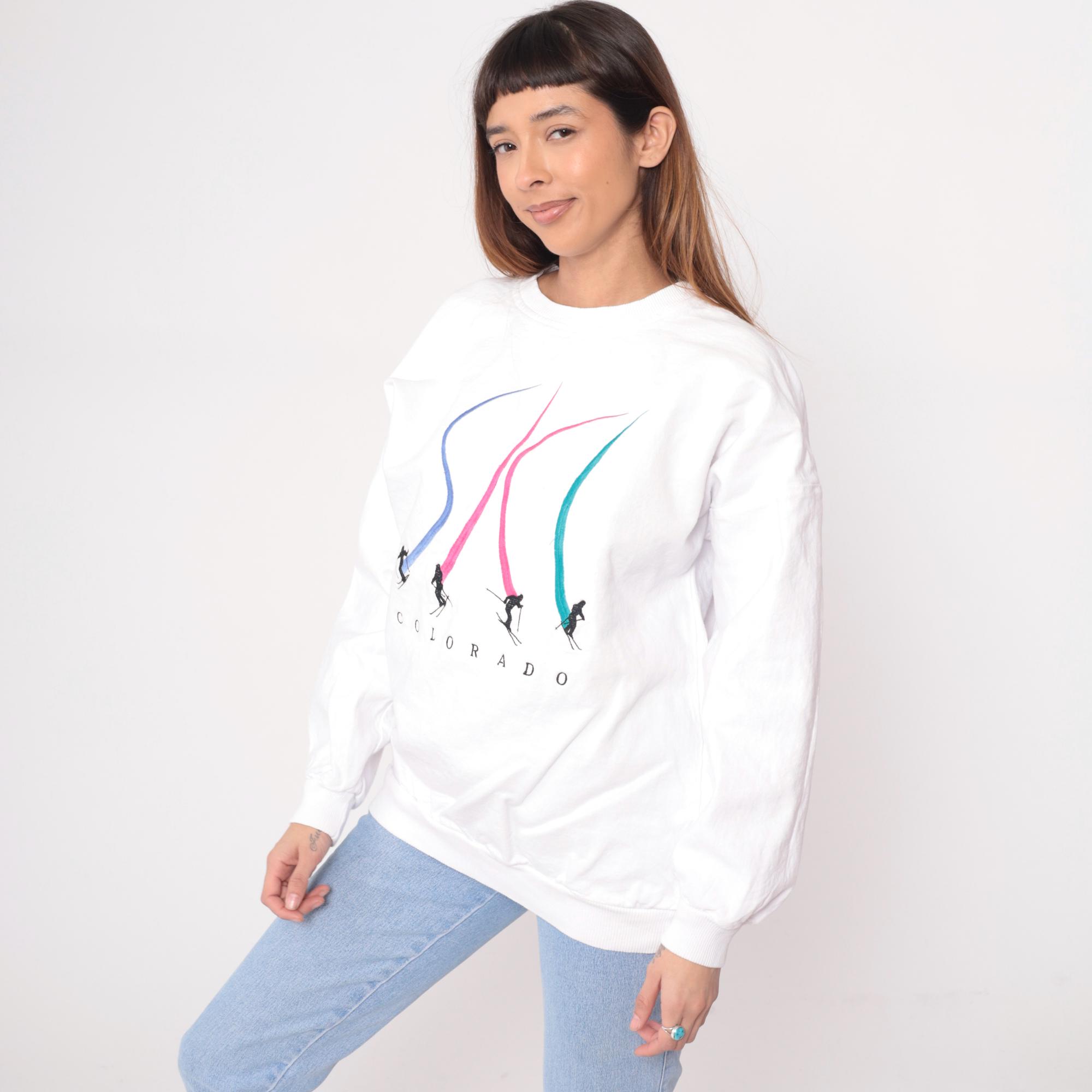 90s white crew neck sweatshirt from Crazy Shirts with Colorado ski graphic across the front. Four black silhouette skiers with colored trails in blue, bright pink, dark pink, and teal above spaced "COLORADO" text.