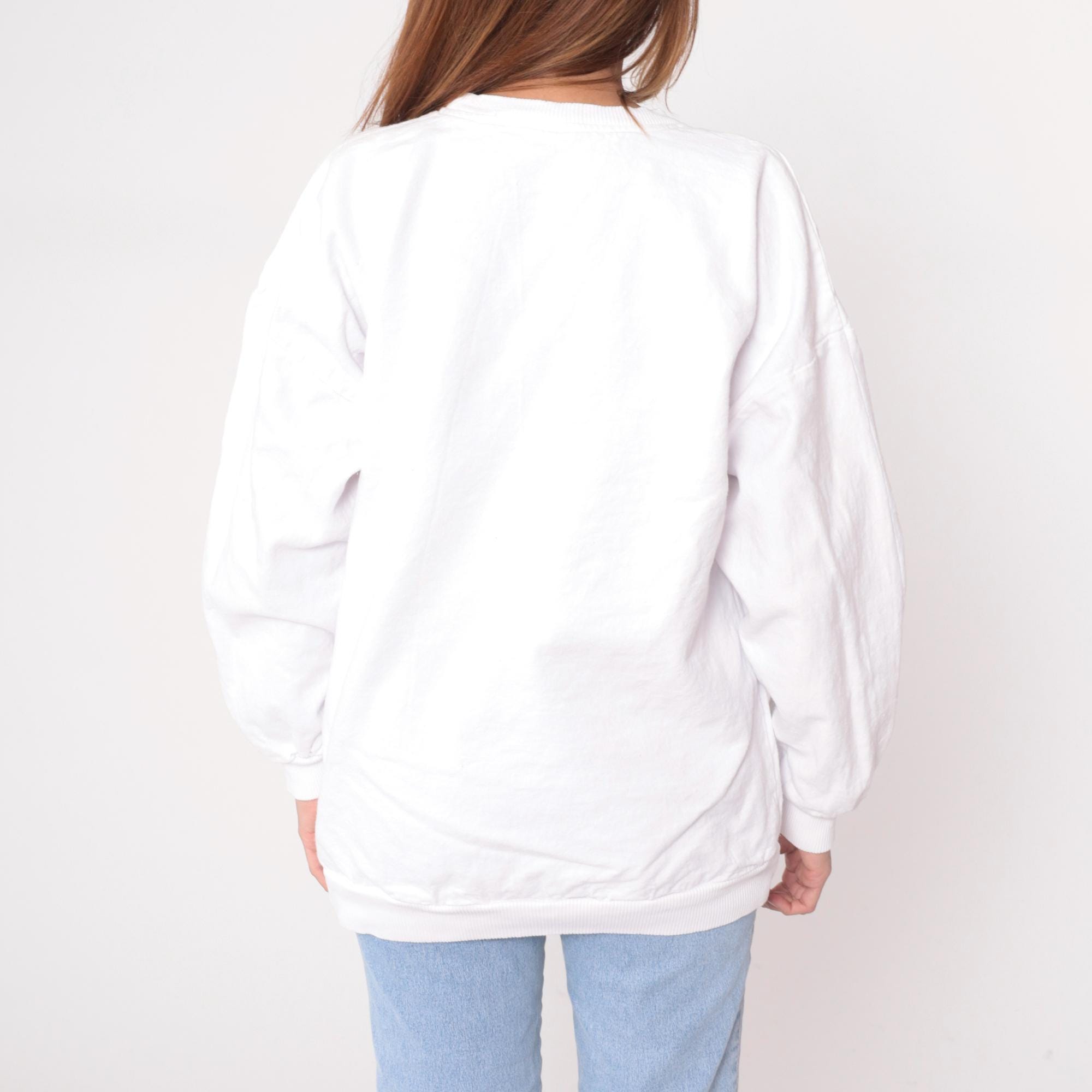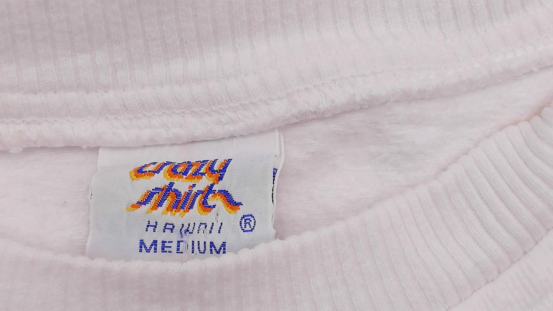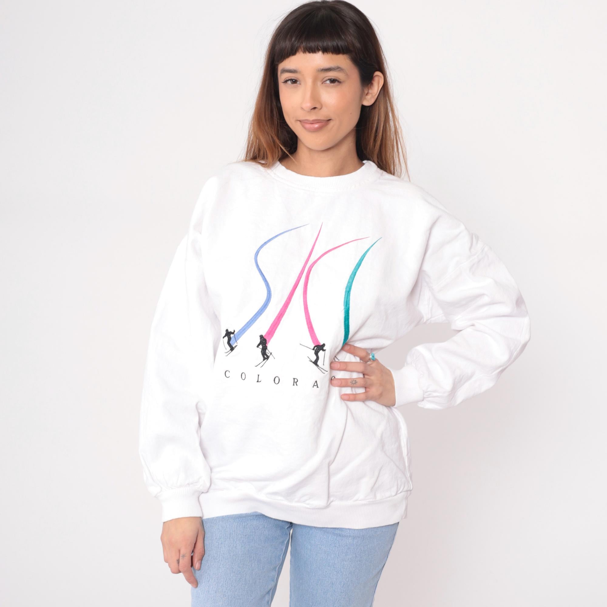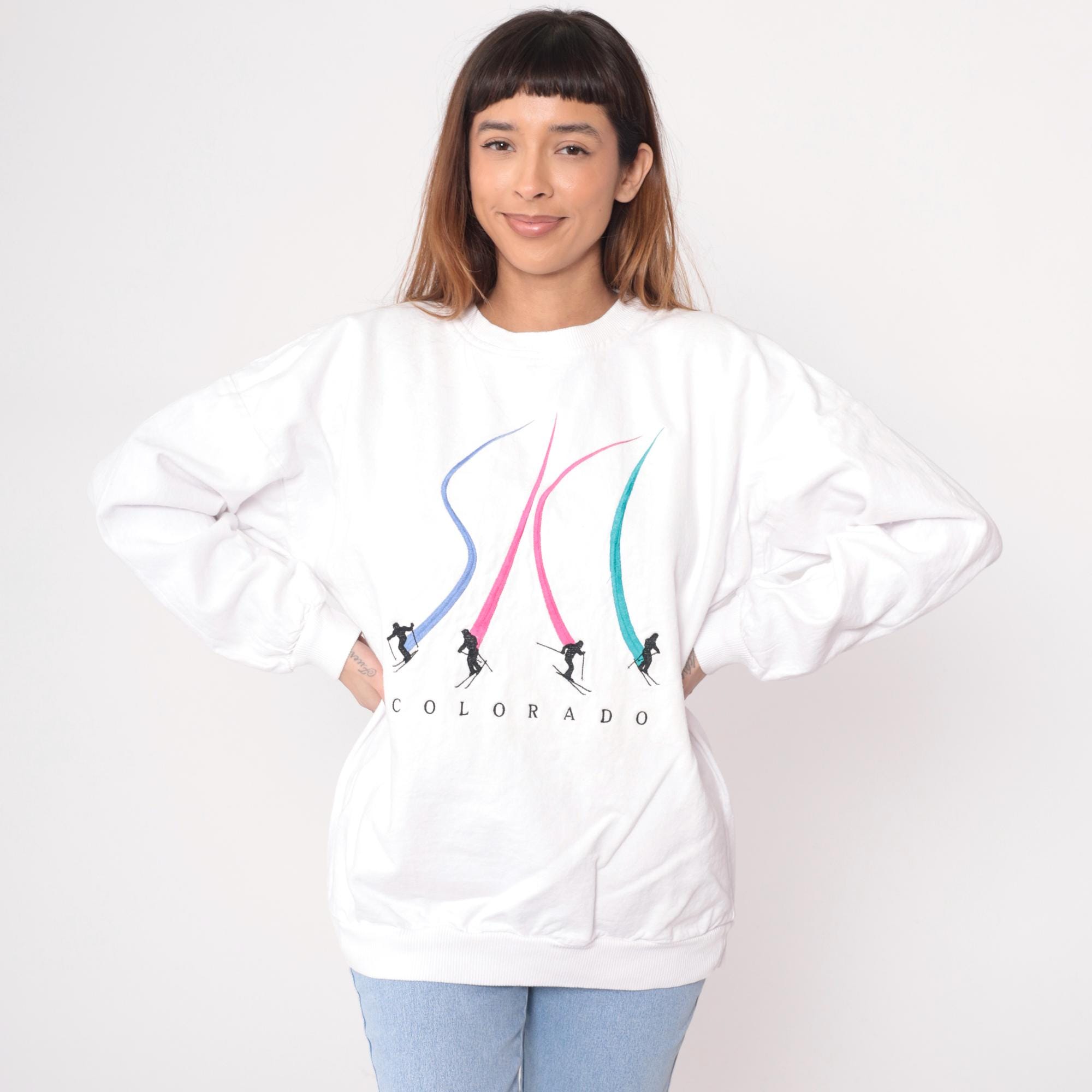 90s white crew neck sweatshirt from Crazy Shirts with Colorado ski graphic across the front. Four black silhouette skiers with colored trails in blue, bright pink, dark pink, and teal above spaced "COLORADO" text.
