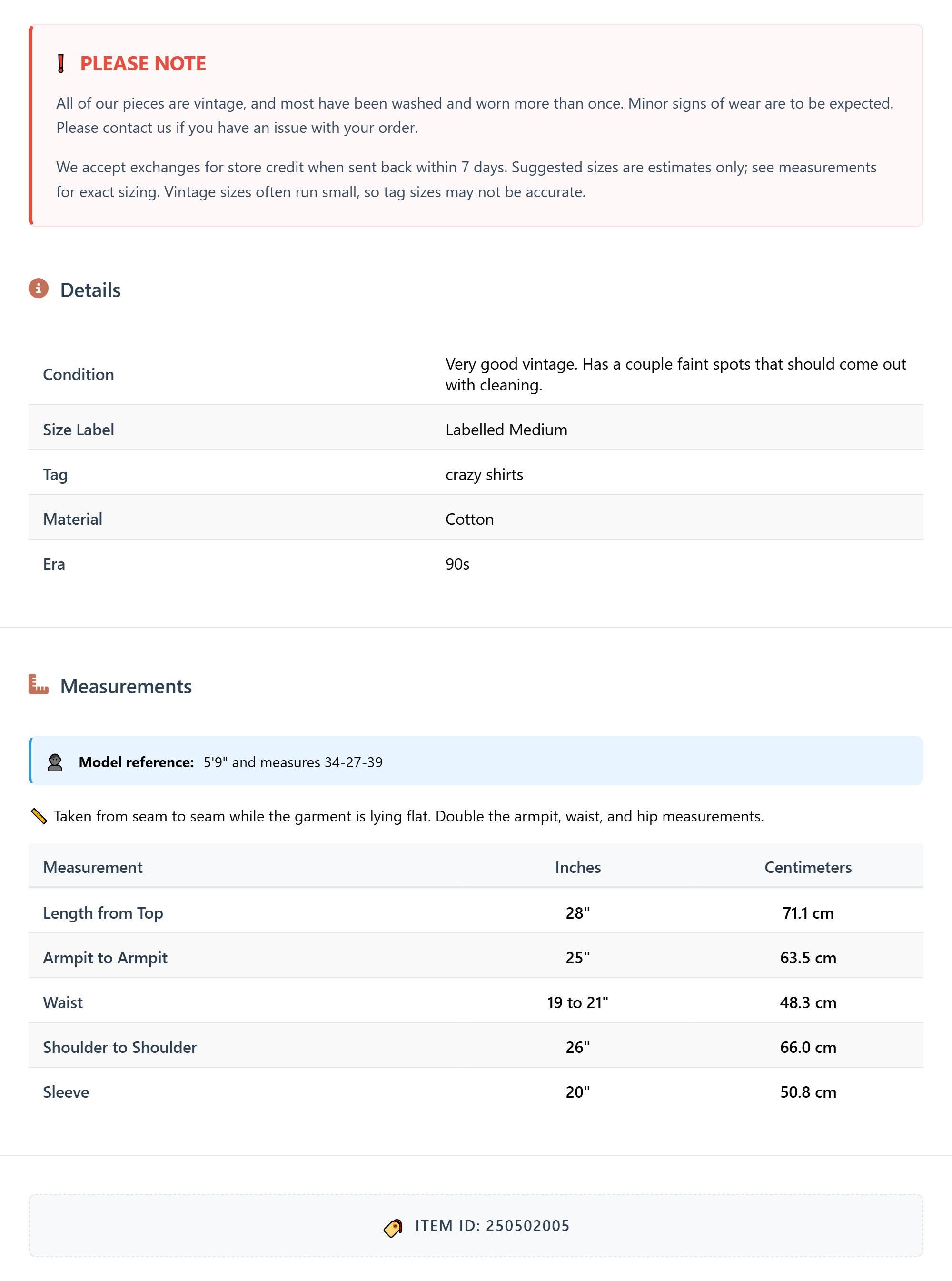 All of our pieces are vintage, and most have been washed and worn more than once. Minor signs of wear are to be expected. Please contact us if you have an issue with your order. We accept exchanges for store credit when sent back within 7 days.