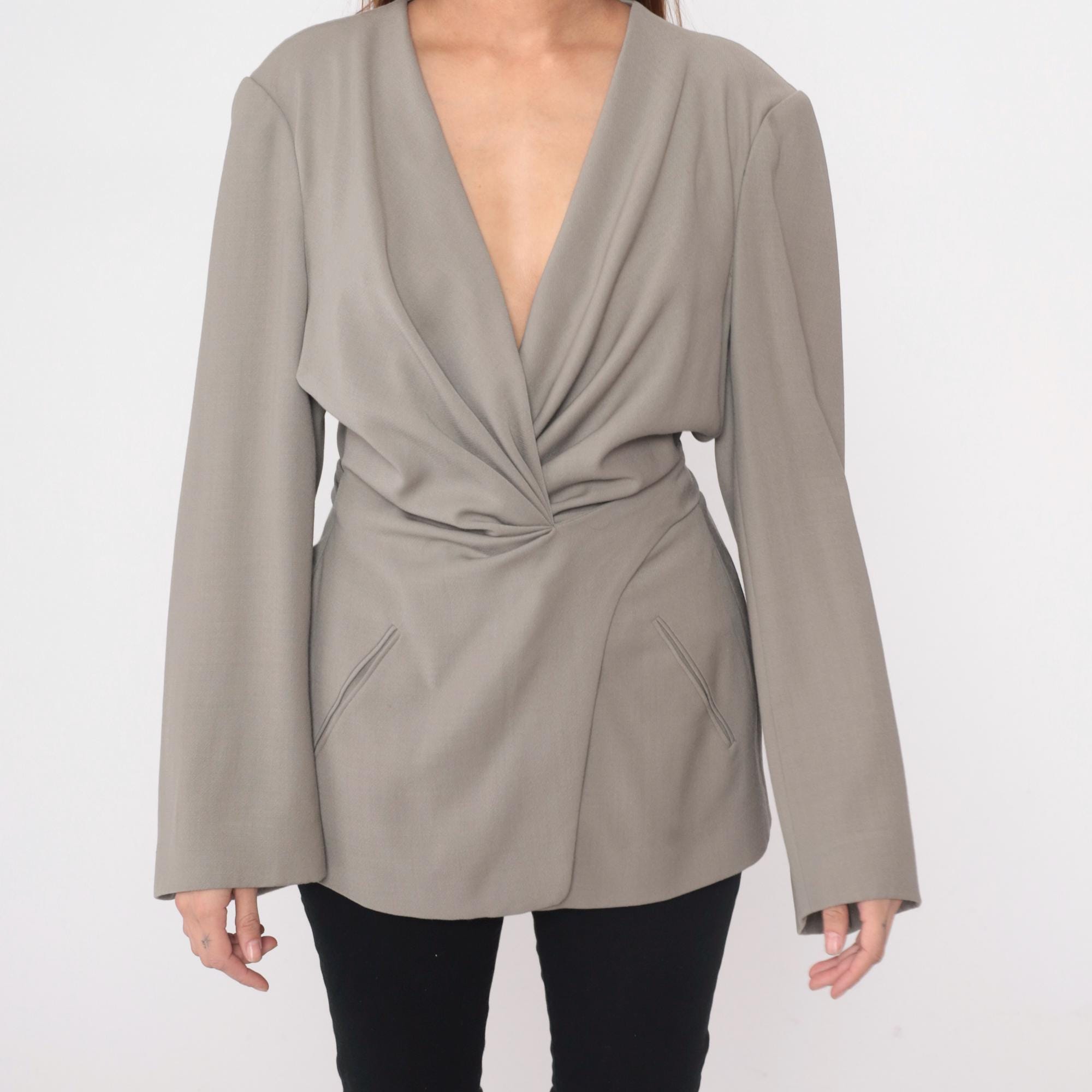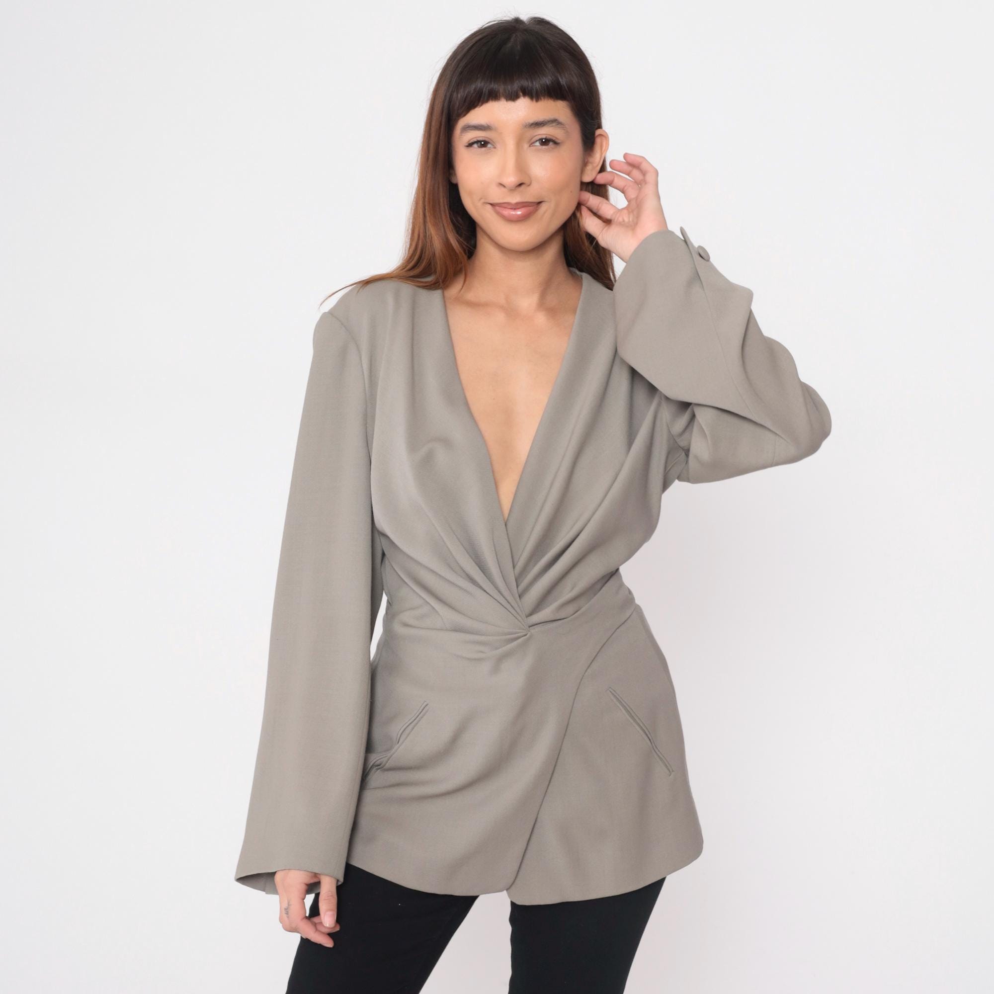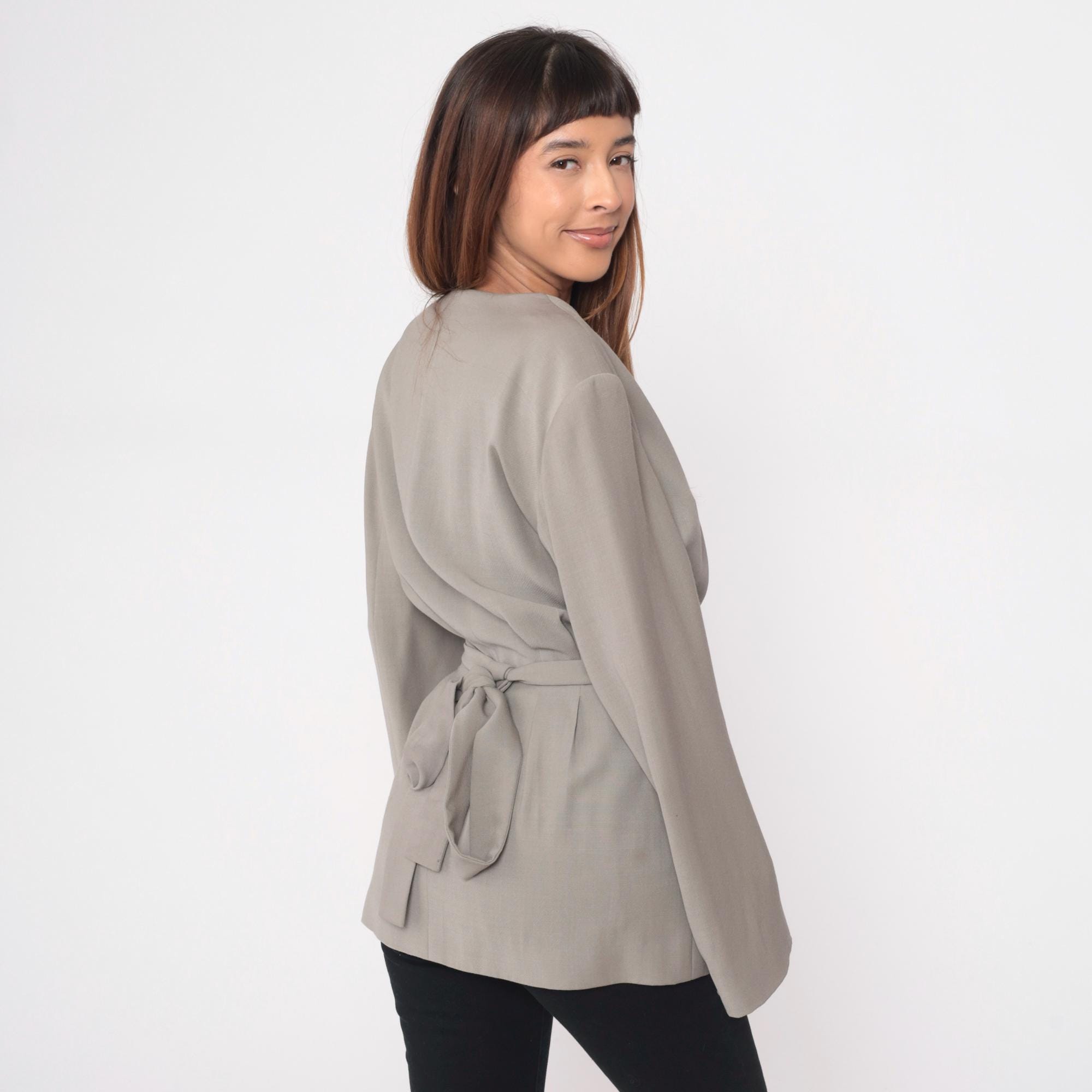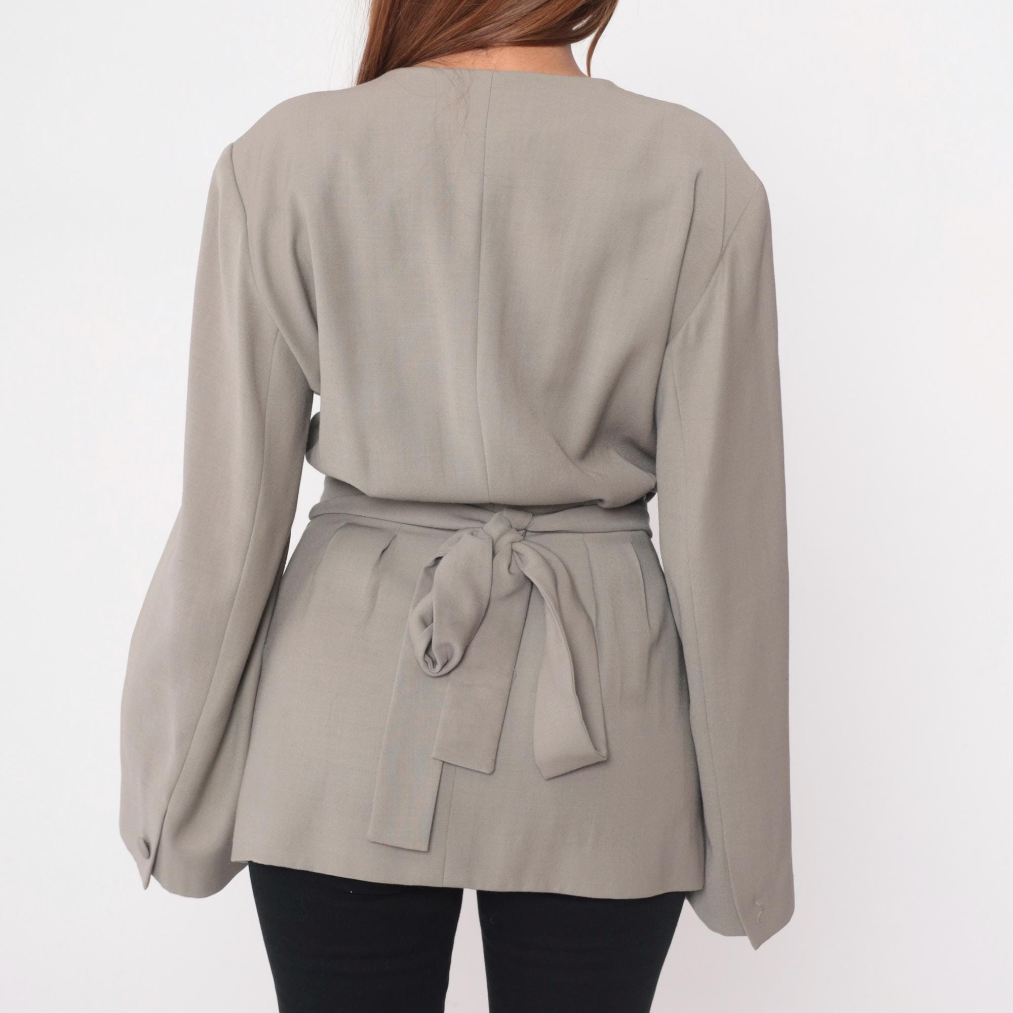 80s taupe wrap blazer from donna karan with deep V-neck front and matching tie belt. Long sleeves, angled welt pockets at hips, structured shoulders.