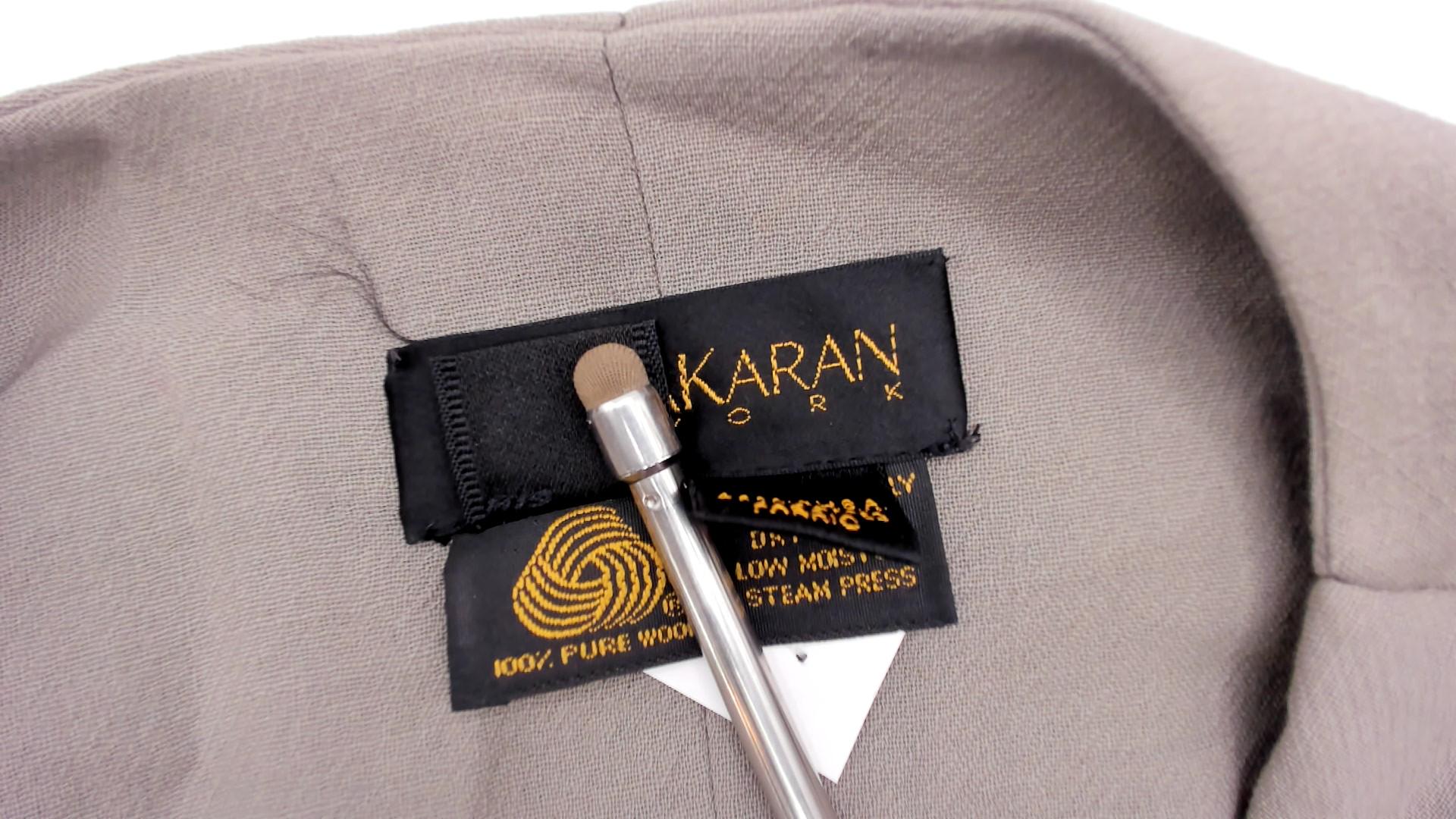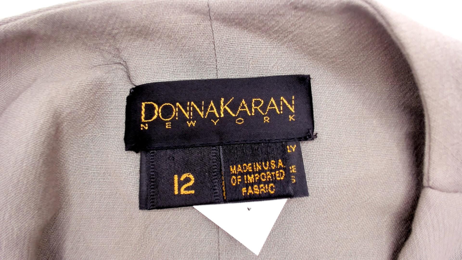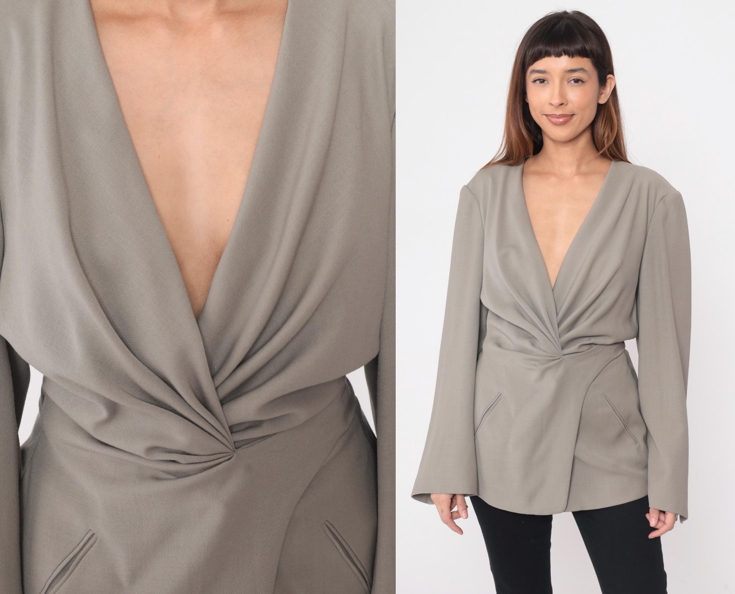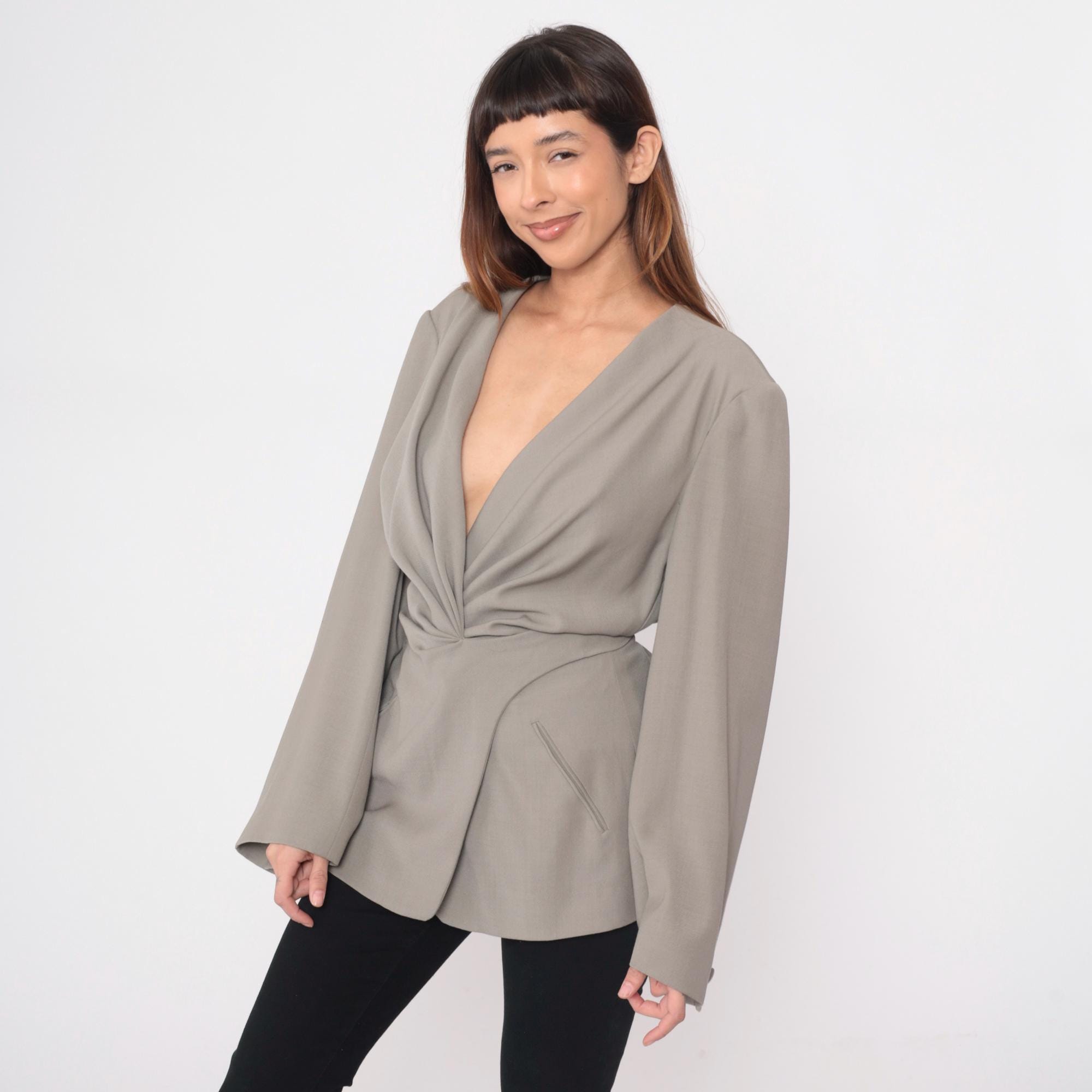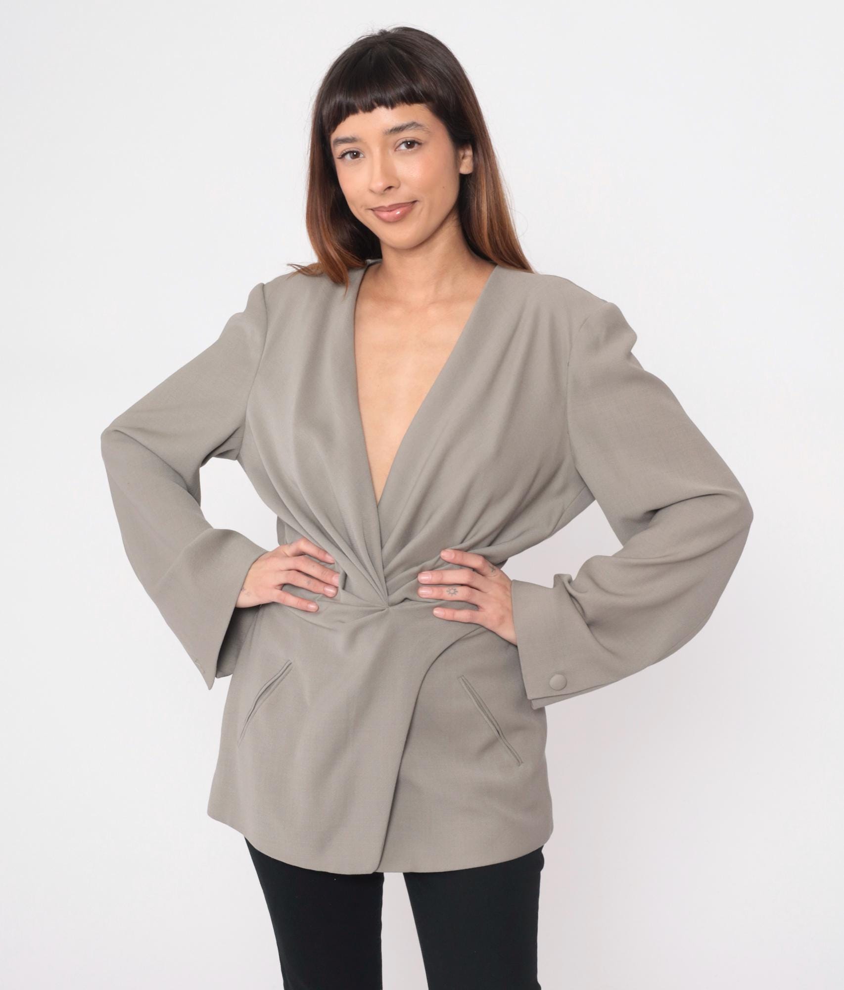 80s taupe wrap blazer from donna karan with deep V-neck front and matching tie belt. Long sleeves, angled welt pockets at hips, structured shoulders.