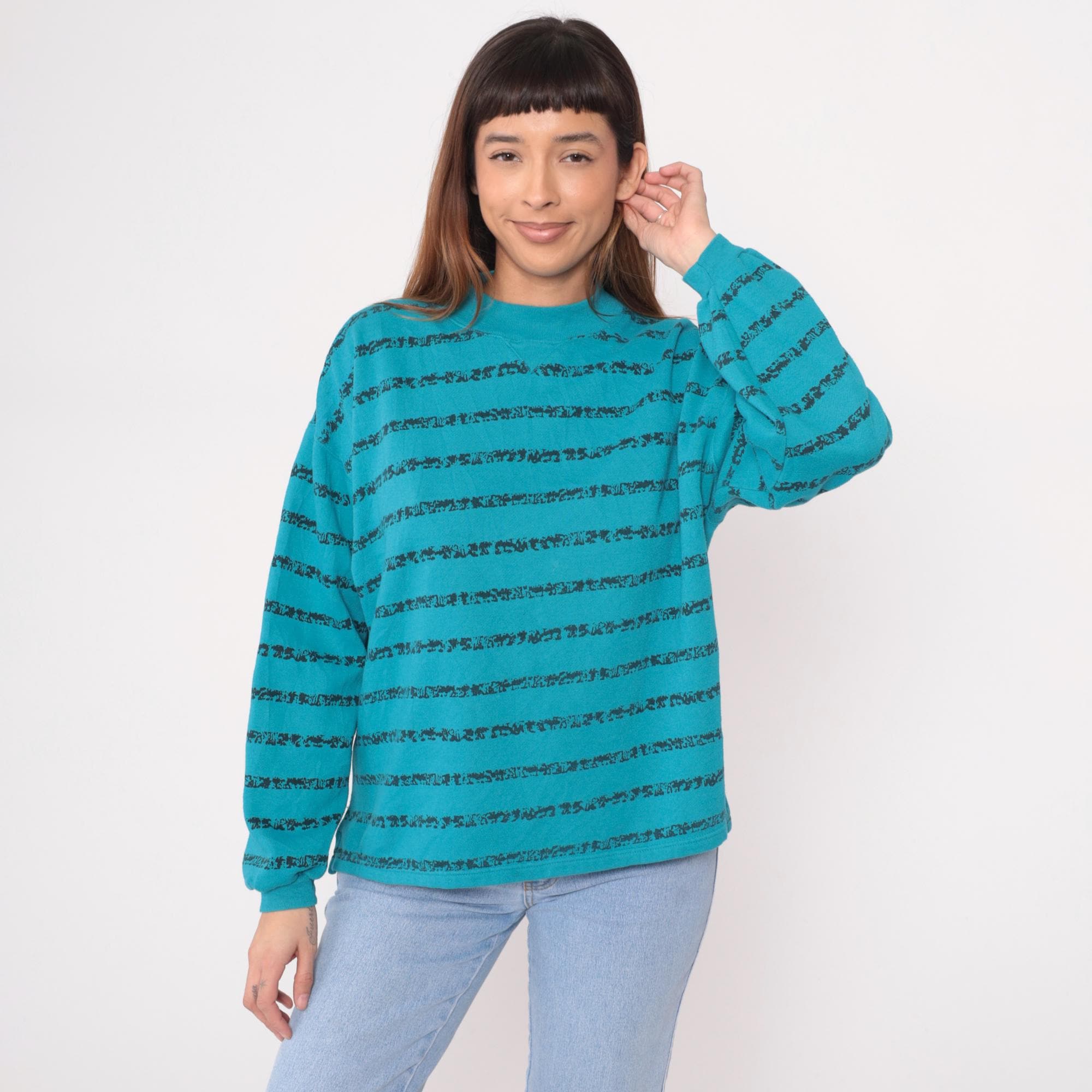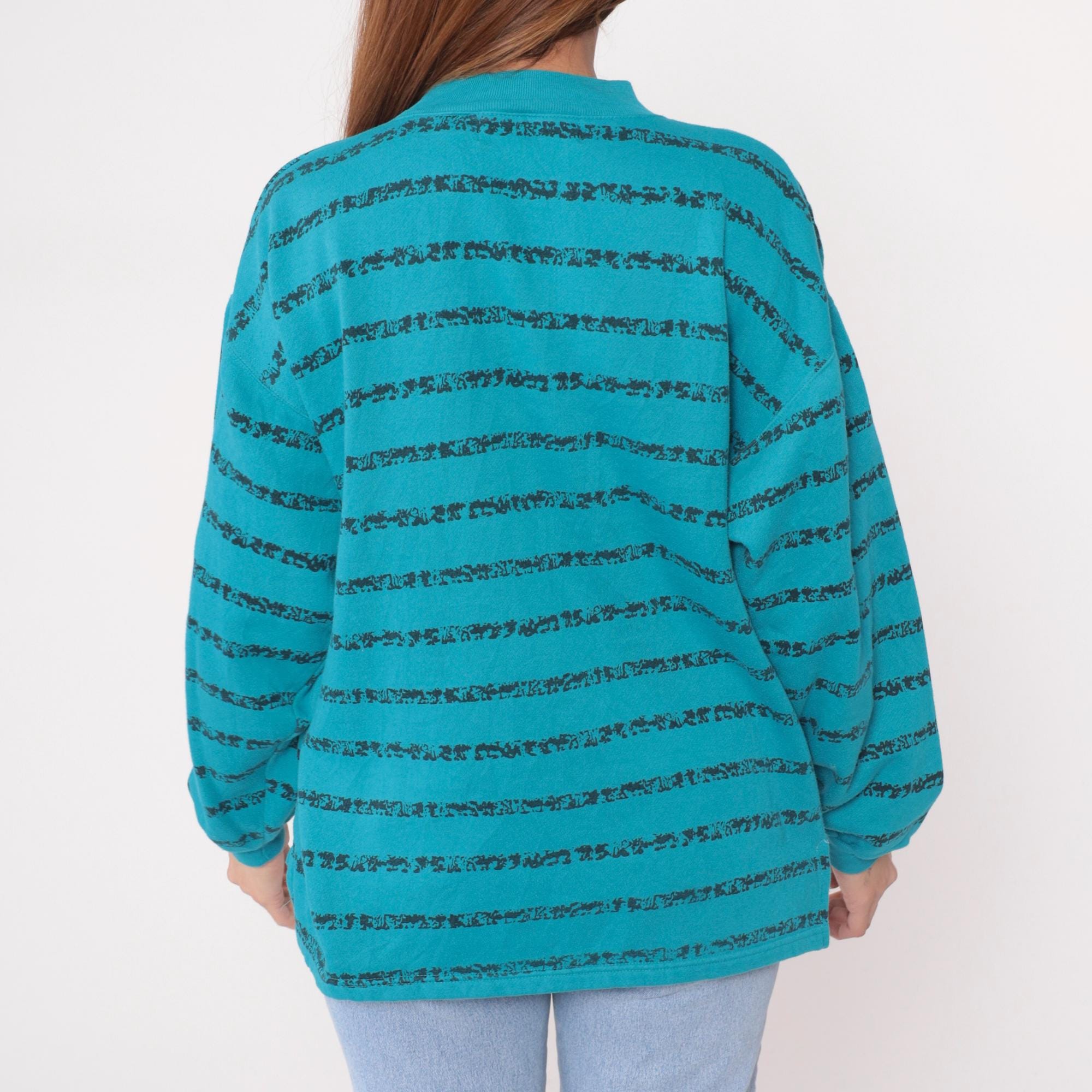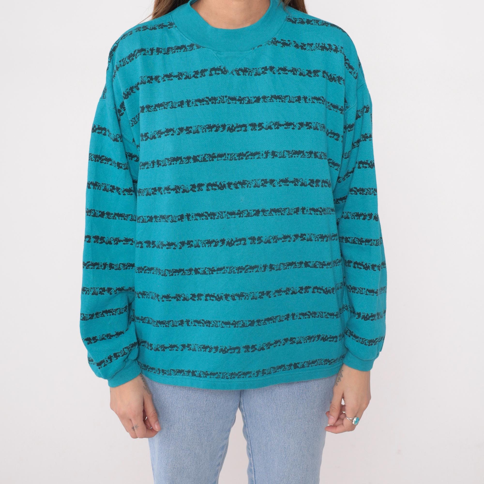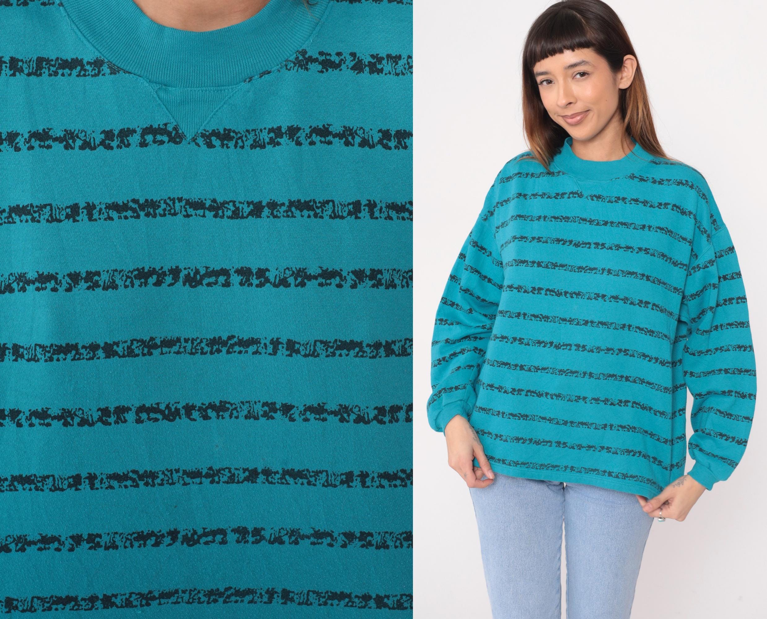 90s turquoise and black striped sweatshirt from drummer boy with distressed horizontal stripe pattern across body and sleeves. Crew neckline with ribbed collar, long sleeves with ribbed cuffs, relaxed fit.