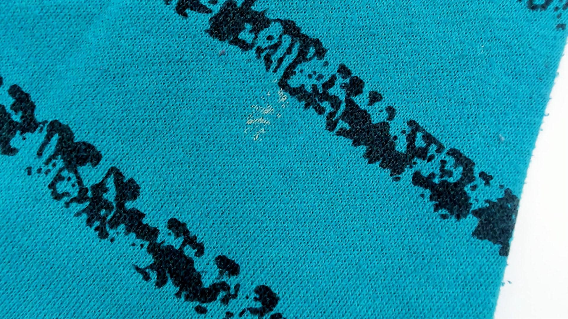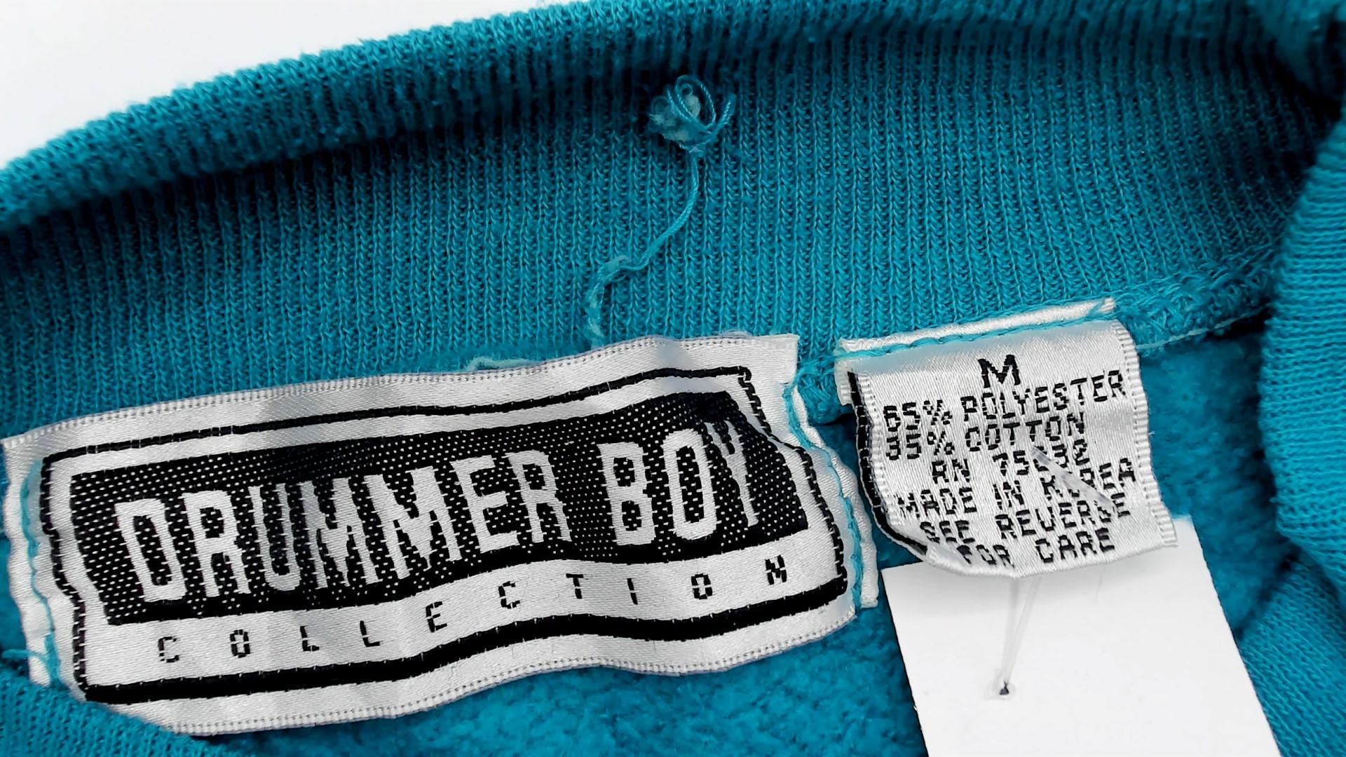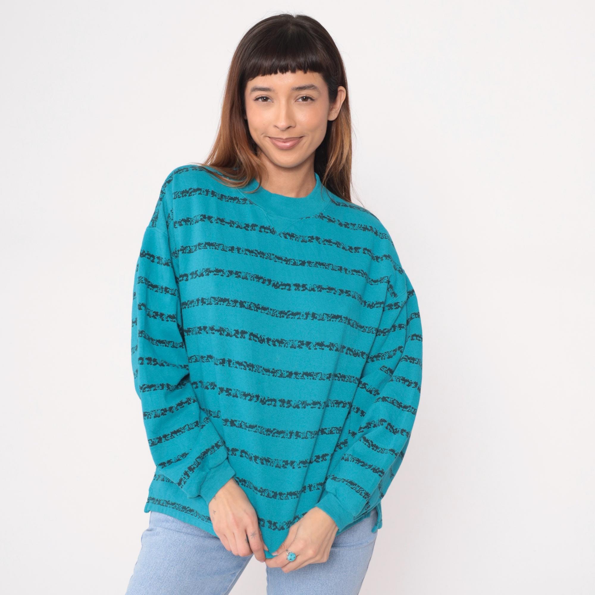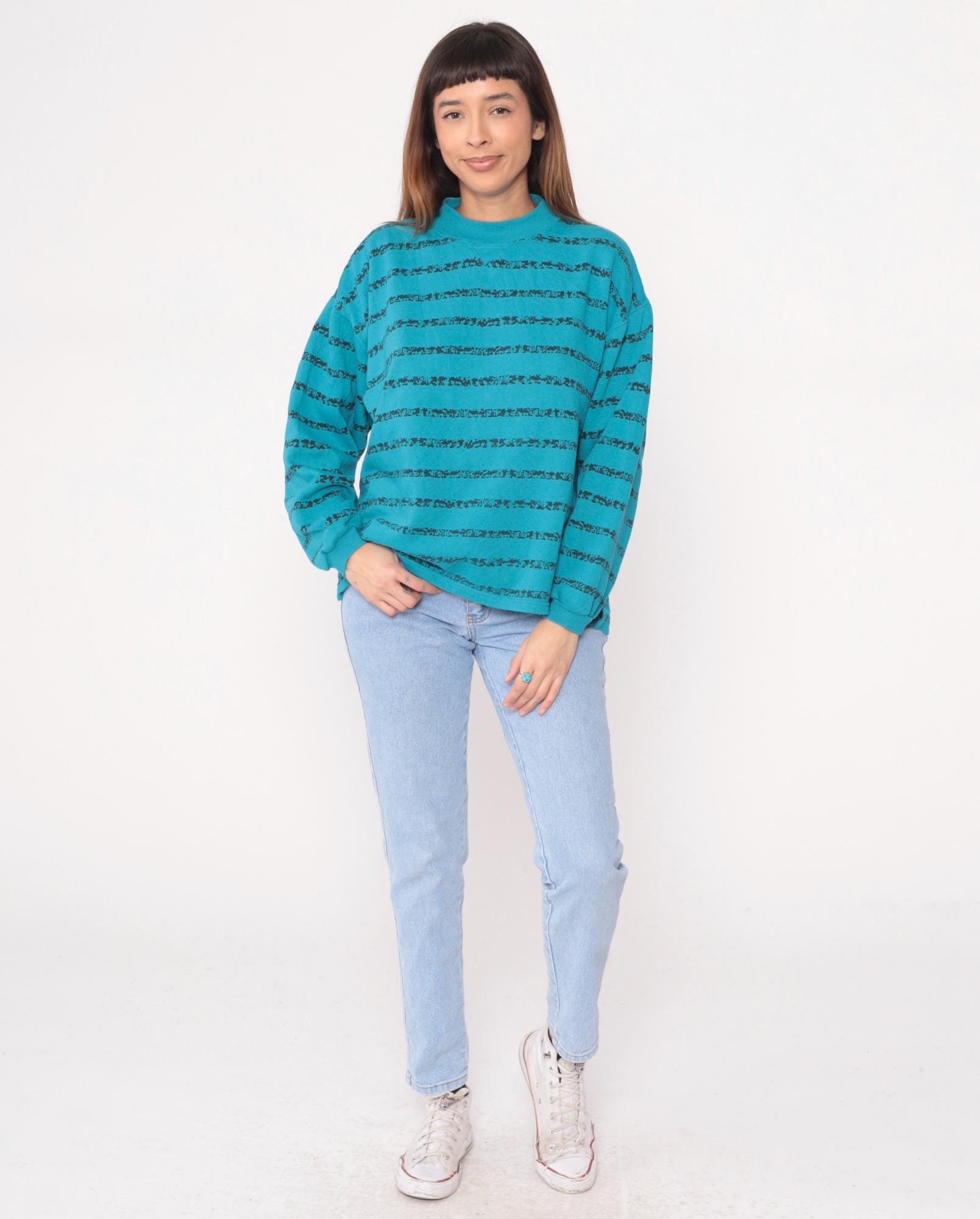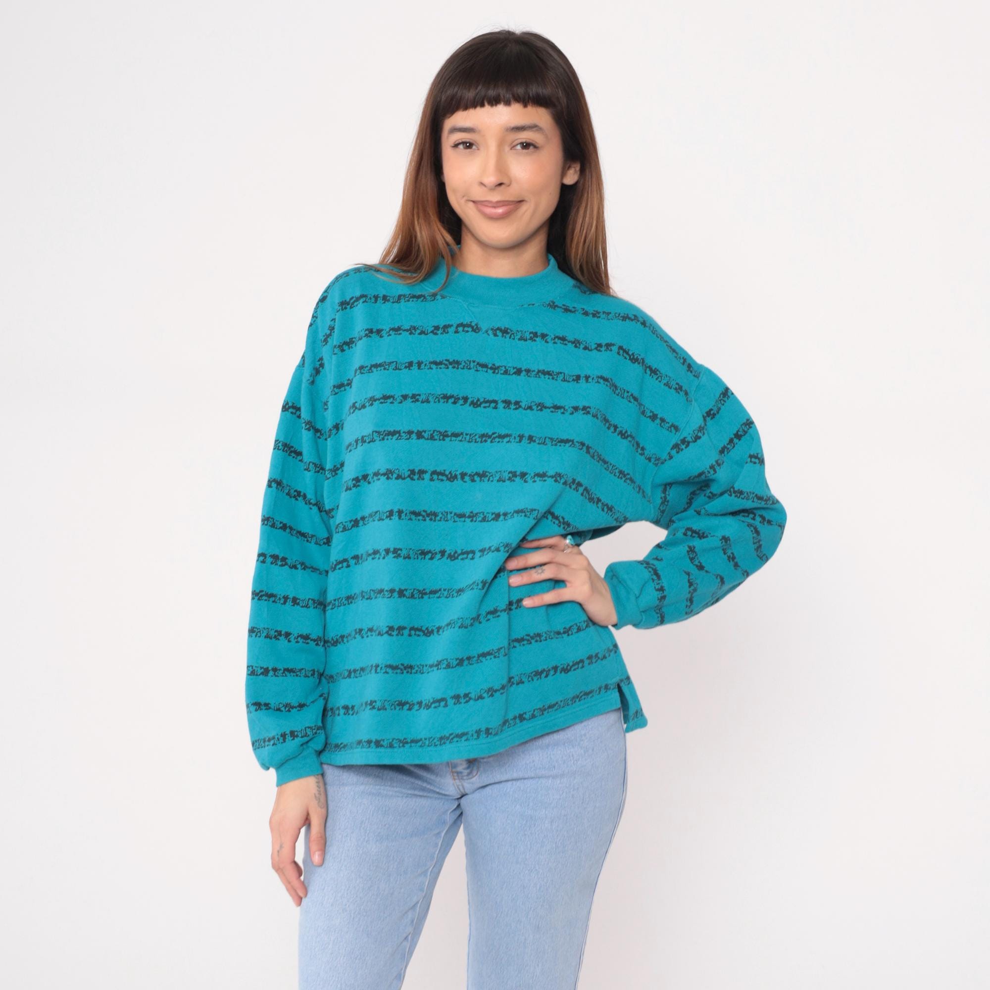 90s turquoise and black striped sweatshirt from drummer boy with distressed horizontal stripe pattern across body and sleeves. Crew neckline with ribbed collar, long sleeves with ribbed cuffs, relaxed fit.