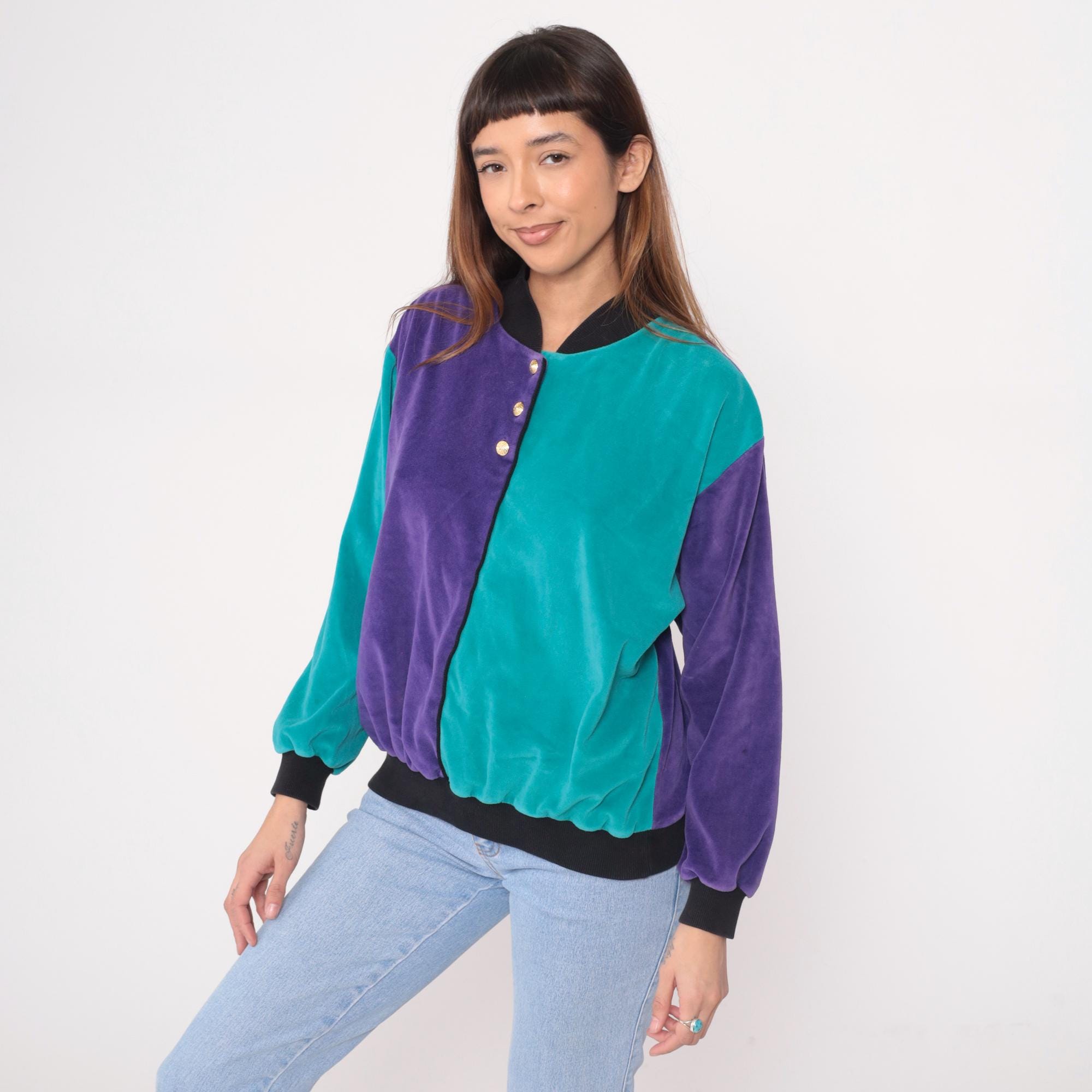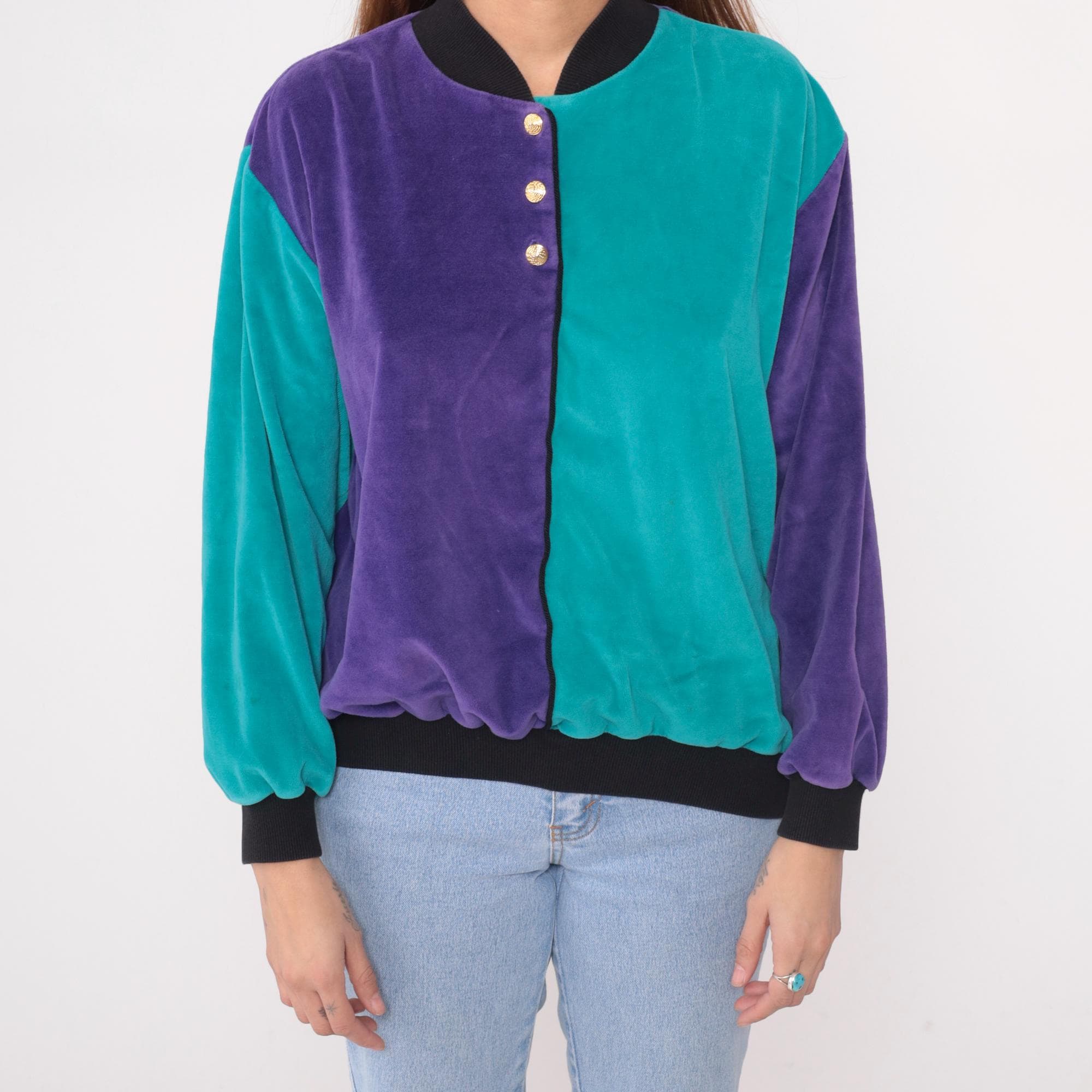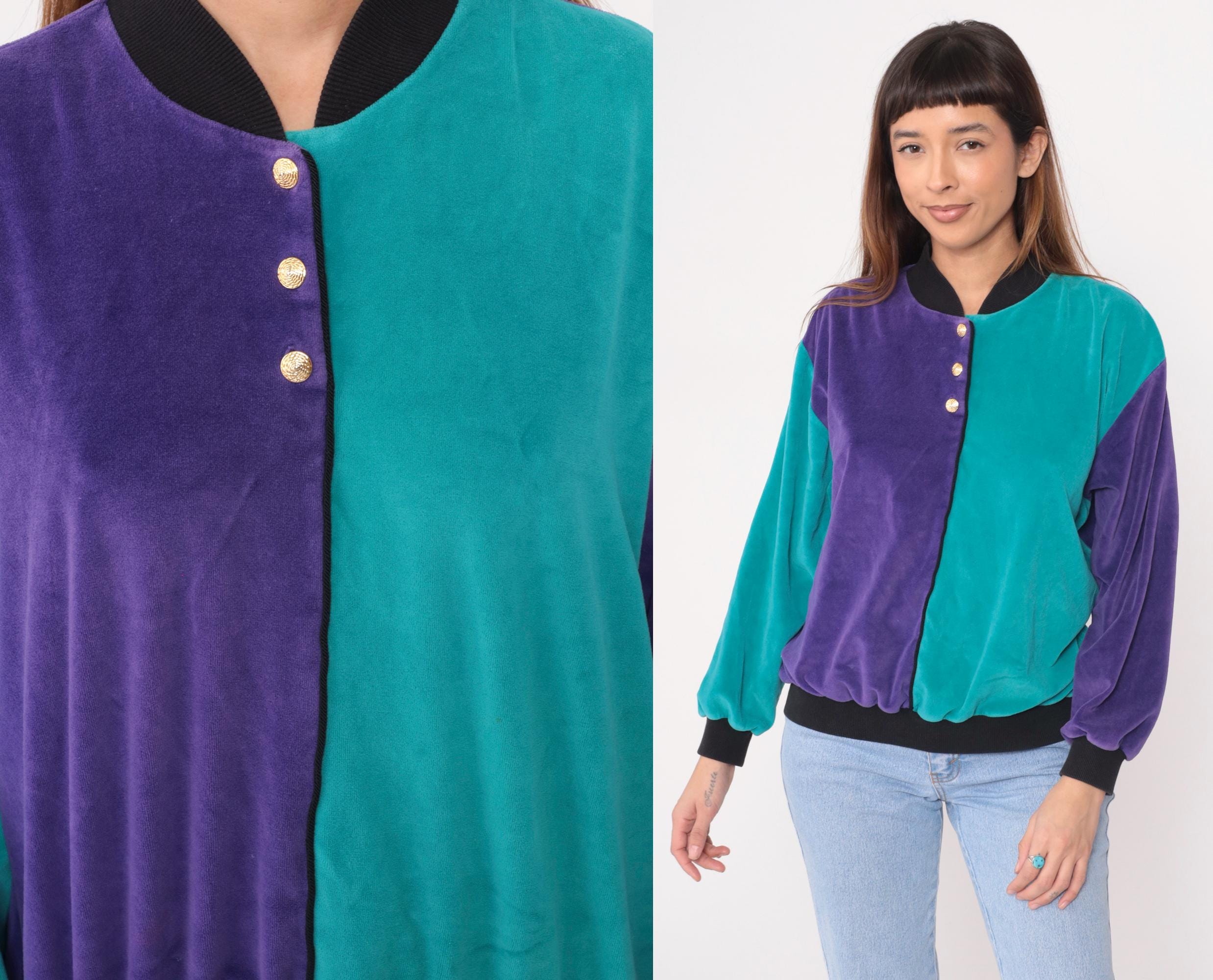 80s purple and turquoise terrycloth bomber jacket with diagonal color blocking design and black ribbed collar, cuffs, and waistband. Three gold decorative buttons near the neckline, banded collar, elastic cuffs and hem.