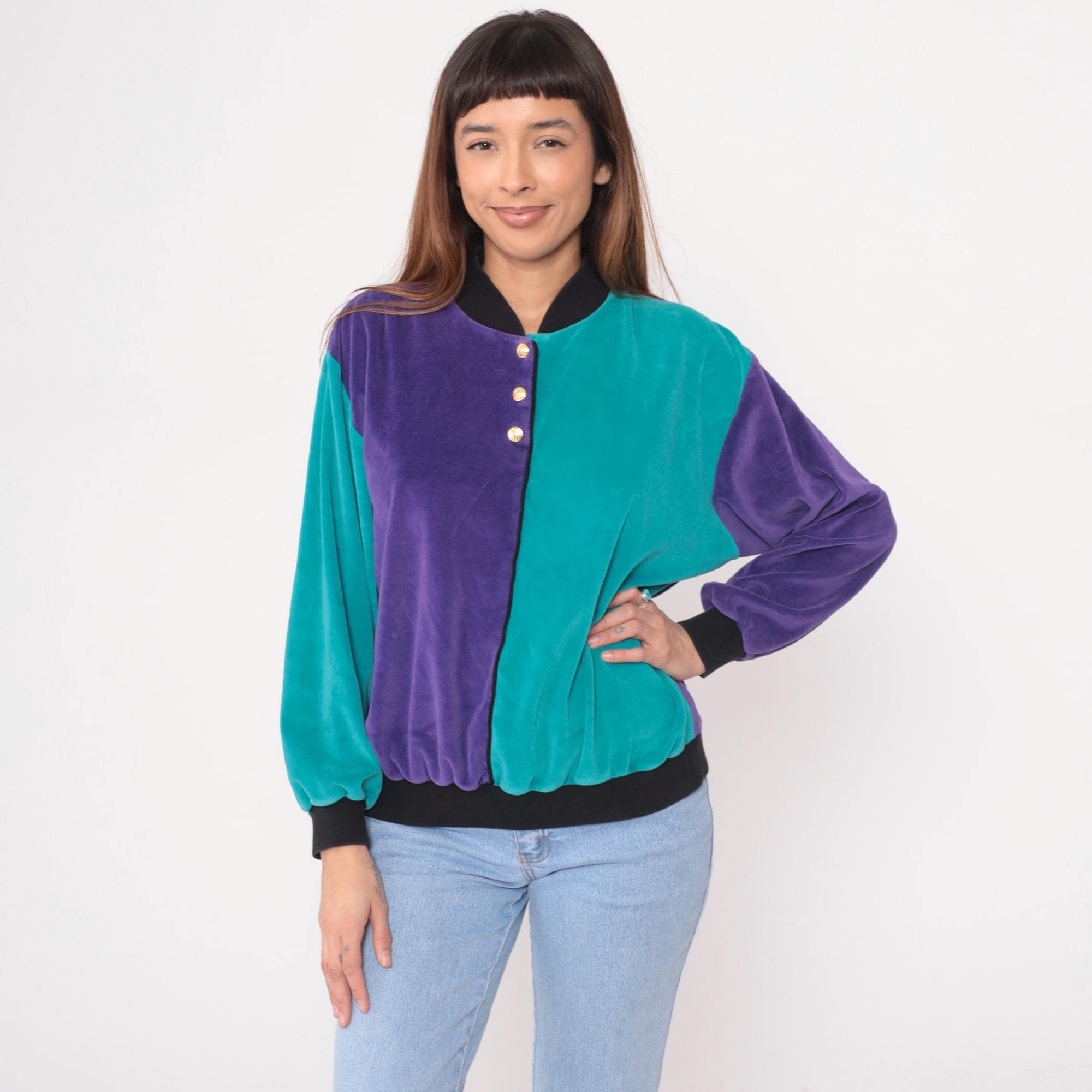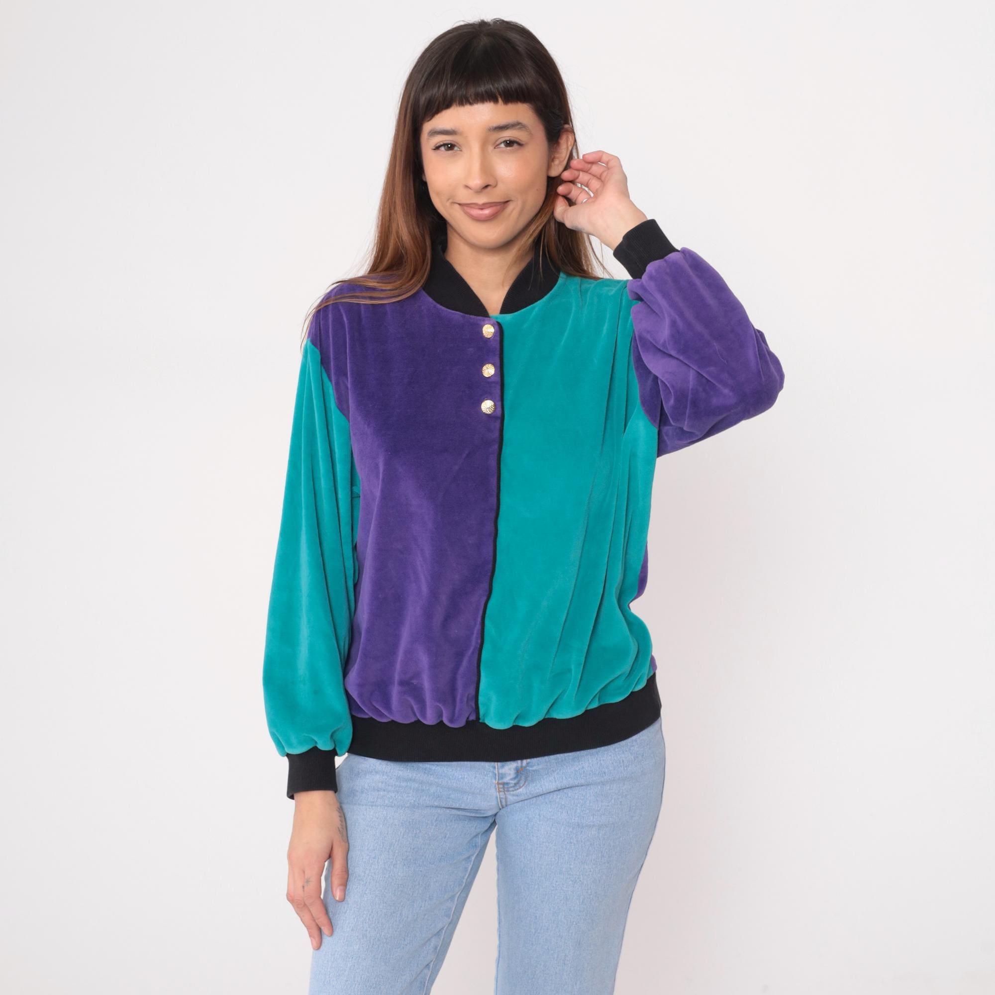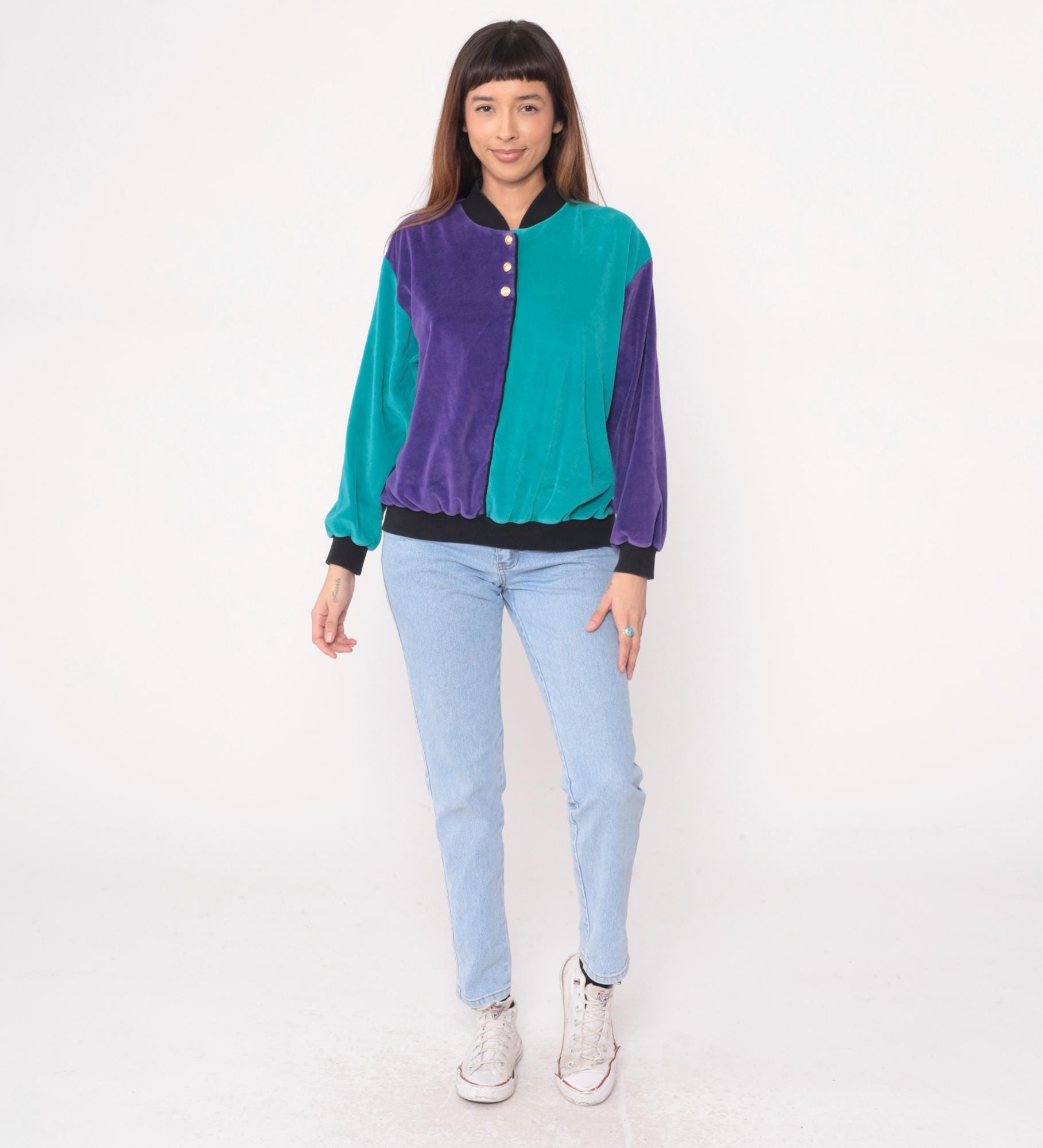 80s purple and turquoise terrycloth bomber jacket with diagonal color blocking design and black ribbed collar, cuffs, and waistband. Three gold decorative buttons near the neckline, banded collar, elastic cuffs and hem.