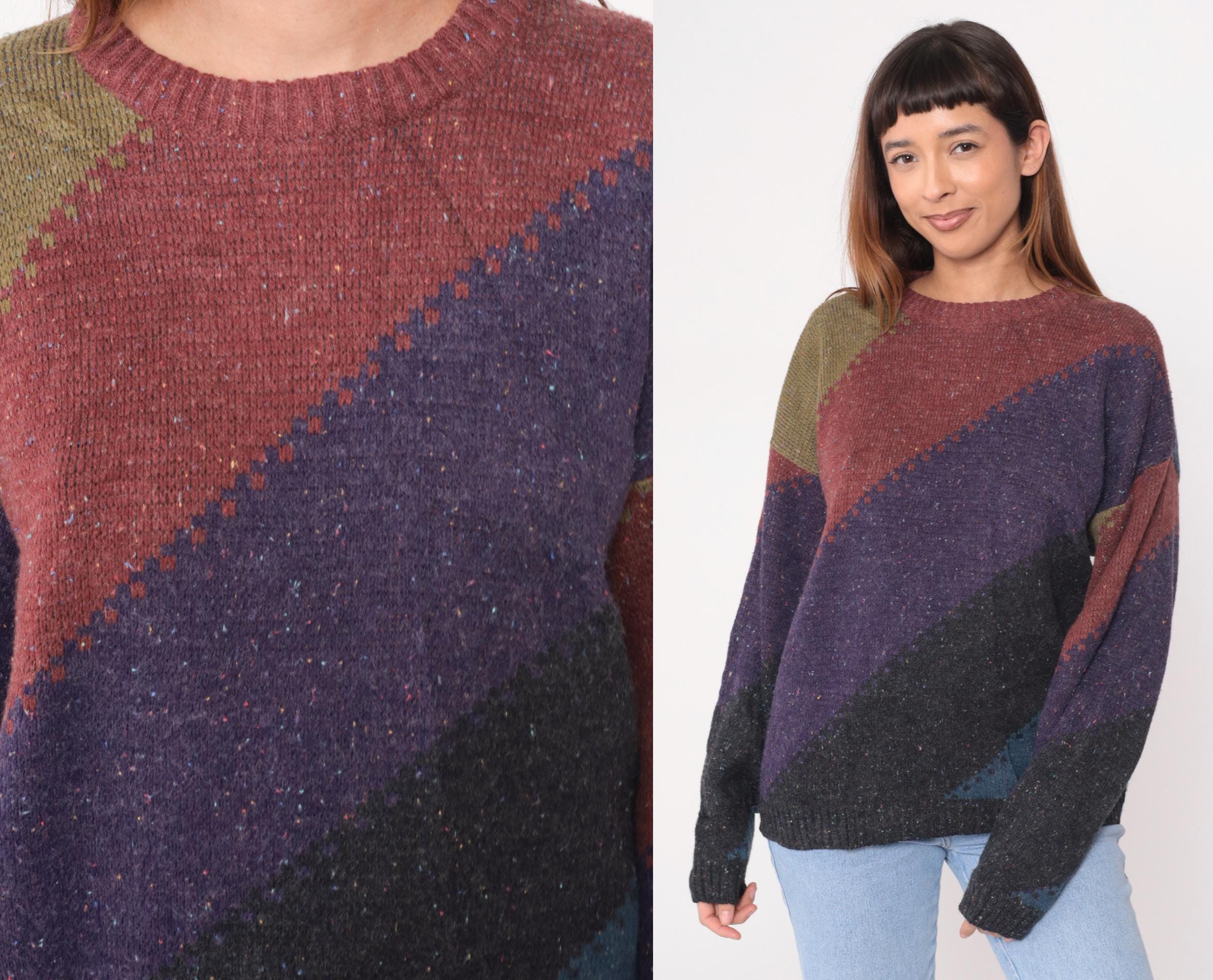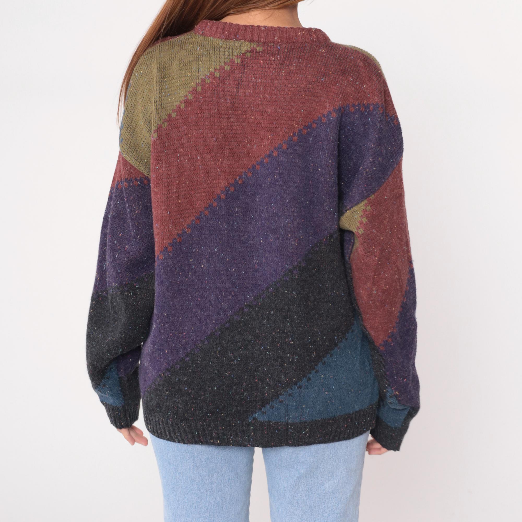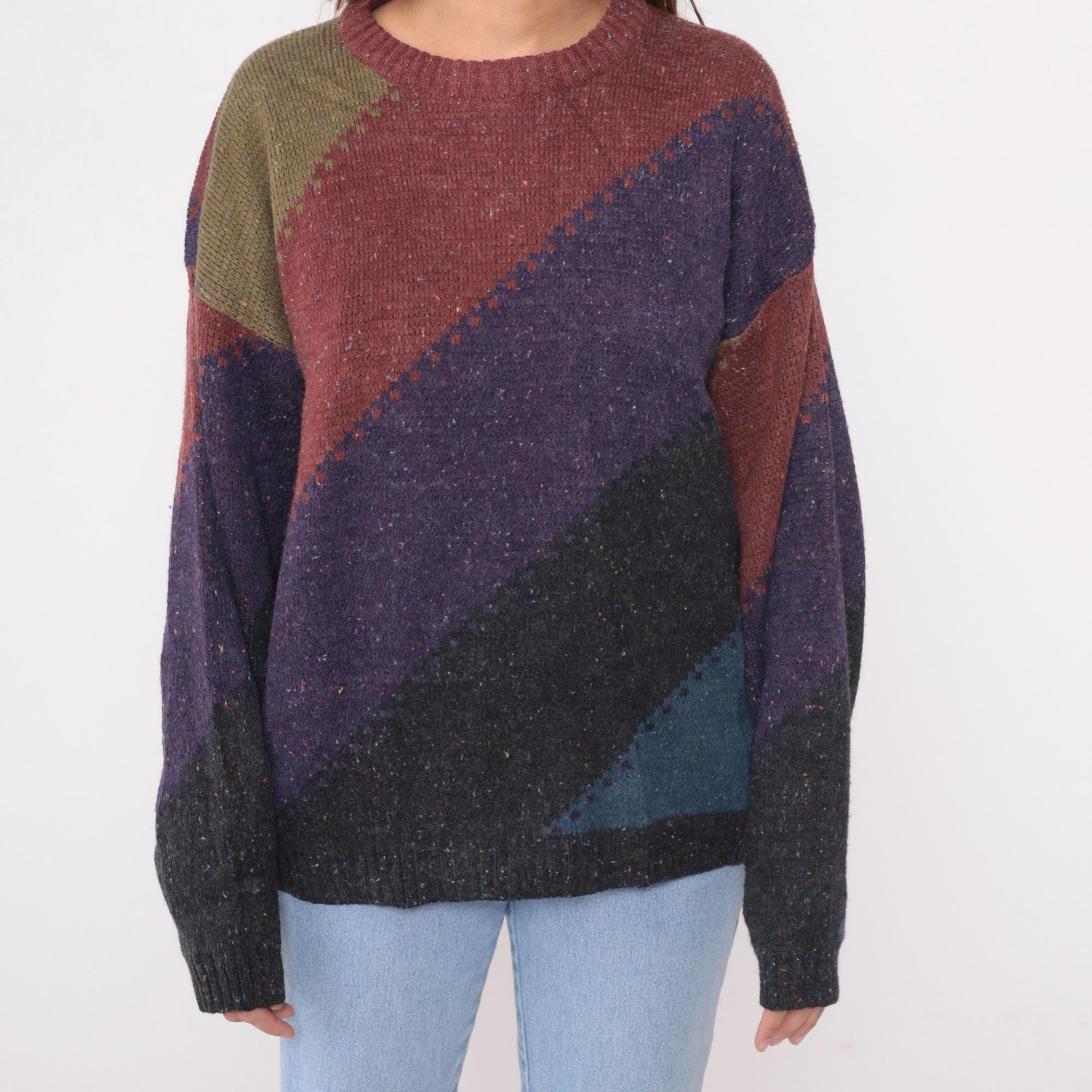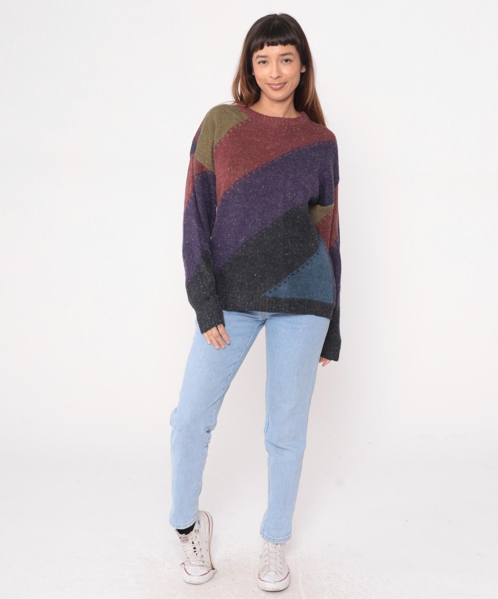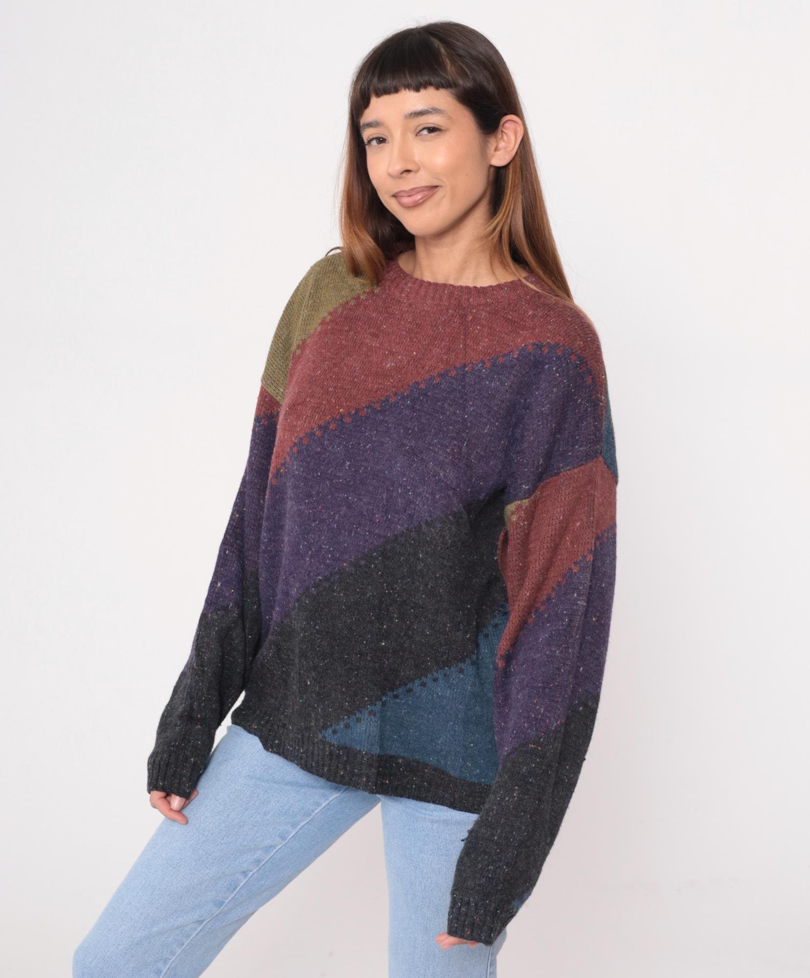 80s color-blocked sweater from method with diagonal geometric sections in olive green, mauve, navy, charcoal, and teal blue. Flecked knit texture throughout, crew neck with ribbed collar, cuffs, and hem.