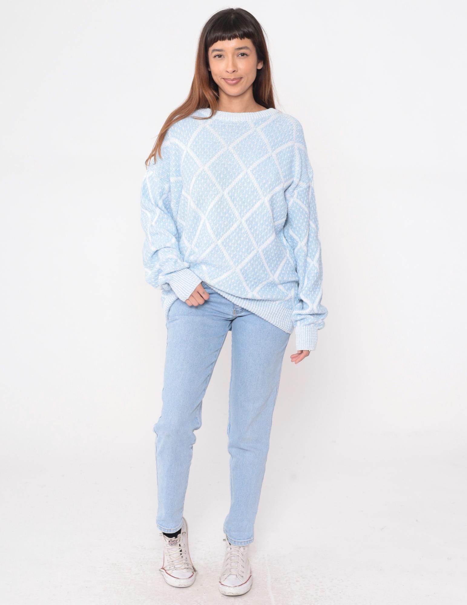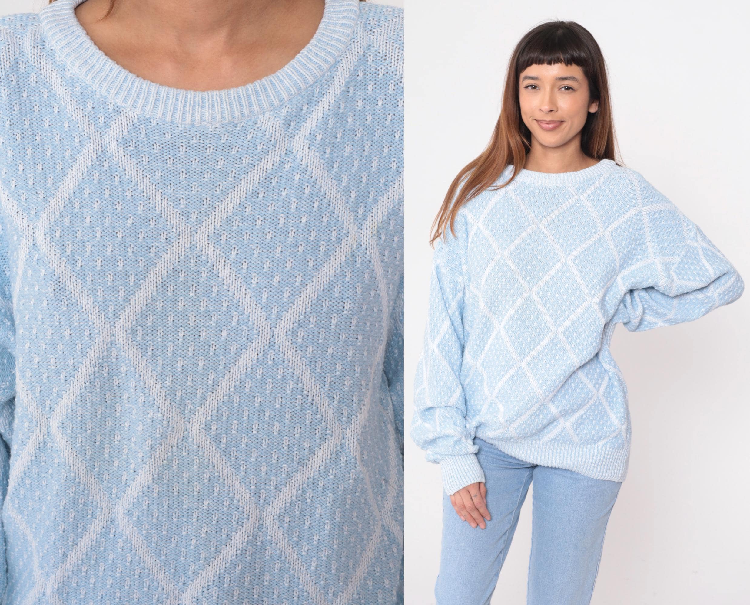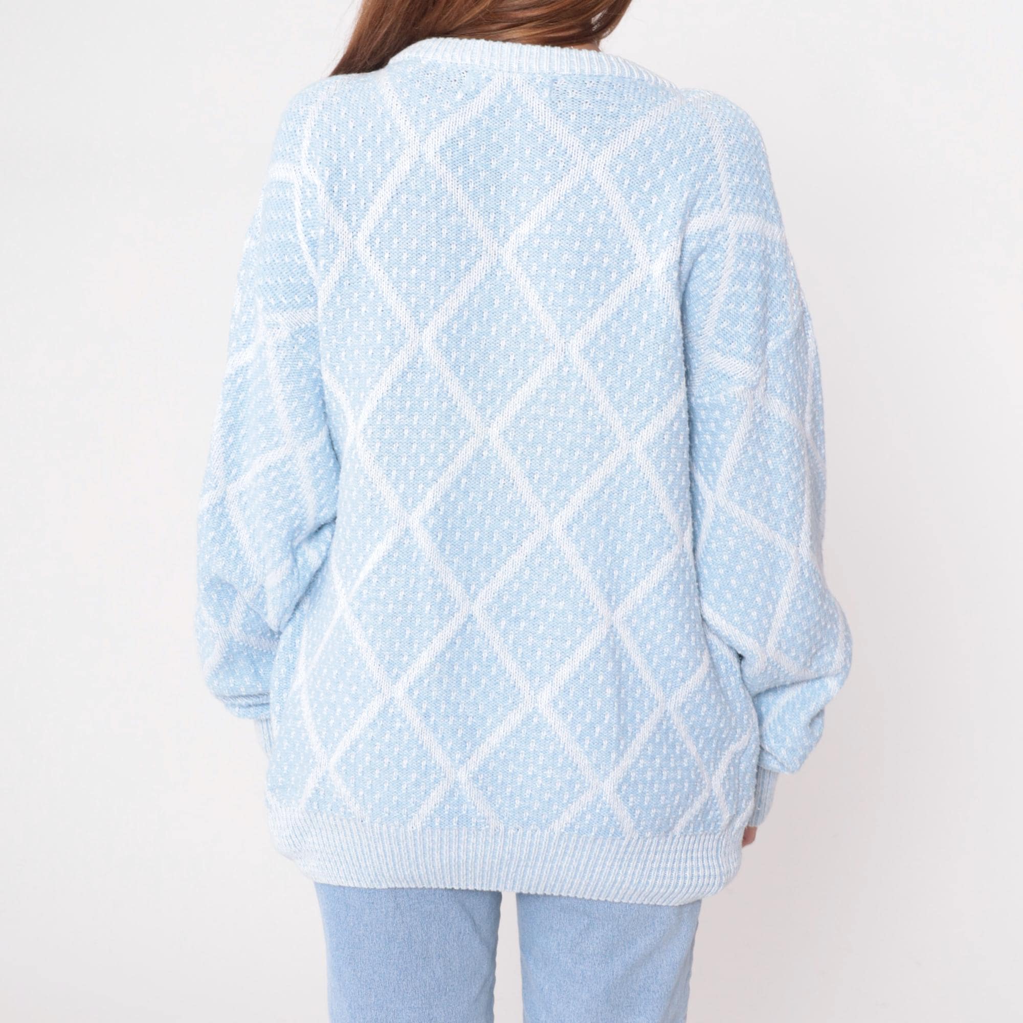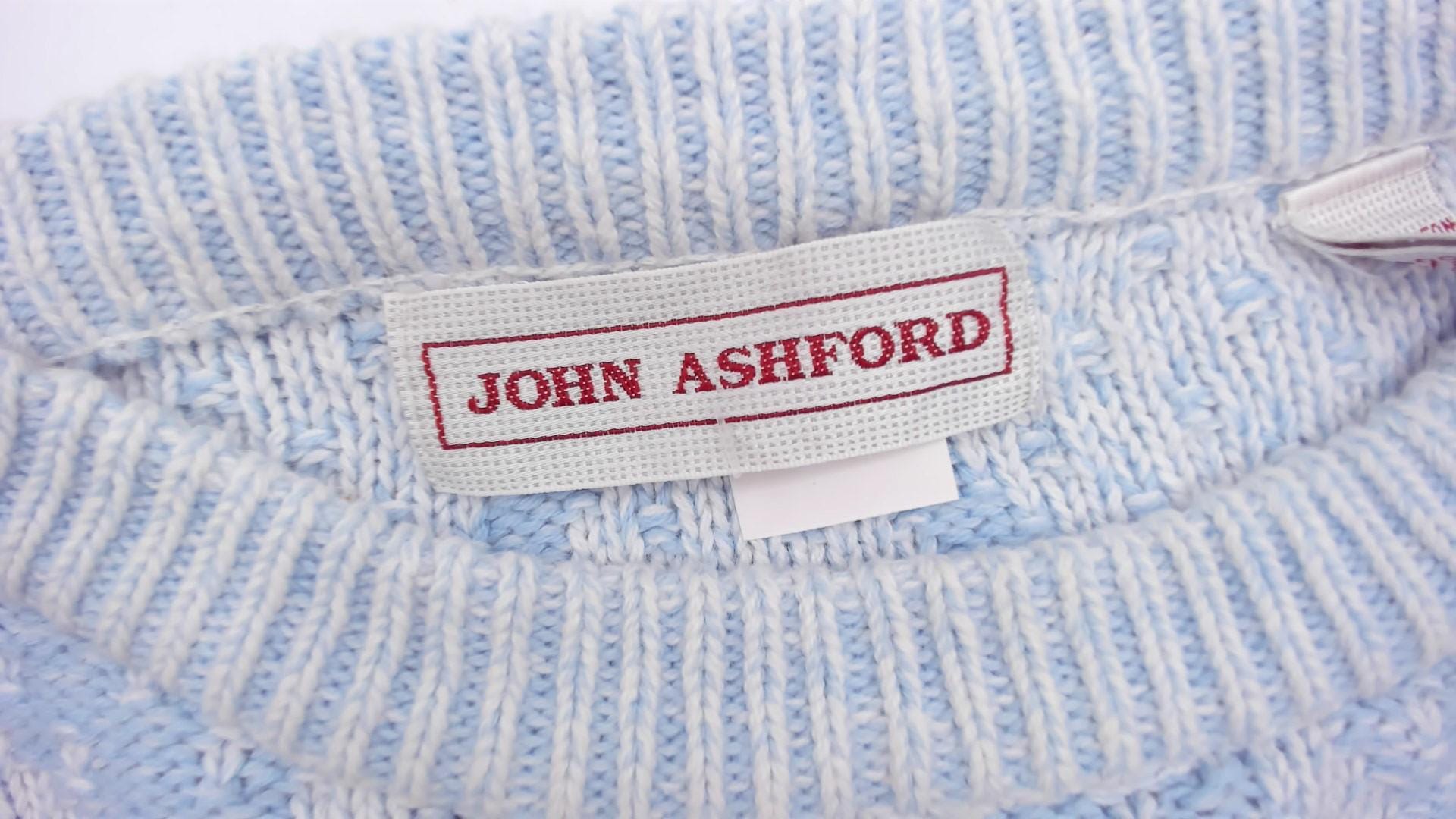 90s light blue sweater from John Ashford with white diagonal stripe pattern across the knit. Crew neck, long sleeves with ribbed cuffs, ribbed collar and hem.