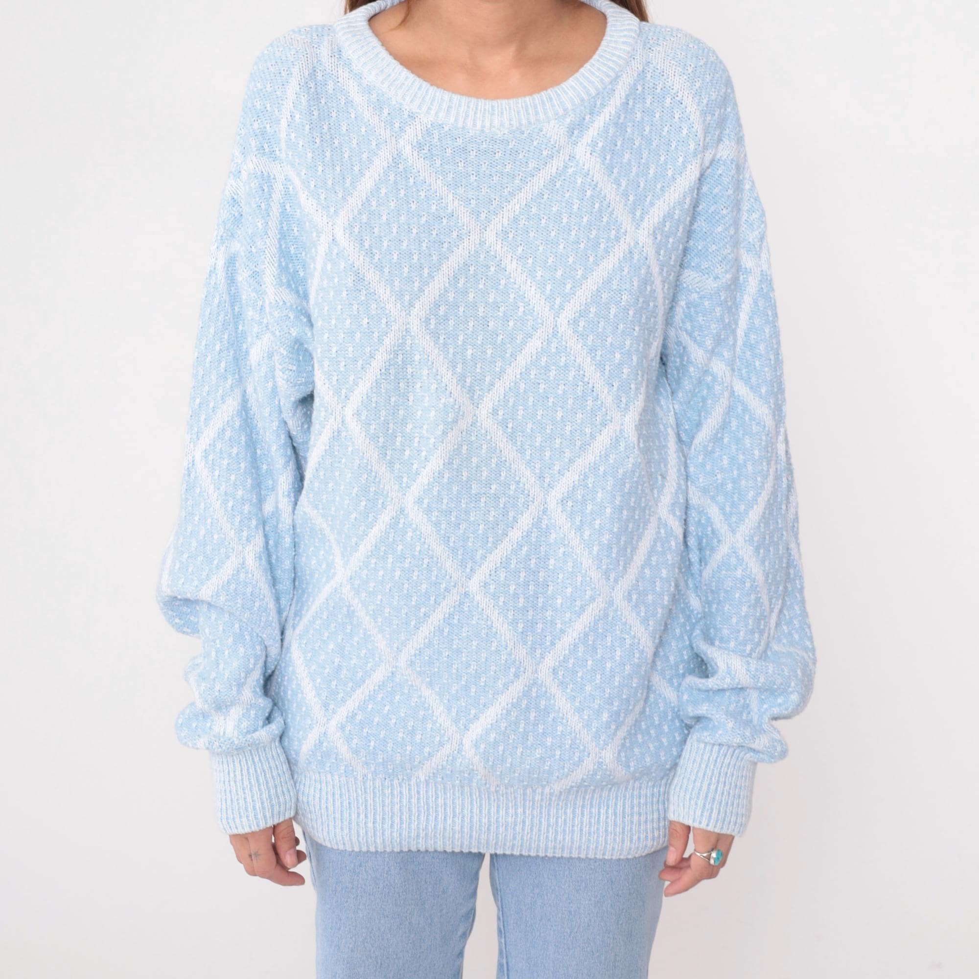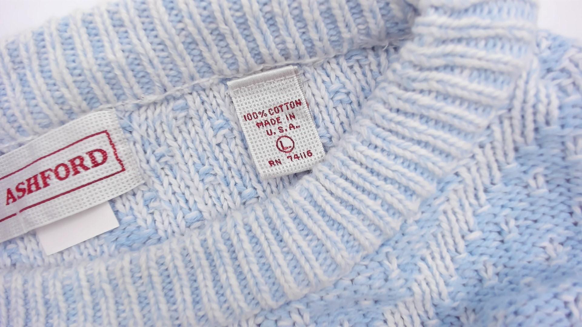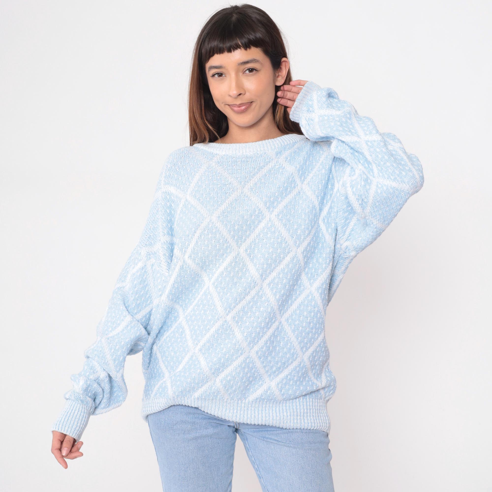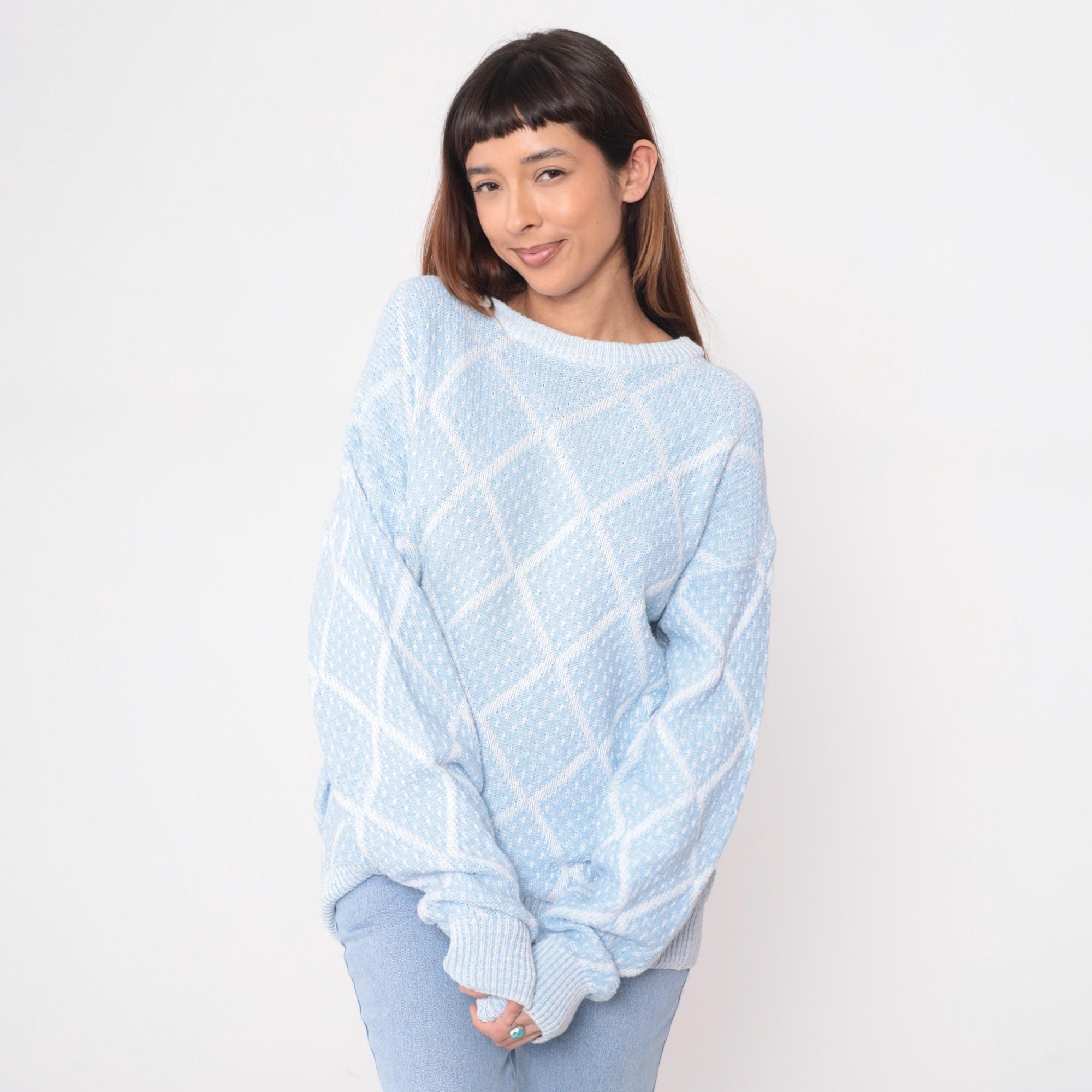 90s light blue sweater from John Ashford with white diagonal stripe pattern across the knit. Crew neck, long sleeves with ribbed cuffs, ribbed collar and hem.