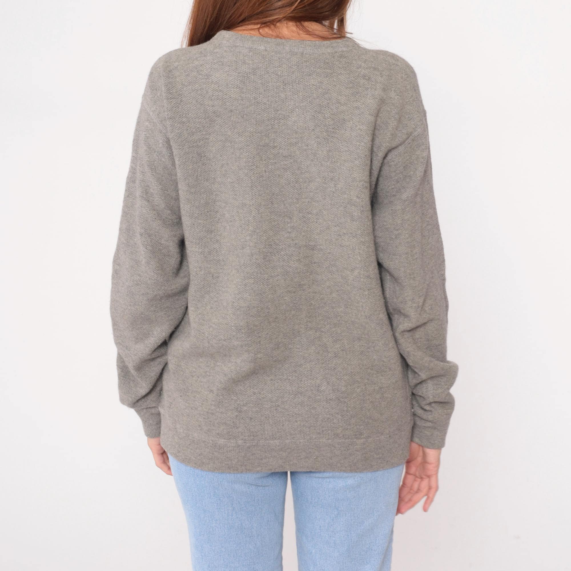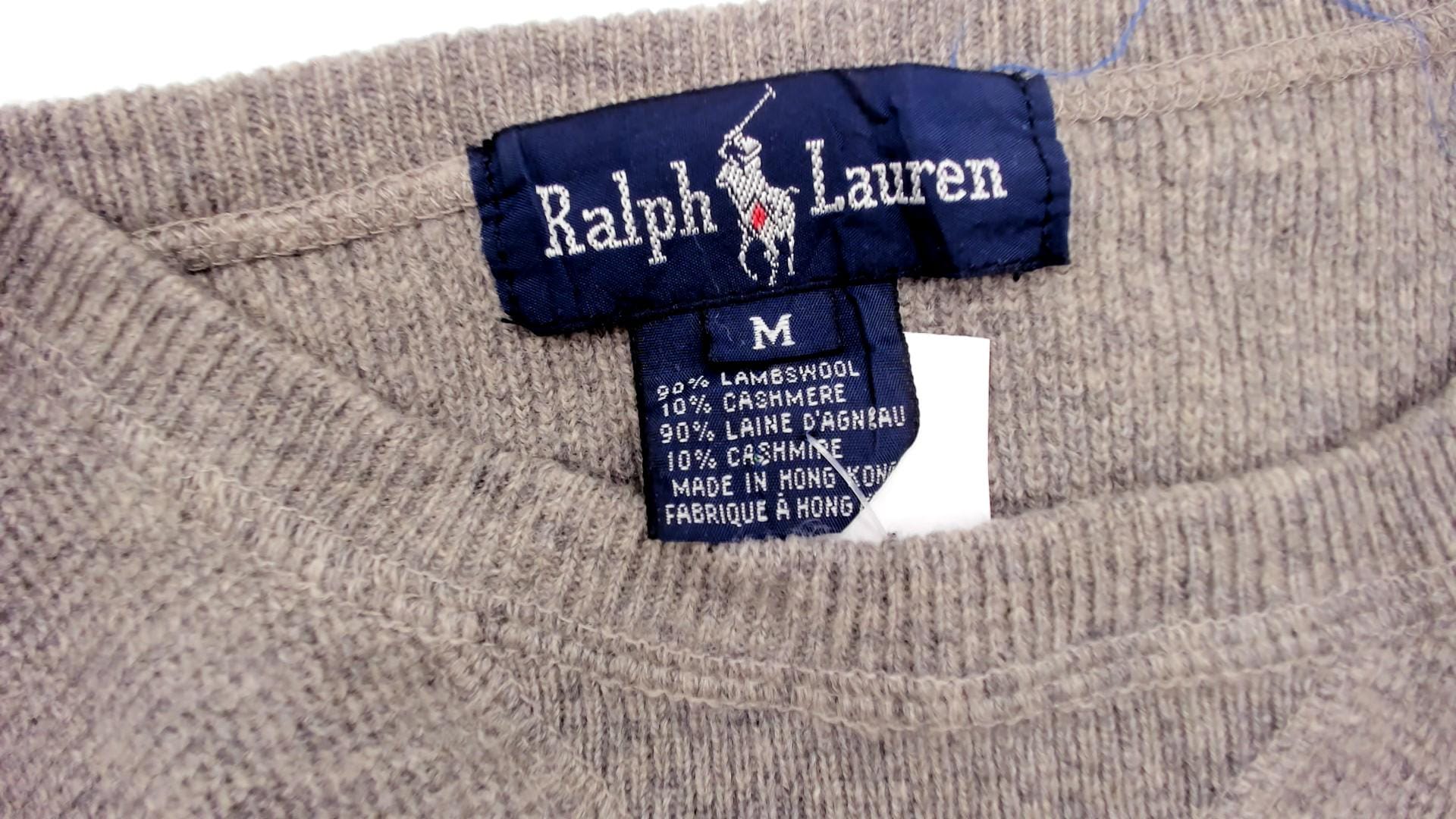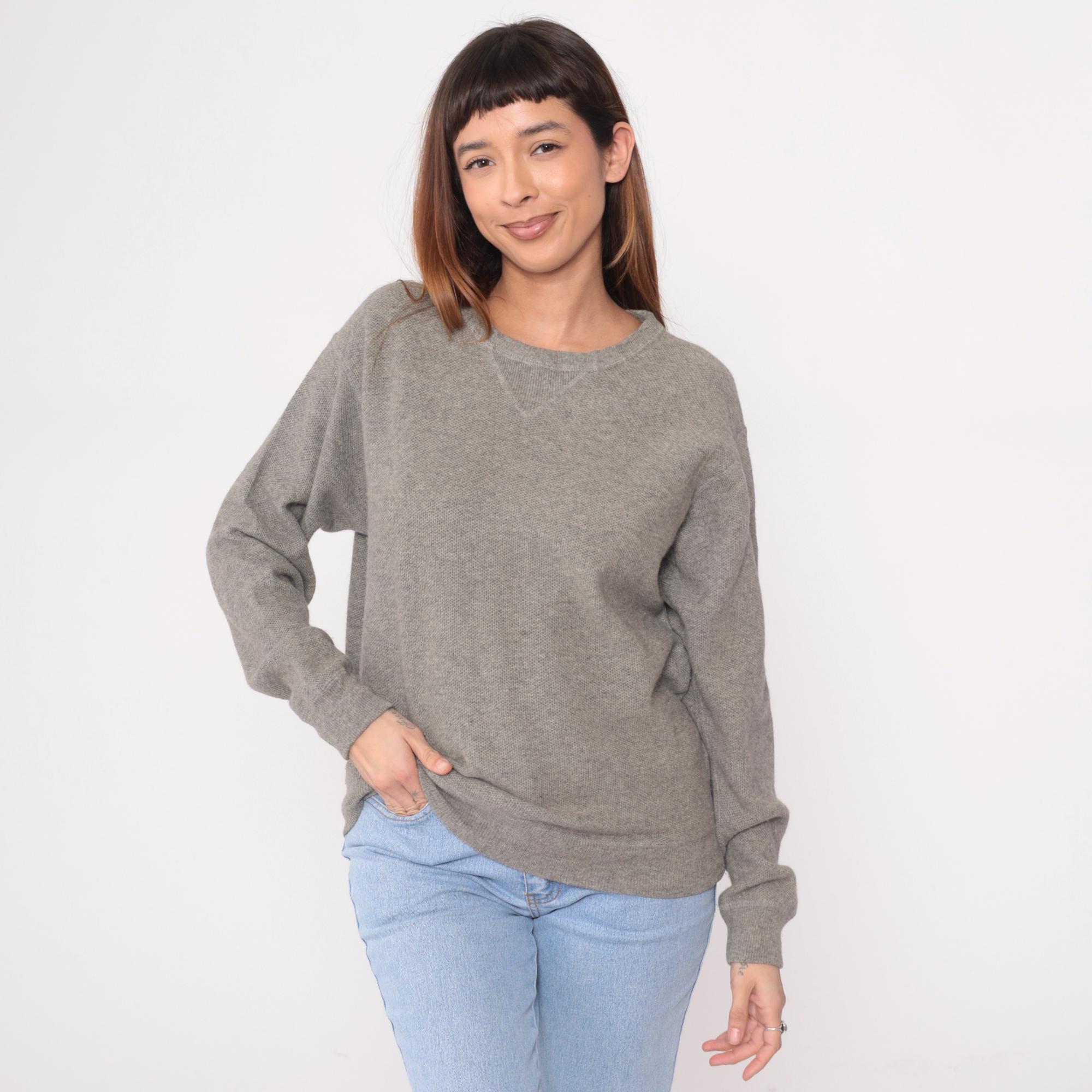 90s gray crew neck sweater from Ralph Lauren with ribbed collar, cuffs, and hem. Thermal knit texture throughout.