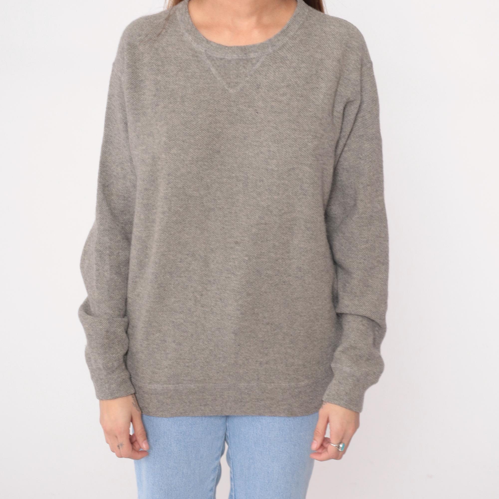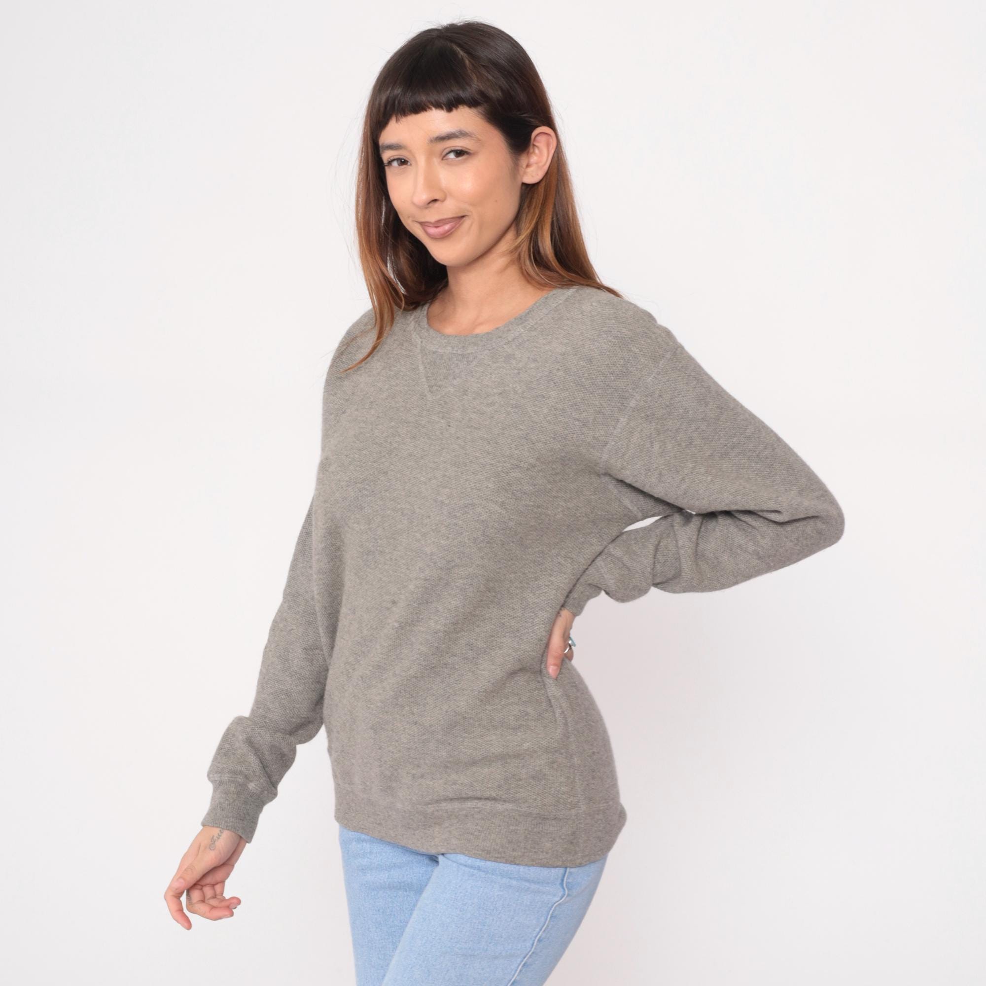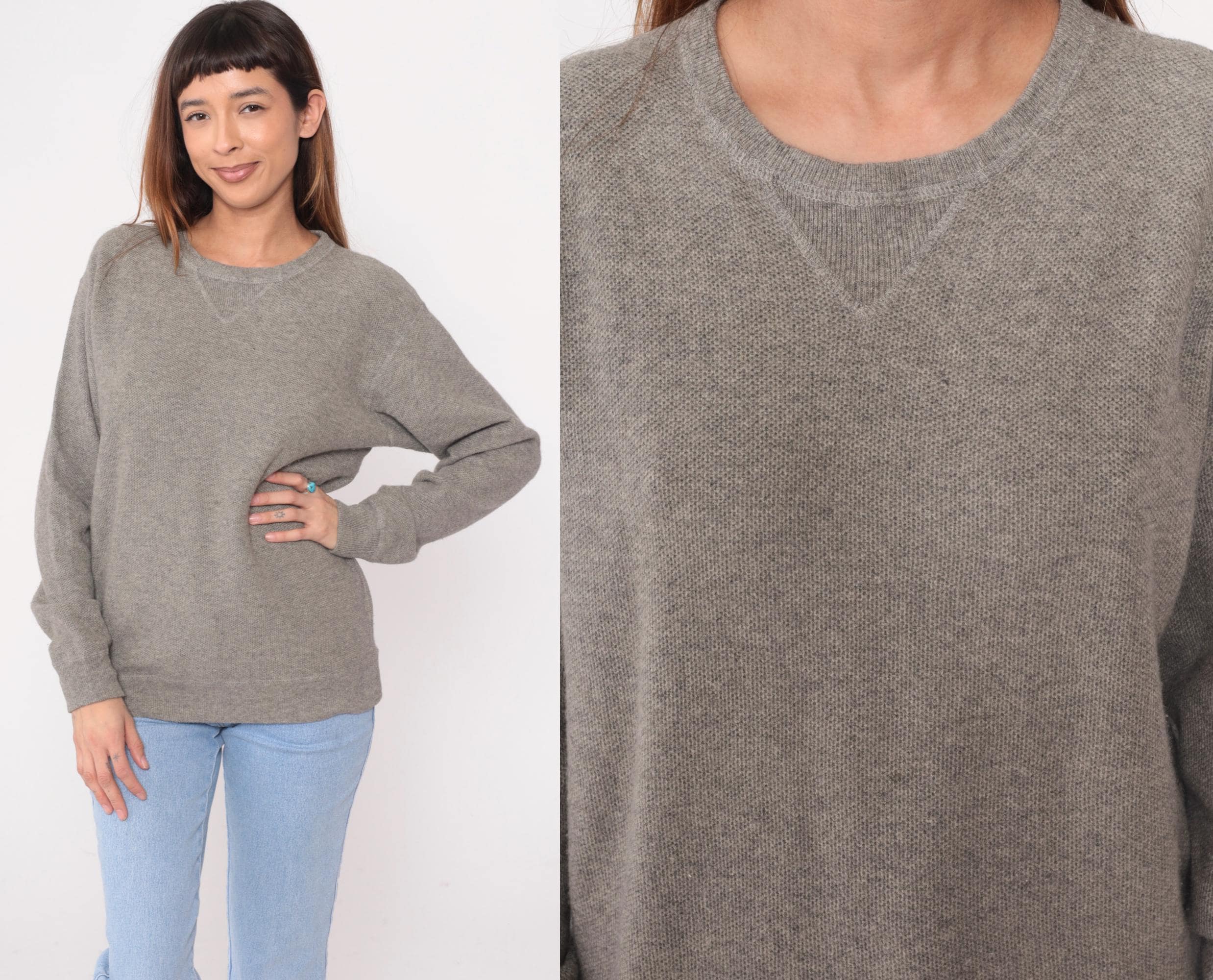 90s gray crew neck sweater from Ralph Lauren with ribbed collar, cuffs, and hem. Thermal knit texture throughout.