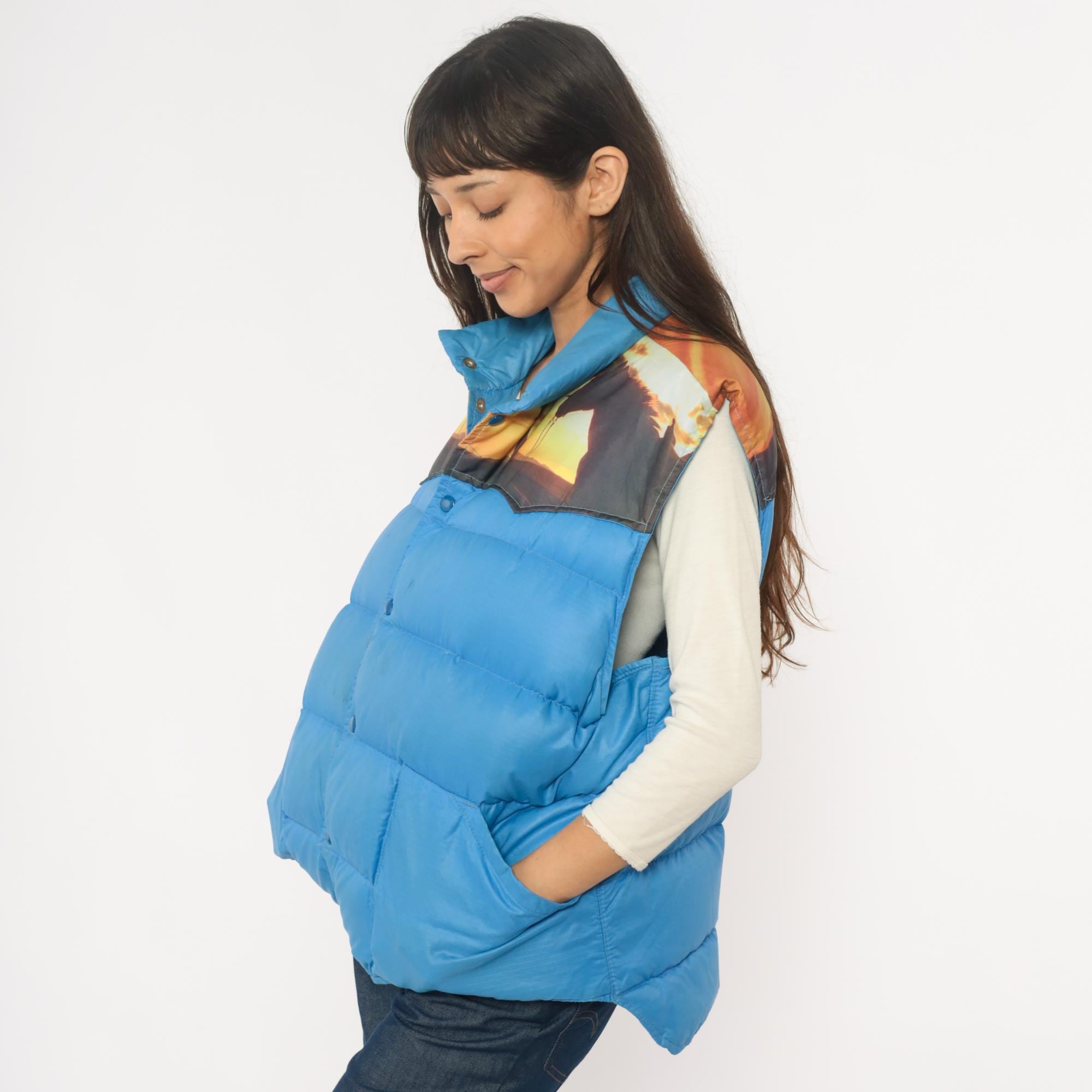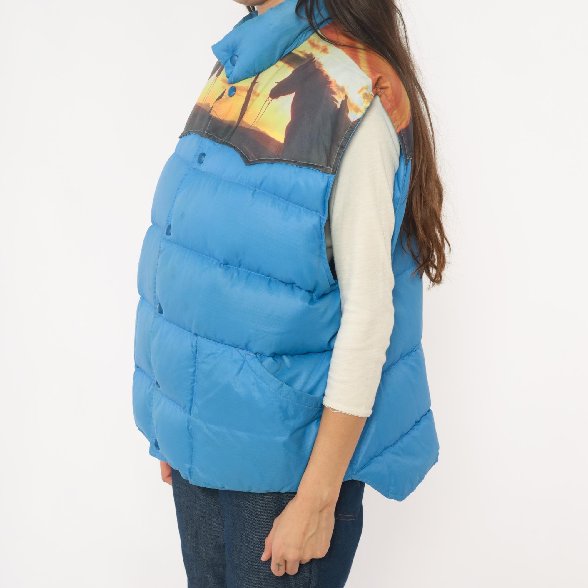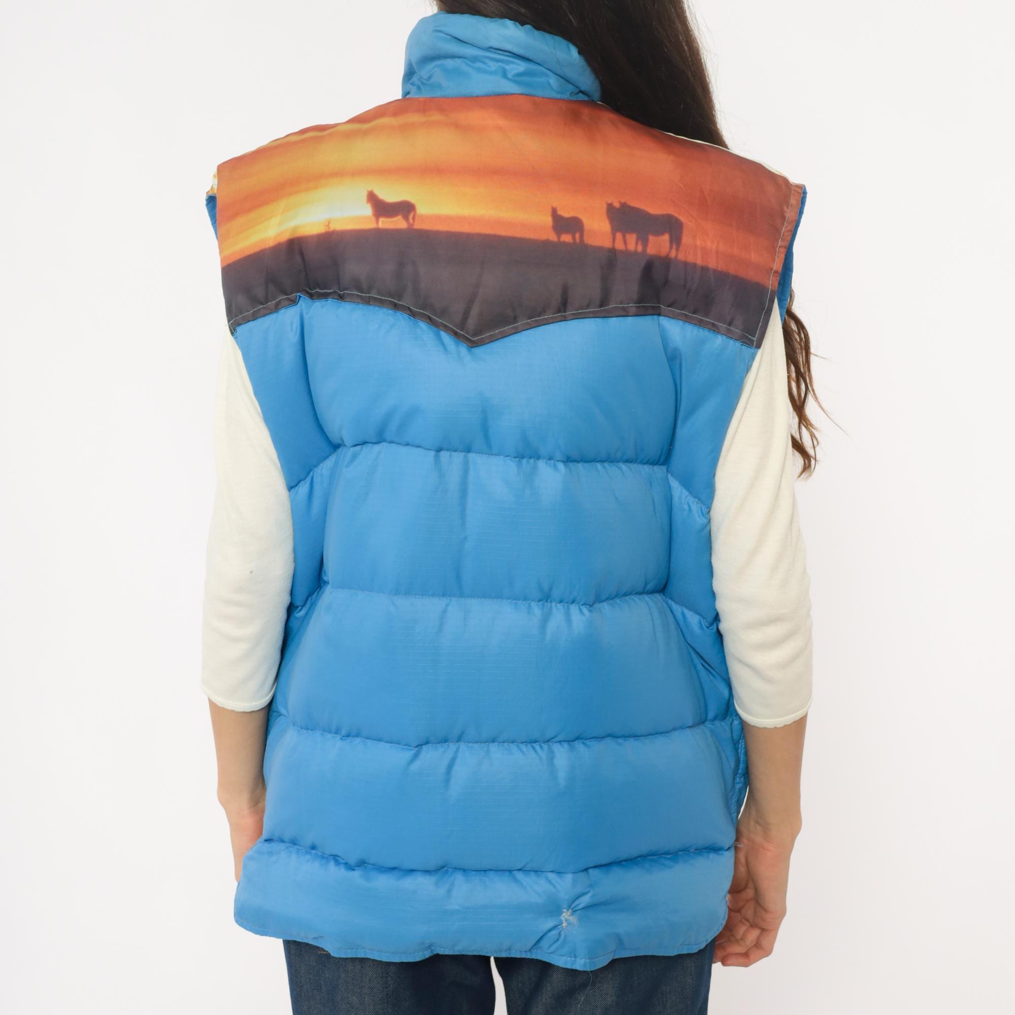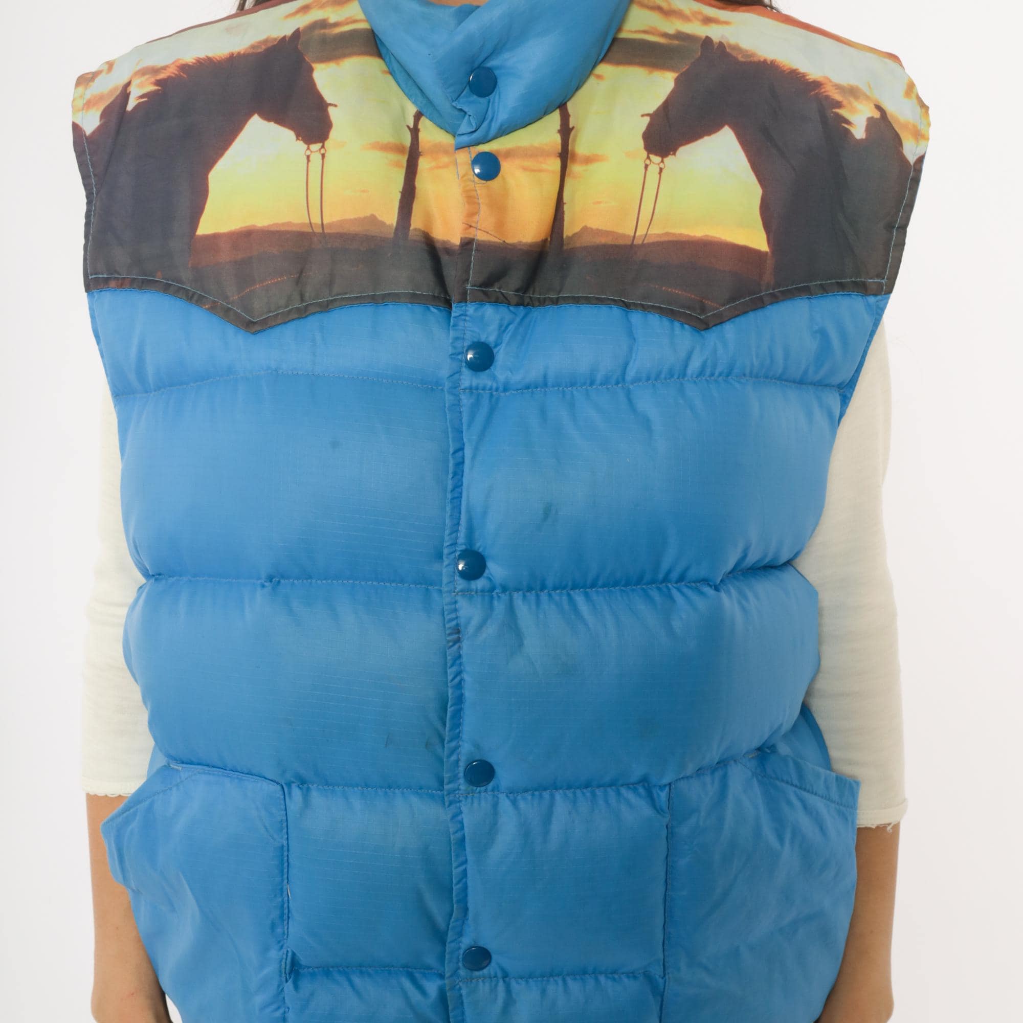 70s bright blue puffer vest with Horses in Western sunset scene across the yoke and shoulders showing silhouetted horses and cattle against orange, yellow, and brown gradient sky. Snap button front closure, stand collar, two front hand pockets, quilted down-filled body. Nylon shell with down fill.