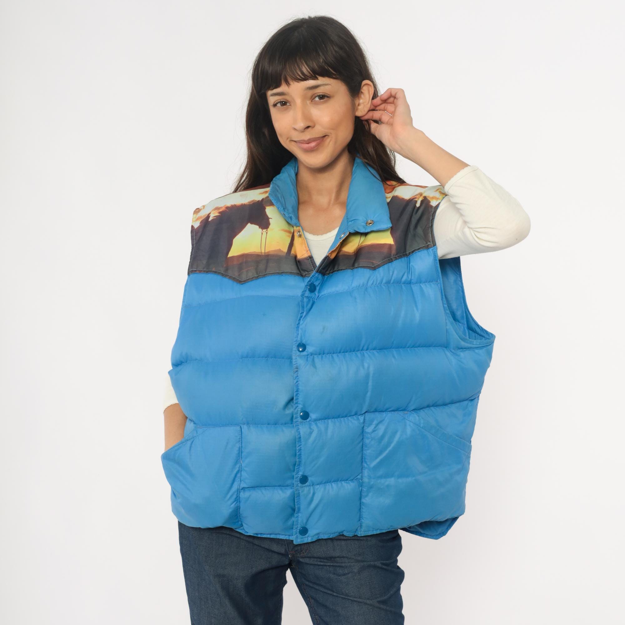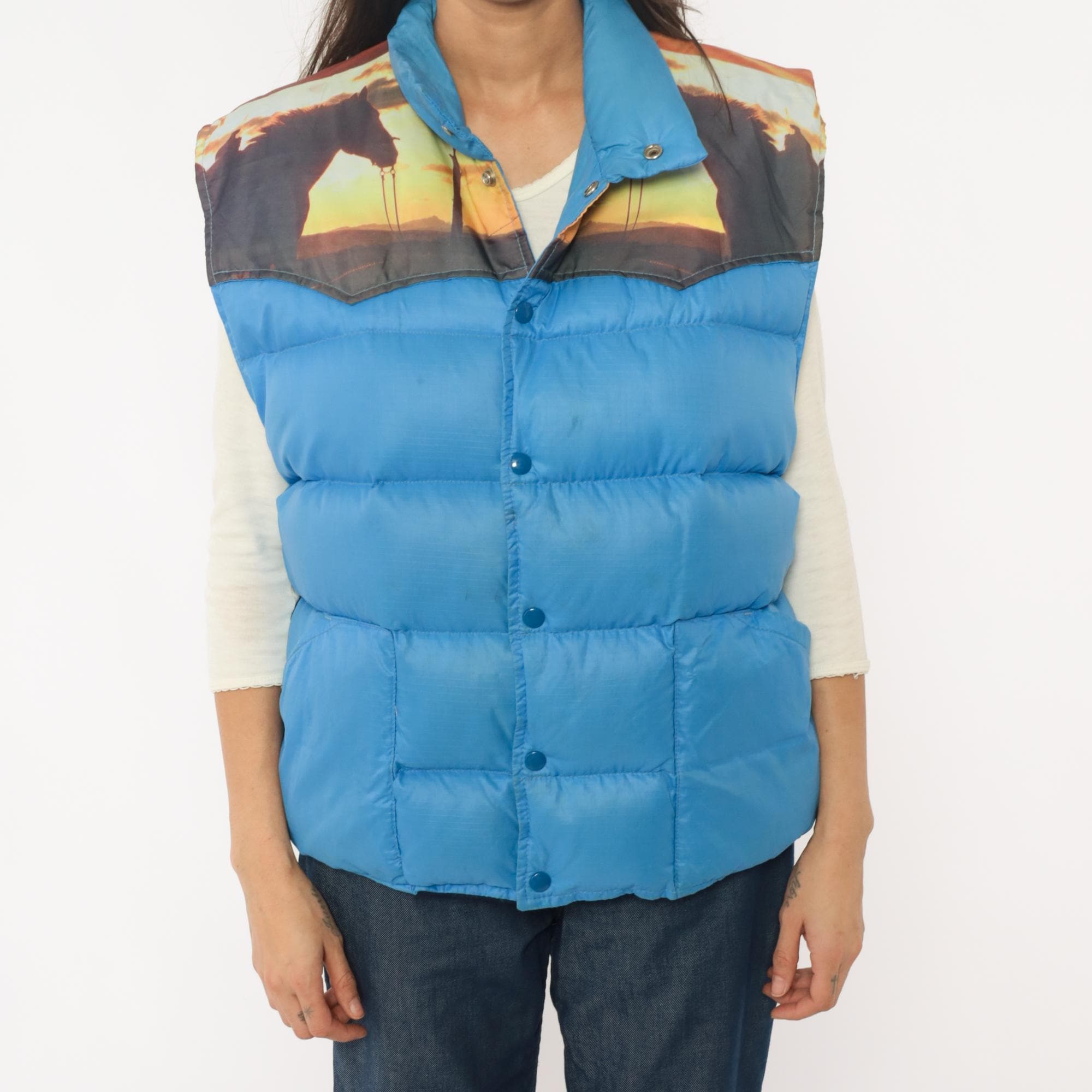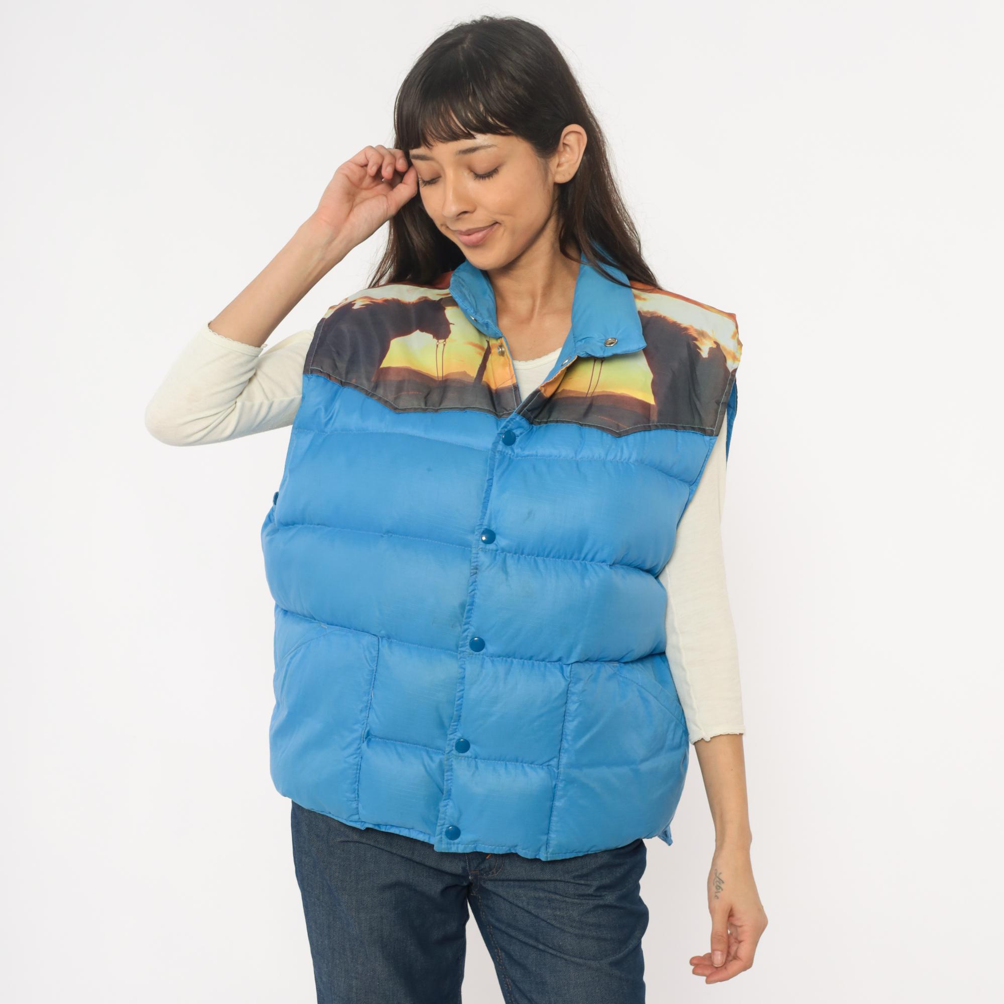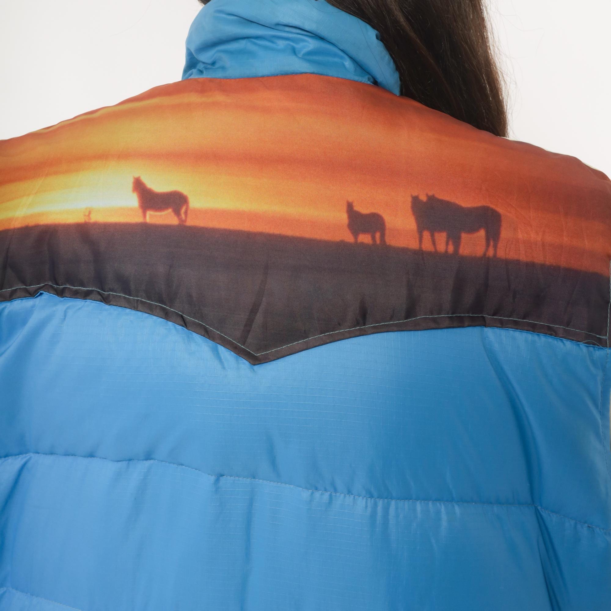 70s bright blue puffer vest with Horses in Western sunset scene across the yoke and shoulders showing silhouetted horses and cattle against orange, yellow, and brown gradient sky. Snap button front closure, stand collar, two front hand pockets, quilted down-filled body. Nylon shell with down fill.