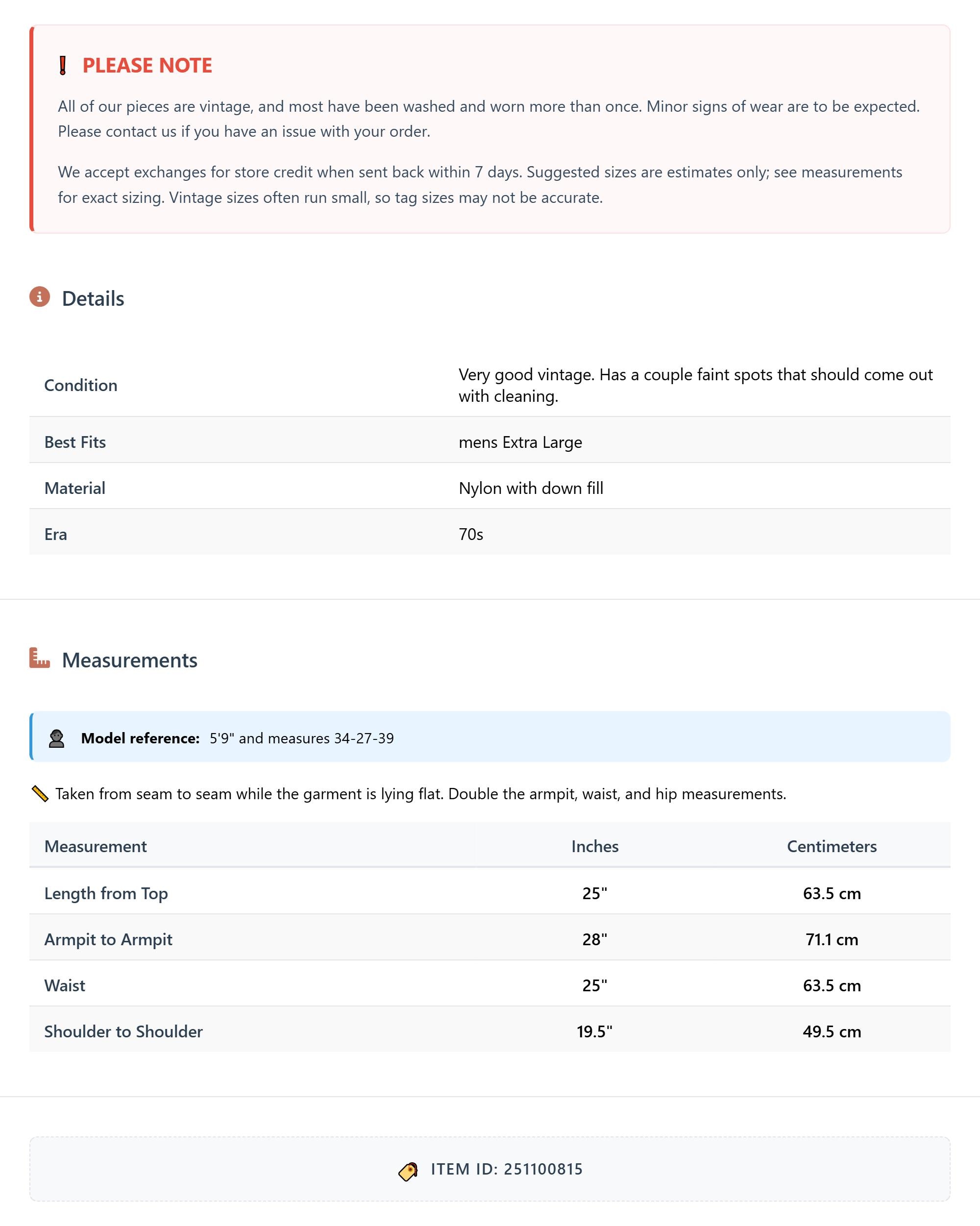 All of our pieces are vintage, and most have been washed and worn more than once. Minor signs of wear are to be expected. Please contact us if you have an issue with your order. We accept exchanges for store credit when sent back within 7 days.