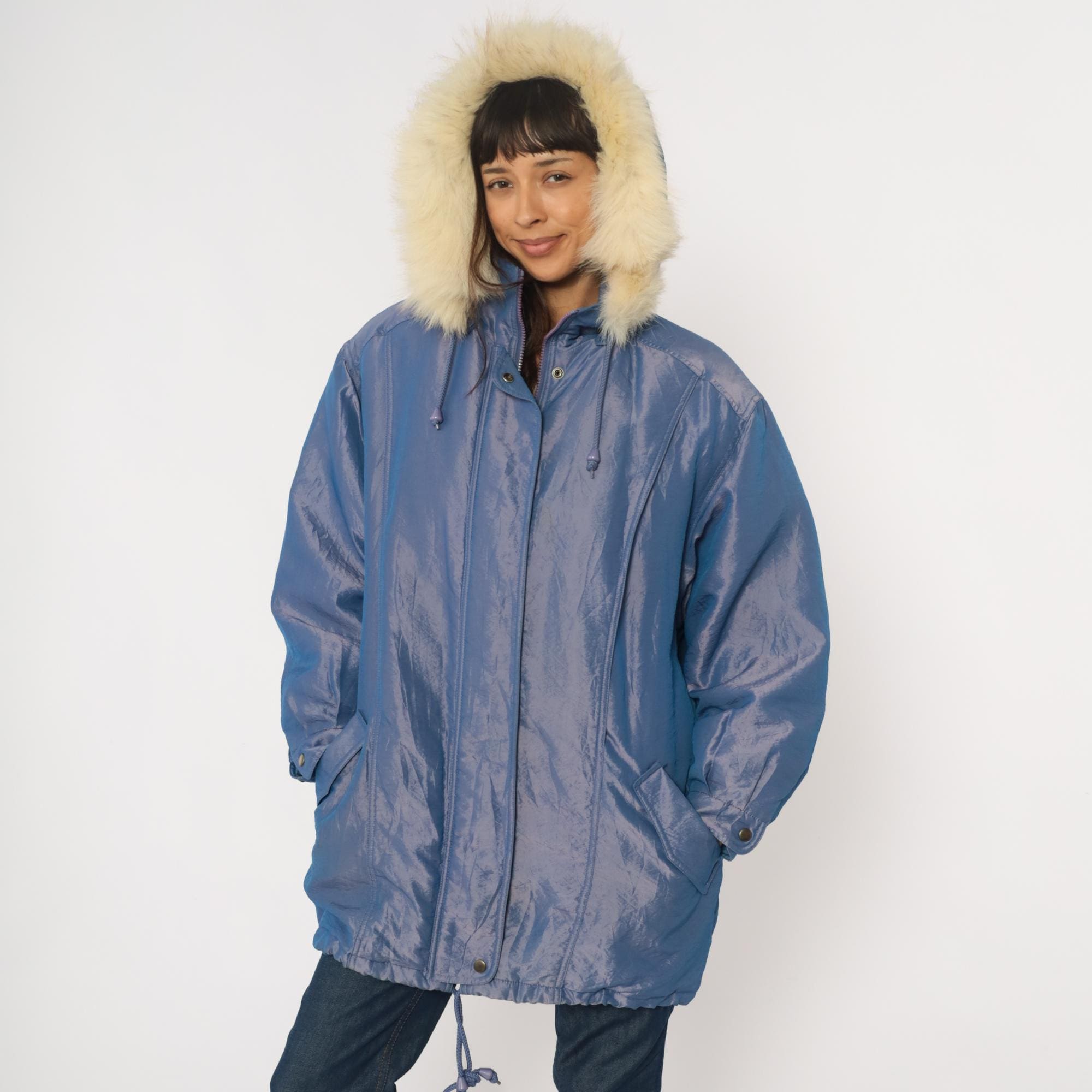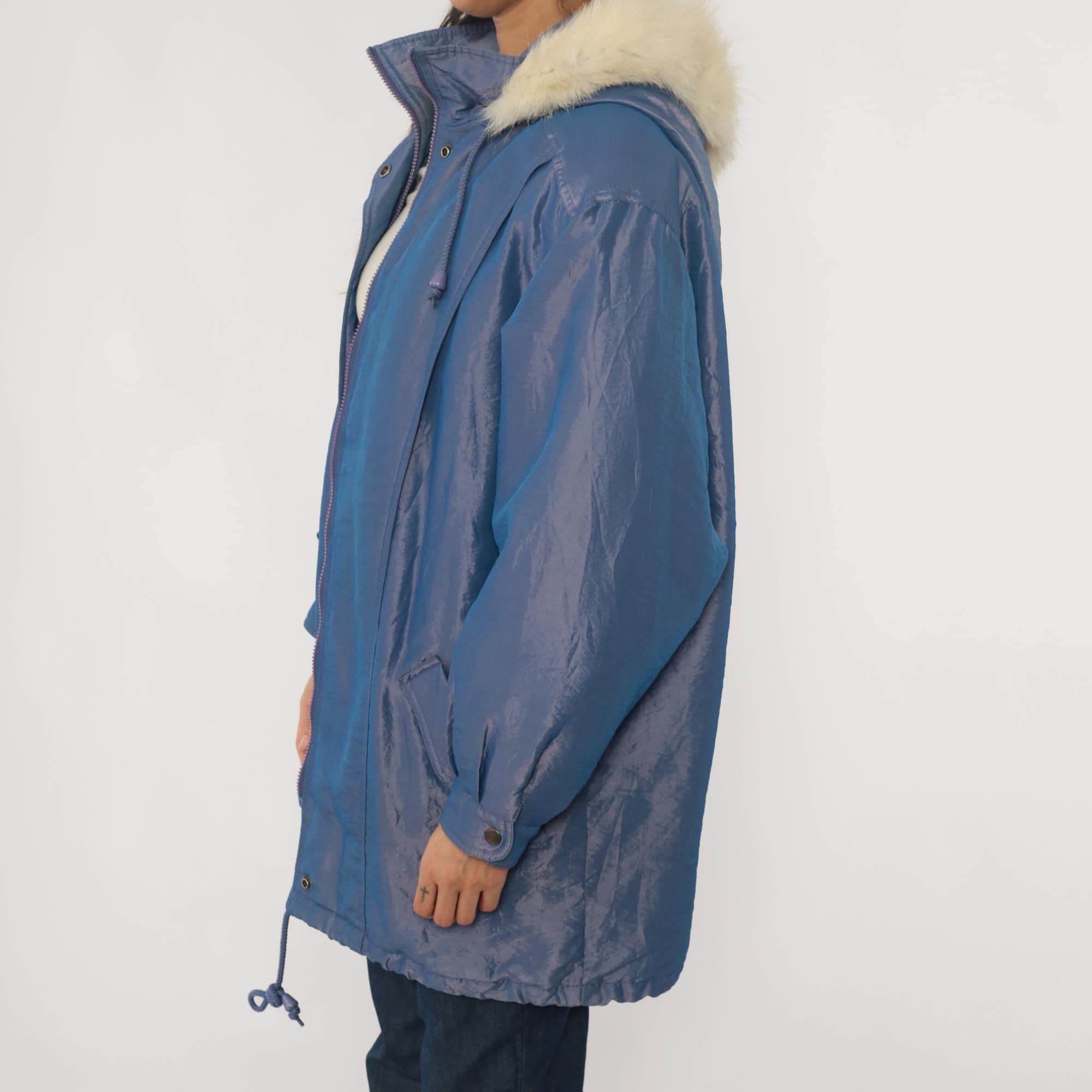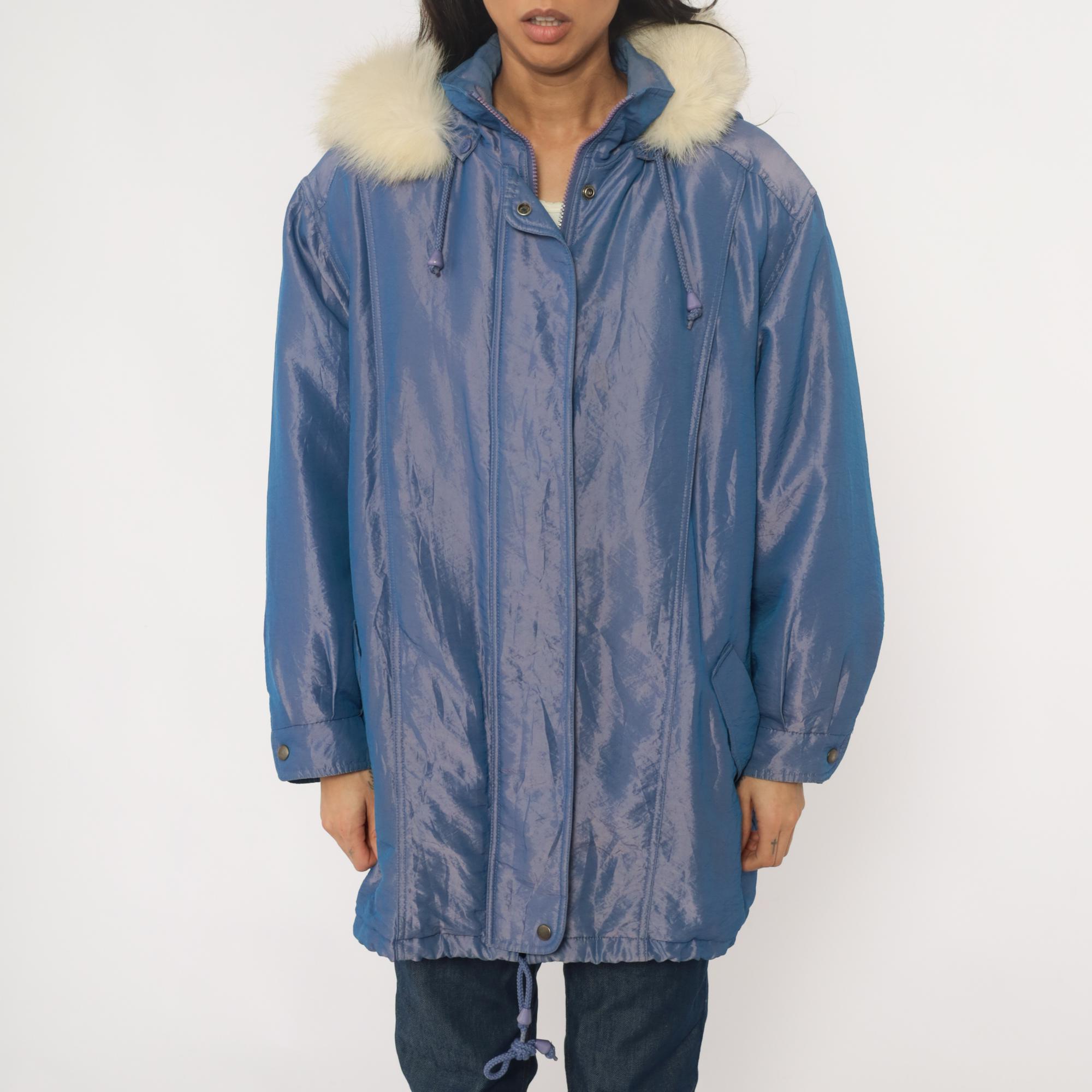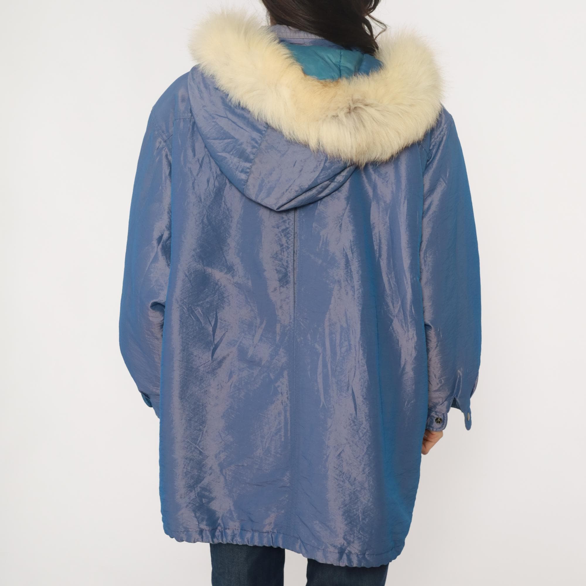 80s periwinkle blue iridescent parka with cream faux fur trim around the hood. Oversized silhouette with front zip closure, snap button placket, two front pockets, and adjustable drawstring at waist and hem. Nylon polyester with fox fur trim. Labelled 16 fits womens Large.