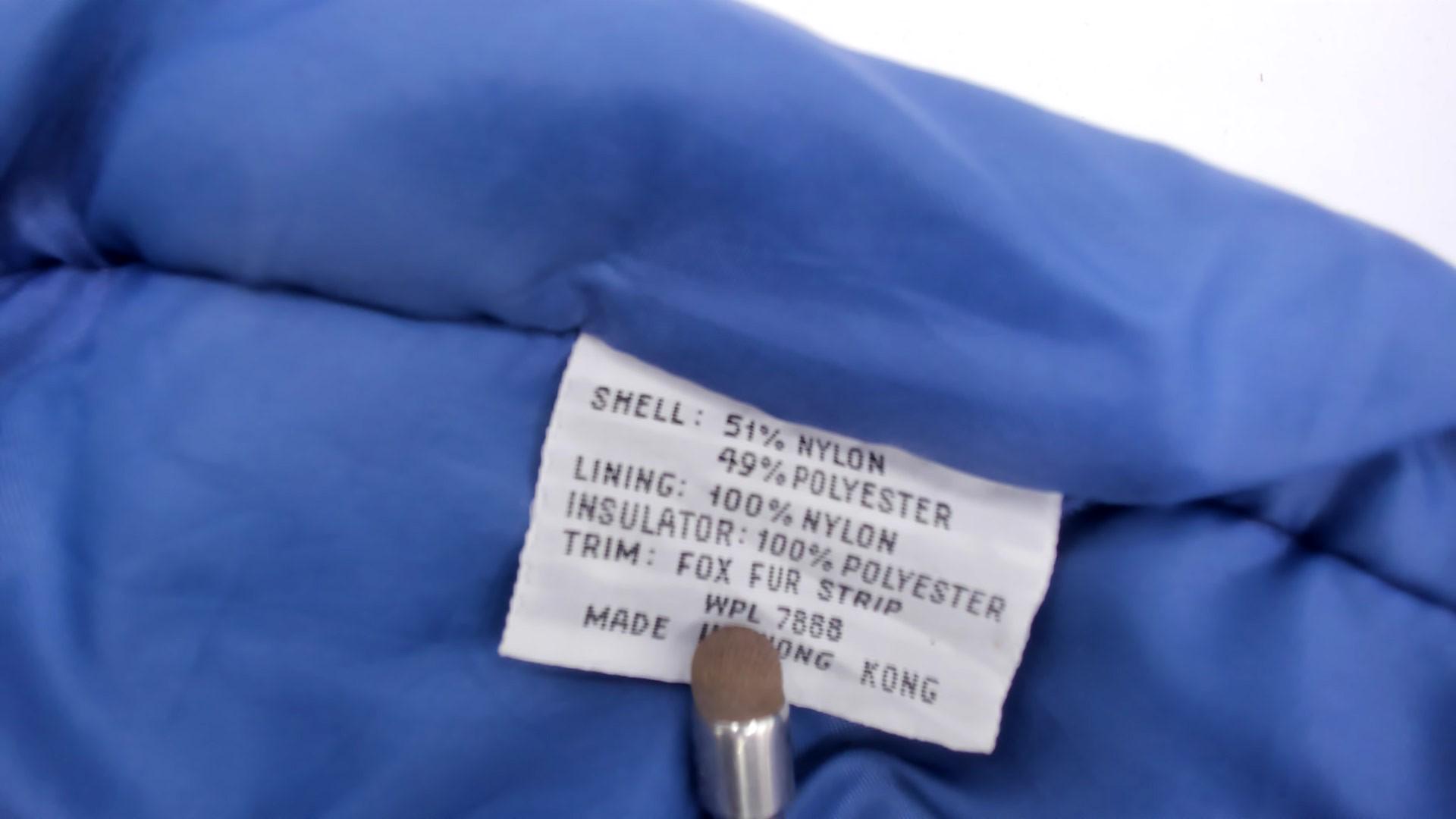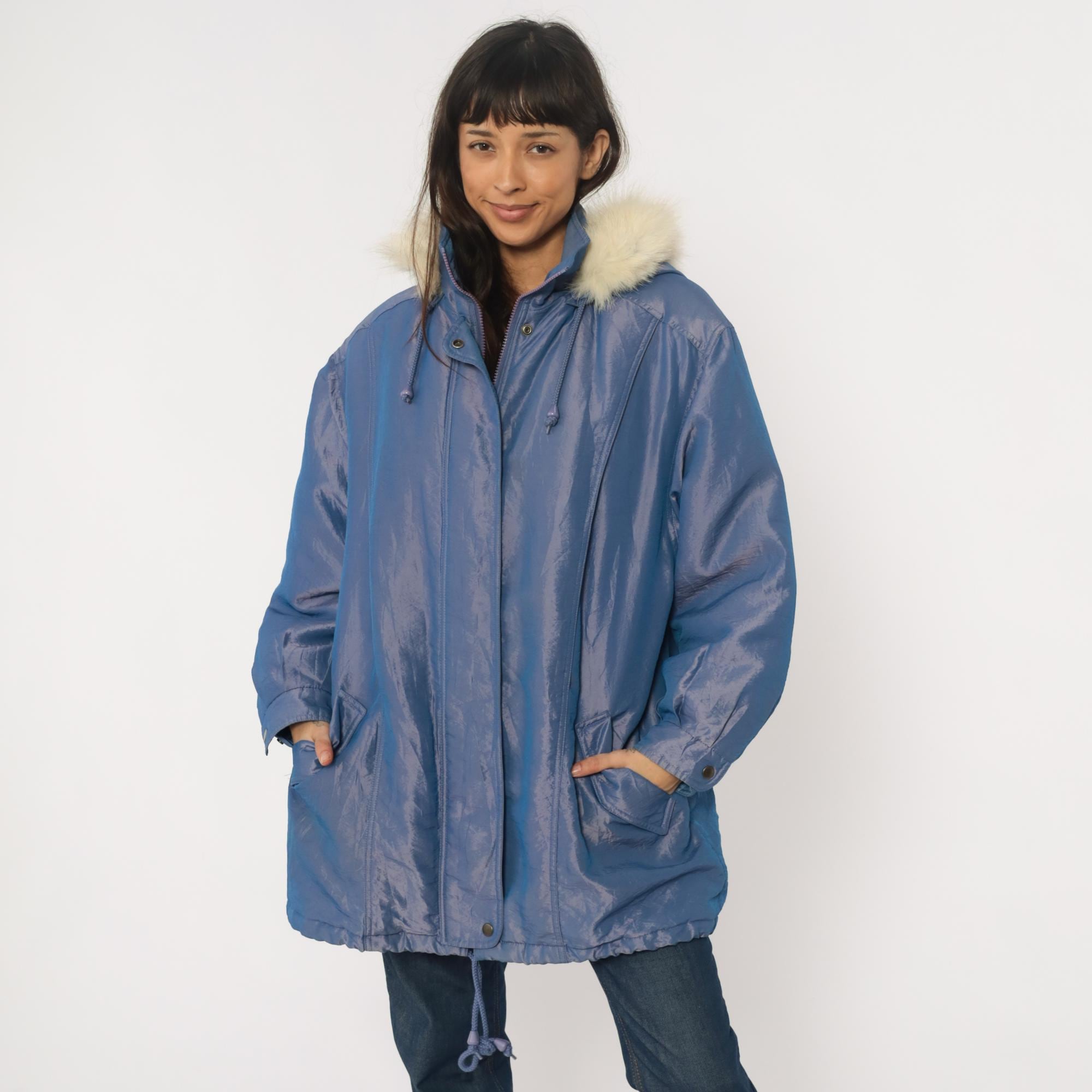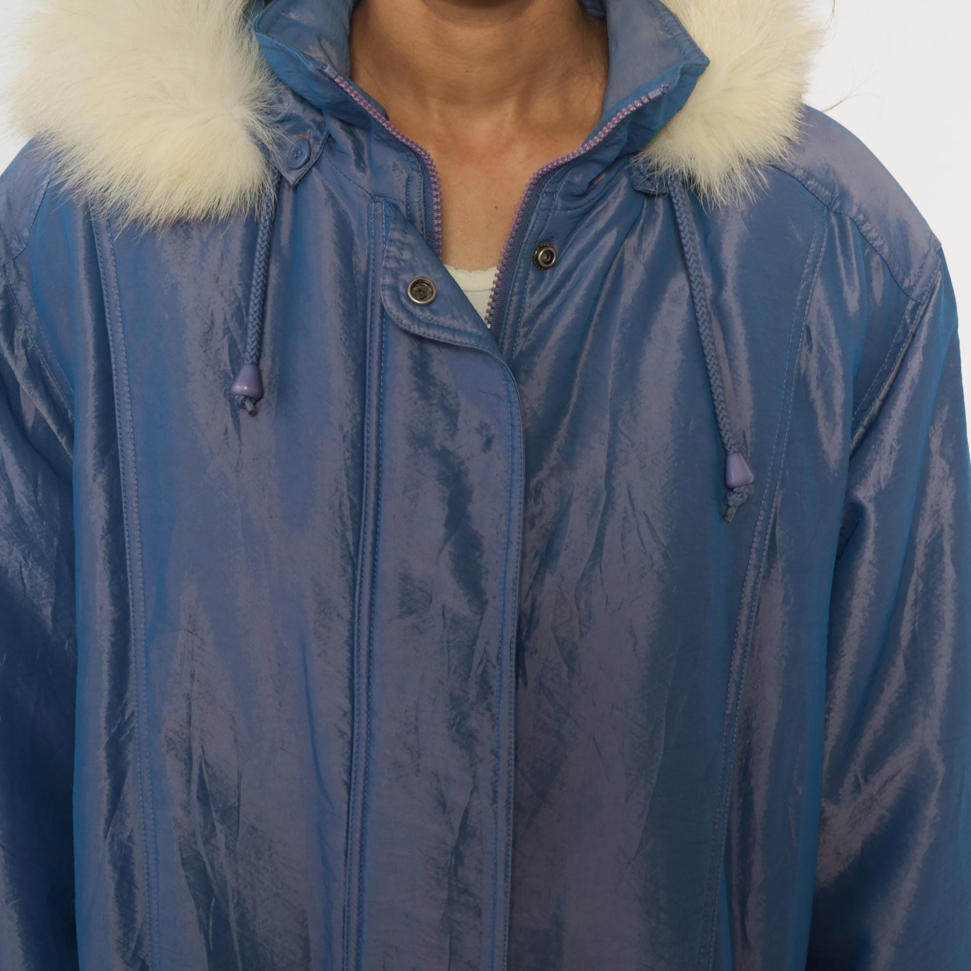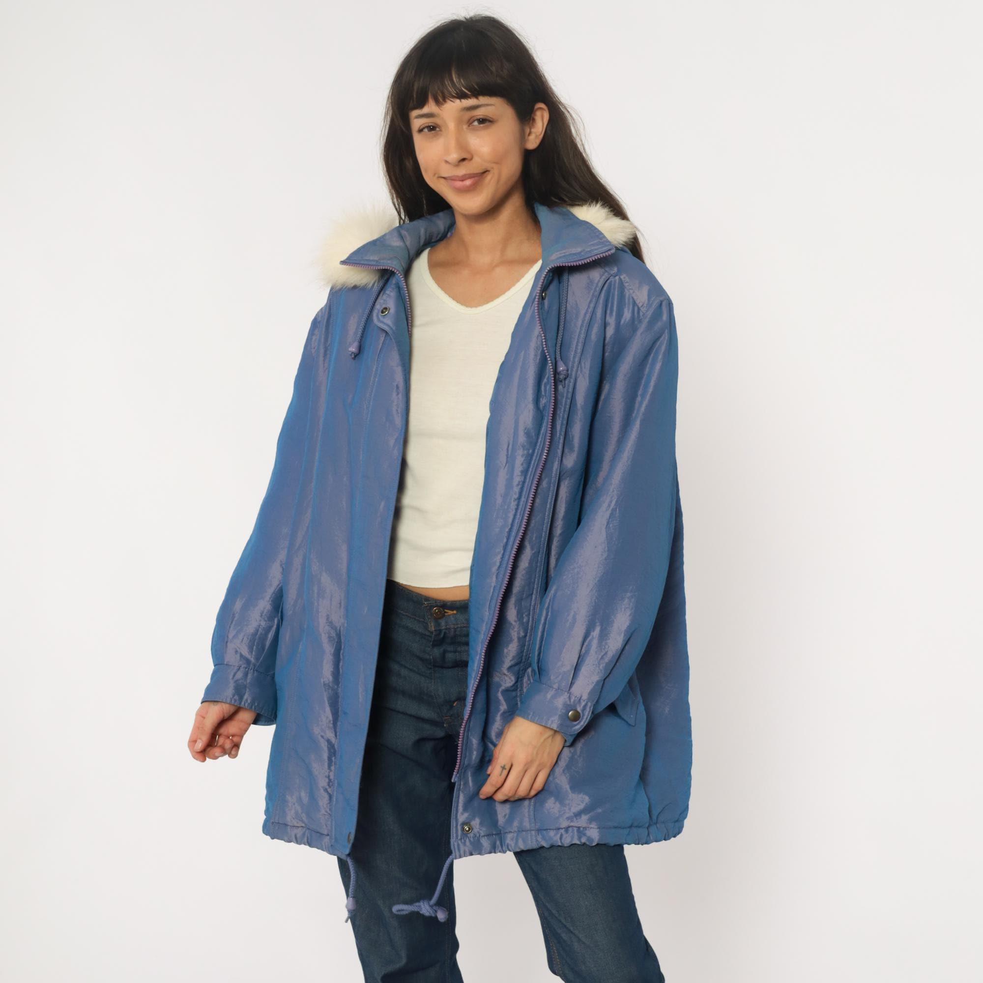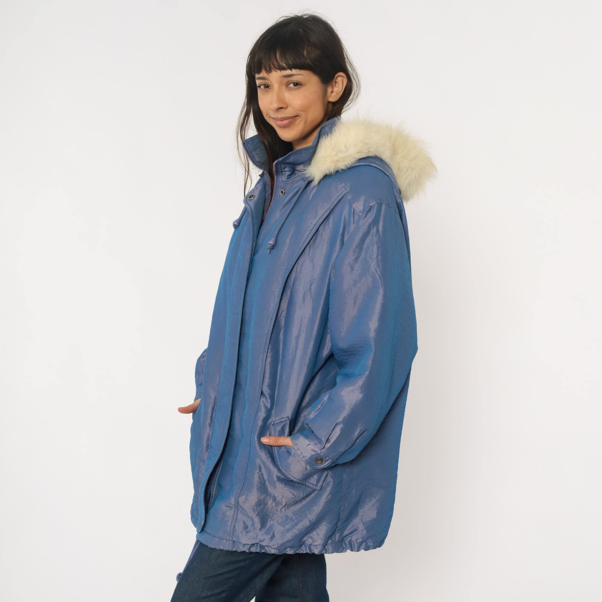 80s periwinkle blue iridescent parka with cream faux fur trim around the hood. Oversized silhouette with front zip closure, snap button placket, two front pockets, and adjustable drawstring at waist and hem. Nylon polyester with fox fur trim. Labelled 16 fits womens Large.