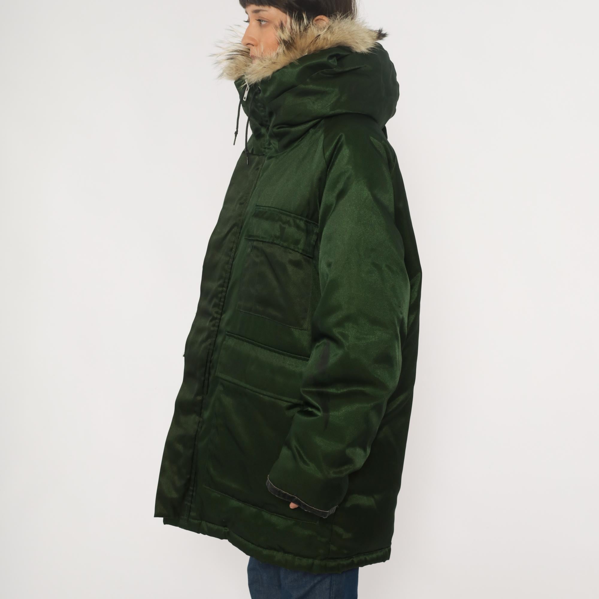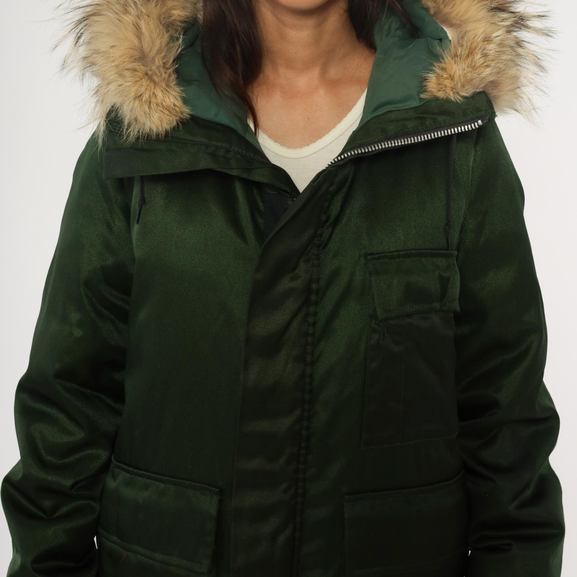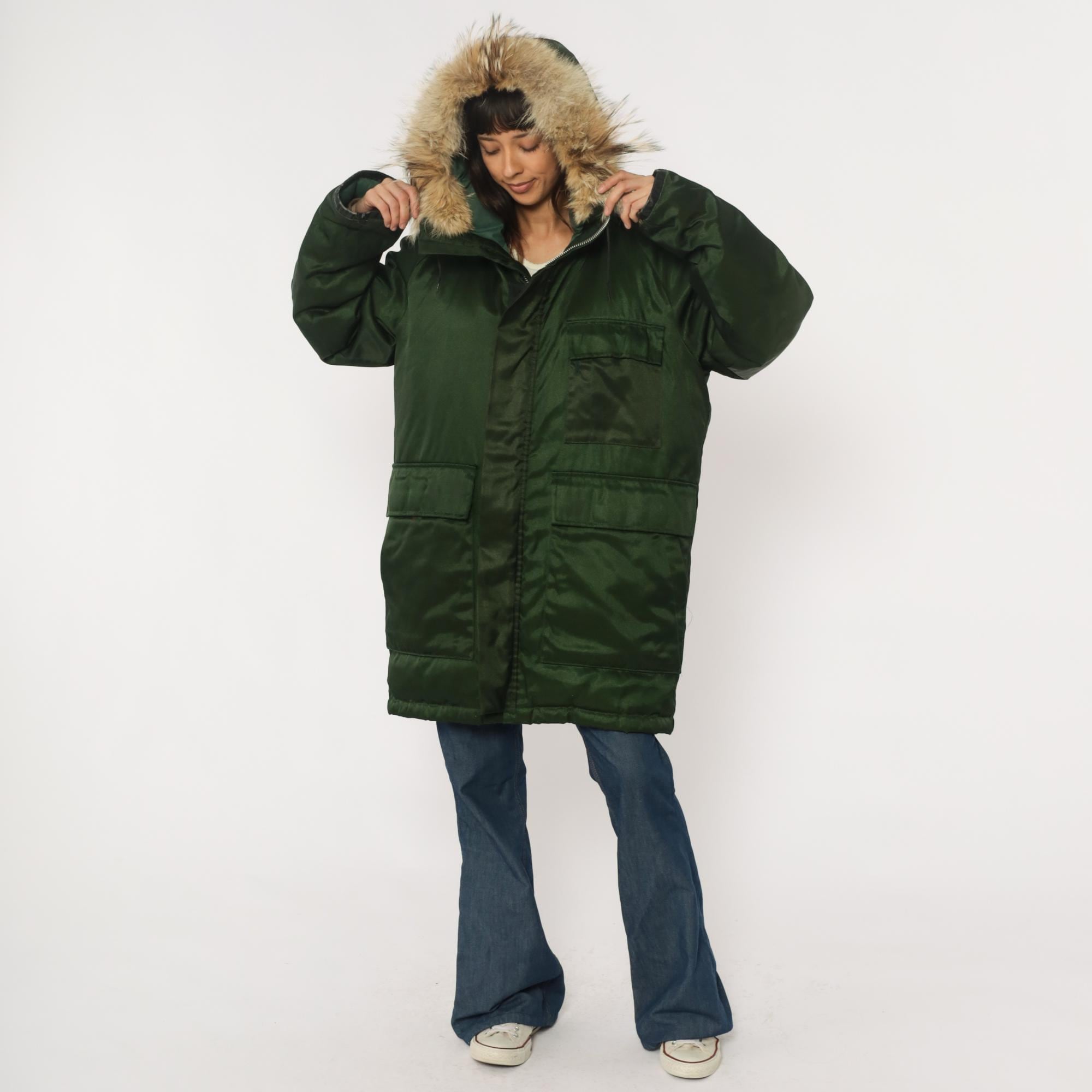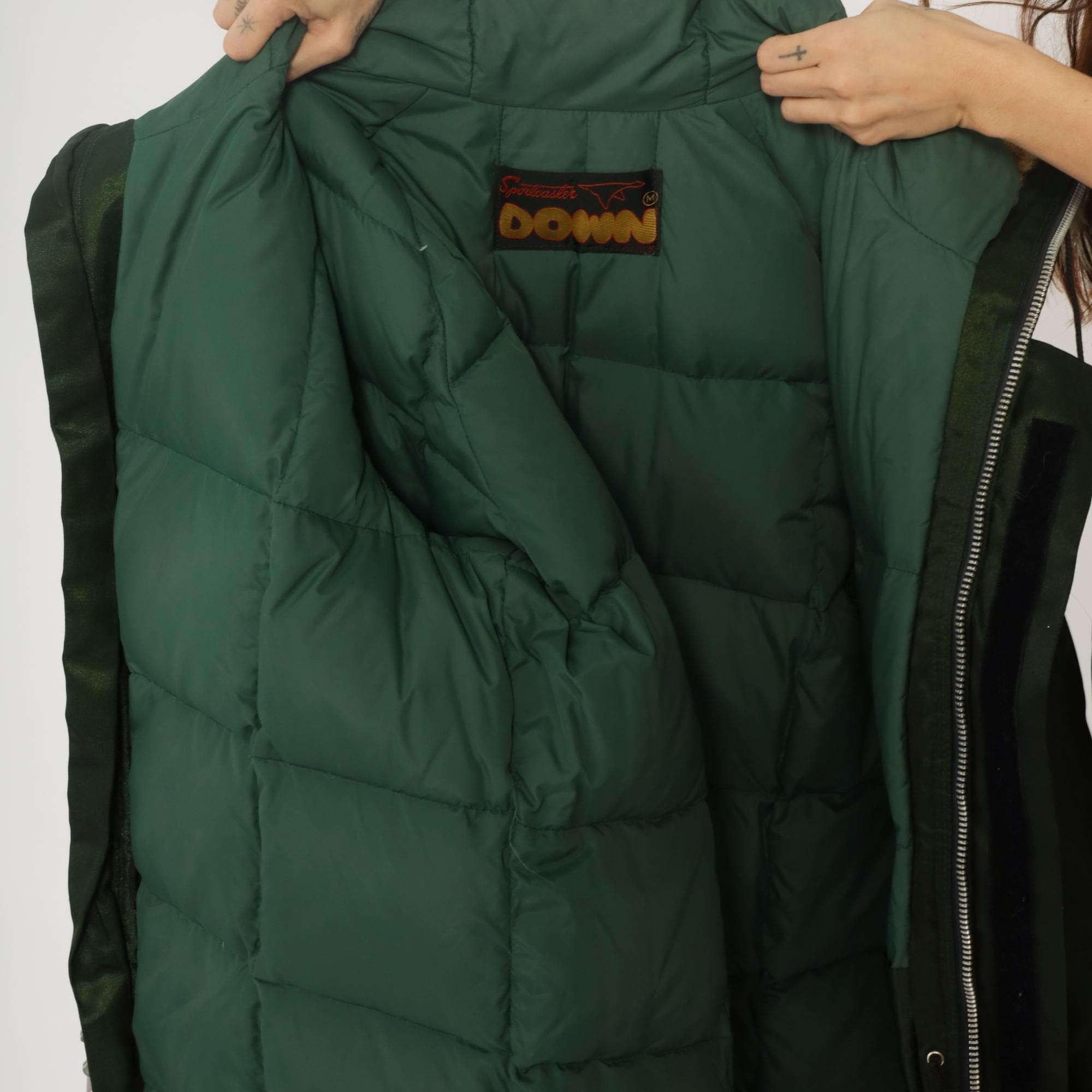 70s forest green parka from Sportscaster Down with removable fur-trimmed hood and front zipper closure. Four patch pockets on front, long sleeves, knee length. Nylon outer shell with down fill. Tagged size Medium.