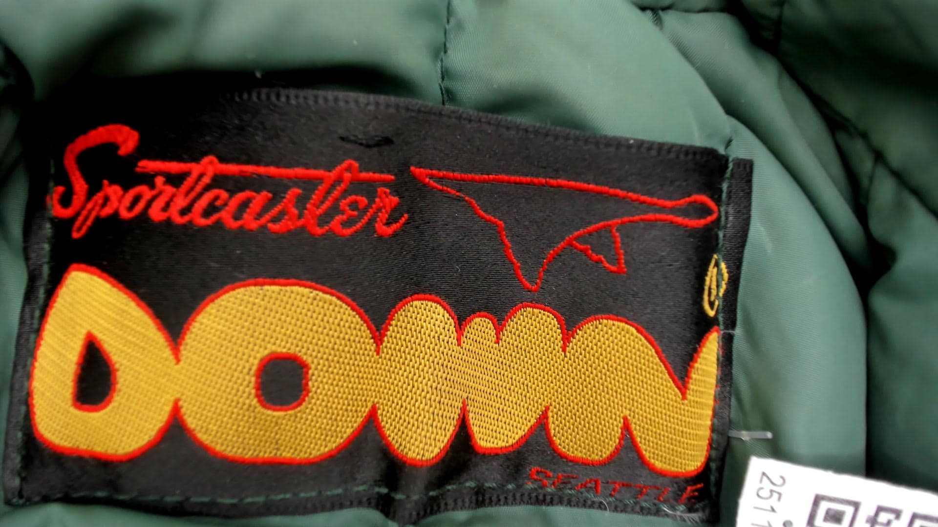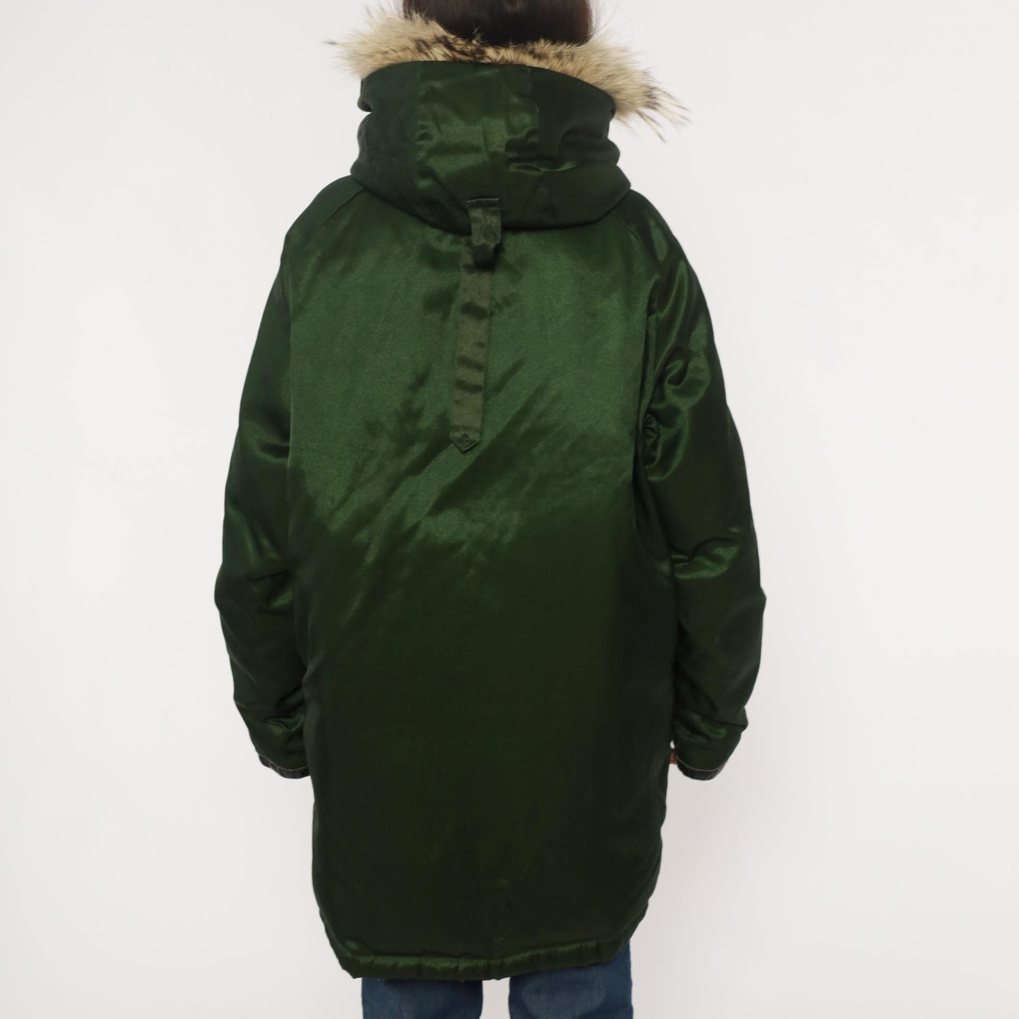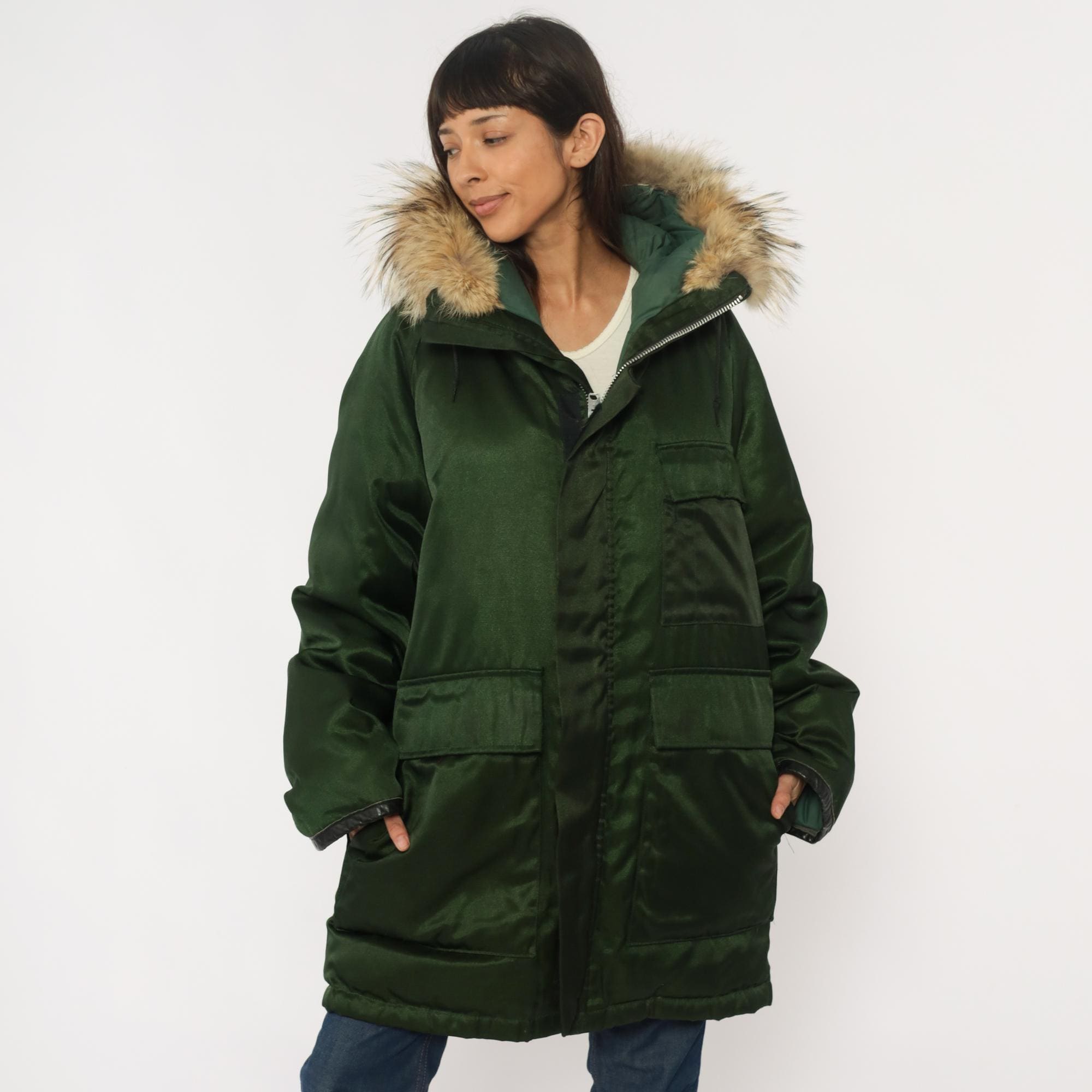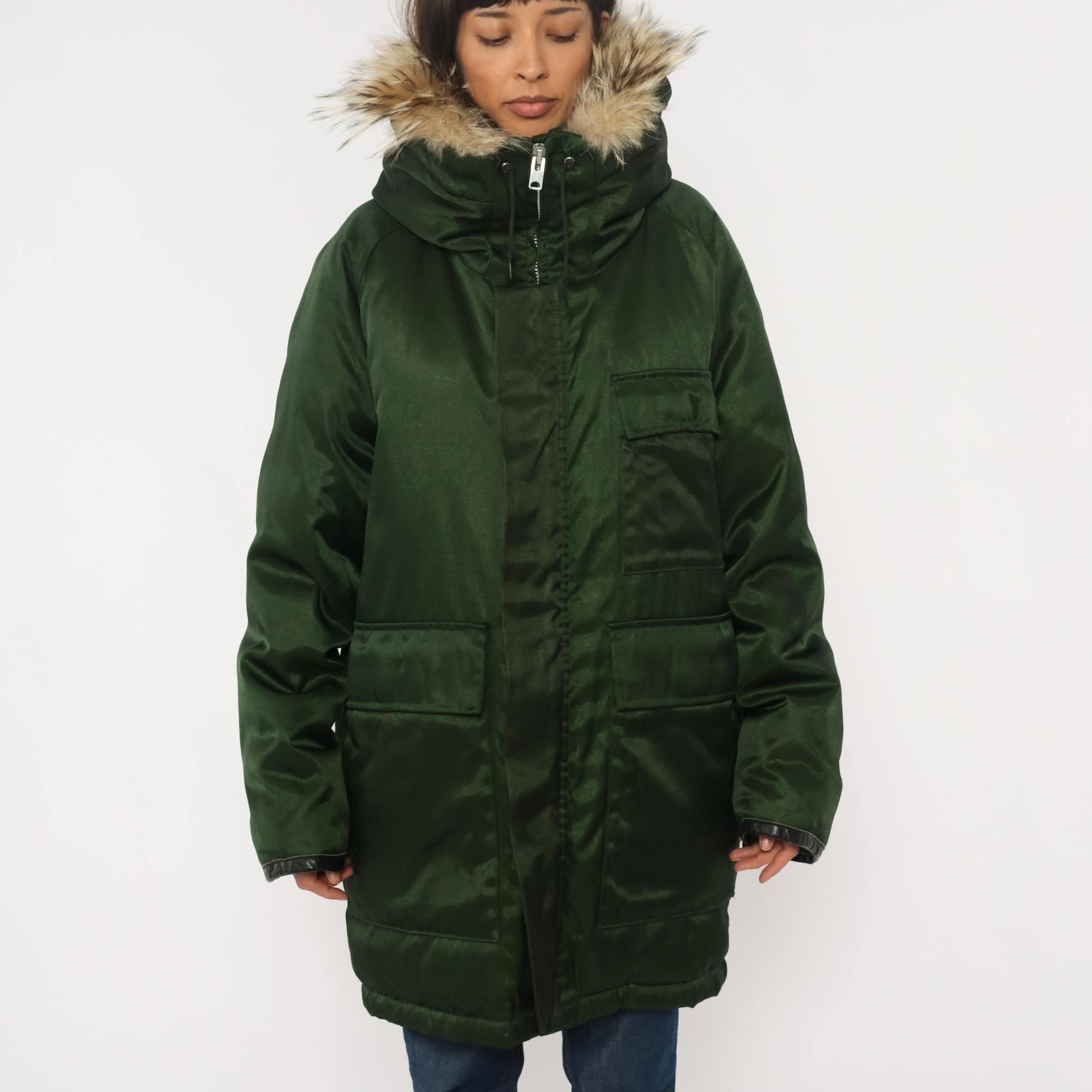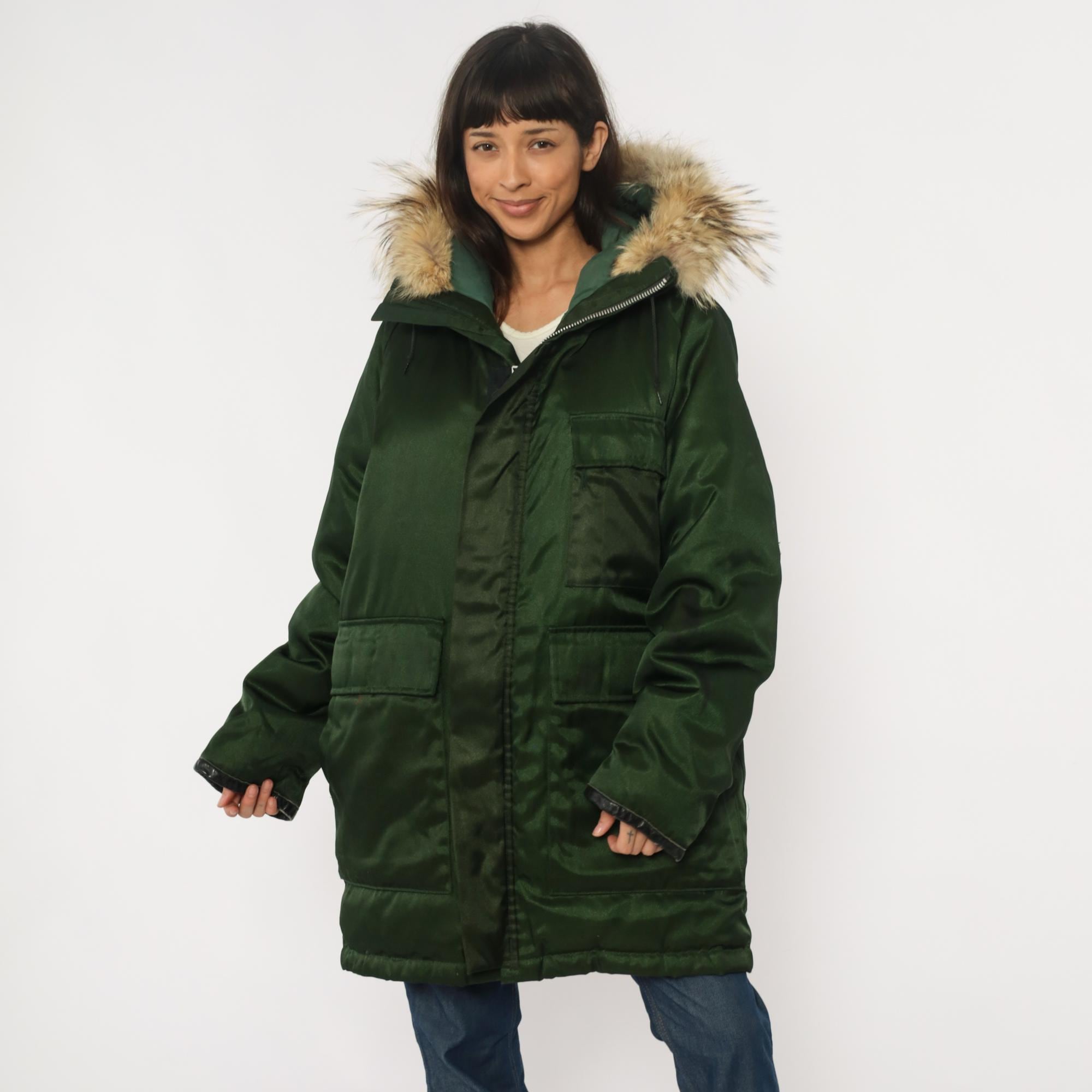 70s forest green parka from Sportscaster Down with removable fur-trimmed hood and front zipper closure. Four patch pockets on front, long sleeves, knee length. Nylon outer shell with down fill. Tagged size Medium.