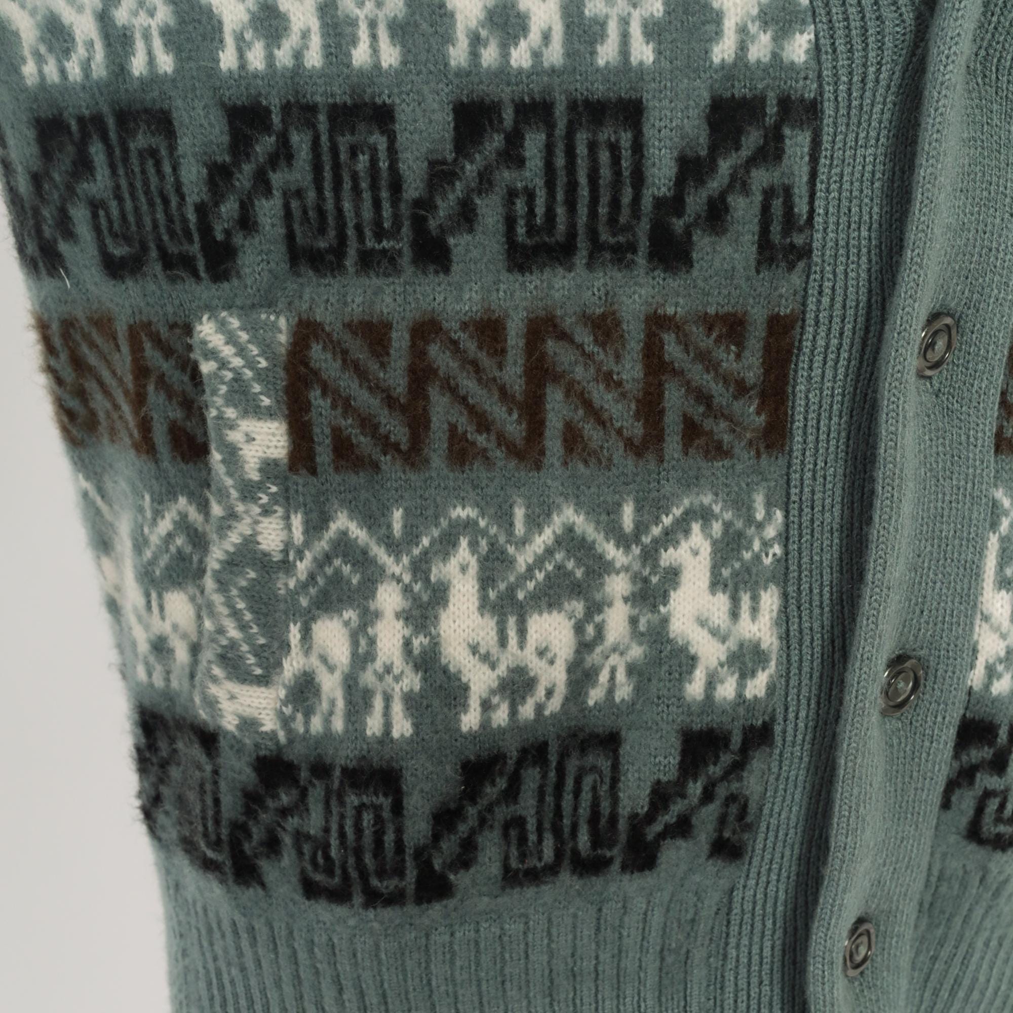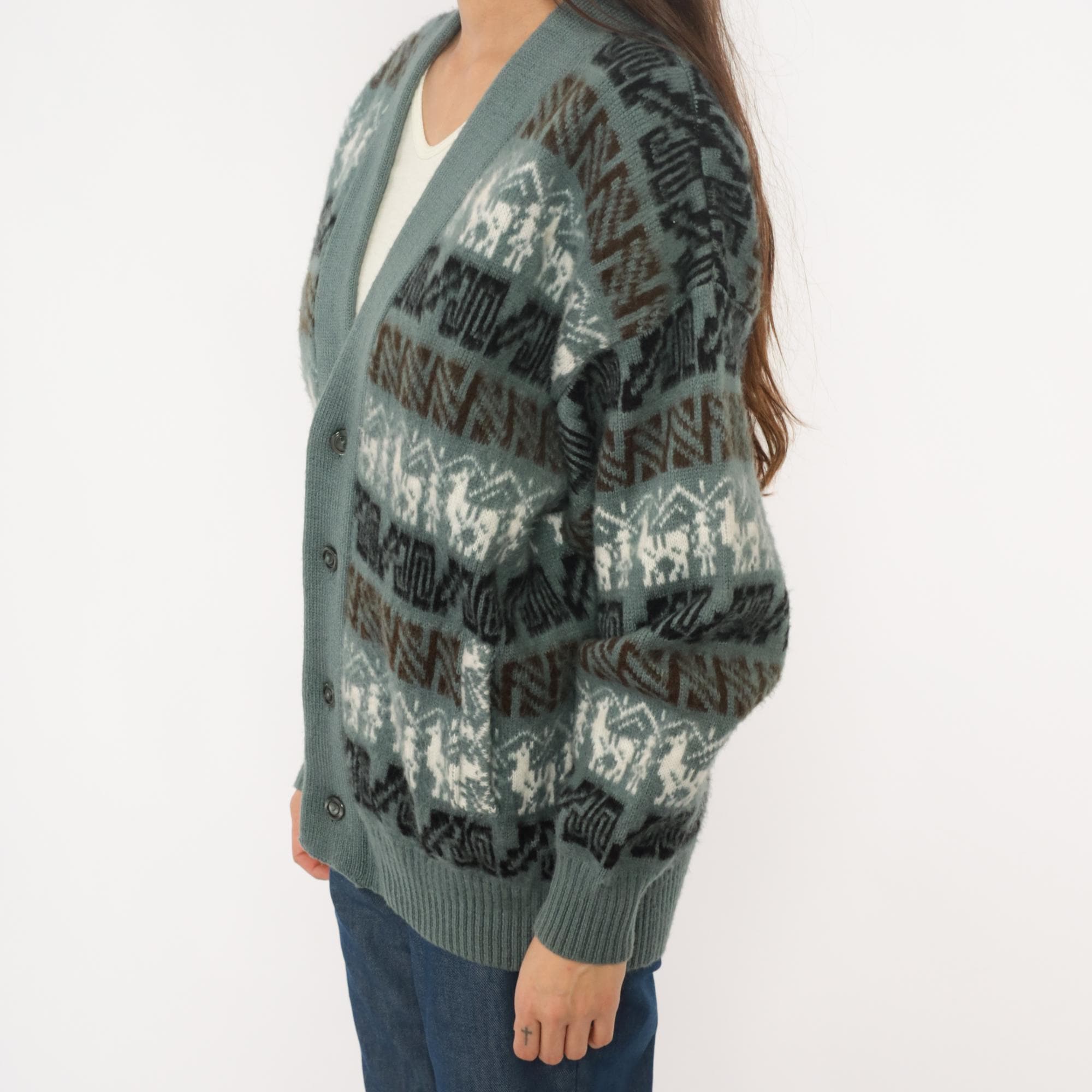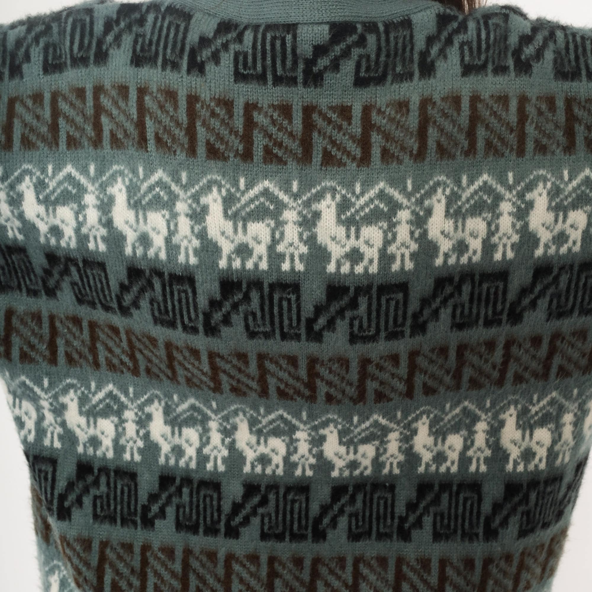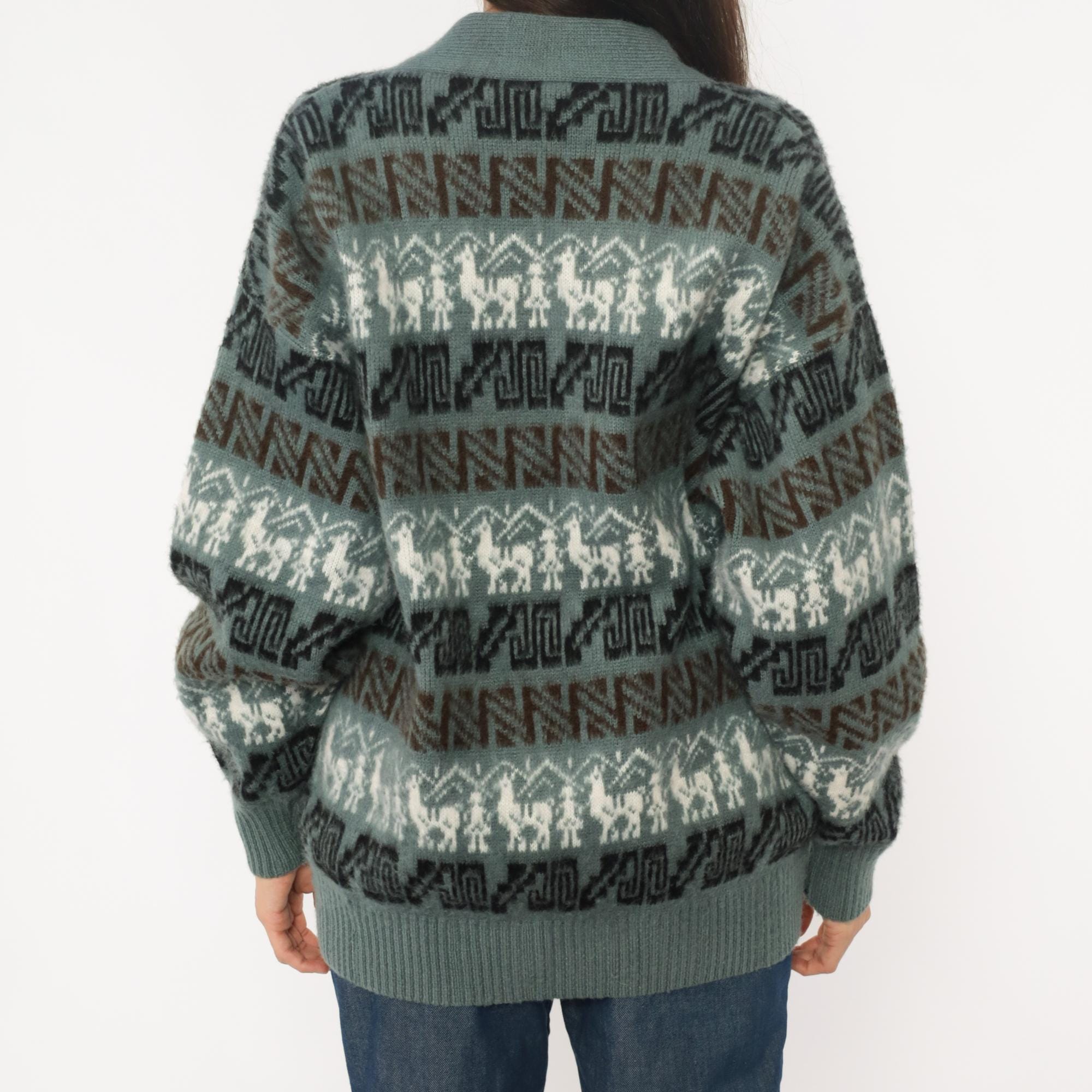 90s oversized cardigan from tejidos ruminahui in sage green with horizontal bands of llamas and alpacas in cream alternating with geometric zigzag and stepped patterns in black and brown. Jacquard knit construction throughout, button front closure, shawl collar, ribbed cuffs and hem. Wool.