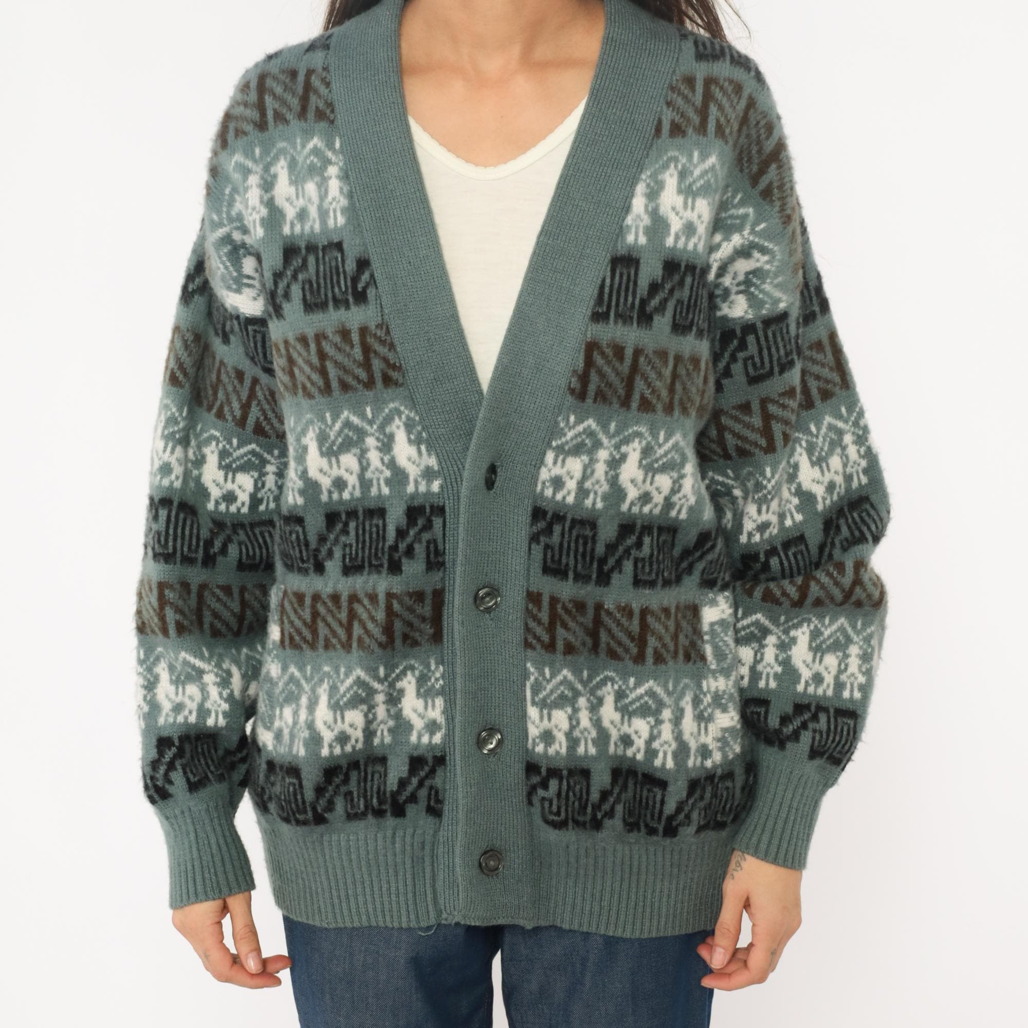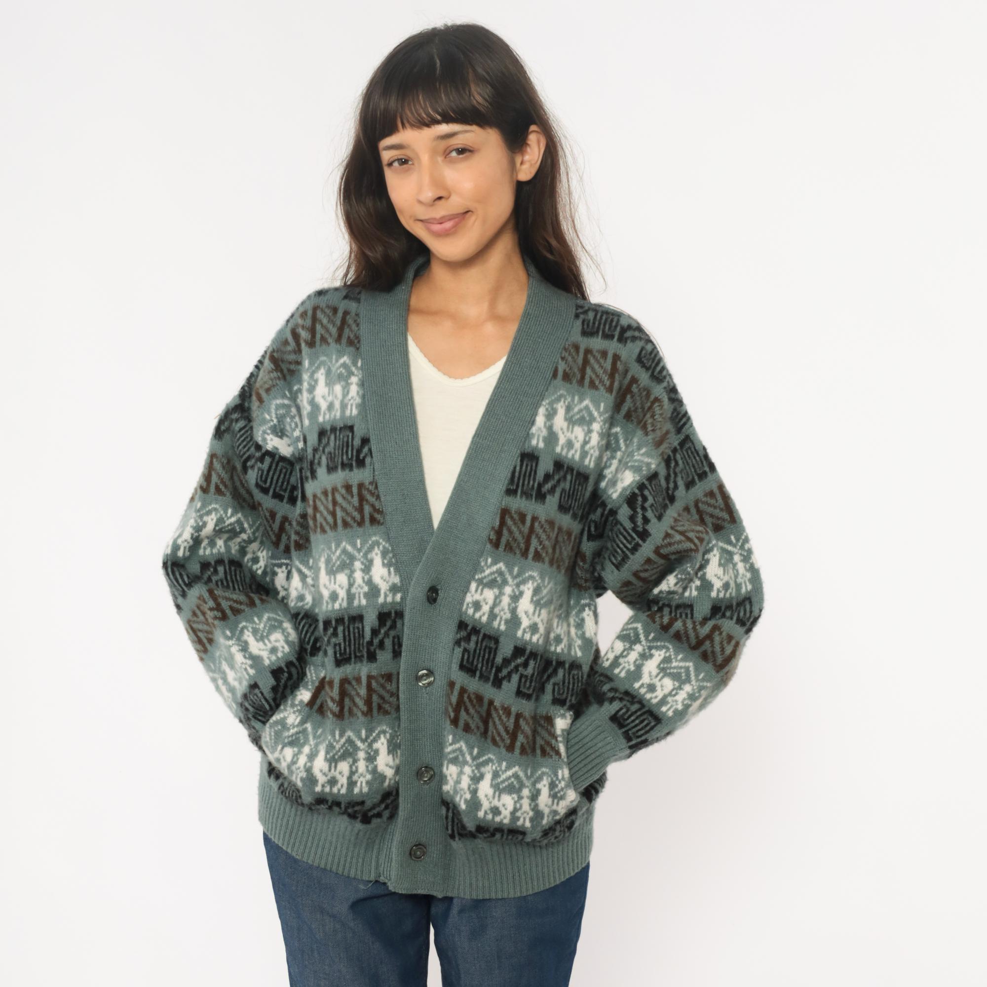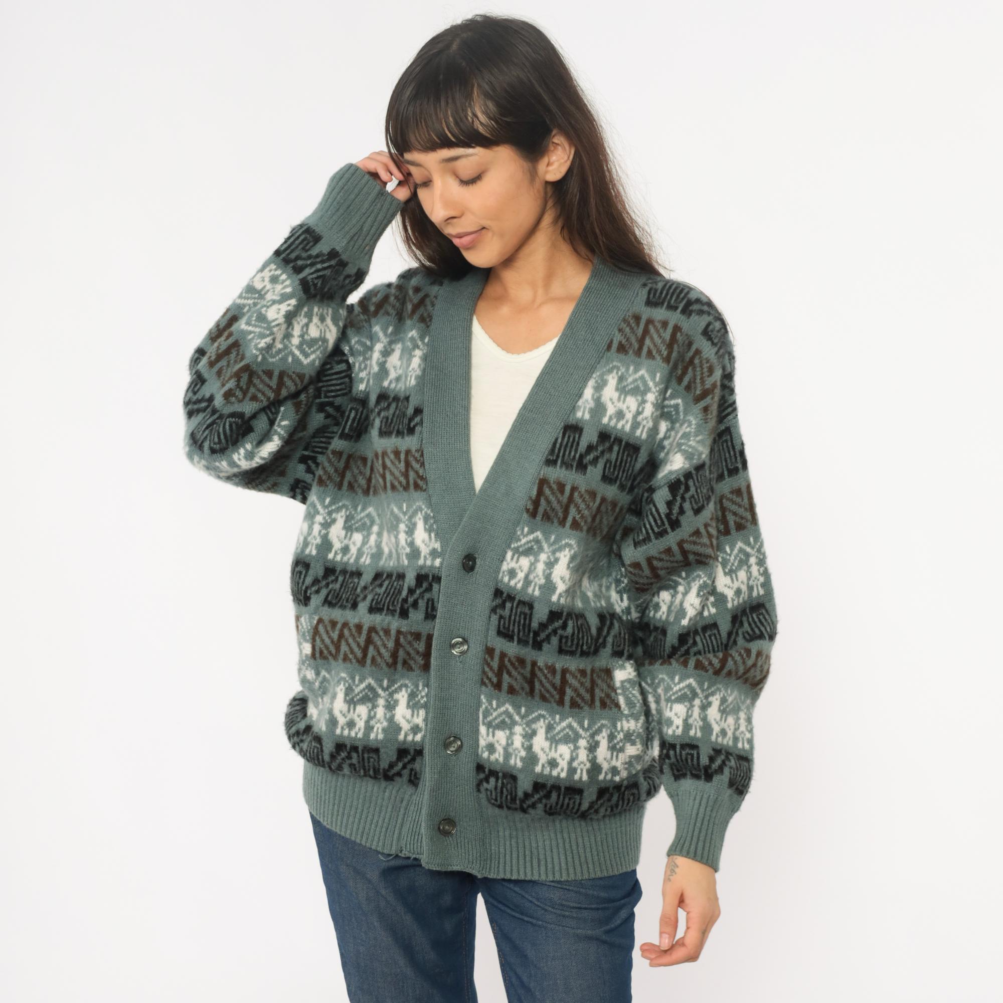 90s oversized cardigan from tejidos ruminahui in sage green with horizontal bands of llamas and alpacas in cream alternating with geometric zigzag and stepped patterns in black and brown. Jacquard knit construction throughout, button front closure, shawl collar, ribbed cuffs and hem. Wool.