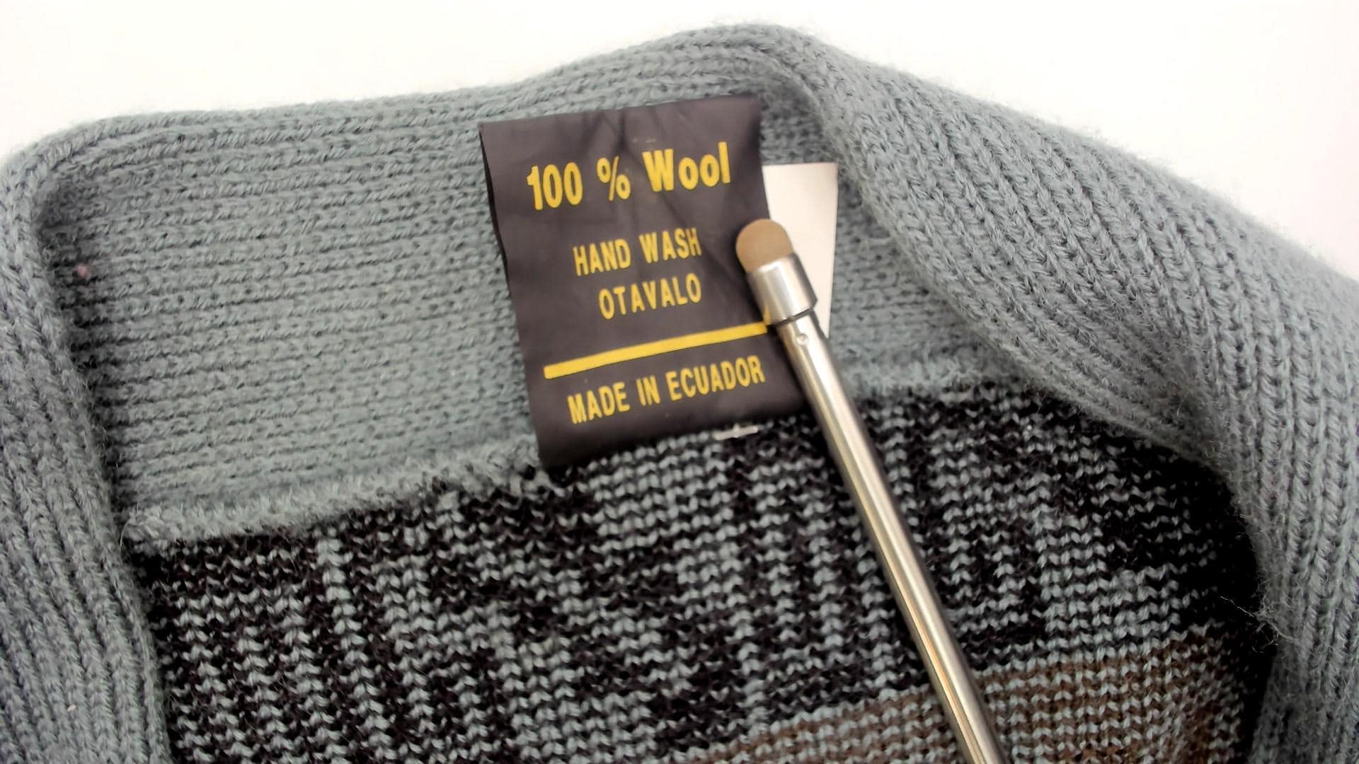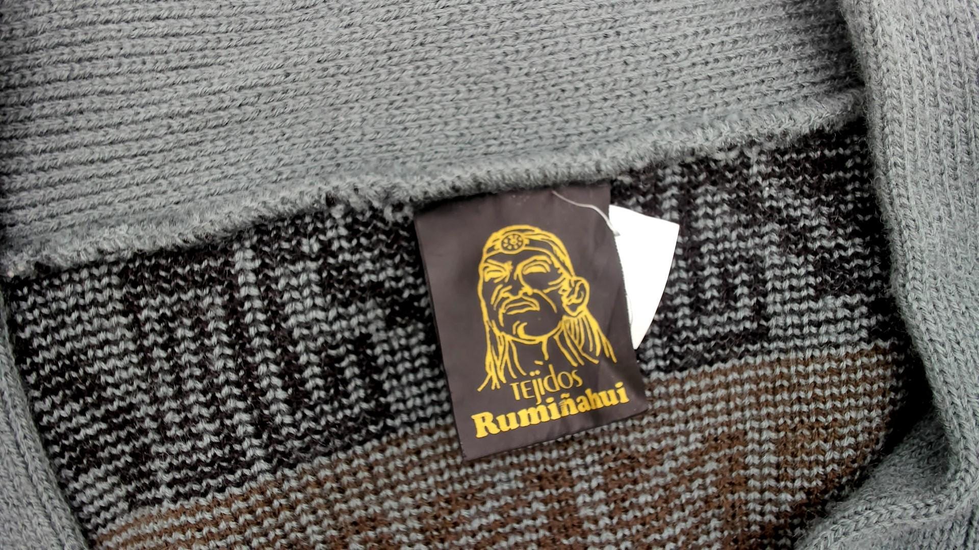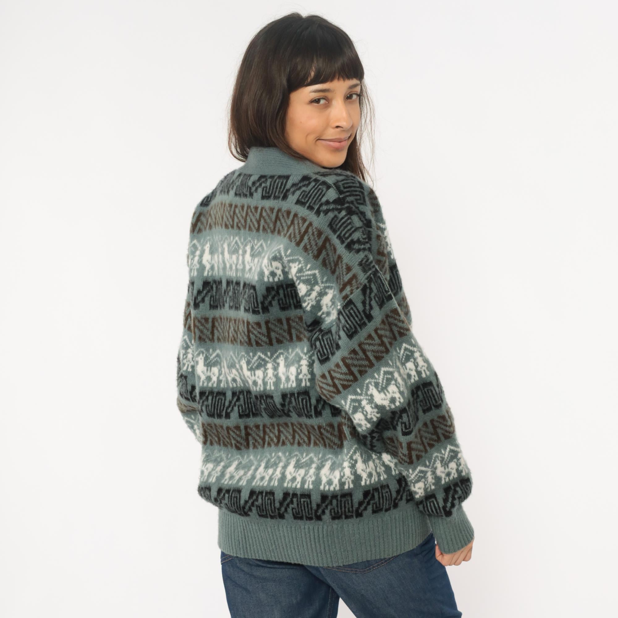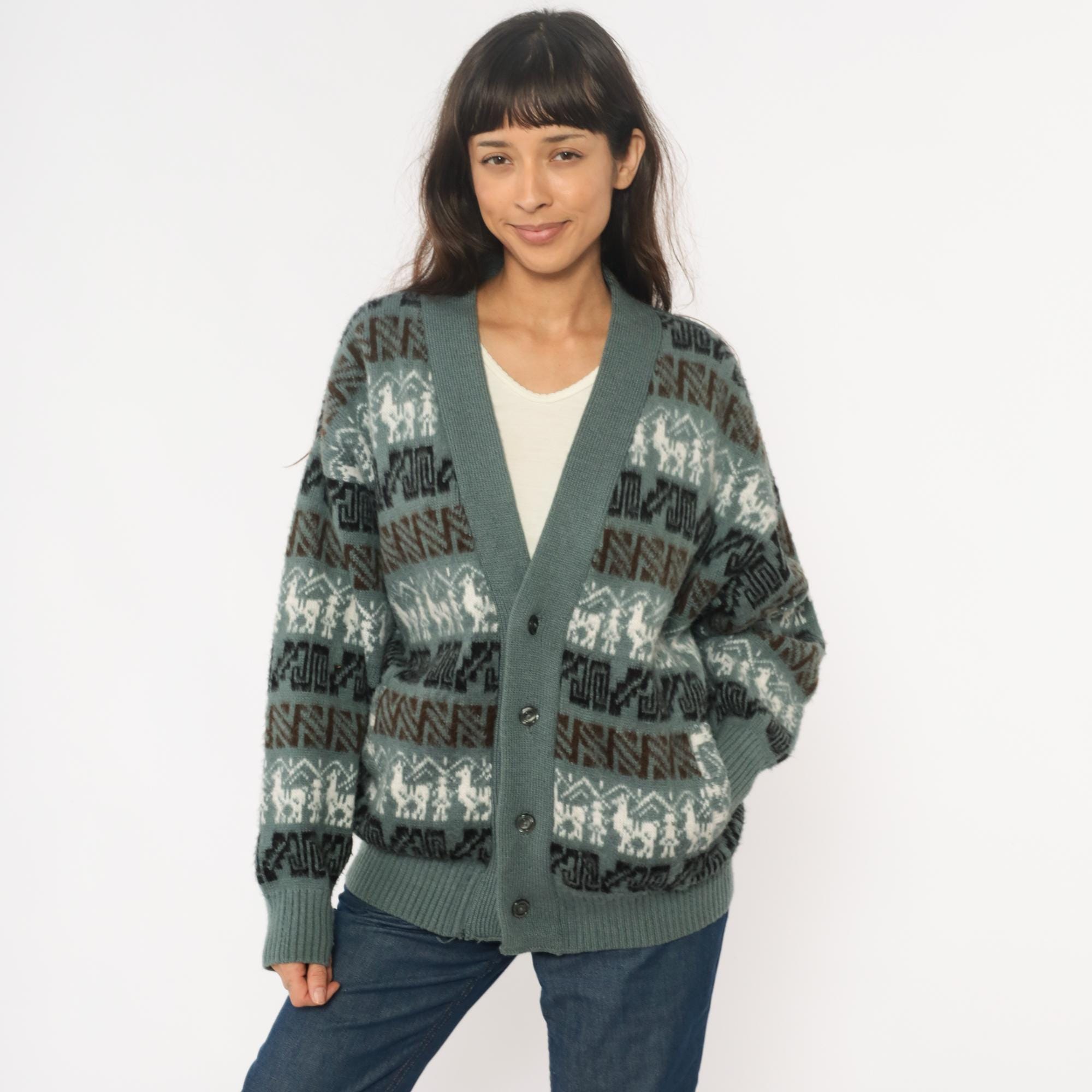 90s oversized cardigan from tejidos ruminahui in sage green with horizontal bands of llamas and alpacas in cream alternating with geometric zigzag and stepped patterns in black and brown. Jacquard knit construction throughout, button front closure, shawl collar, ribbed cuffs and hem. Wool.