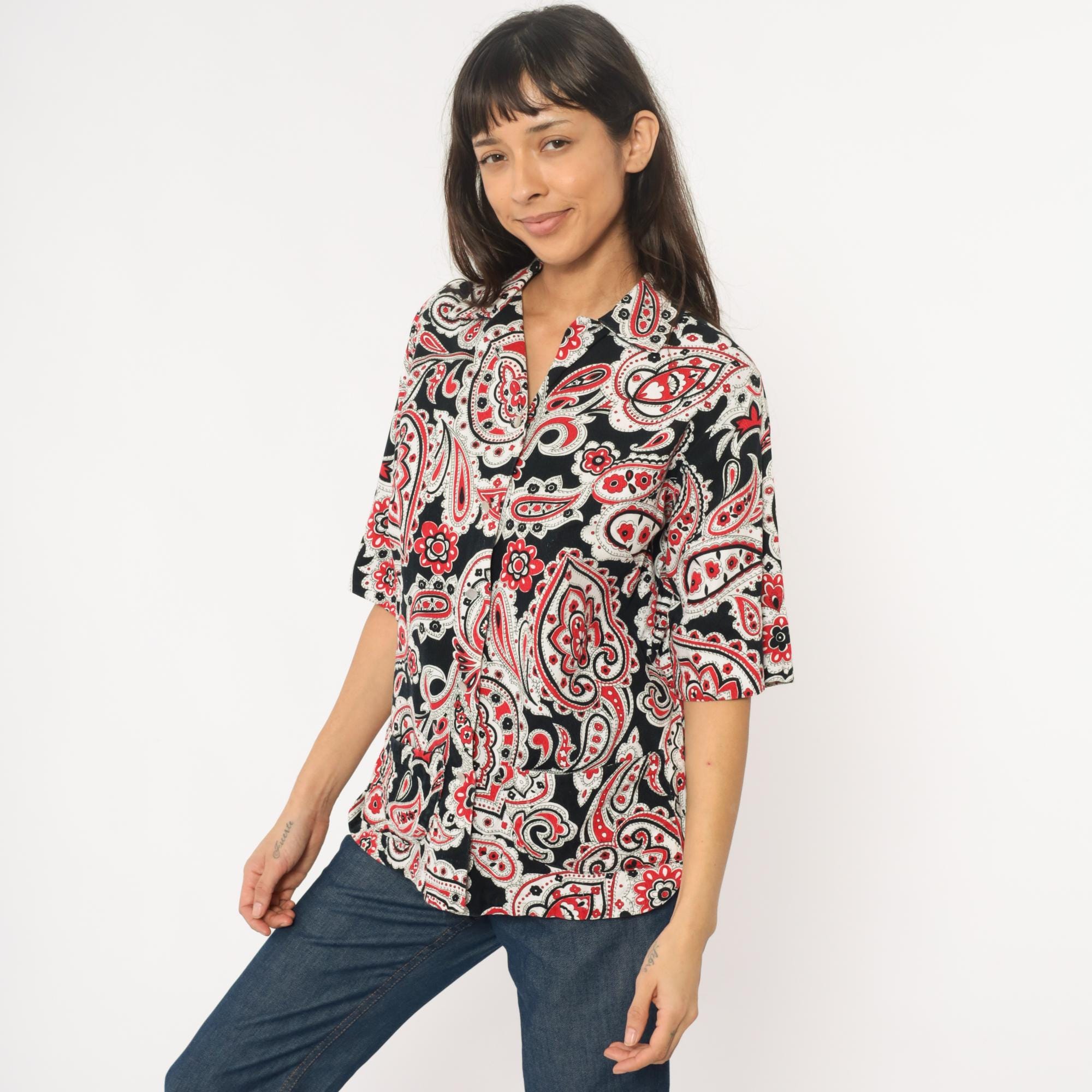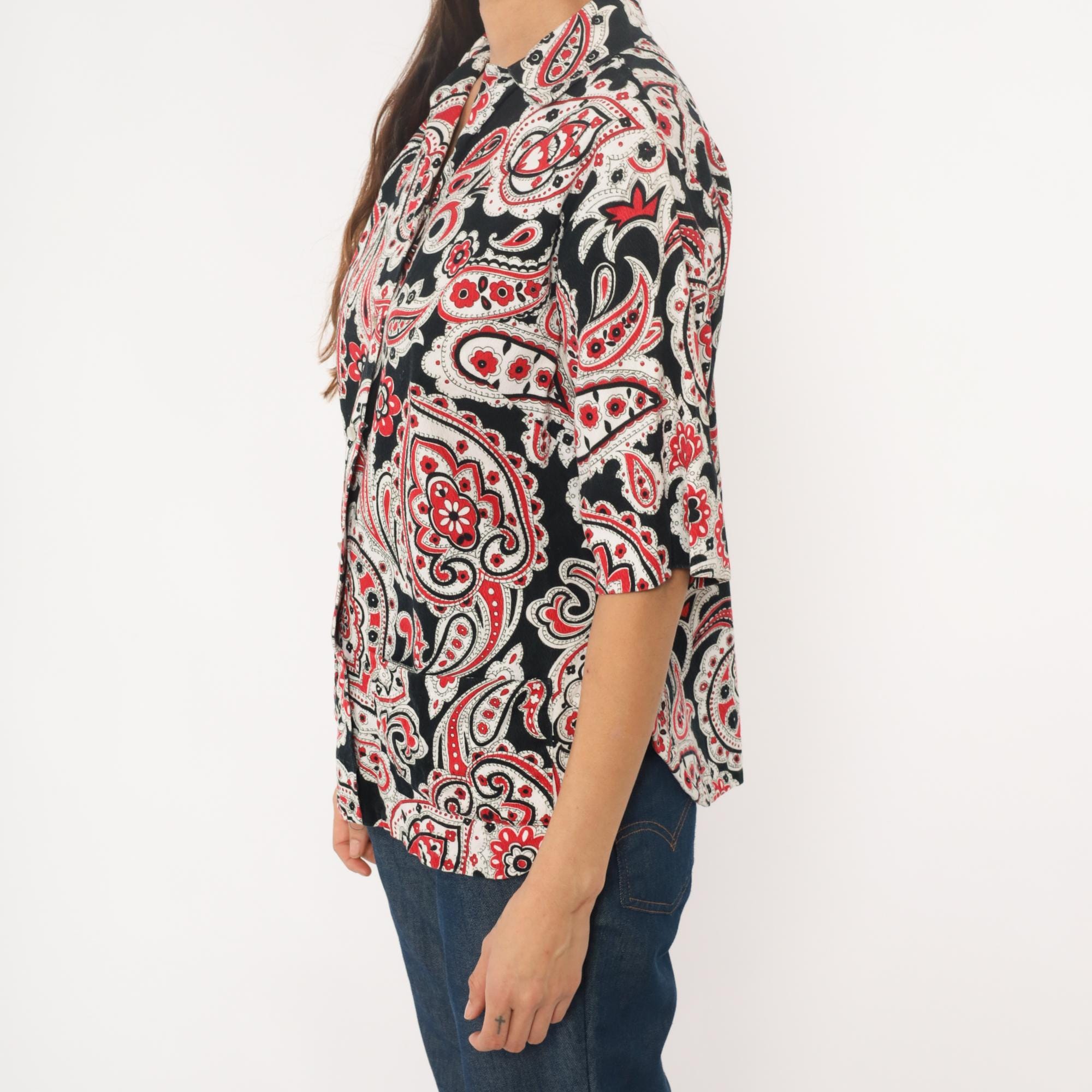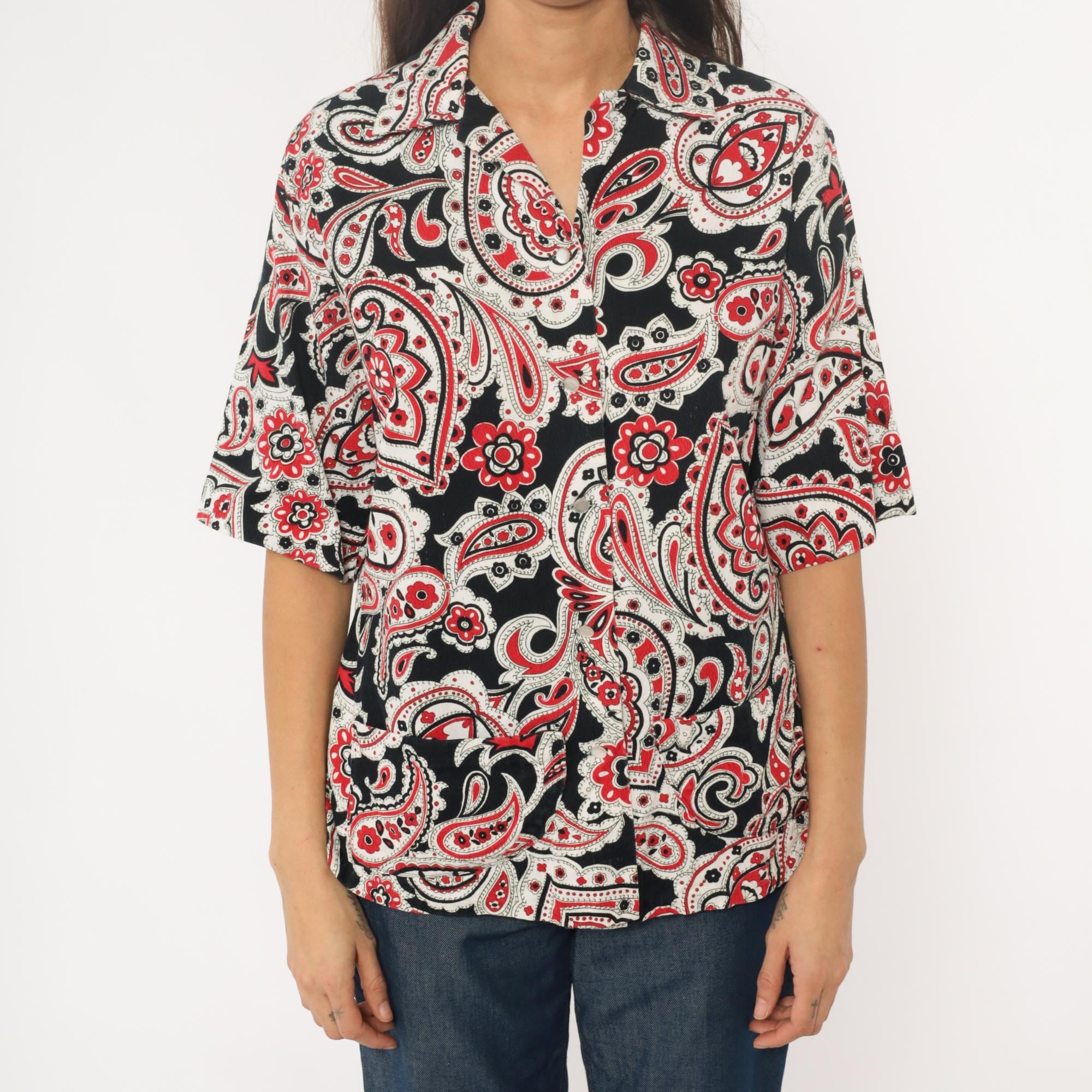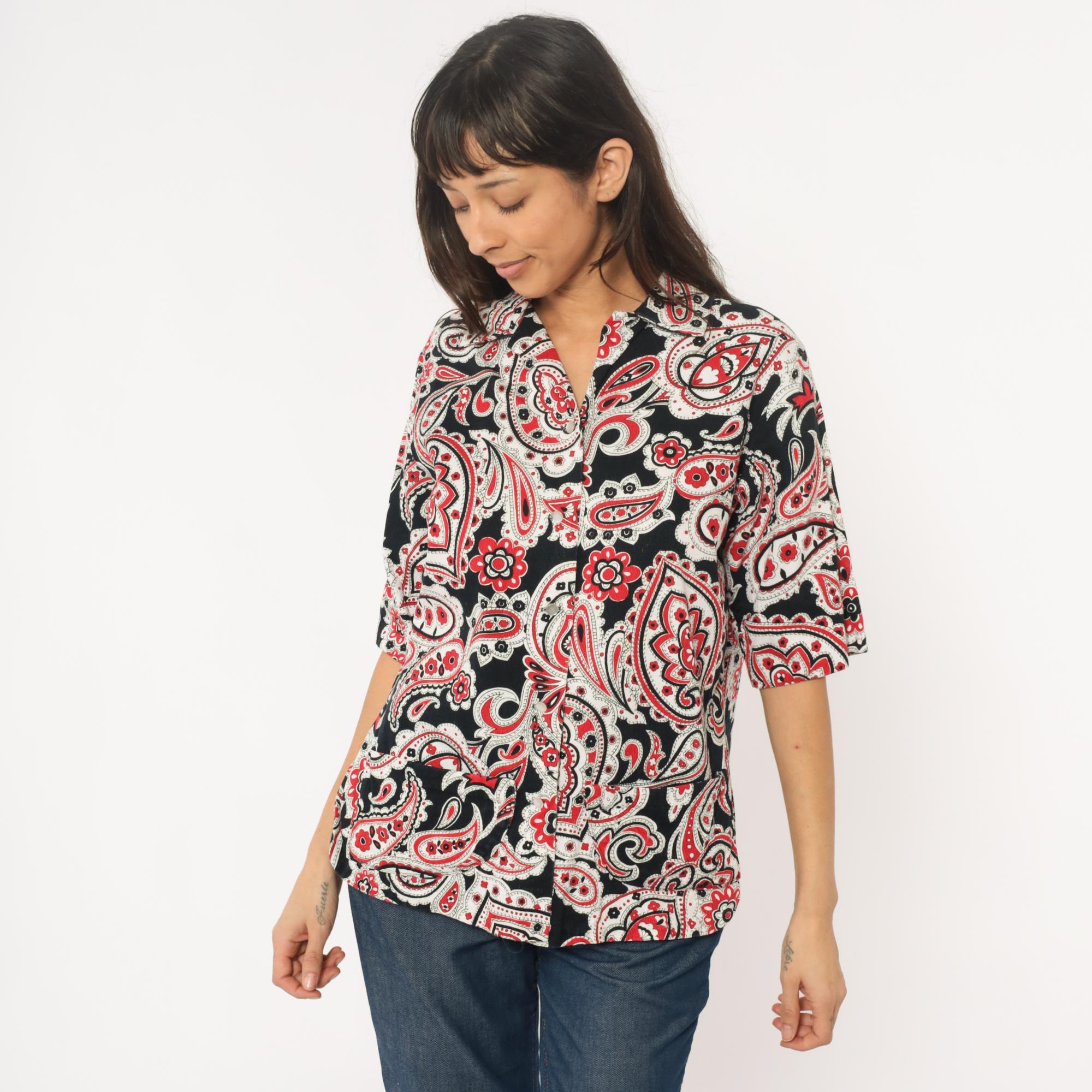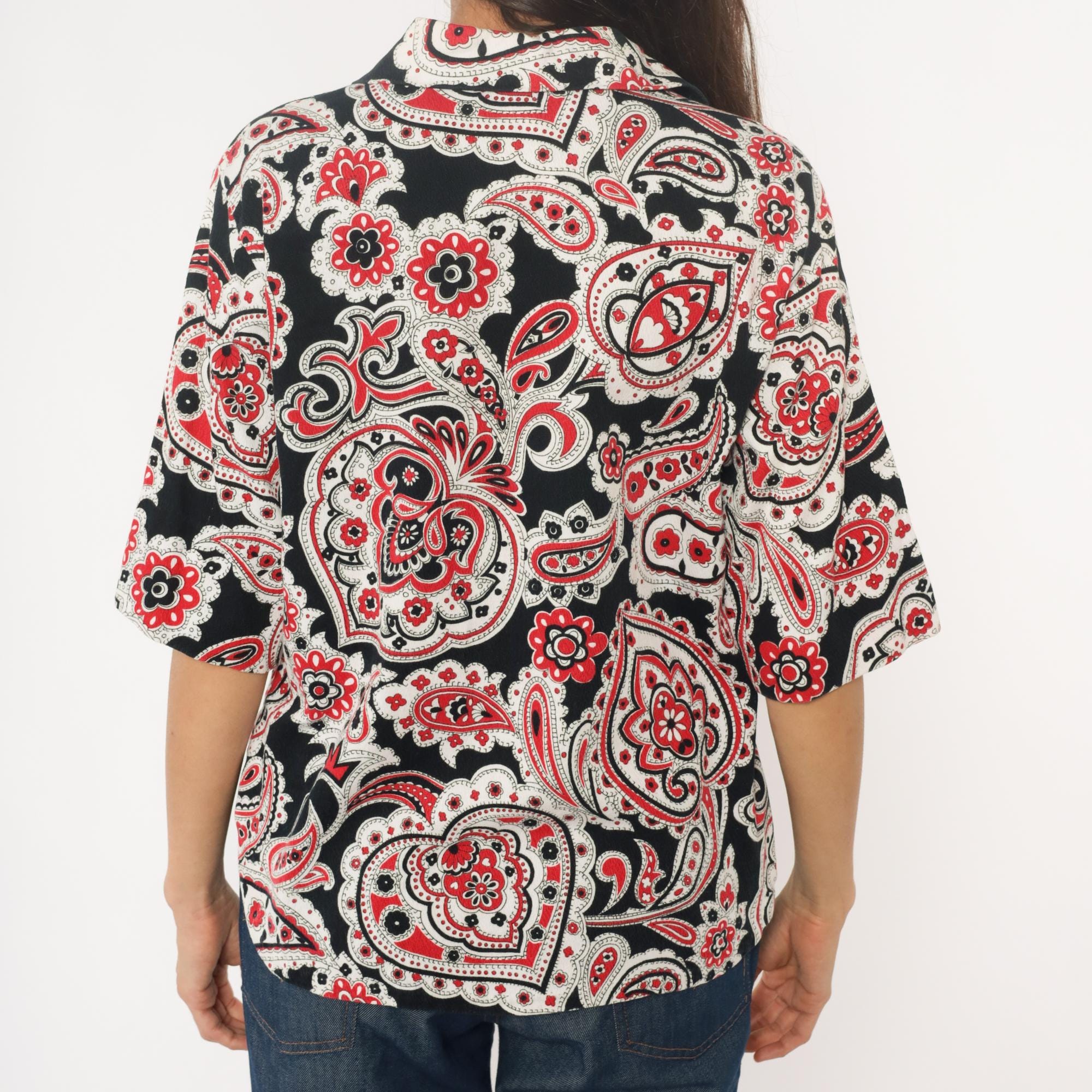 70s black paisley button-up shirt from jean marie with red and white paisley print across the fabric. Notched collar, short sleeves, button front closure with white buttons. Boxy silhouette with straight hem.