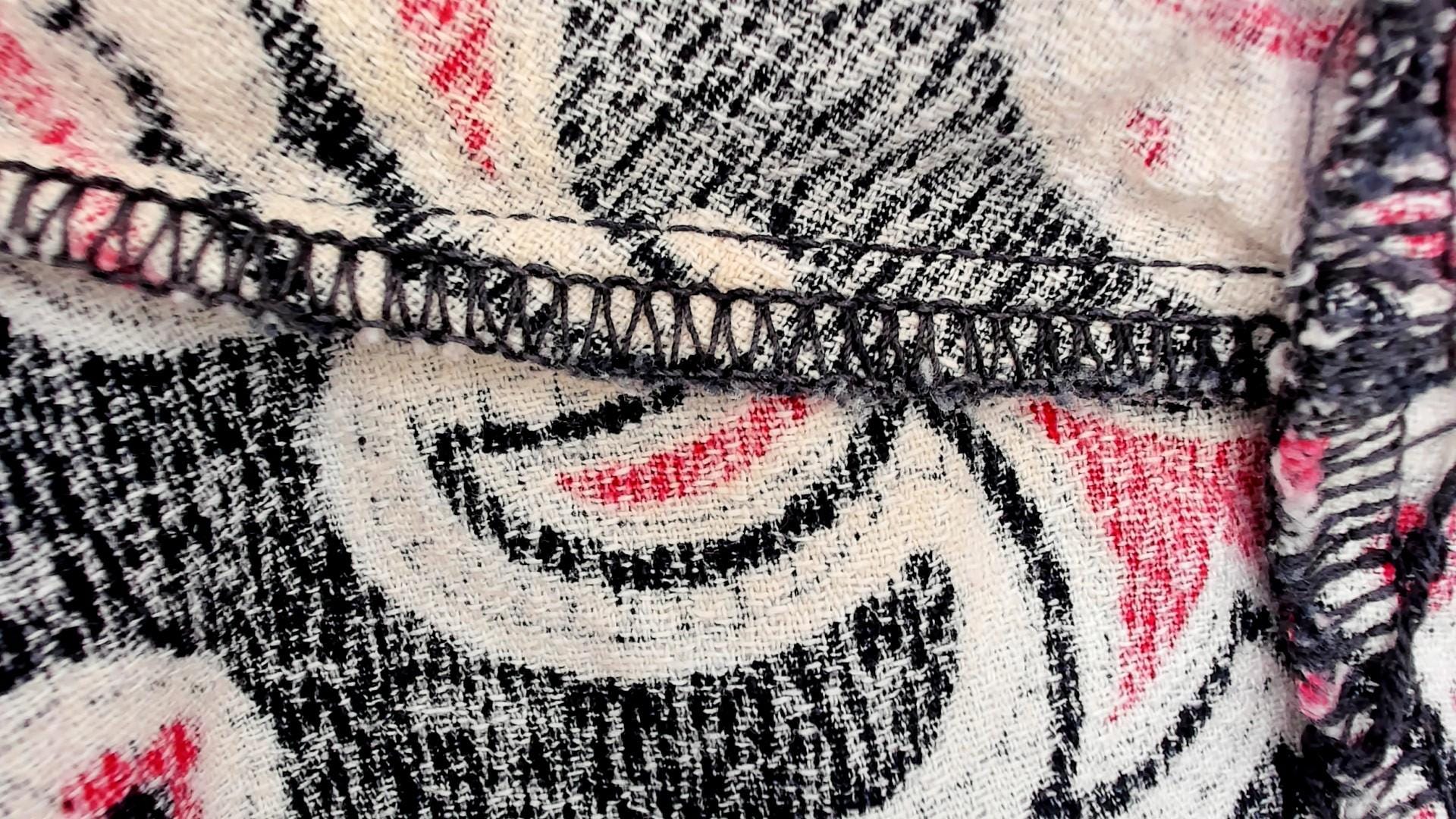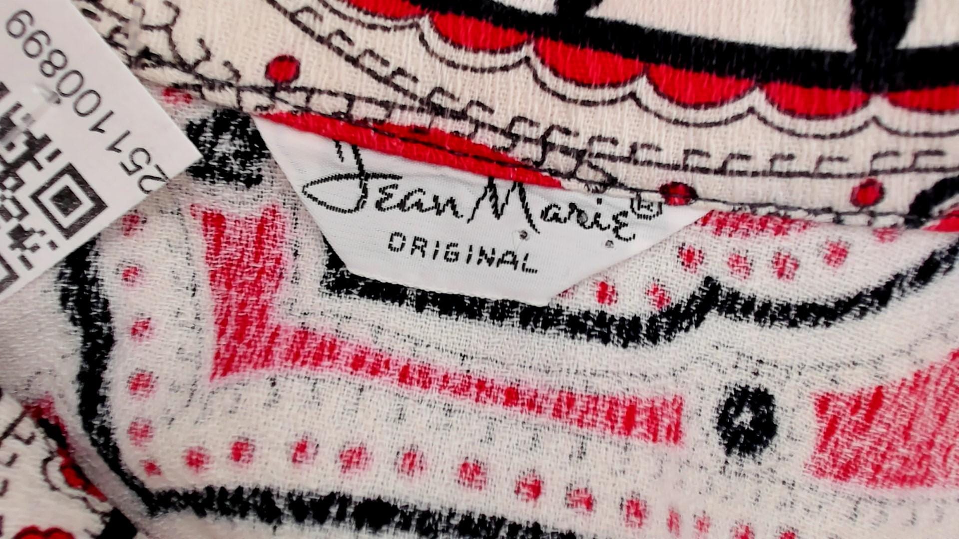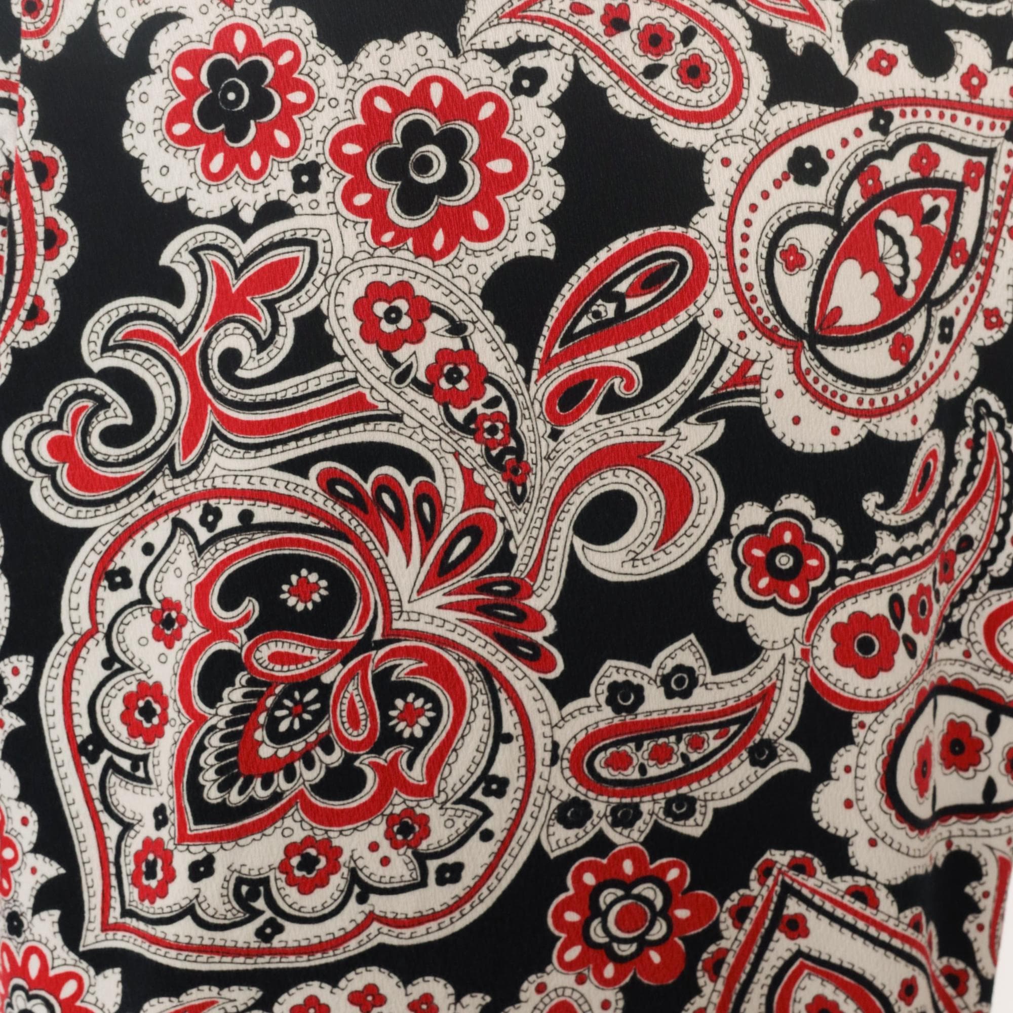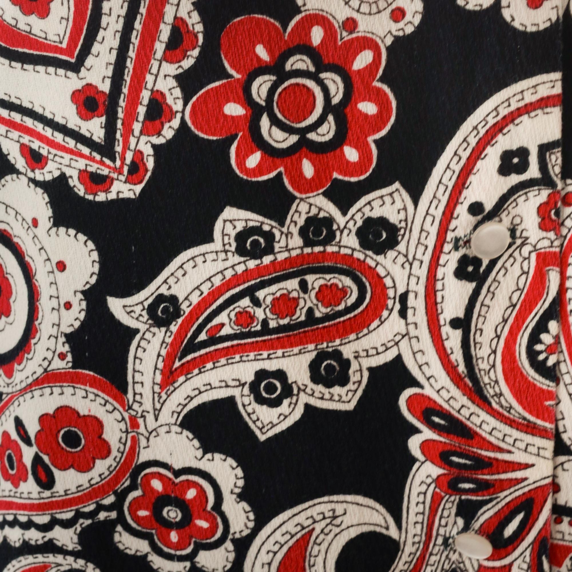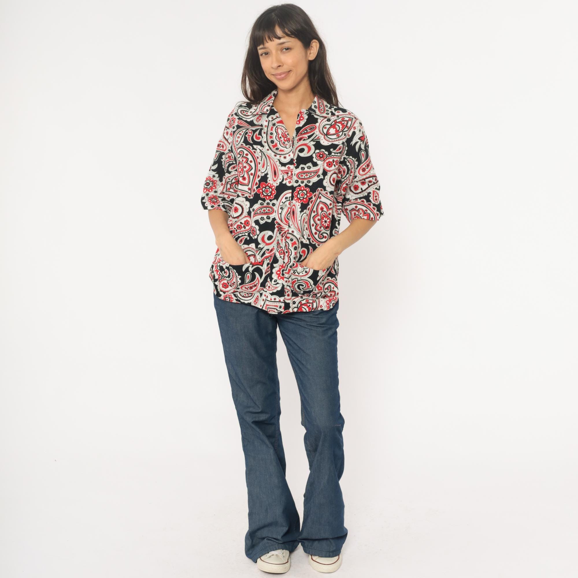 70s black paisley button-up shirt from jean marie with red and white paisley print across the fabric. Notched collar, short sleeves, button front closure with white buttons. Boxy silhouette with straight hem.