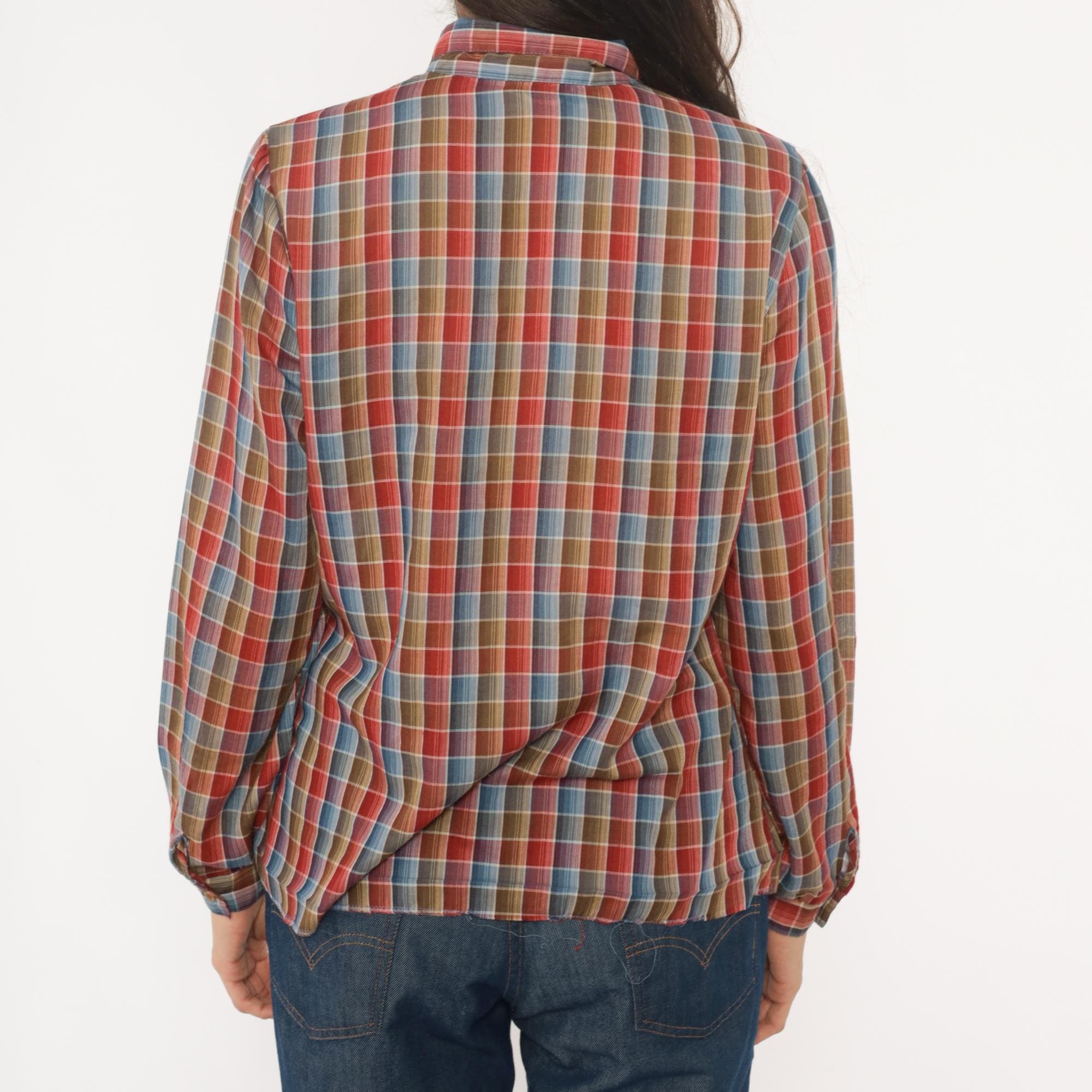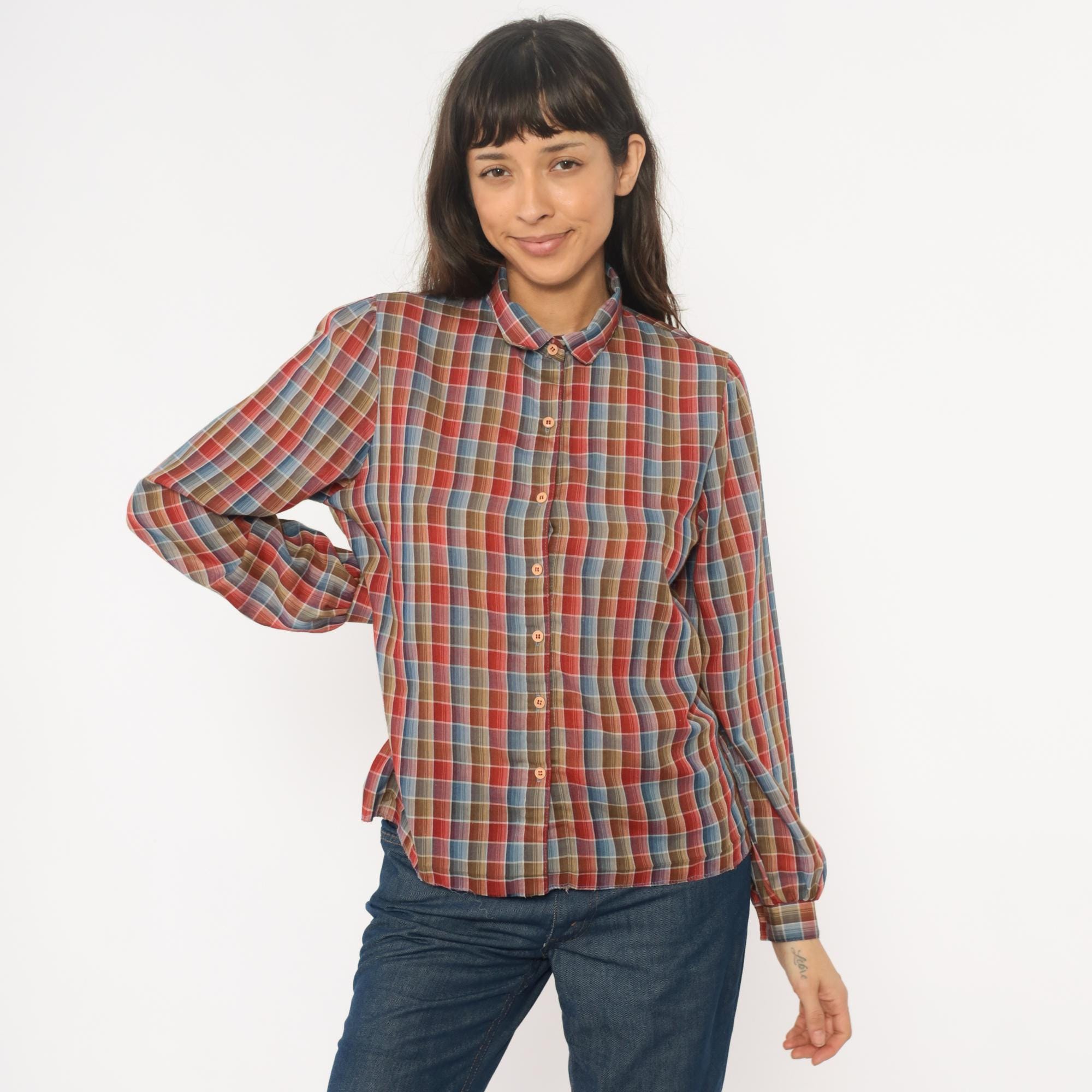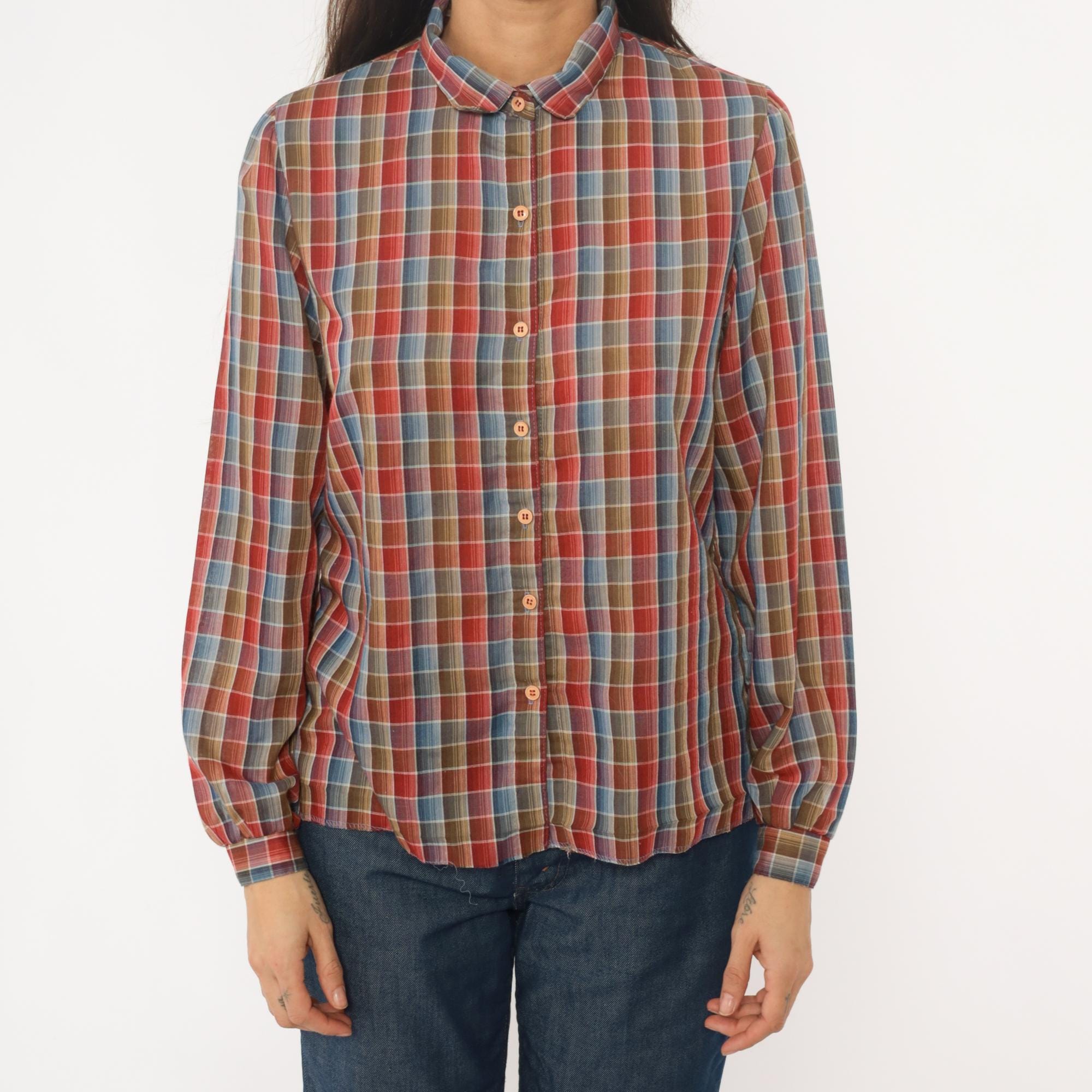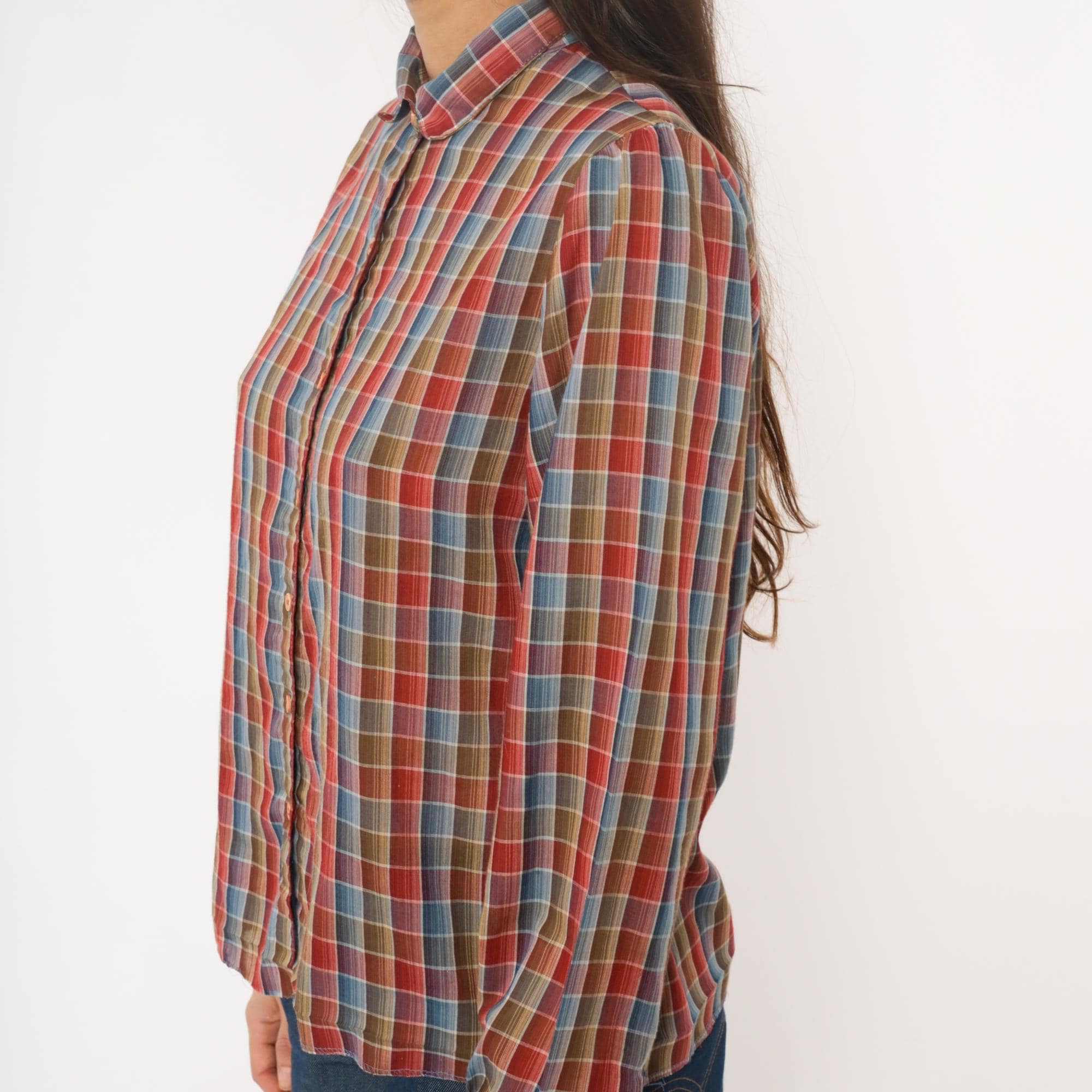 80s plaid shirt from West Coast Connection with button front closure and pointed collar. Red, rust, blue, tan, and white plaid pattern throughout. Long sleeves with button cuffs, hem is undone.