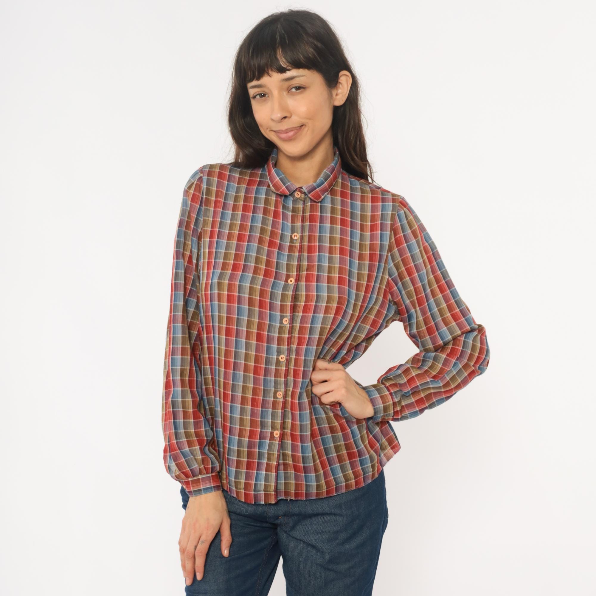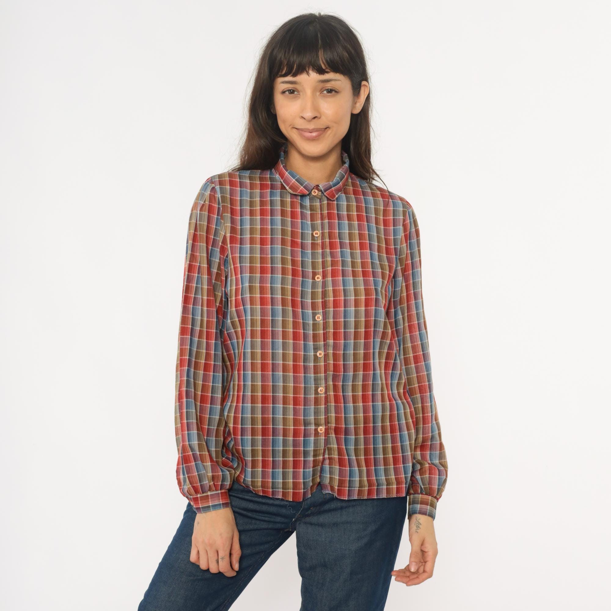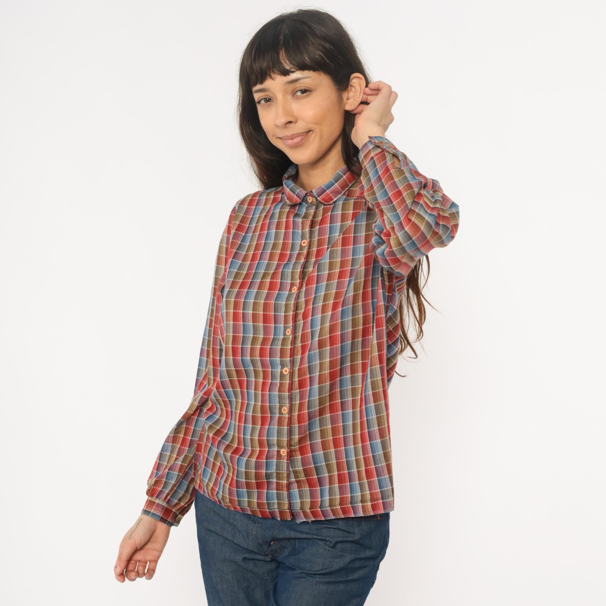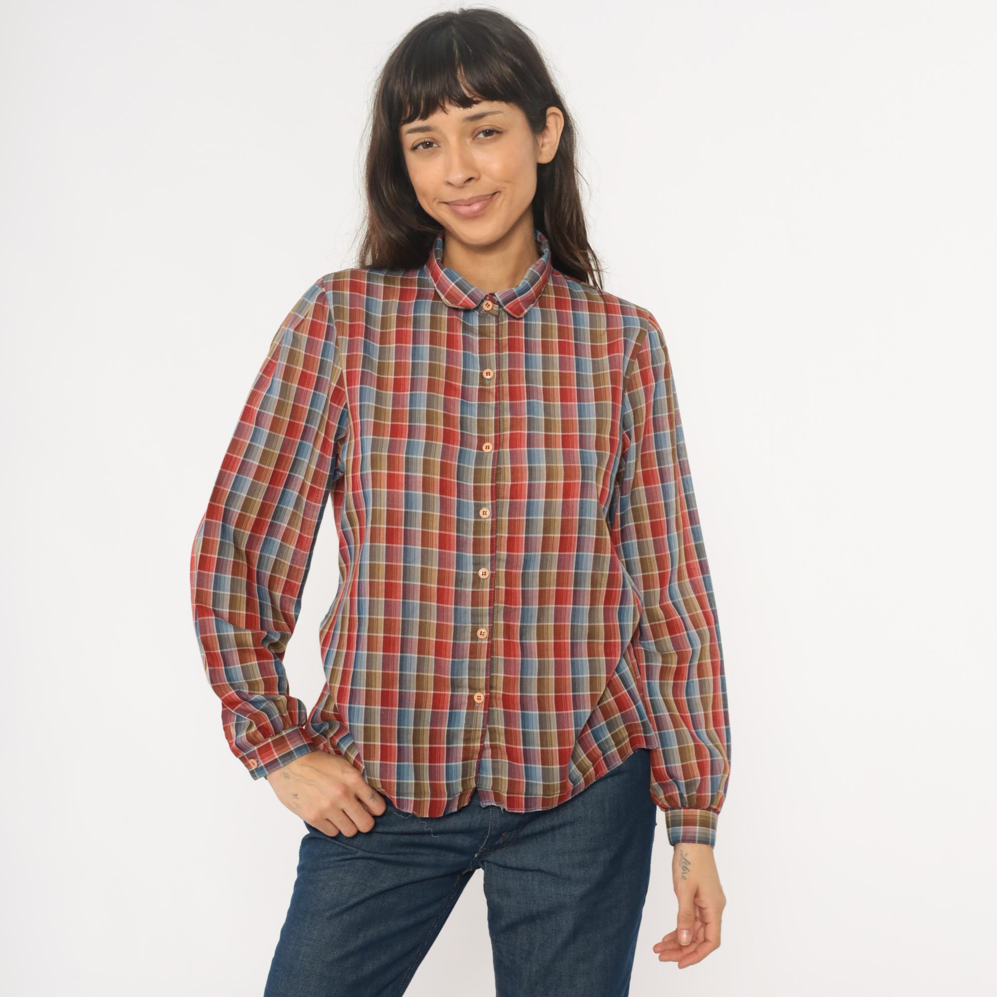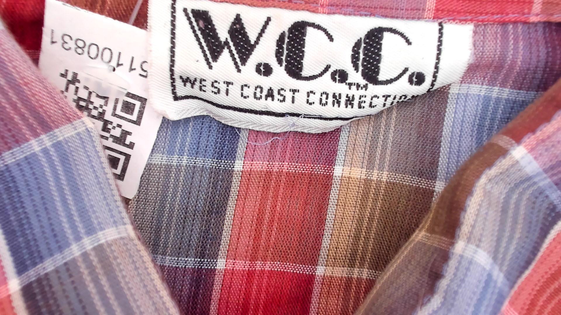 80s plaid shirt from West Coast Connection with button front closure and pointed collar. Red, rust, blue, tan, and white plaid pattern throughout. Long sleeves with button cuffs, hem is undone.