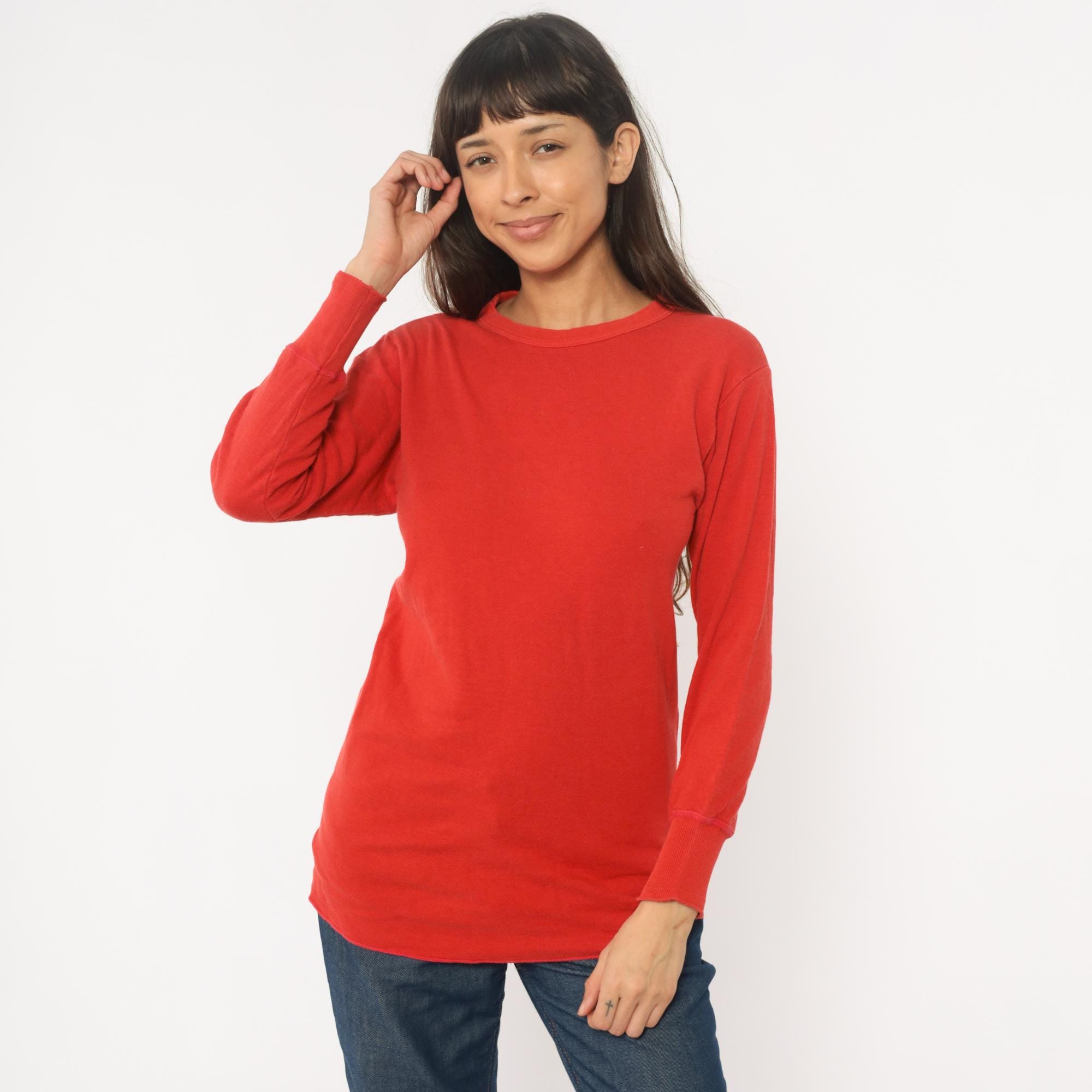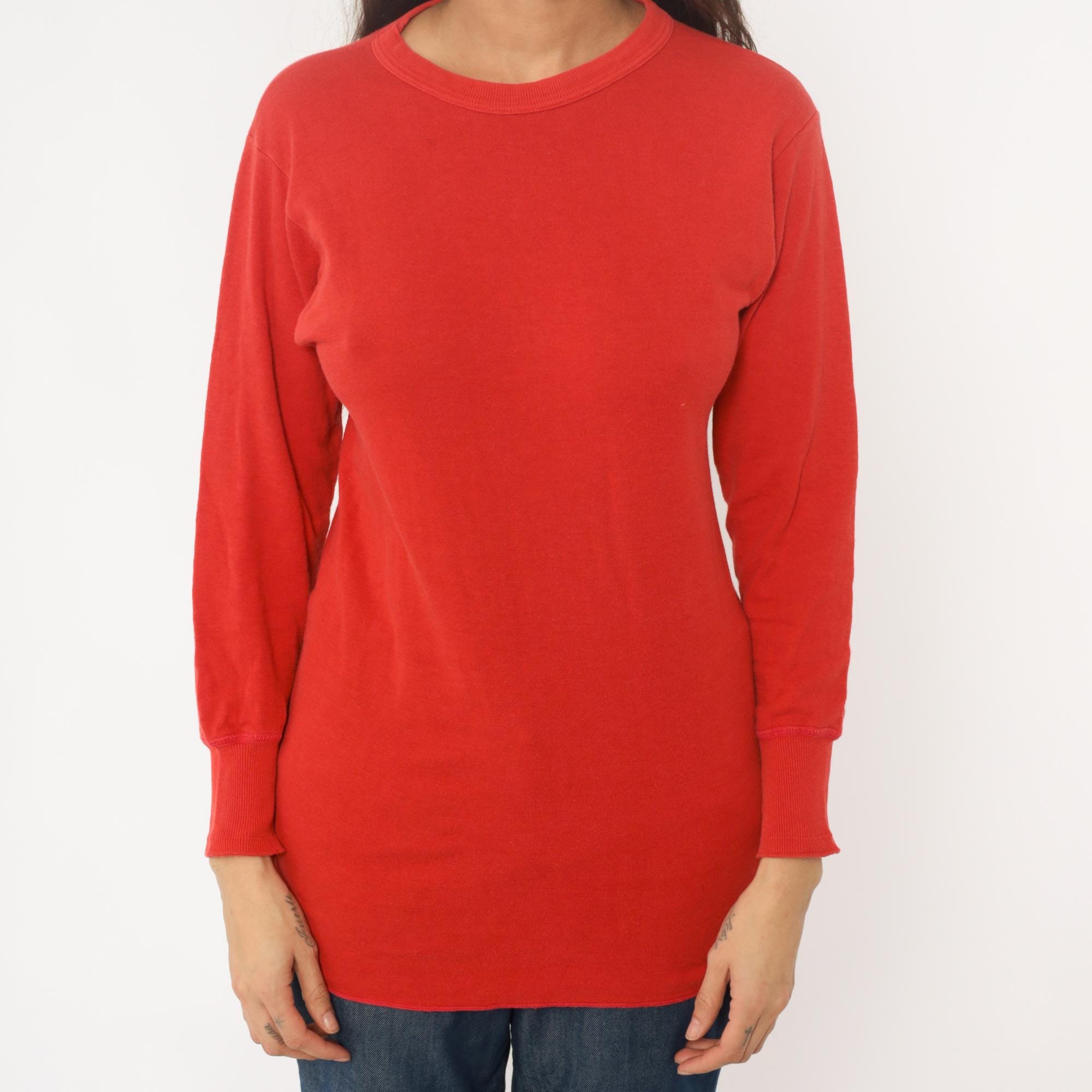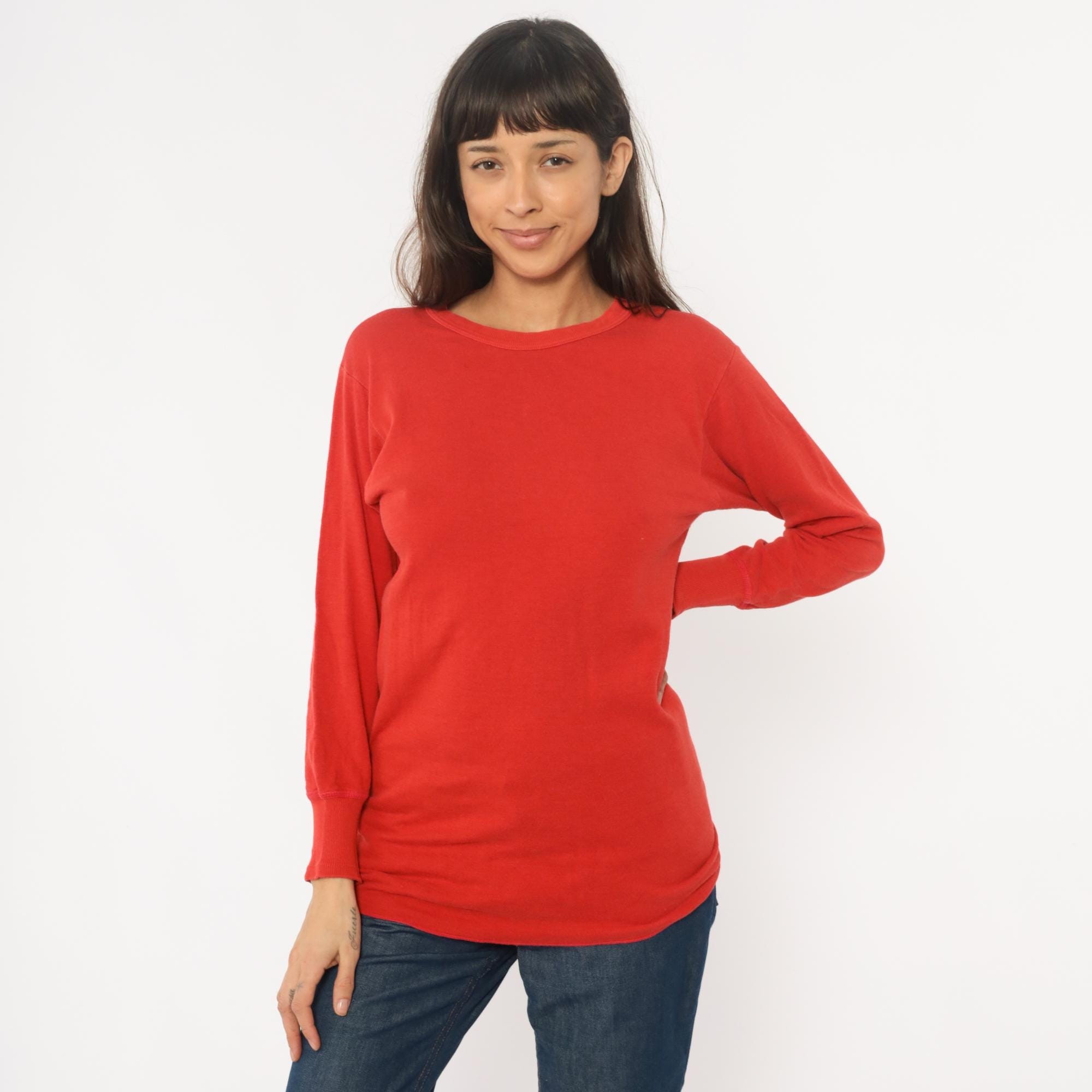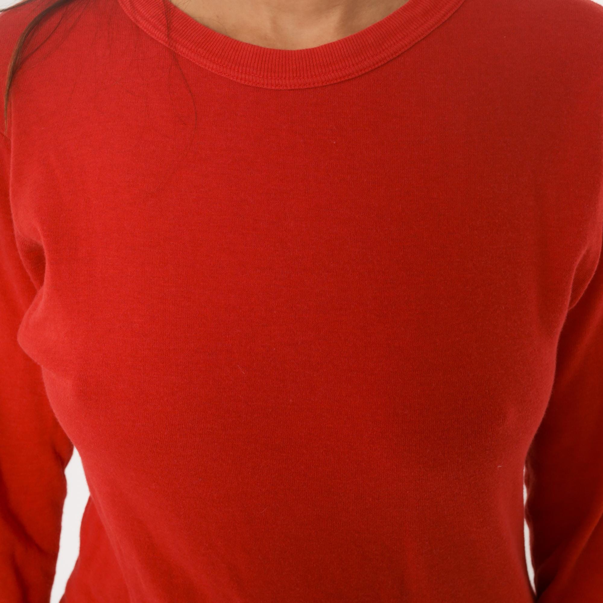80s red long sleeve top from duofold with crew neckline and ribbed collar. Ribbed cuffs at wrists, simple construction with no embellishments or patterns.