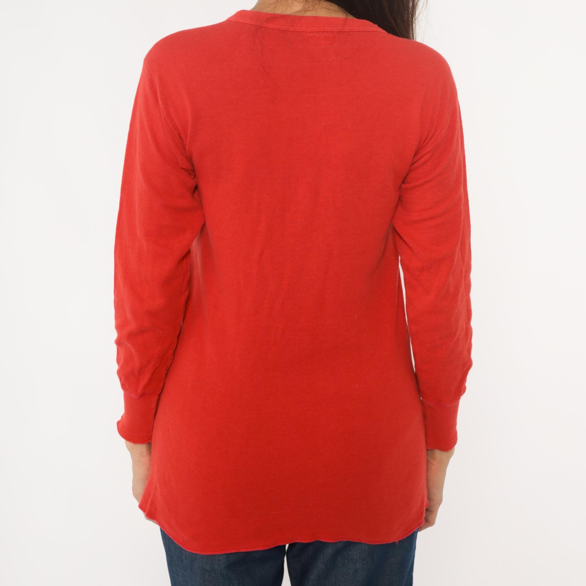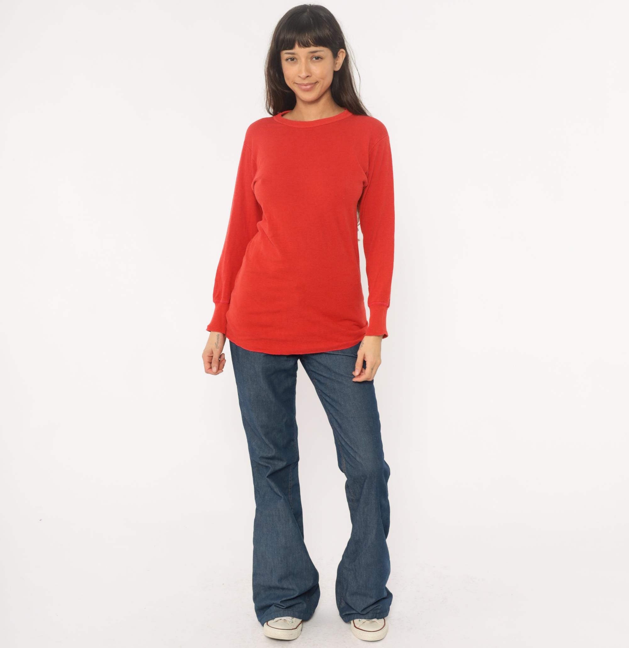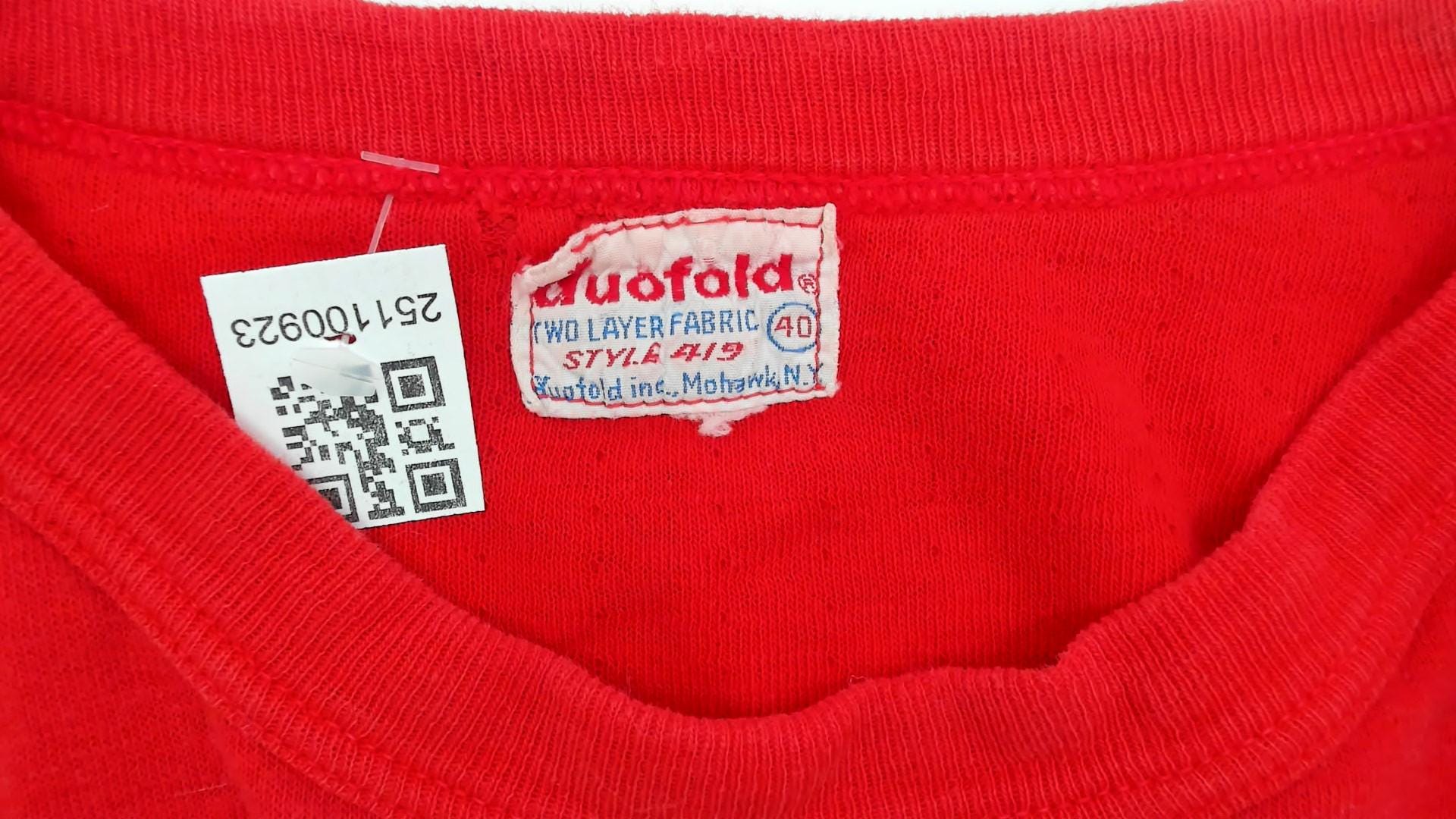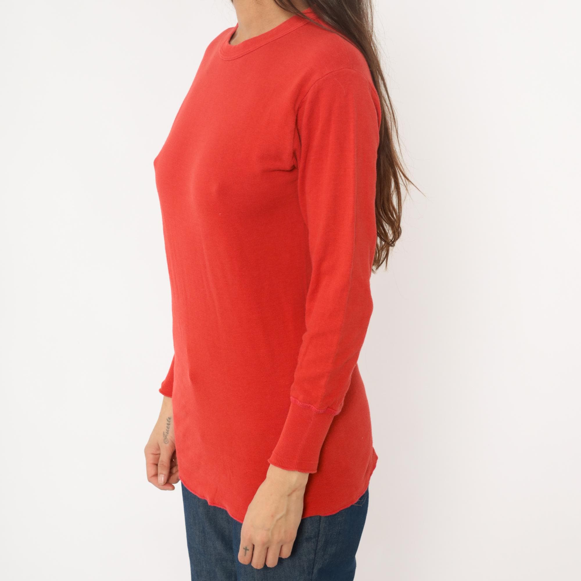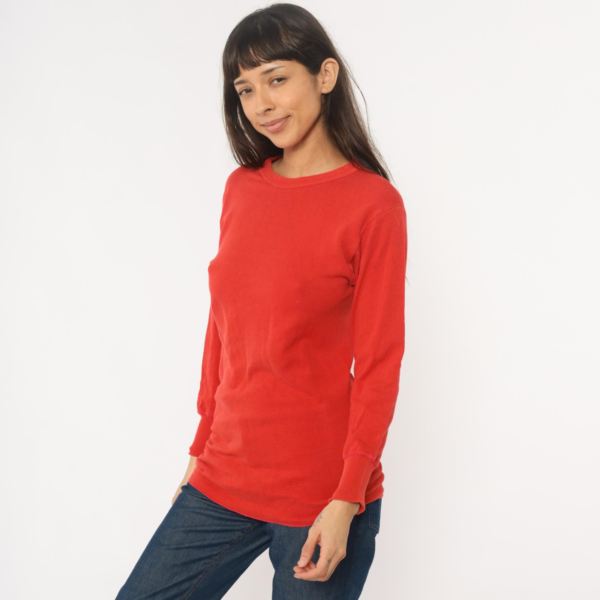 80s red long sleeve top from duofold with crew neckline and ribbed collar. Ribbed cuffs at wrists, simple construction with no embellishments or patterns.