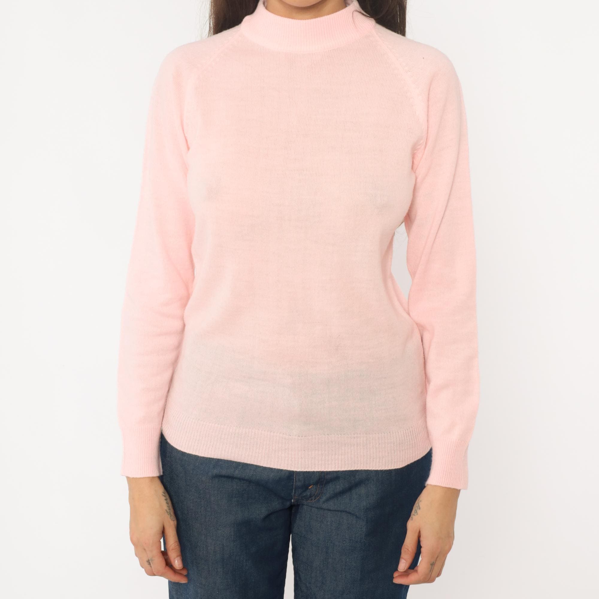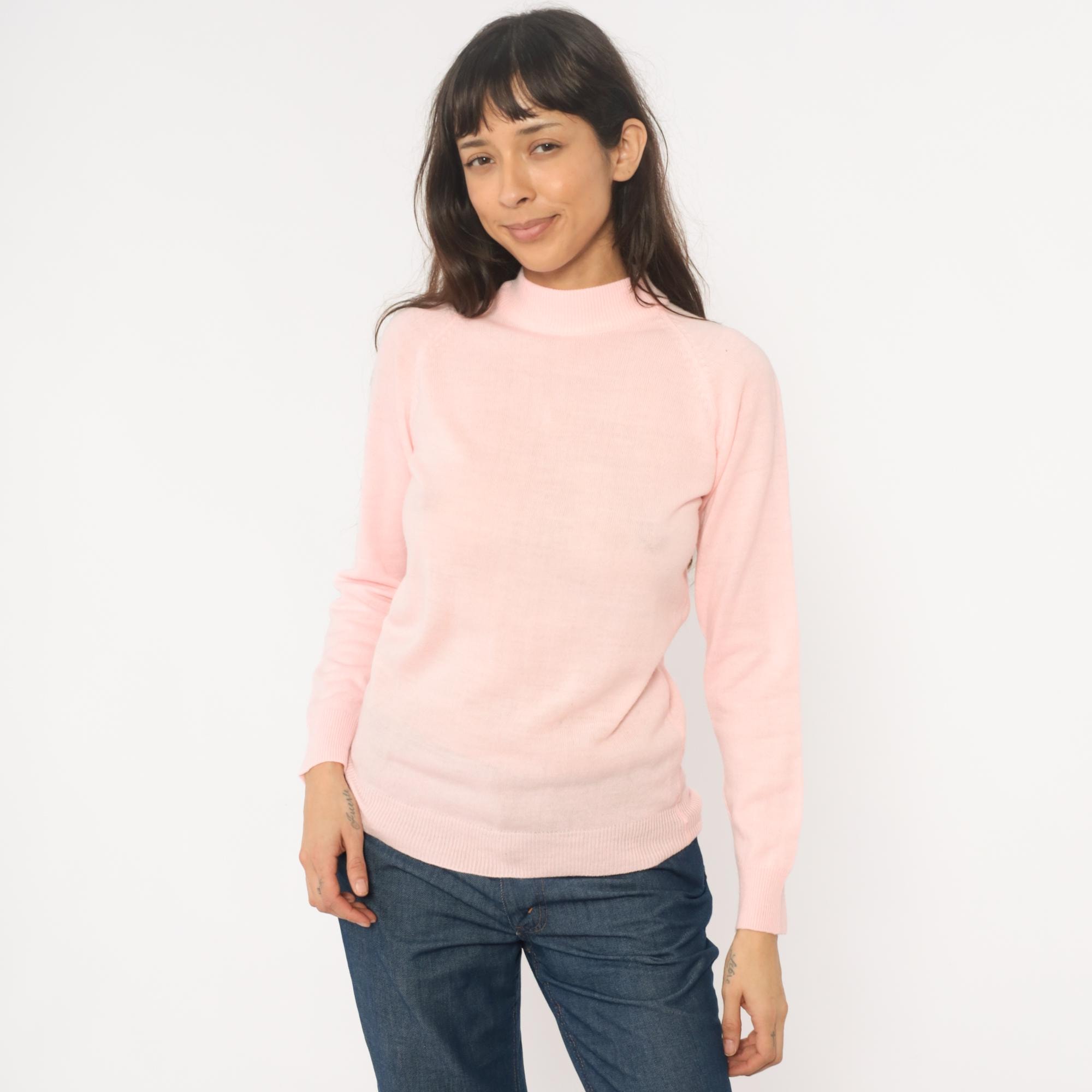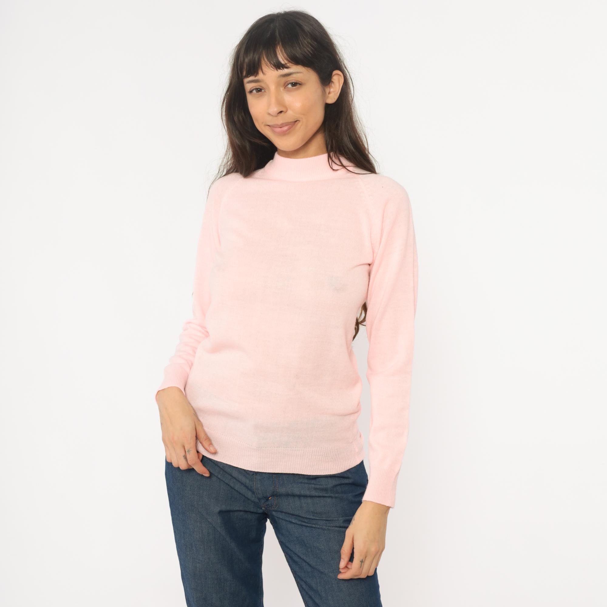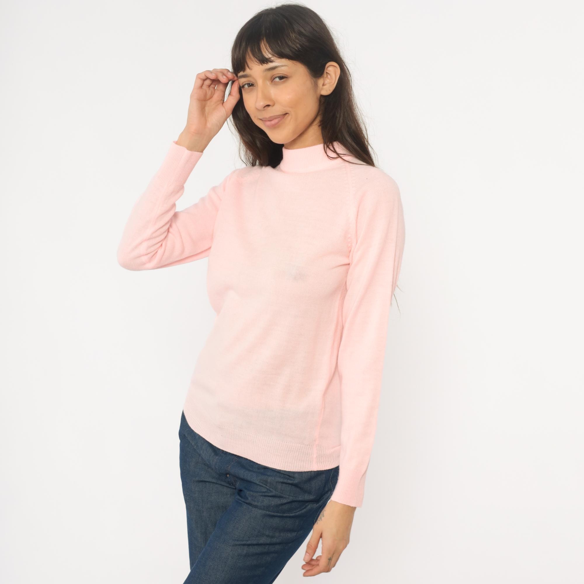 70s pale pink sweater with mock neck and back zipper closure. Long sleeves with ribbed cuffs, ribbed neckline and hem.