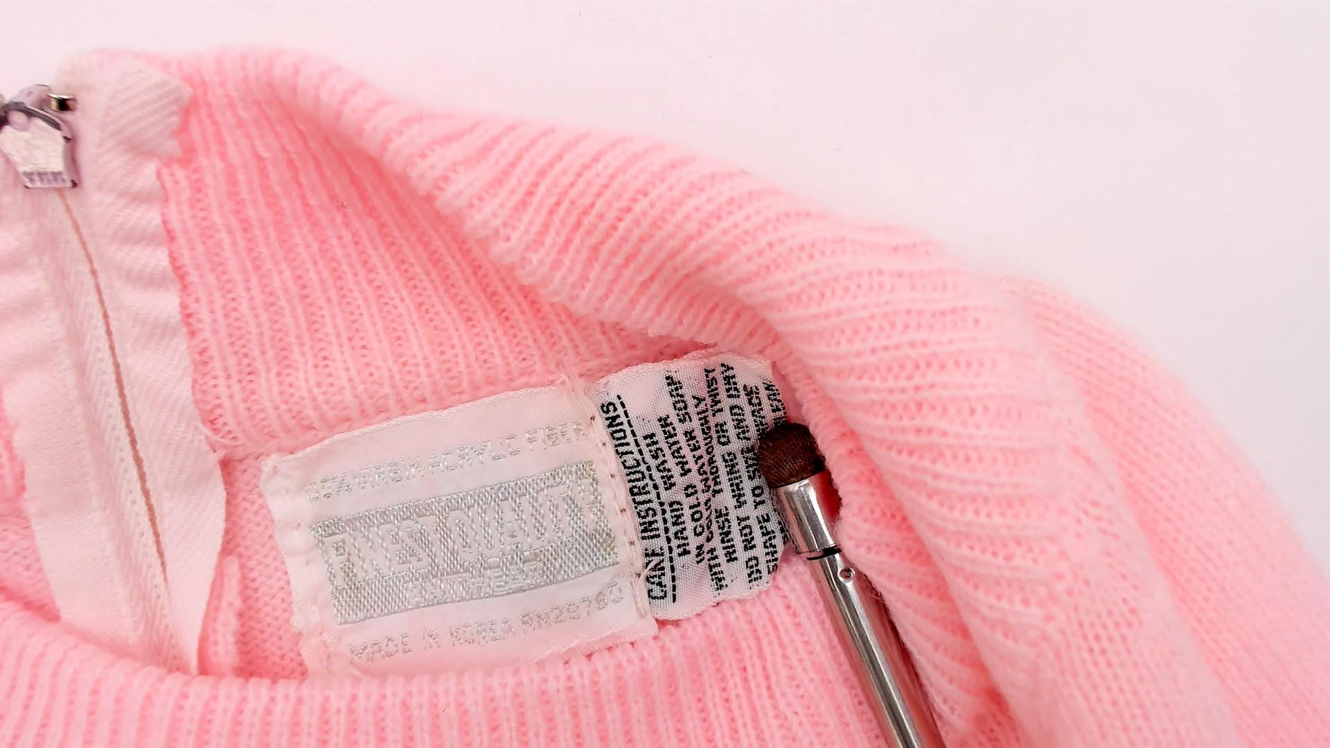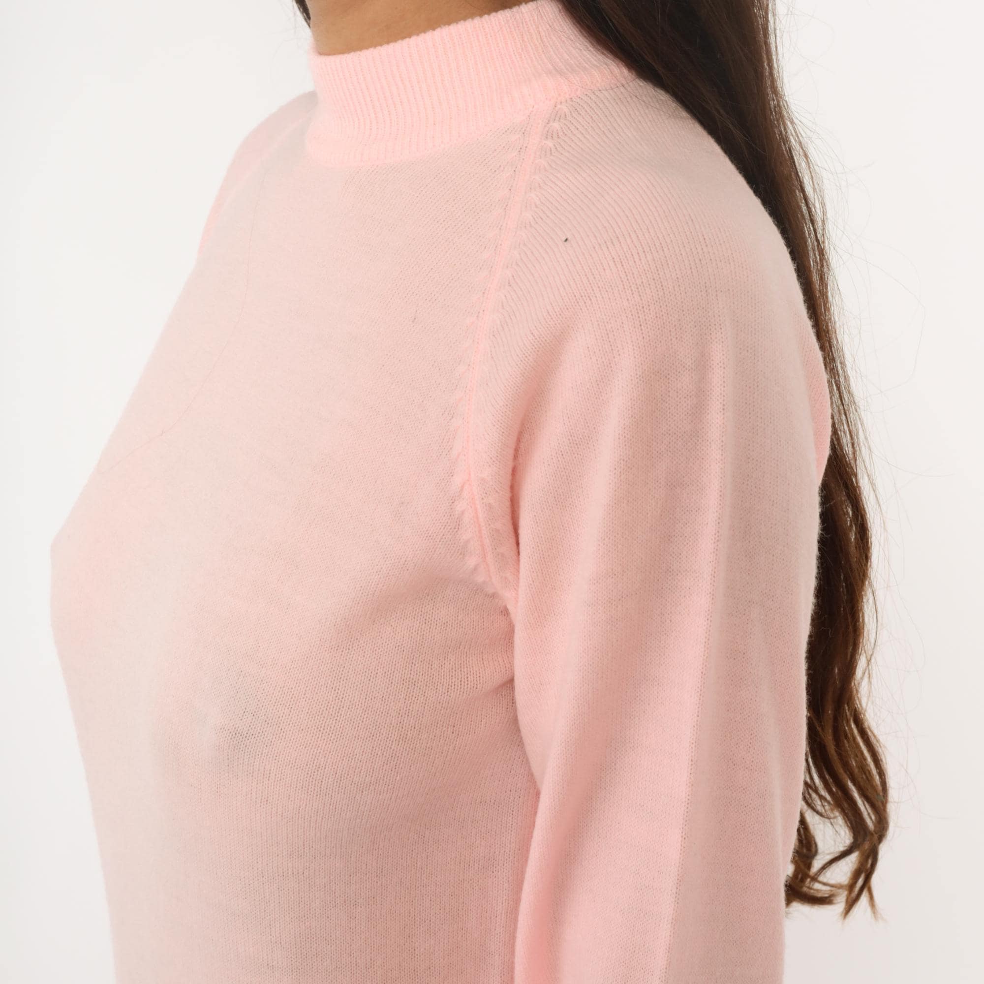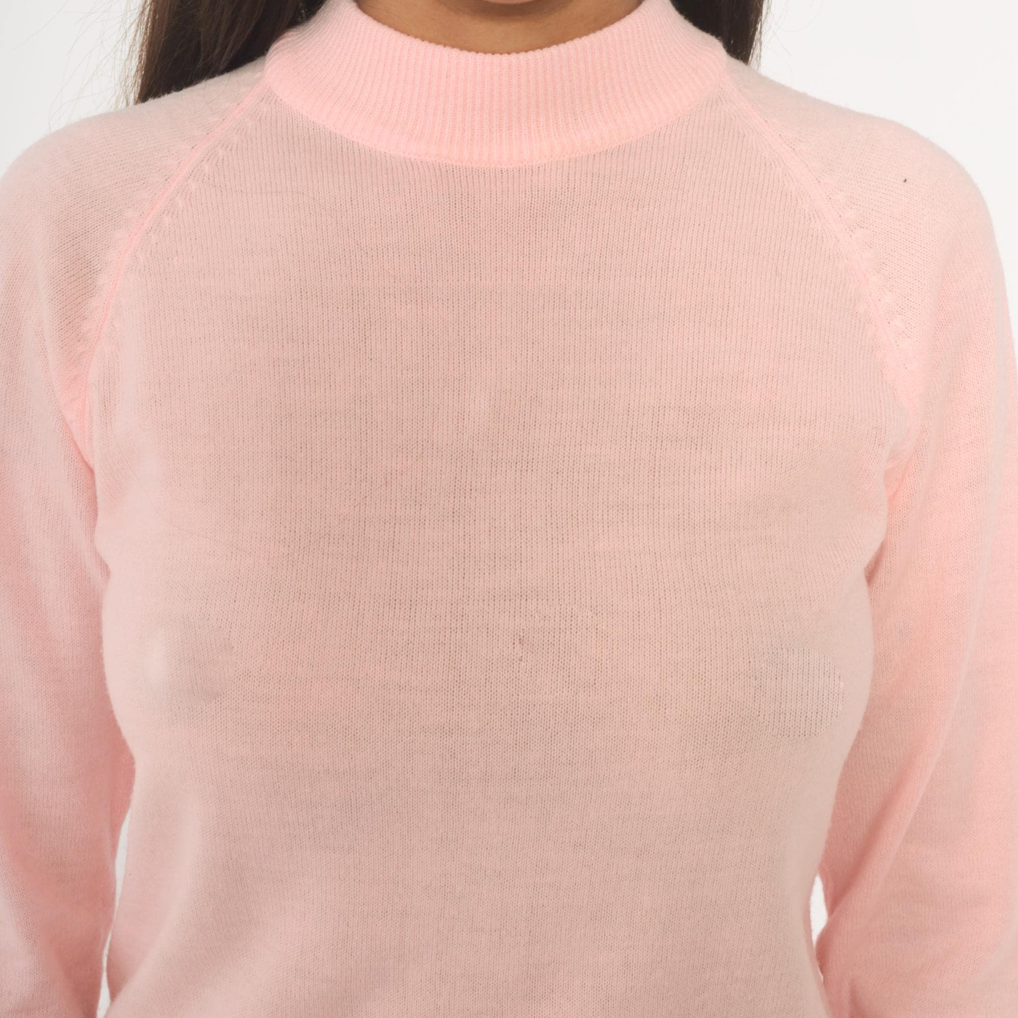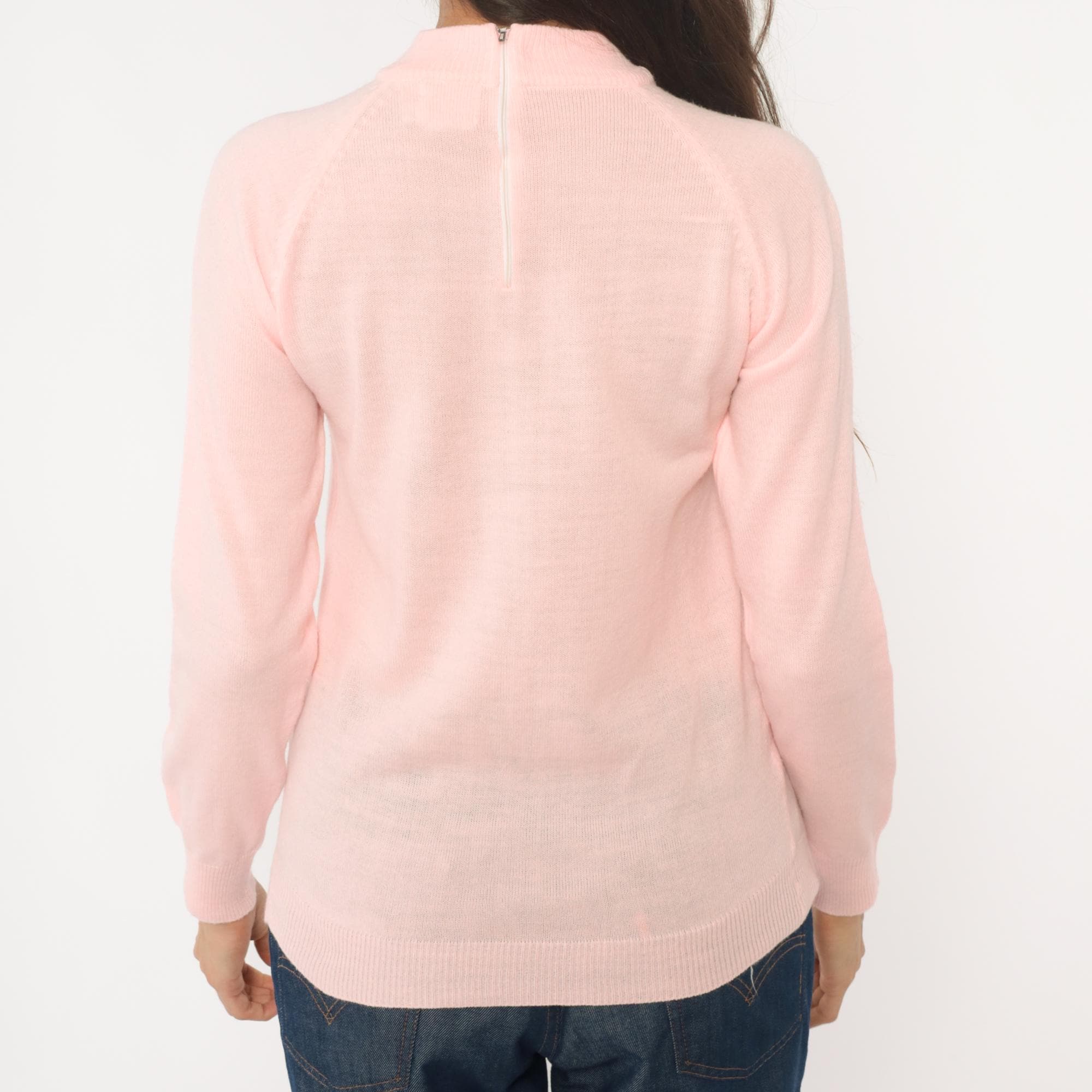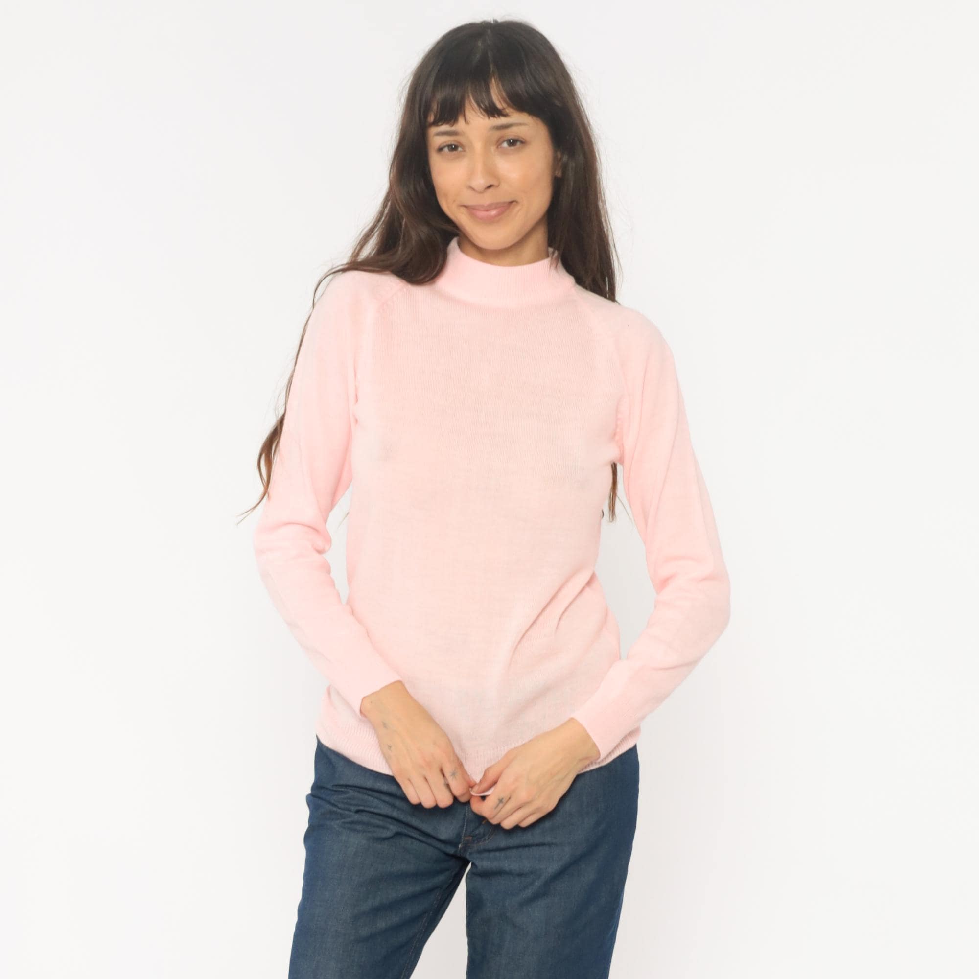 70s pale pink sweater with mock neck and back zipper closure. Long sleeves with ribbed cuffs, ribbed neckline and hem.